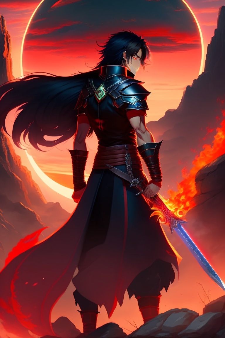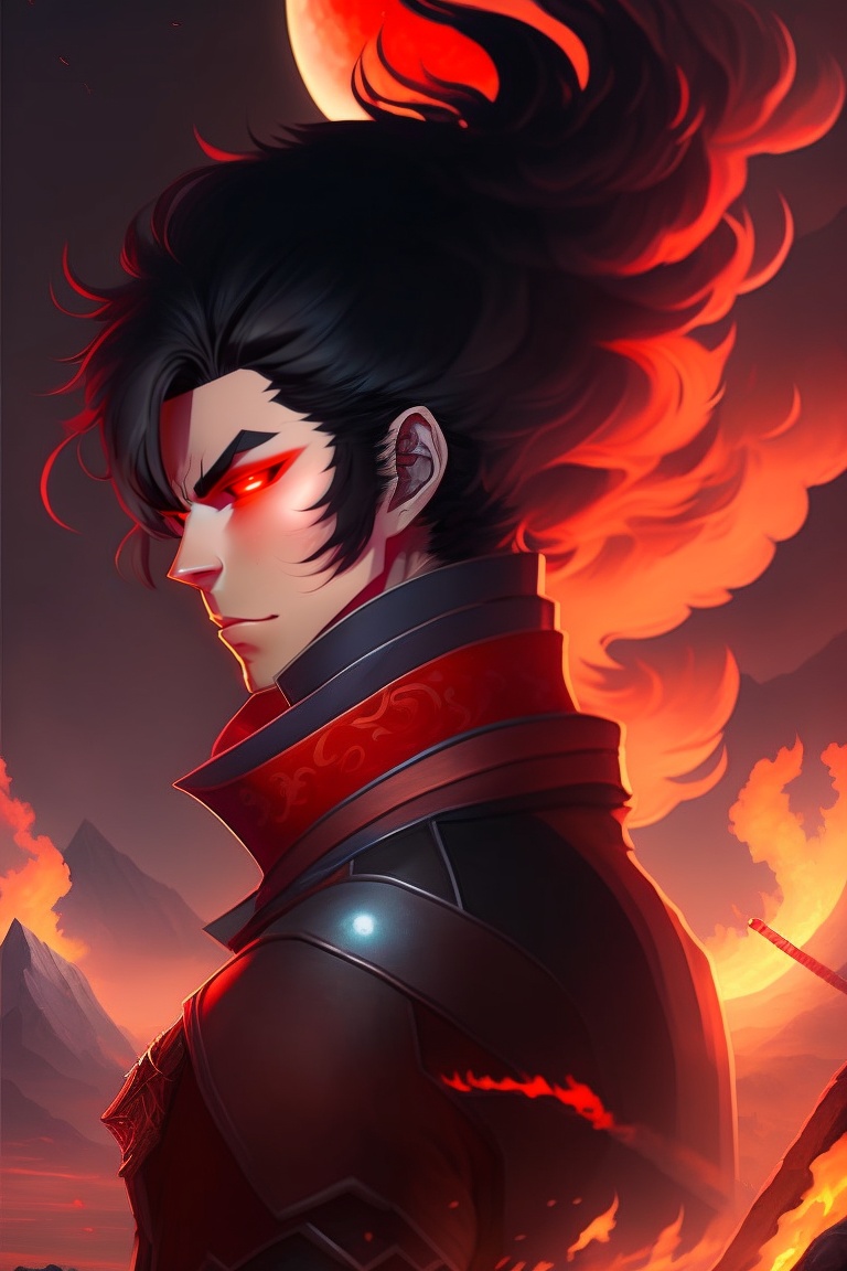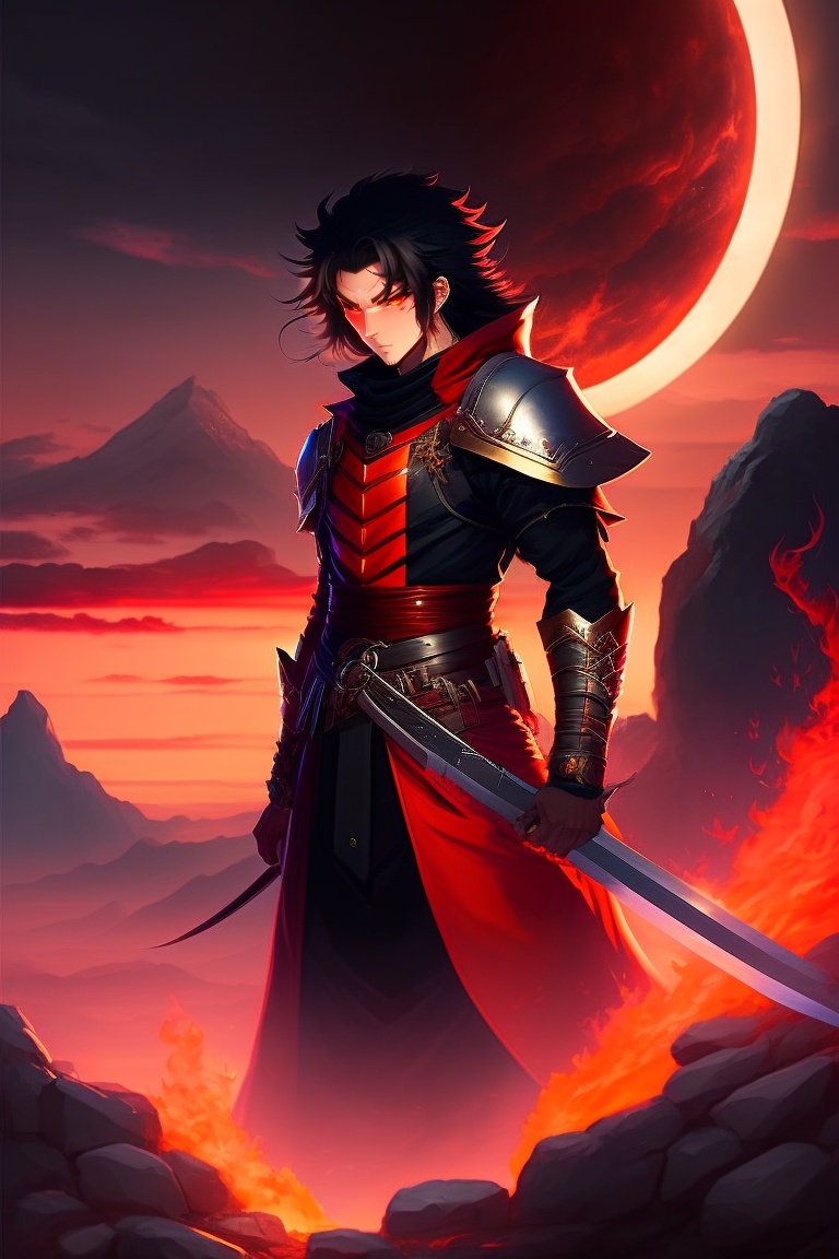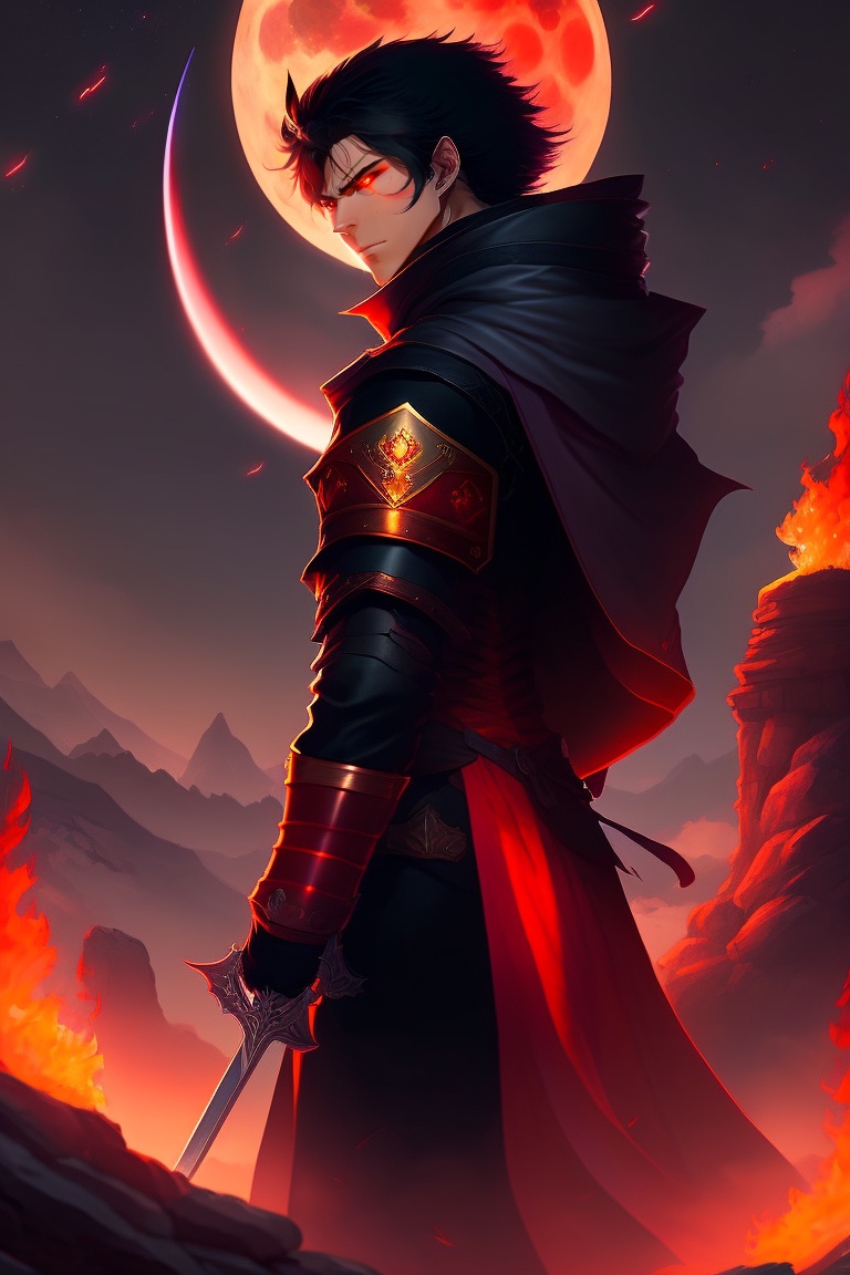 A male demon slayer anime character with red eyes, black hair, and a flaming sword standing at the end of a mountain behind a red moon
