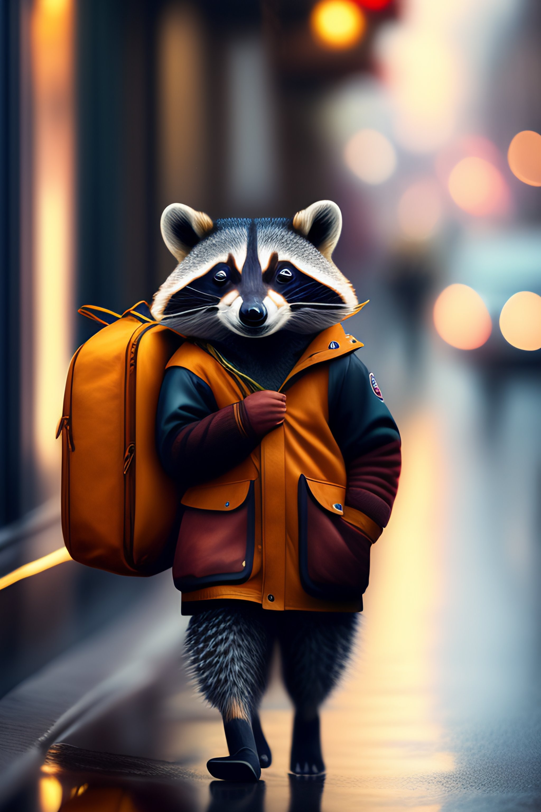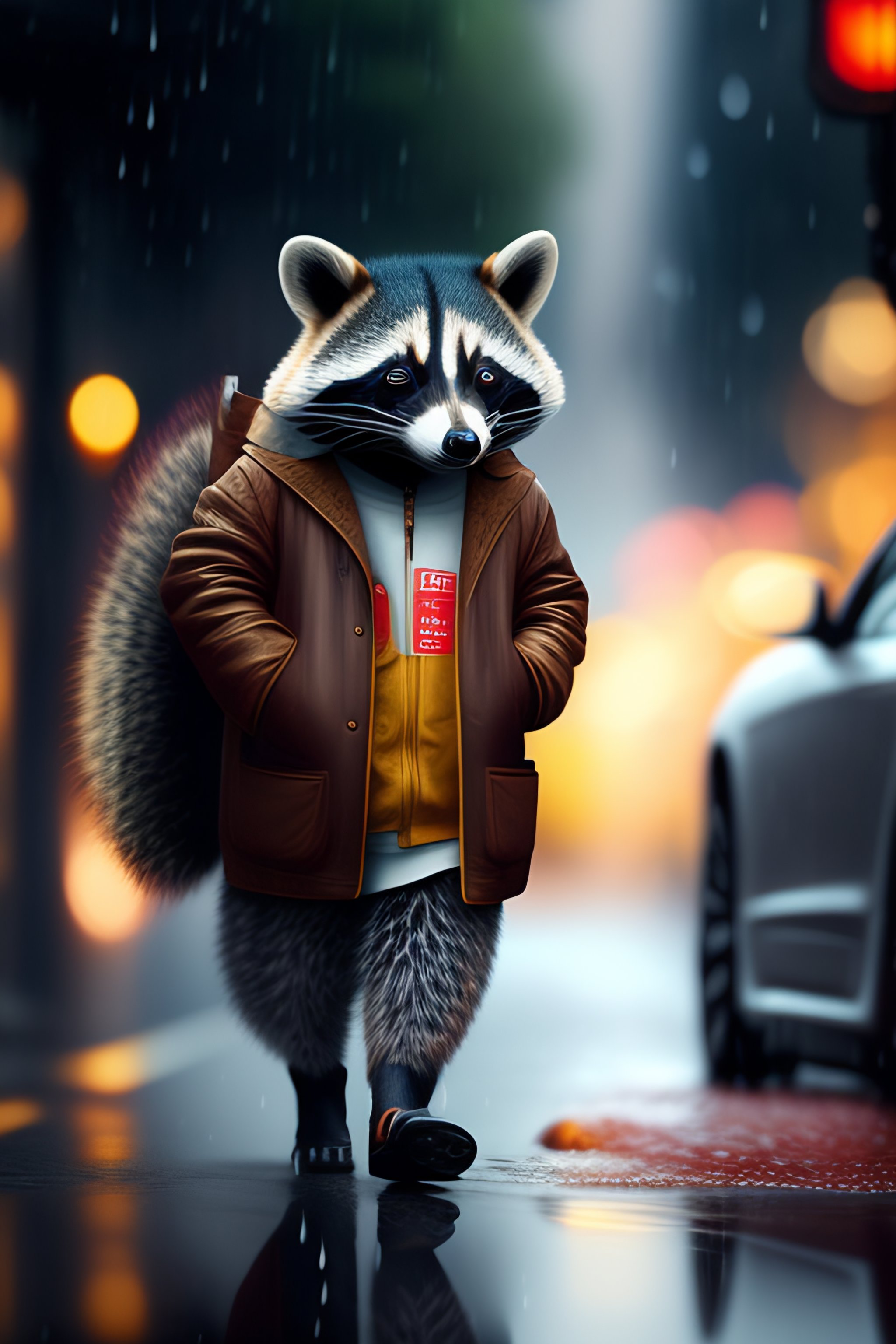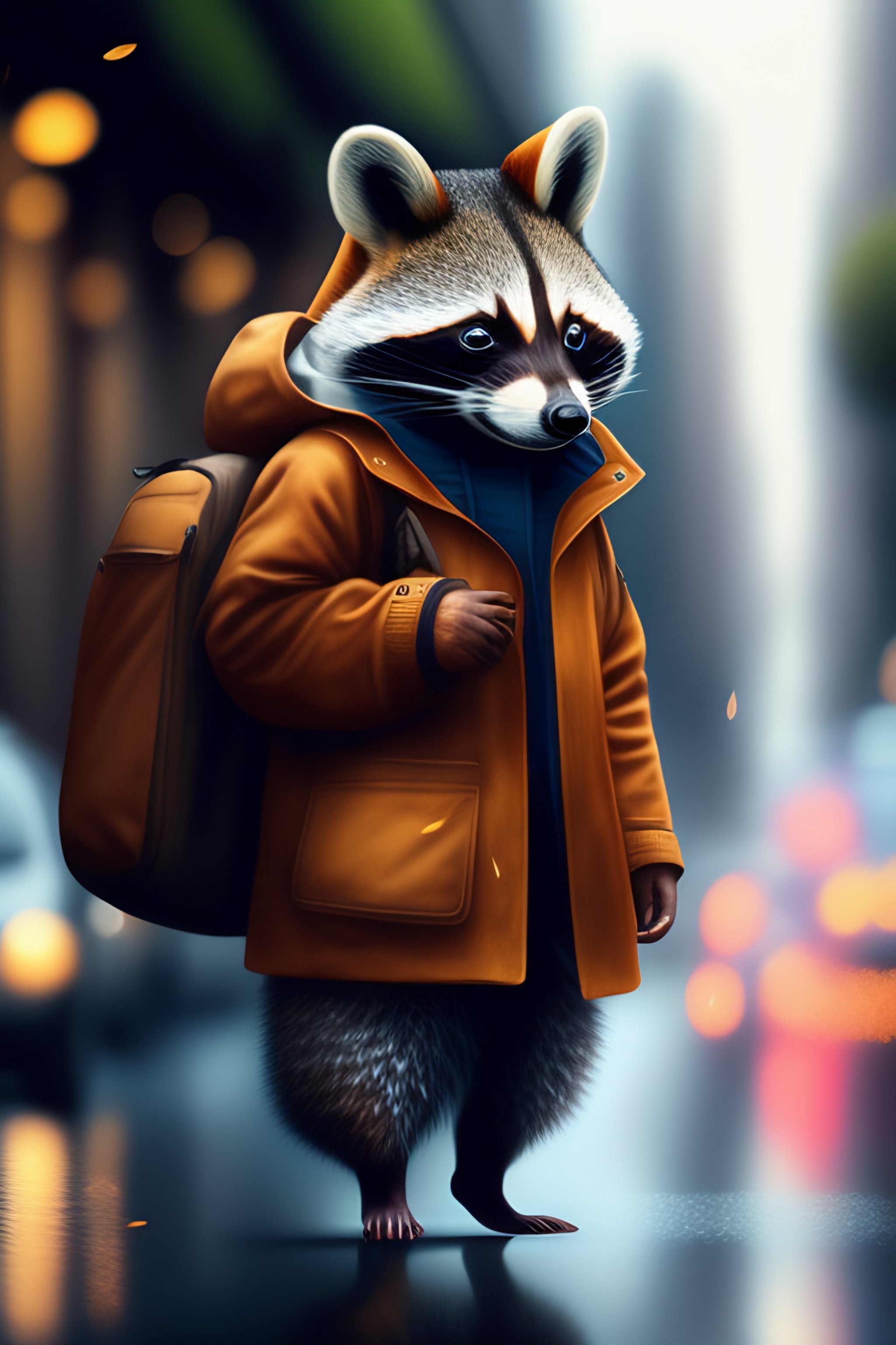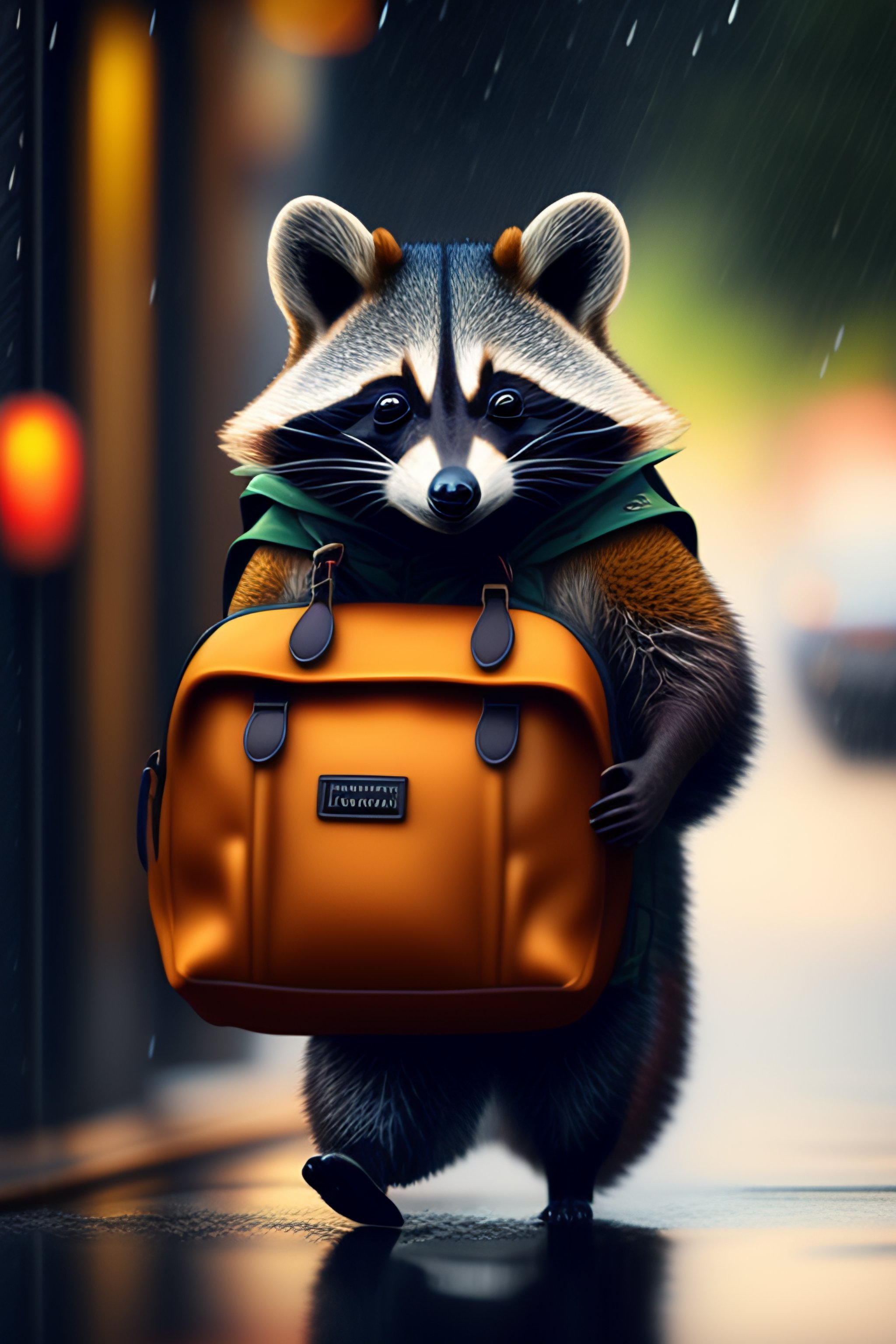Cute racoon traveling in the city, with smile, wearing rain clothes, raining outside, fantasy, creative art
