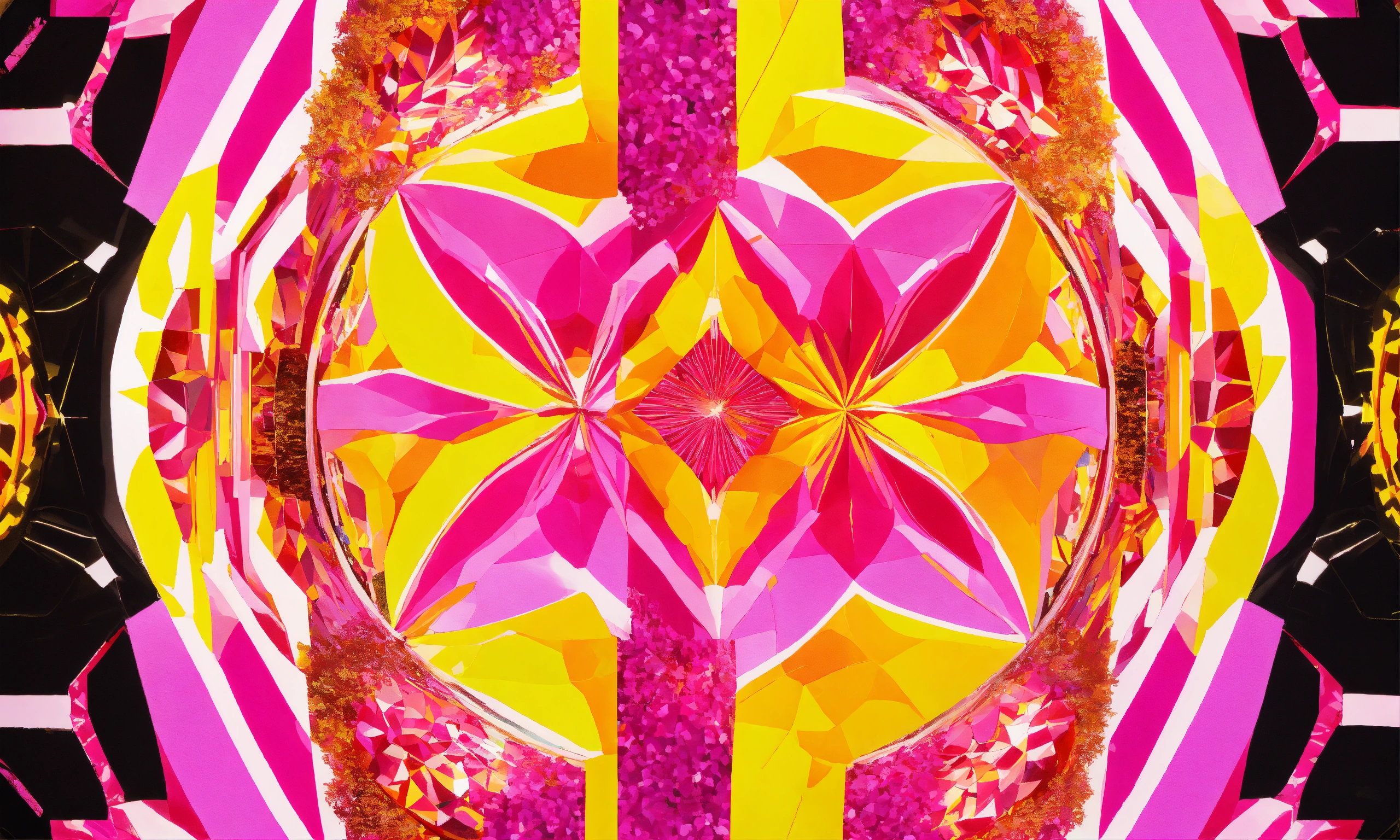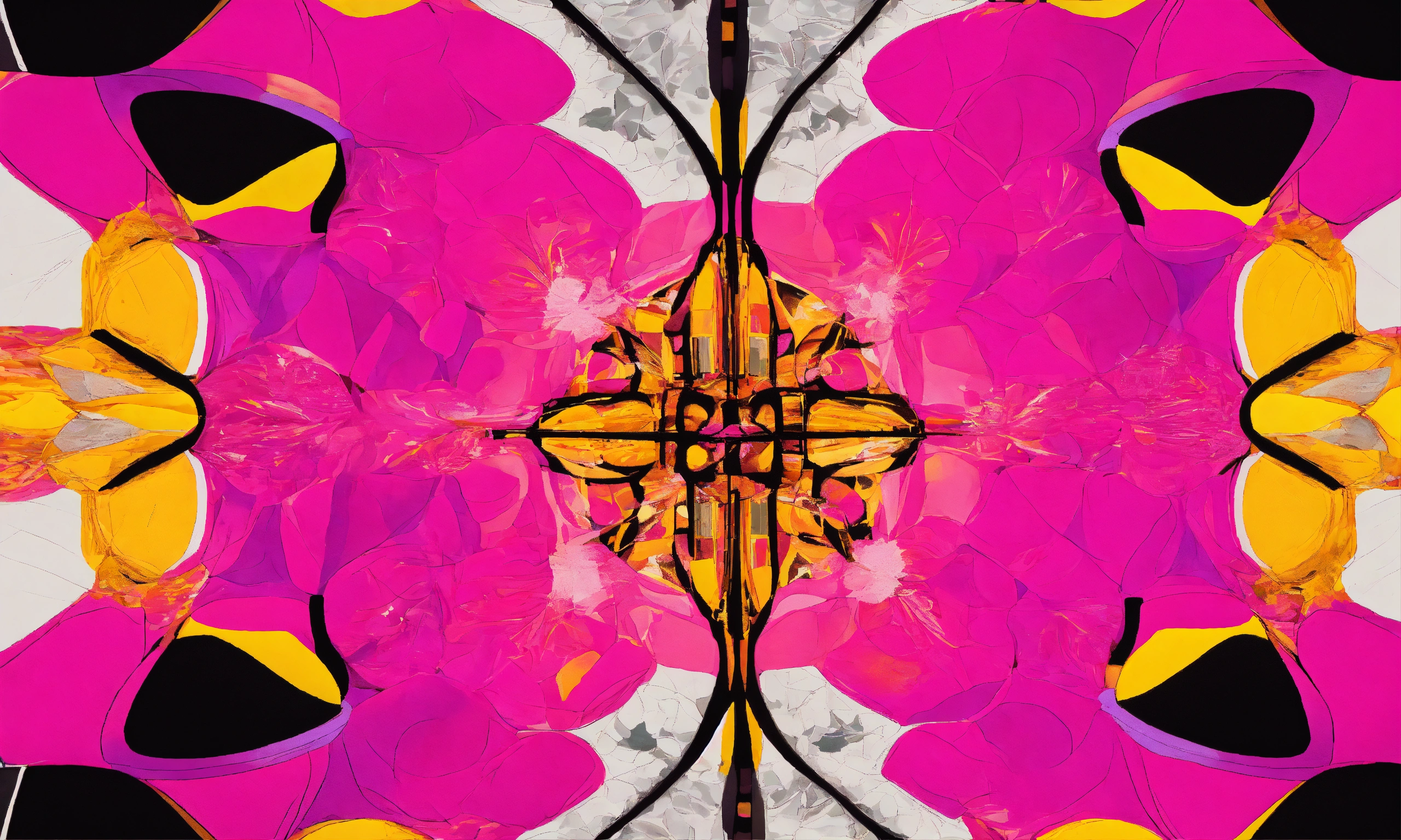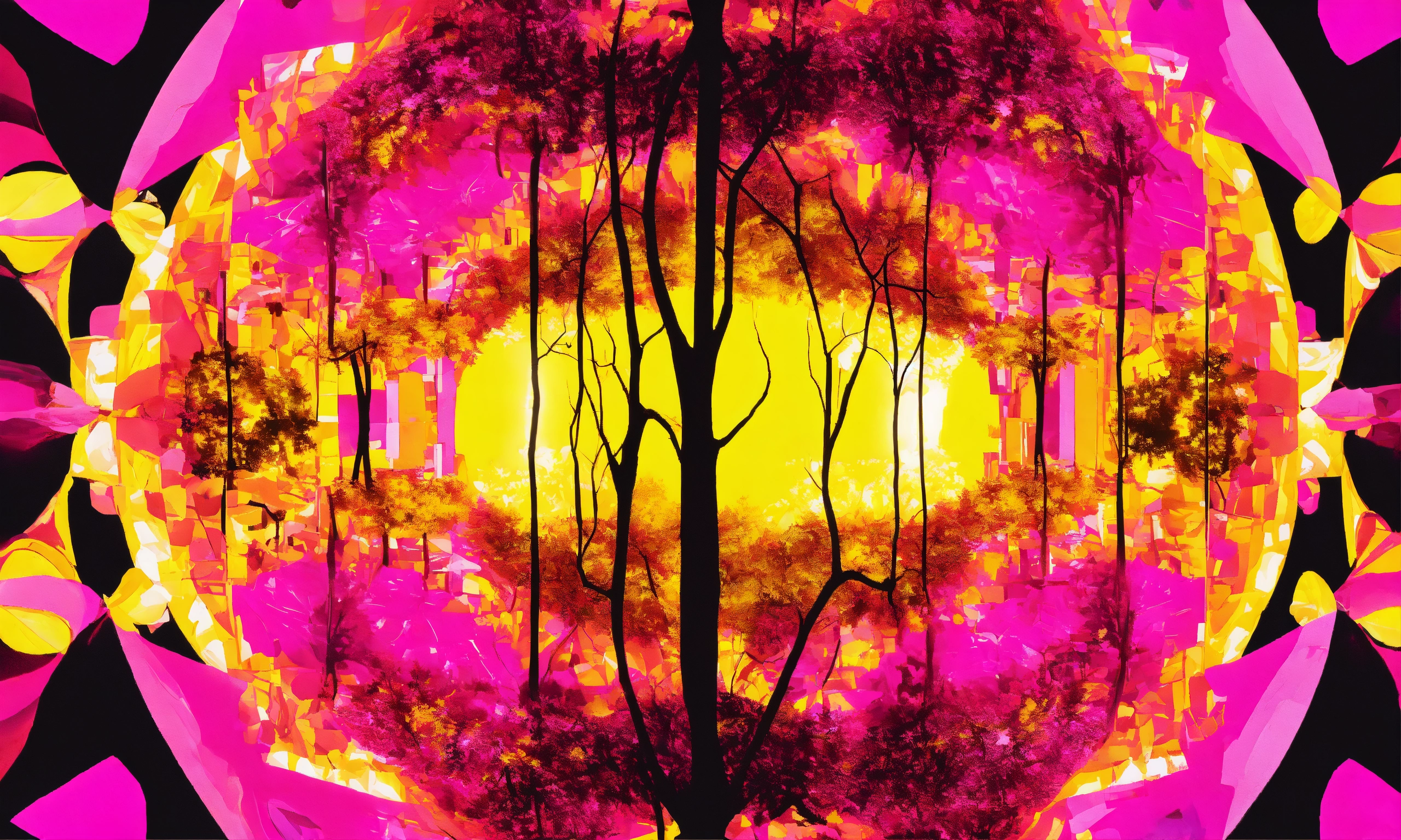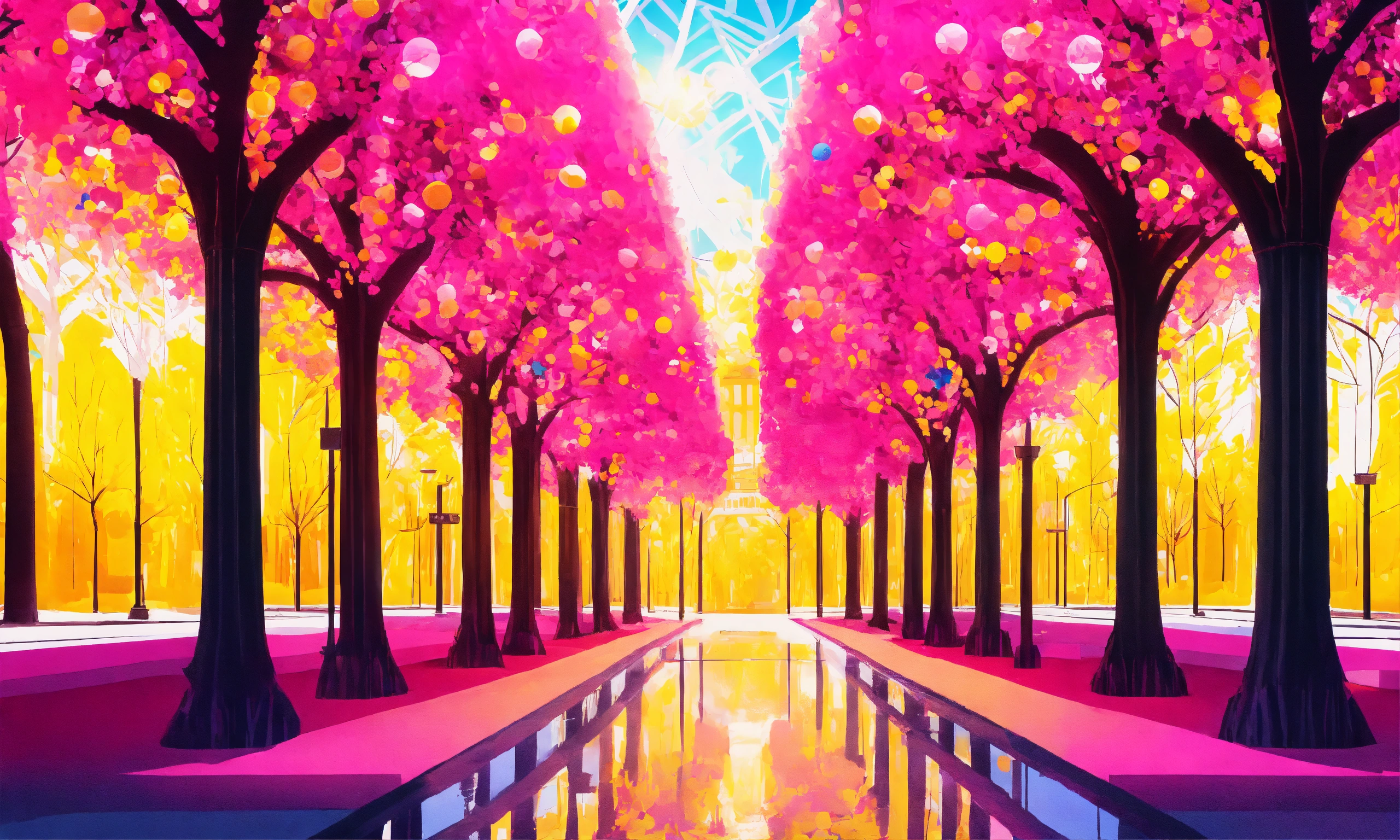 Kaleidoscopic abstractions of a city park with abstract objects, trees and shining sunlight in the style of hughes balls, bright pink, yellow. black. white