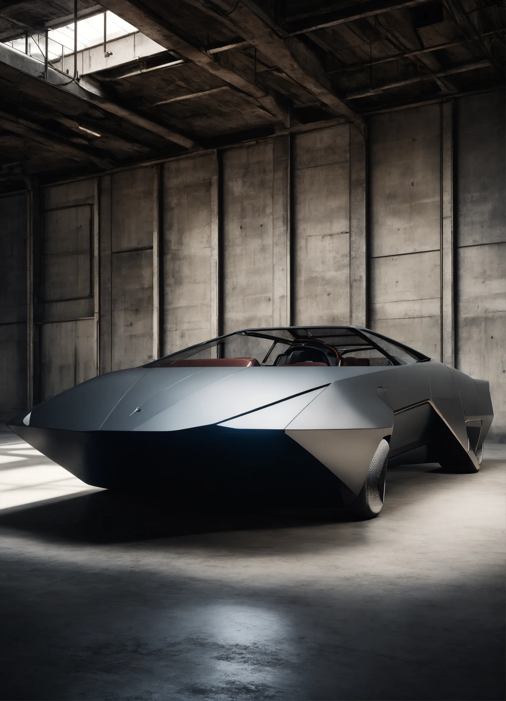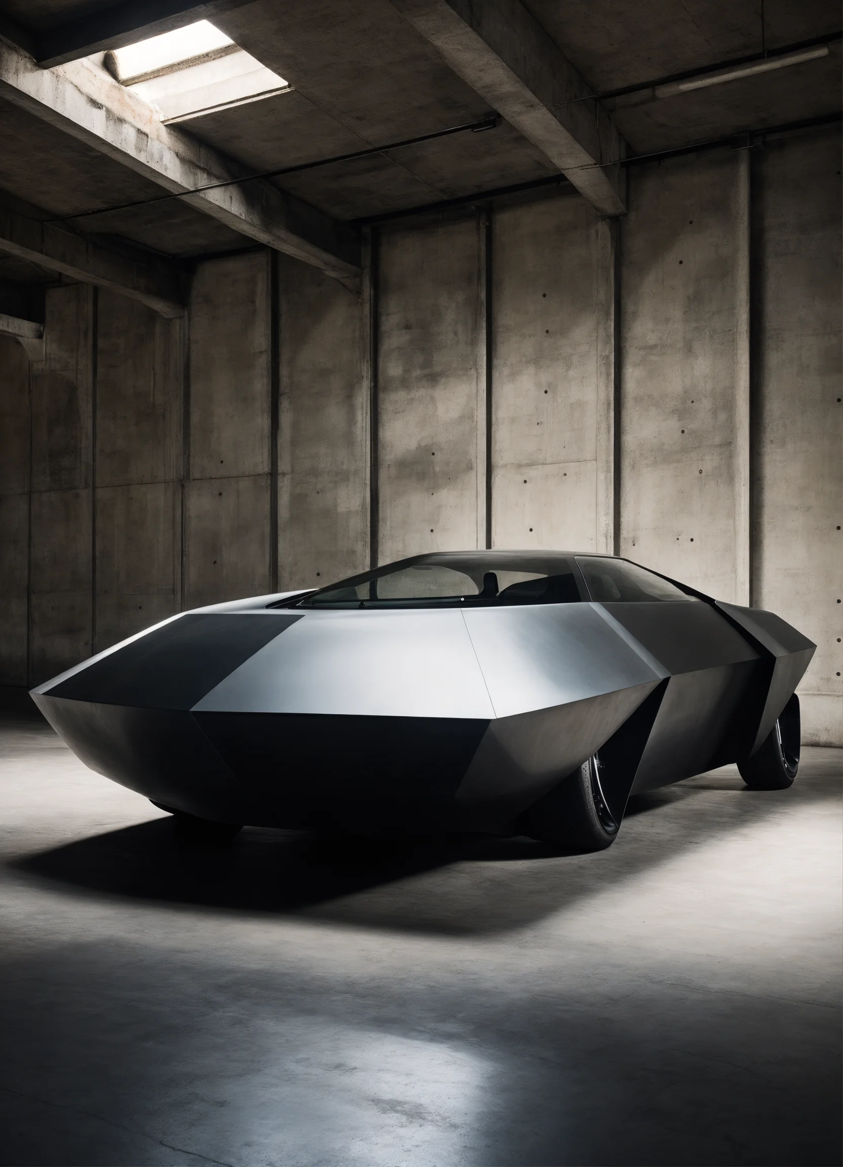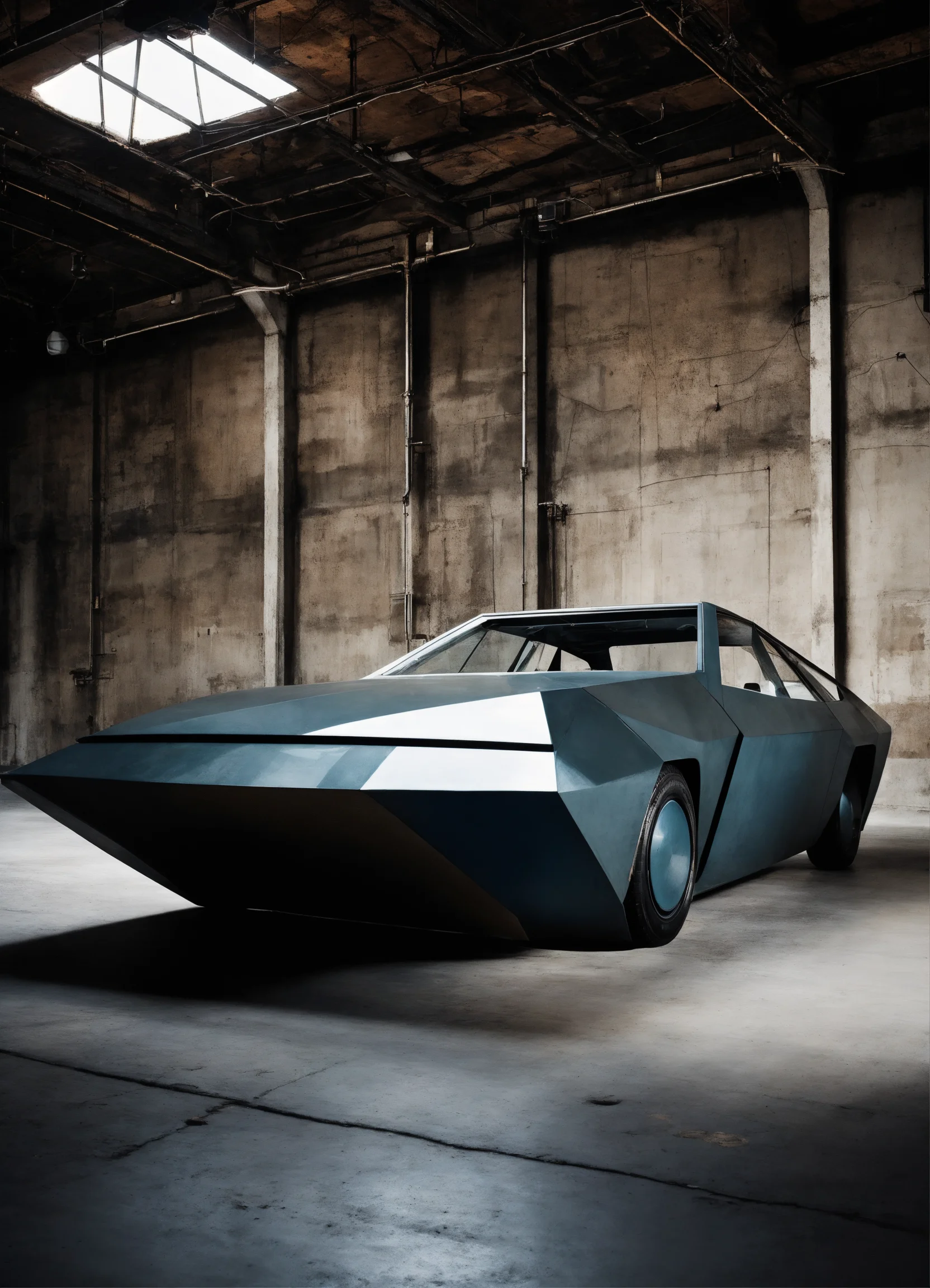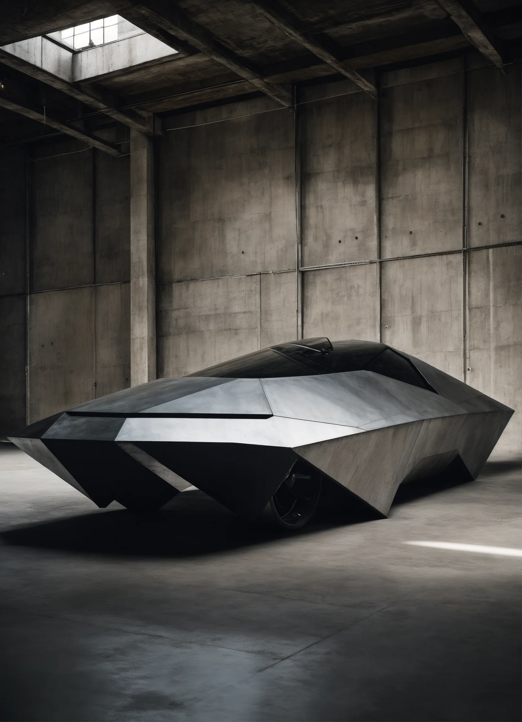 Minimalistic plolygon car rick owens in brutalism warehouse