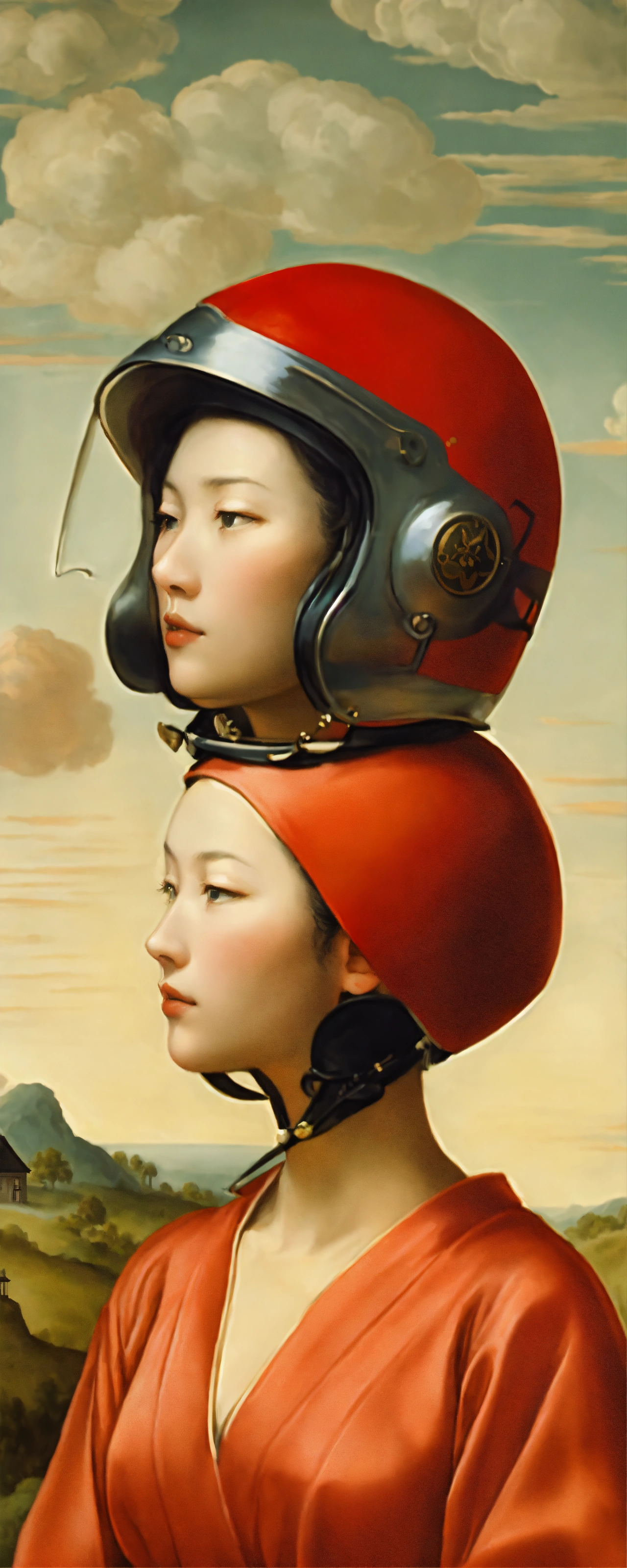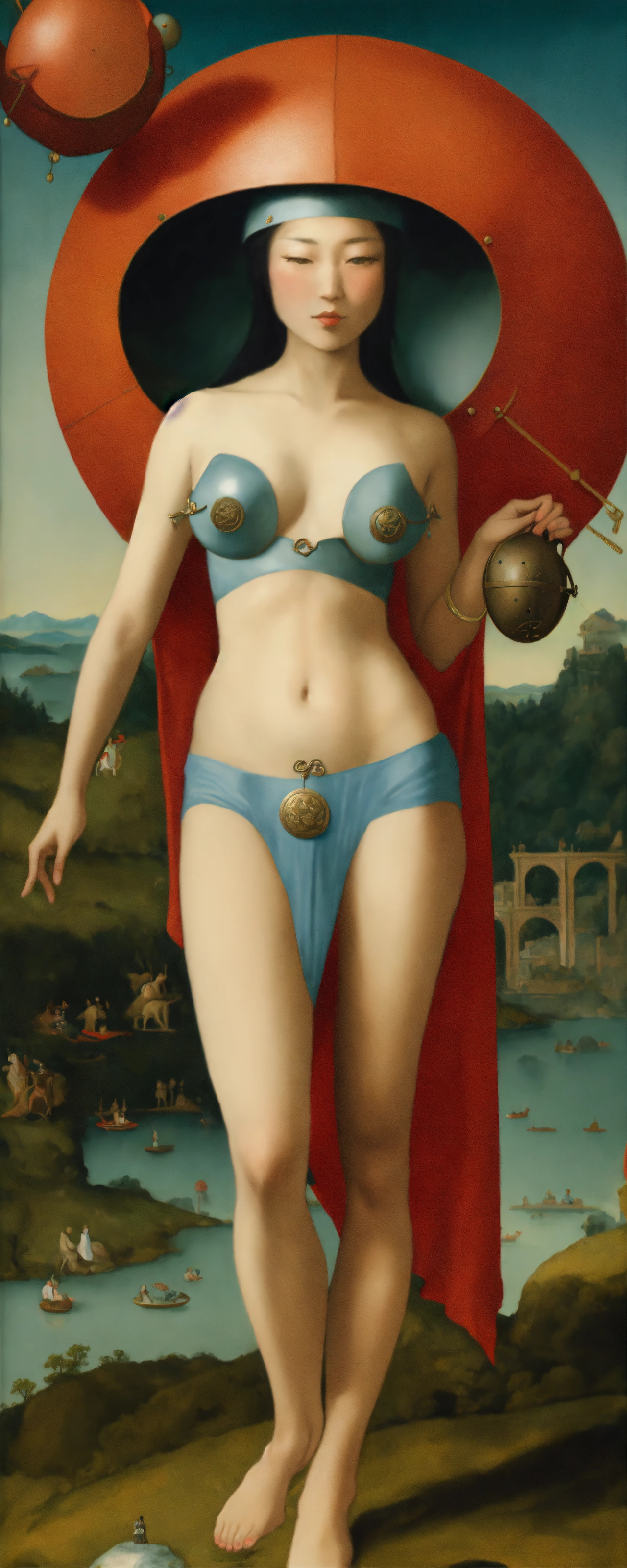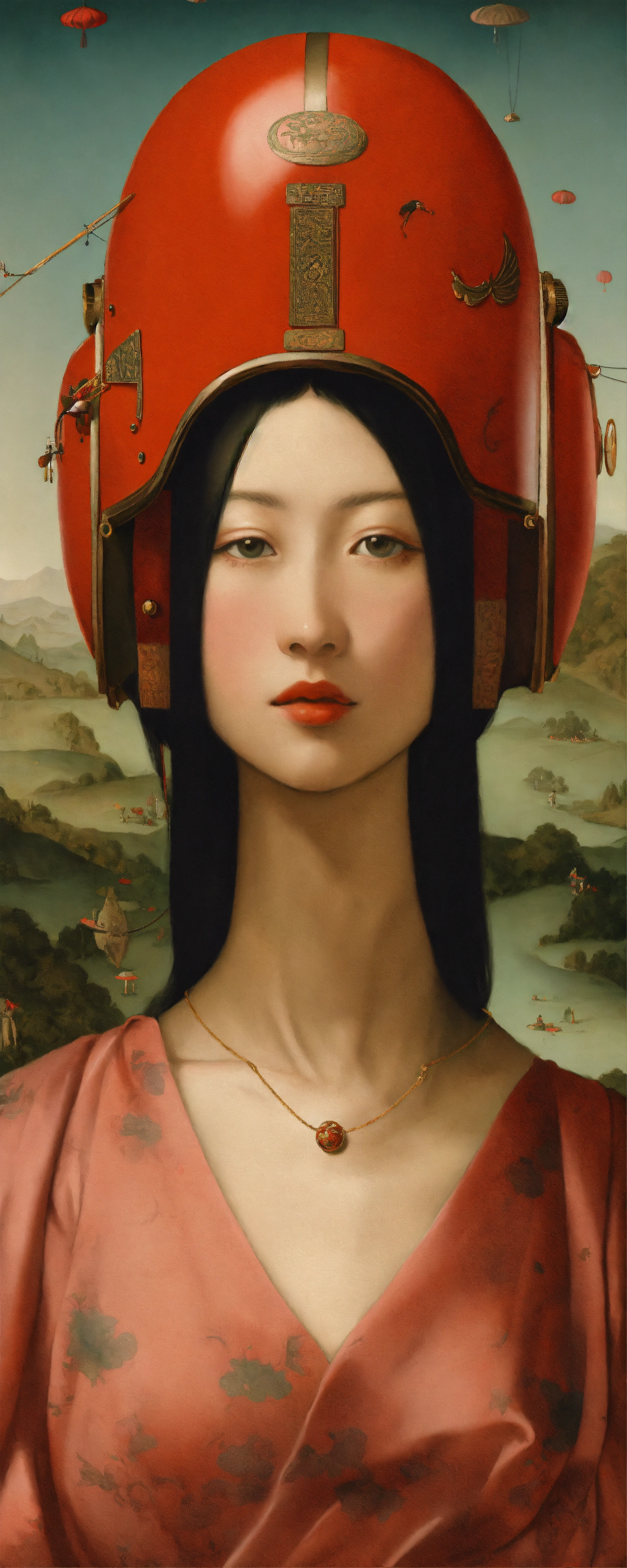 Portrait of chinese aphrodite with a red motorcycle helmet in the book of enough, illustrated by hieronymus bosch and rene magritte, 64k resolution, highly-detailed surrealistic forbidden painting, the year 2067