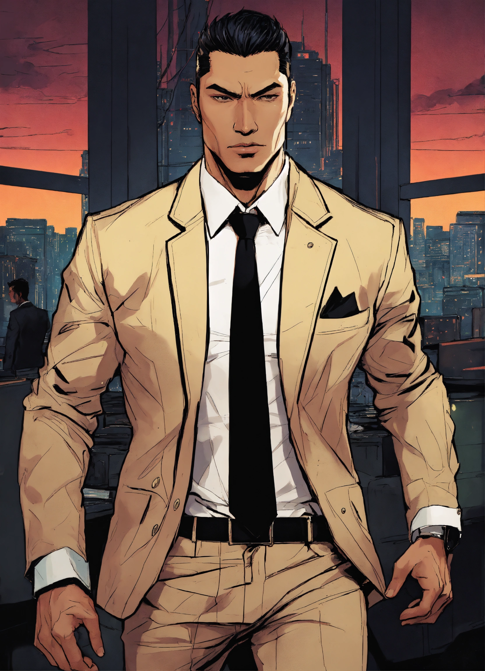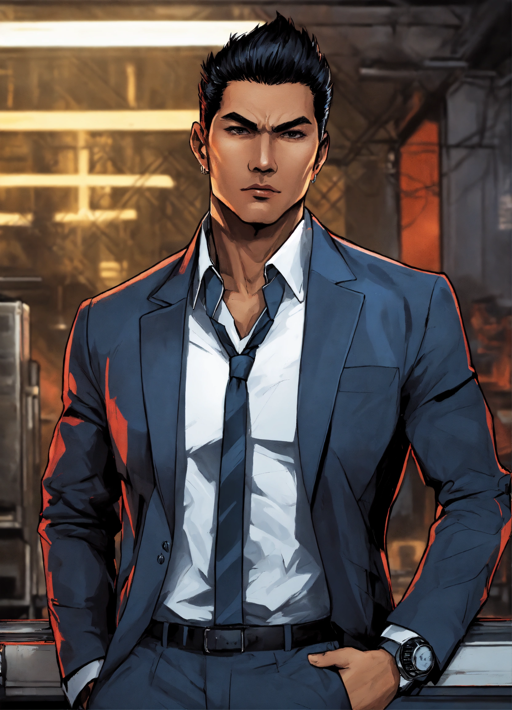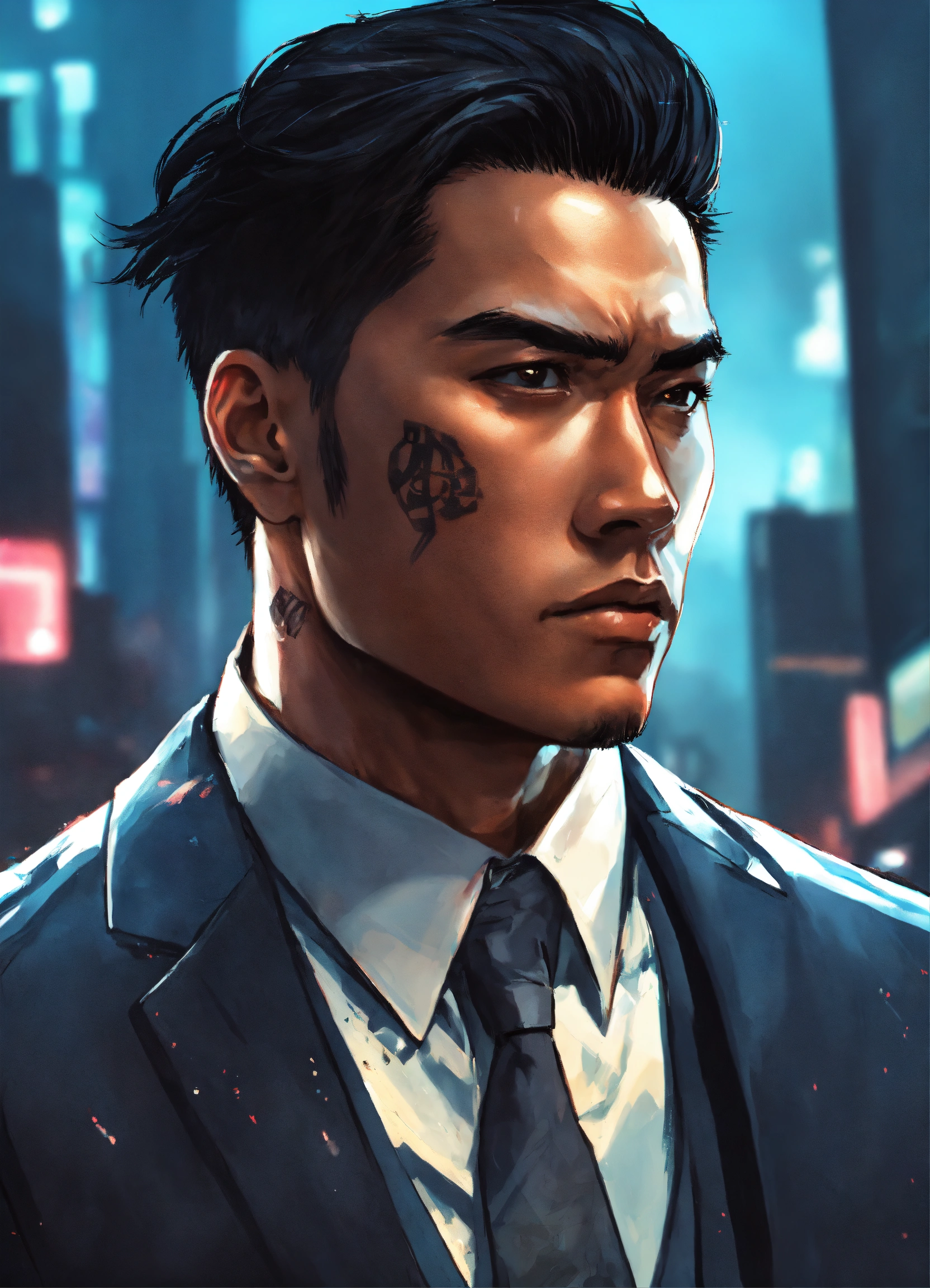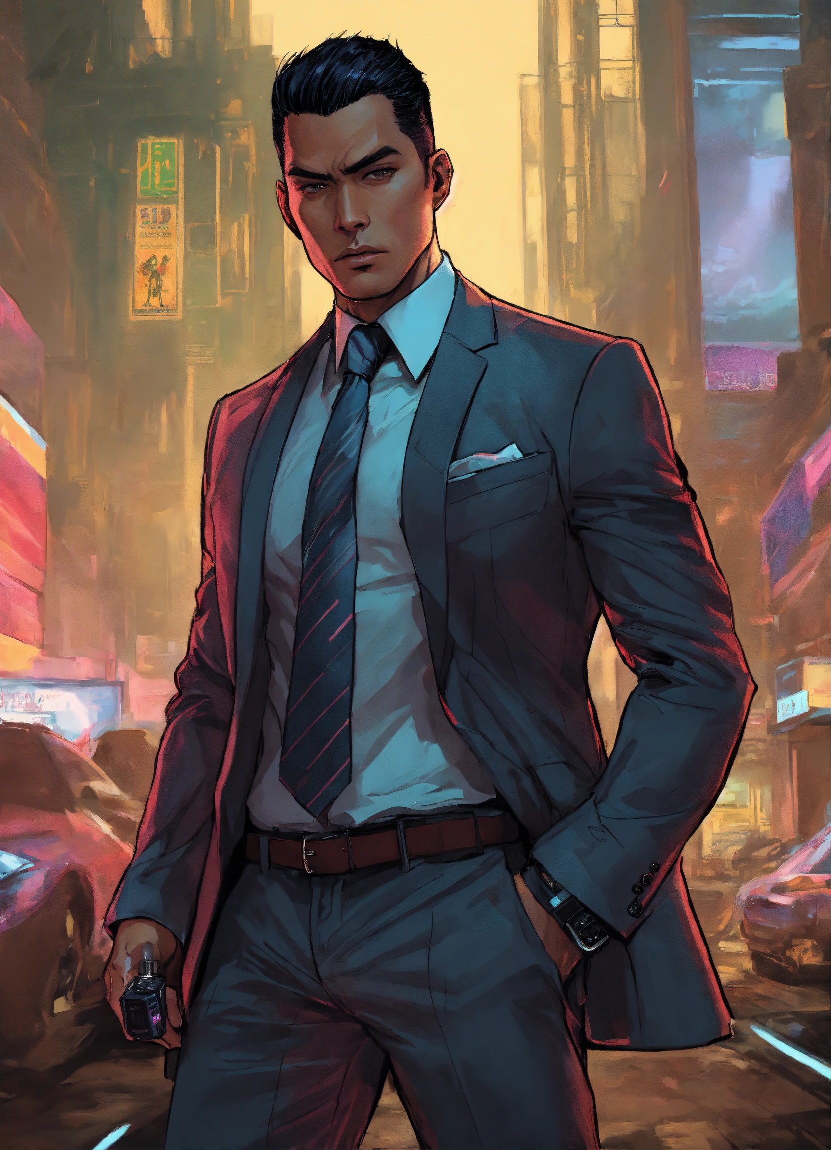 Filipina cyberpunk male evil corporate businessman attractive and tough in a suit gritty realistic comic book art style