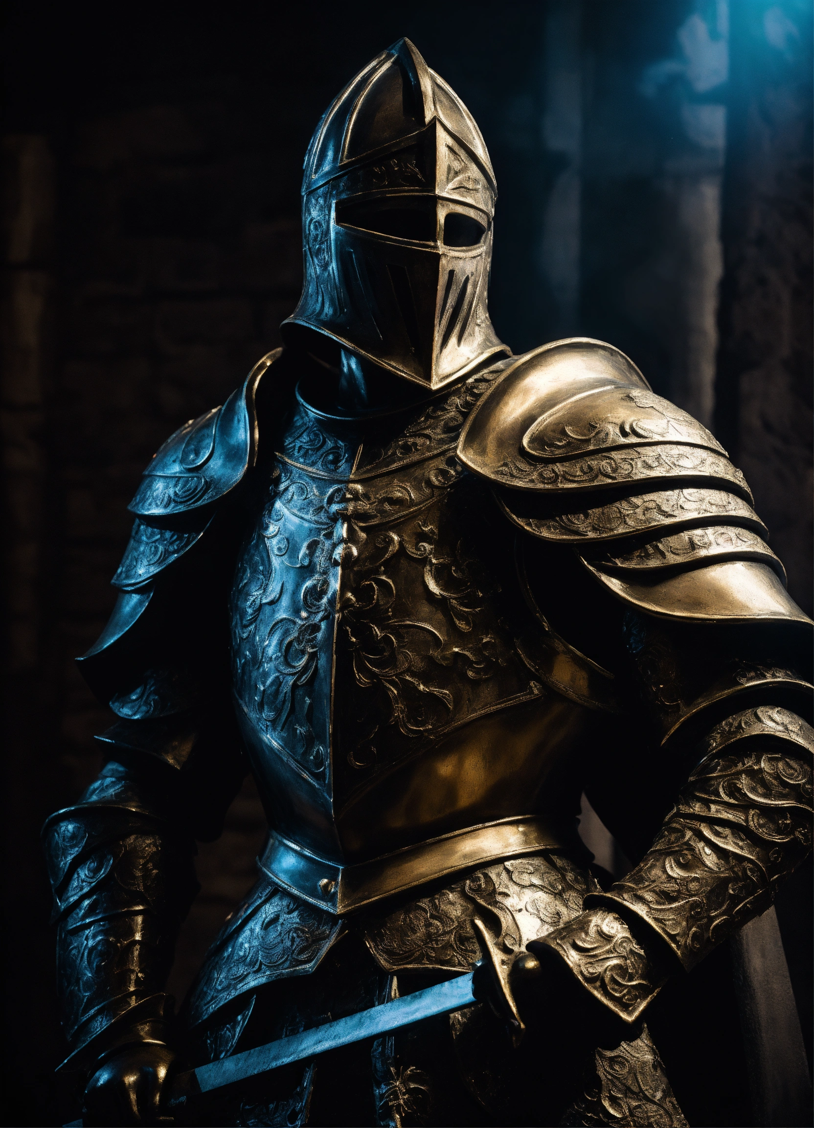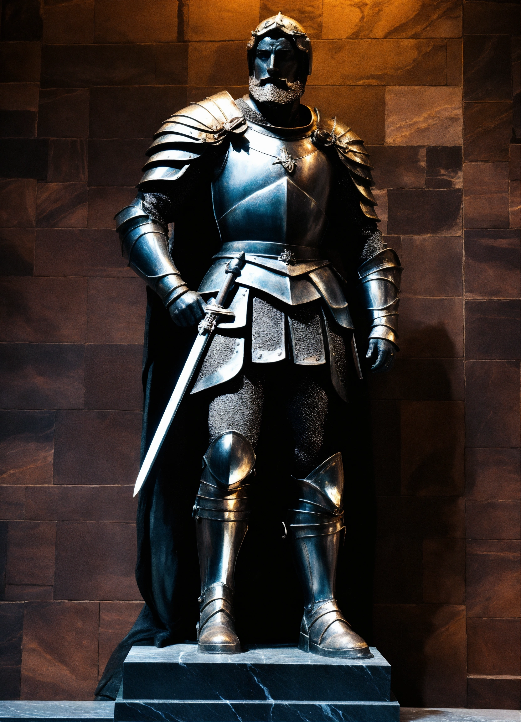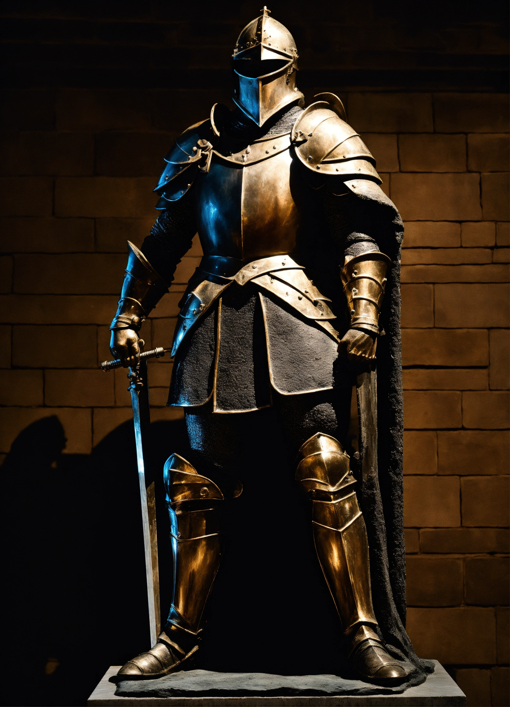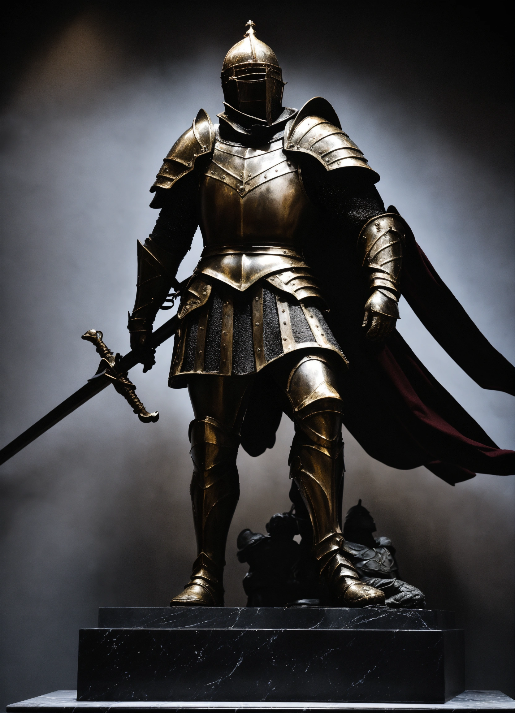 A muscular medieval knight statue set against a background of deep black tones, with dramatic interplay of light and shadow, accentuating the knight's sculpted physique and features, creating an atmosphere of mystery and contemplation, sculpture, marble with strategic spotlighting to enhance contrast, monument background