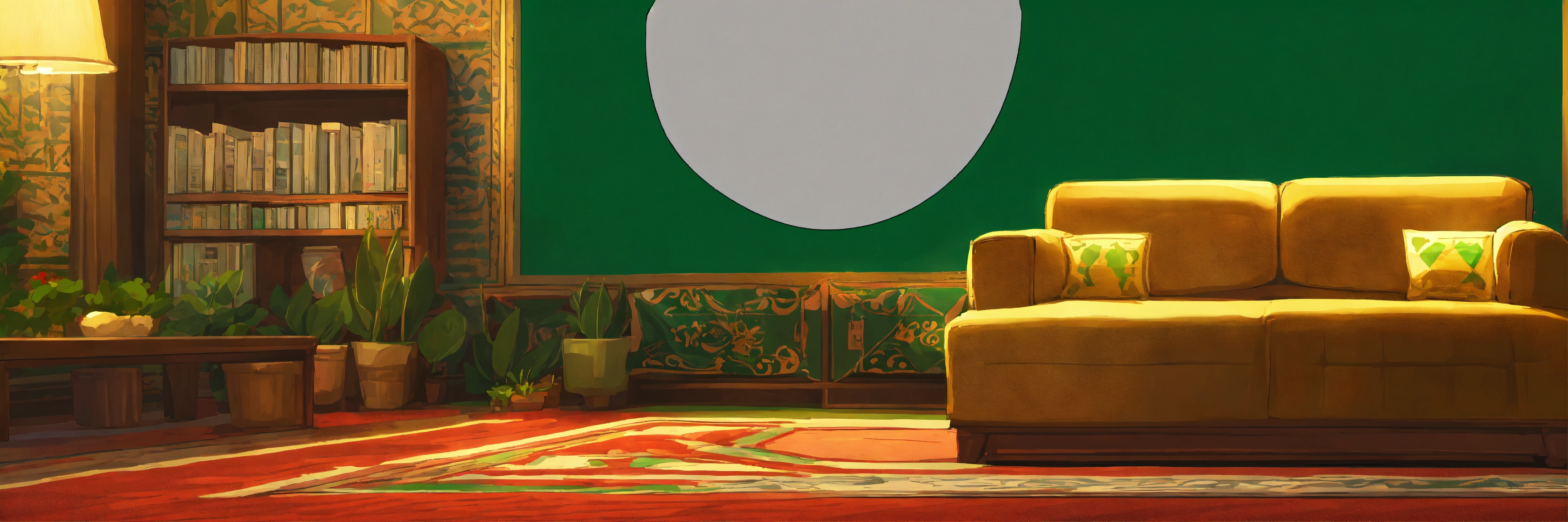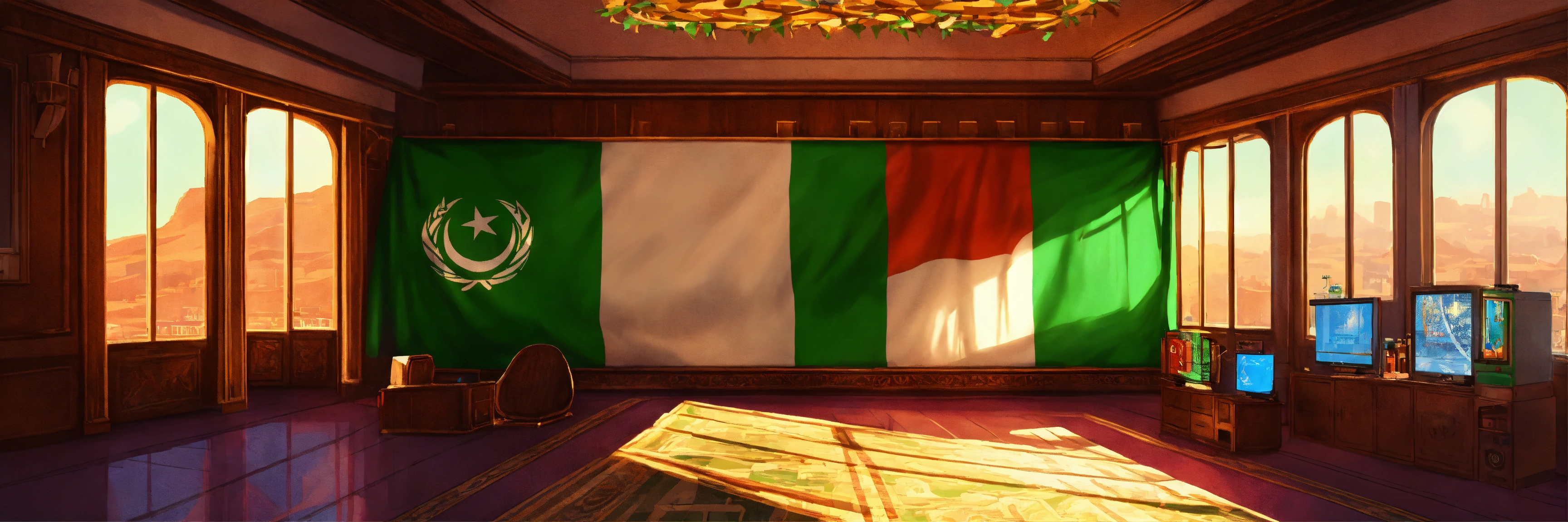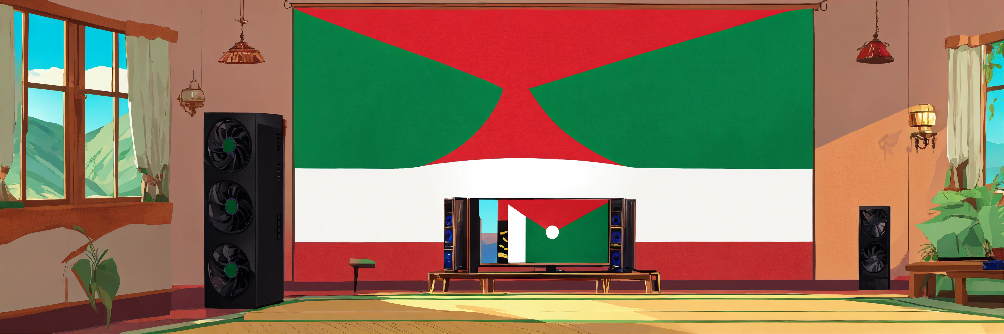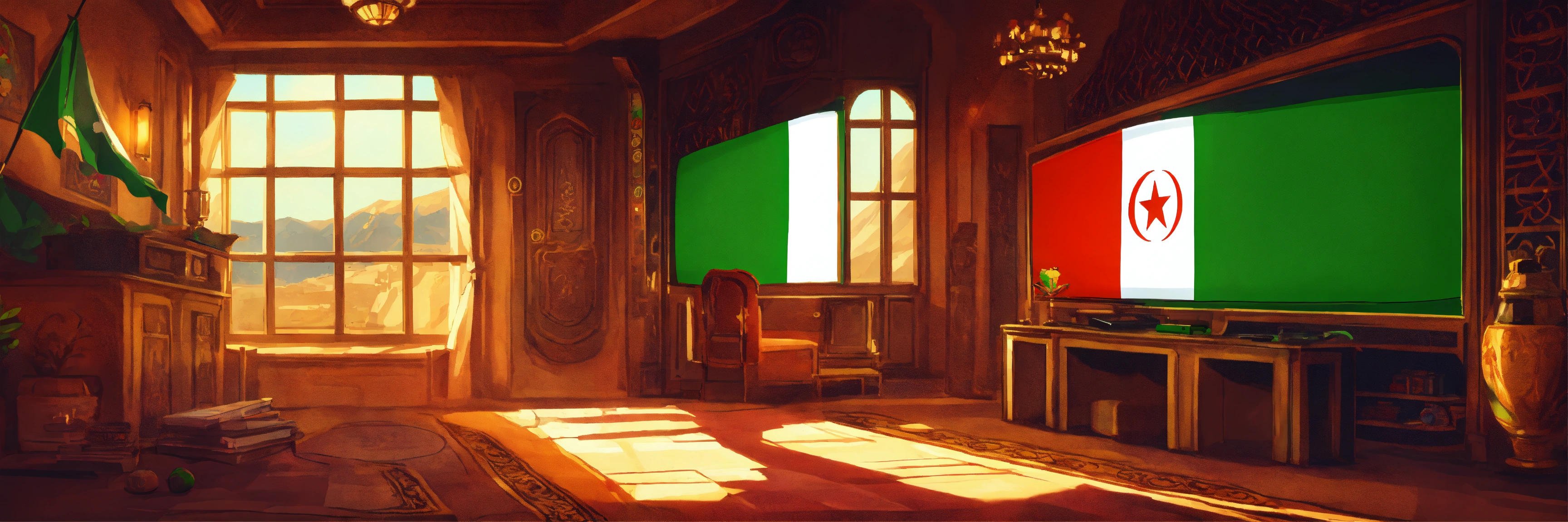 I would like a stylized illustration of a room where there's a gaming pc with an algerian flag adorning the wall in the background