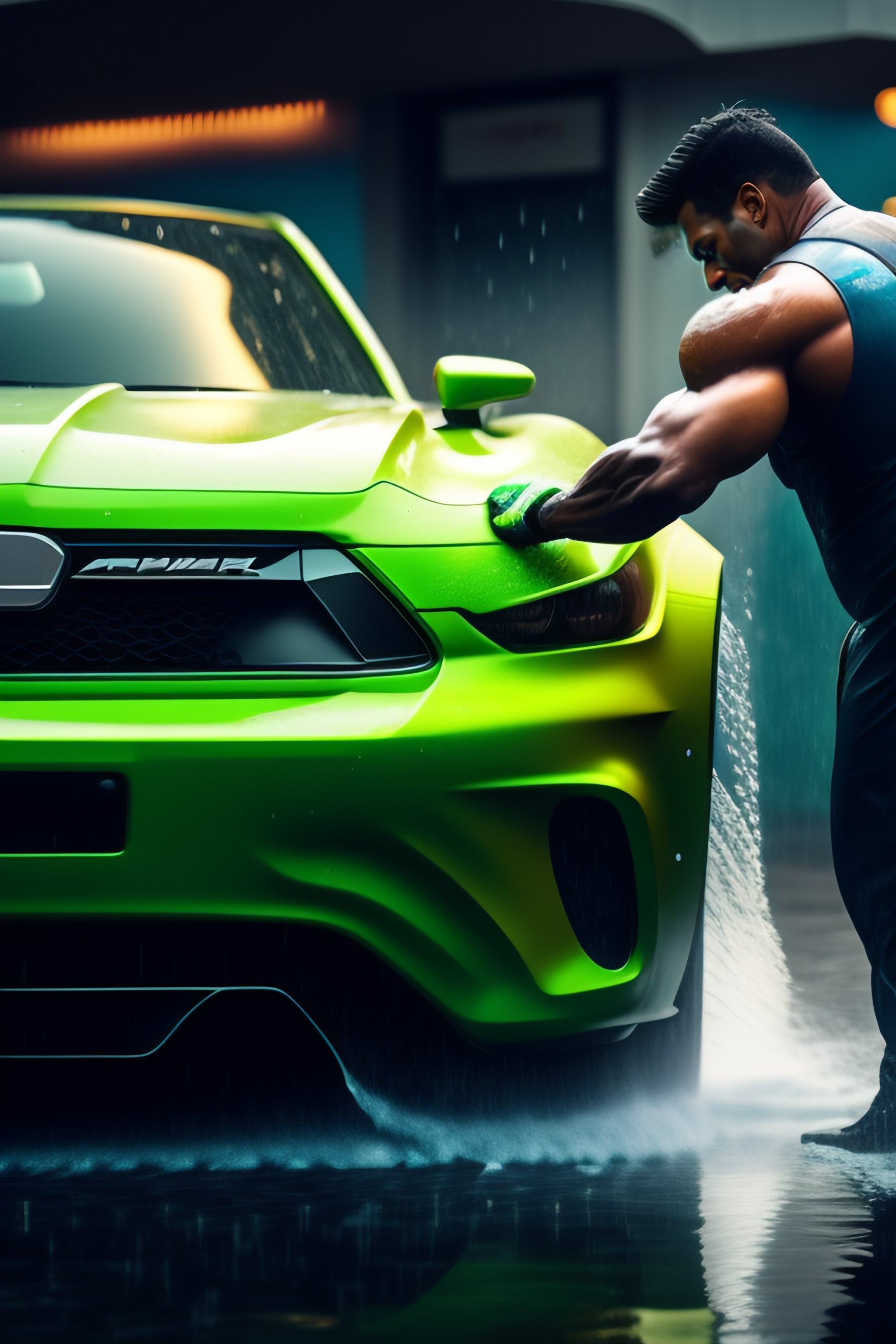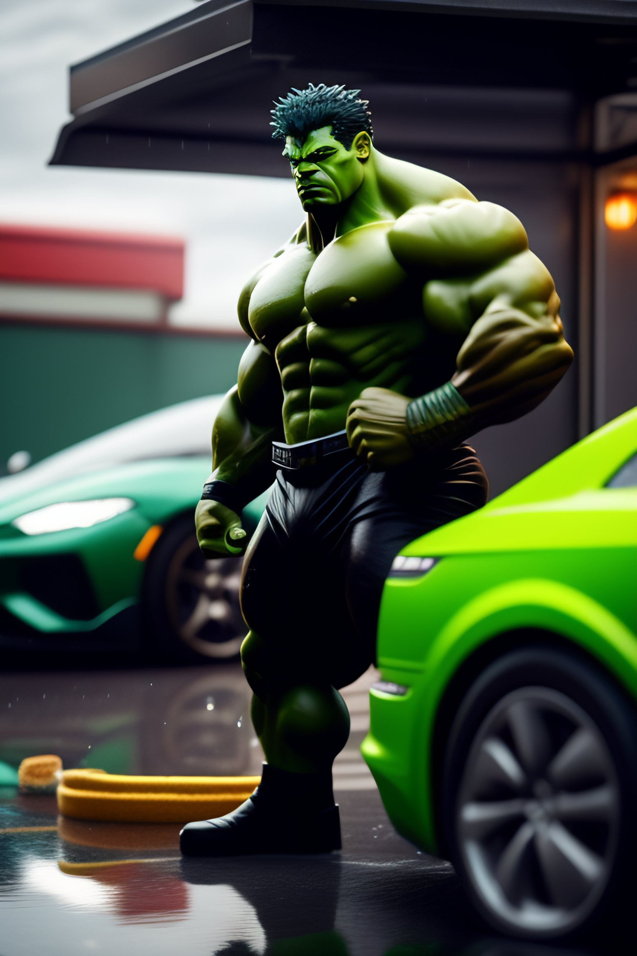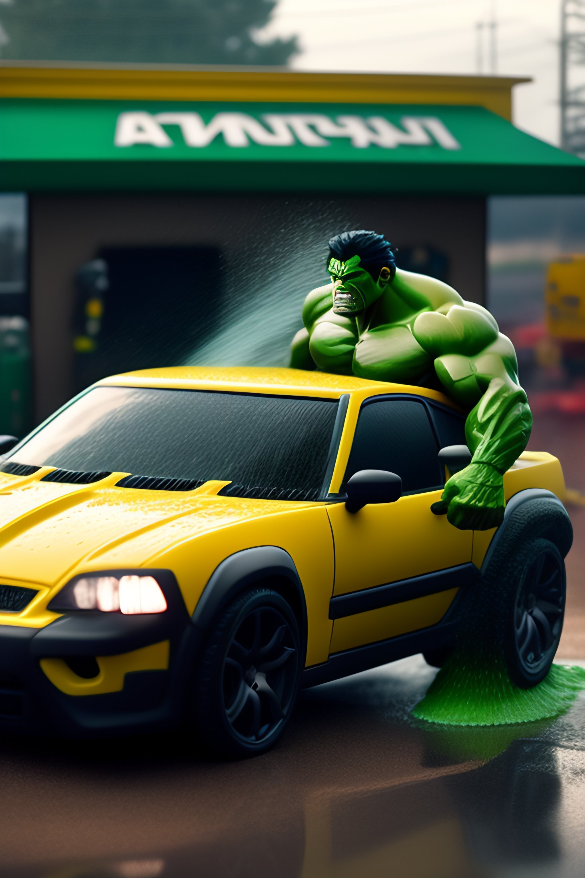 The hulk working at a car wash, but damaging a car that he is washing with a lot of effort. on a rainy day, a lot of people are working at the car hulk working at a car wash, but damaging a car that he is washing at a diner, dramatic, matte painting, highly detailed, cgsociety, hyperrealistic, --no dof, --ar 16:9