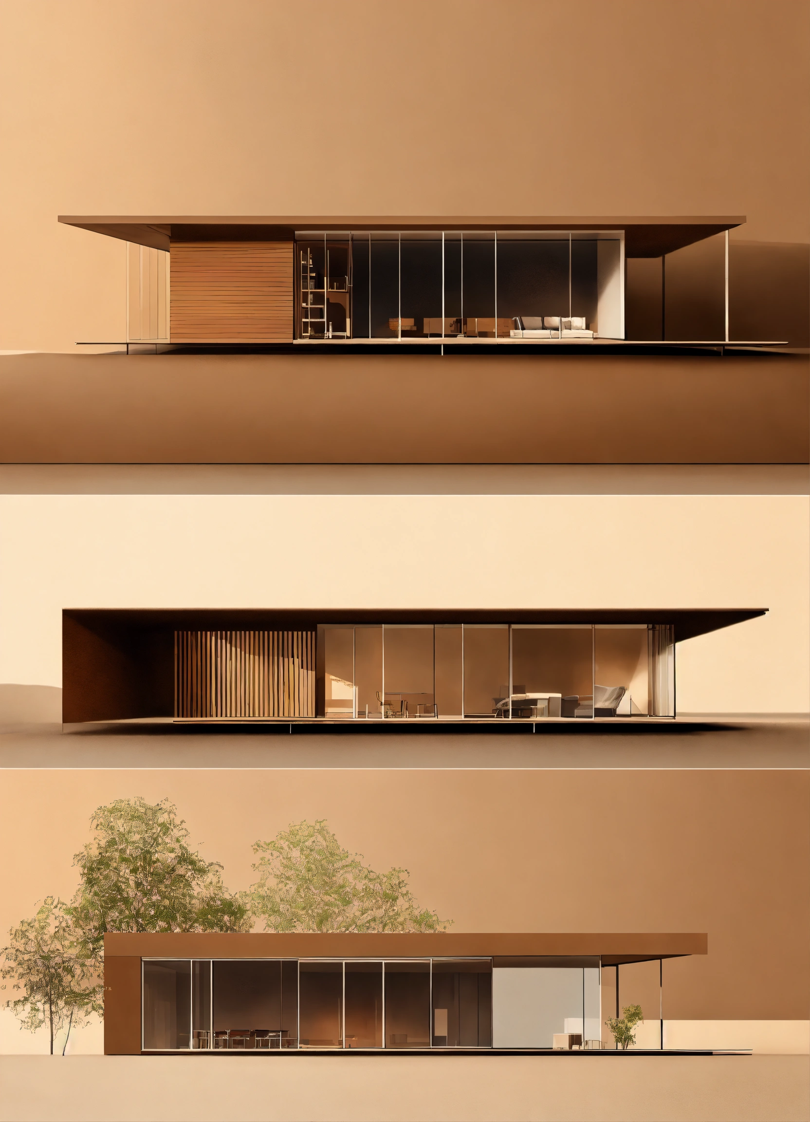 Photorealistic technical drawing of modern minimalist one story house like ludwig mies van der rohe on brown background photorealistic