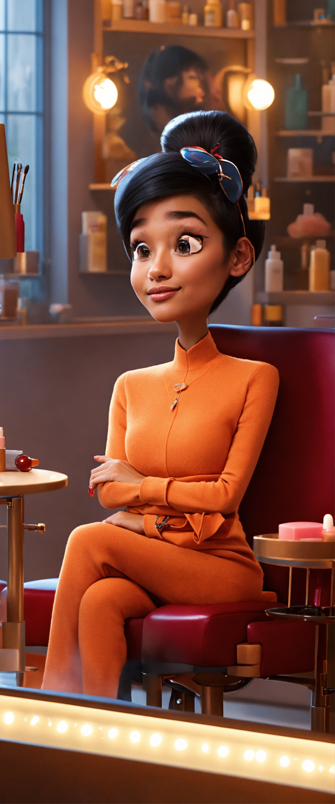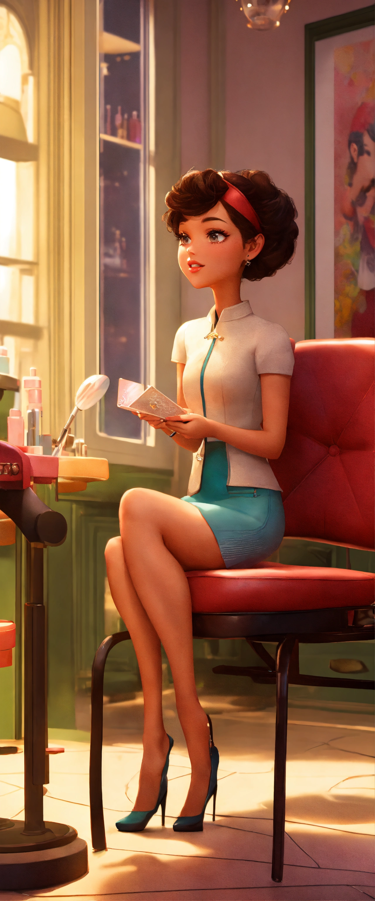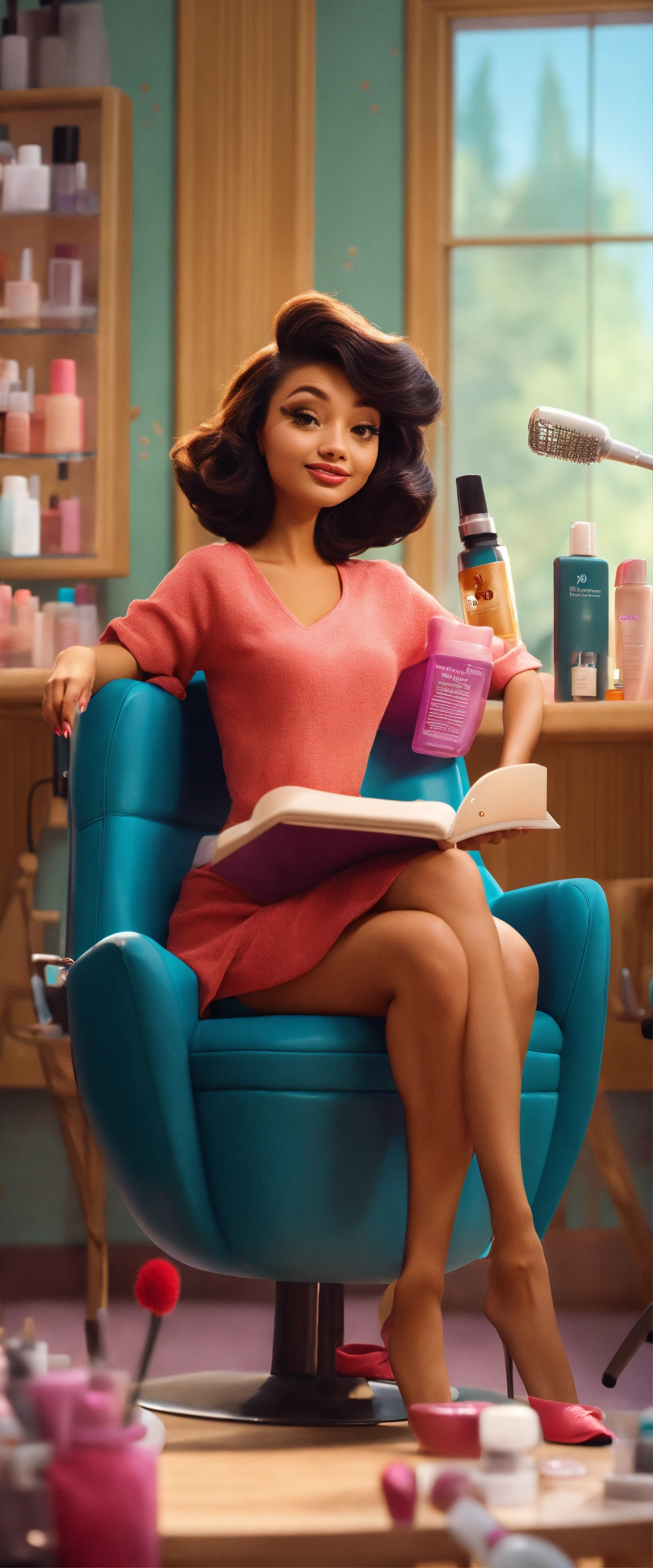 A beautiful pixar woman sat on a chair in a beauty salon discussing beauty tips