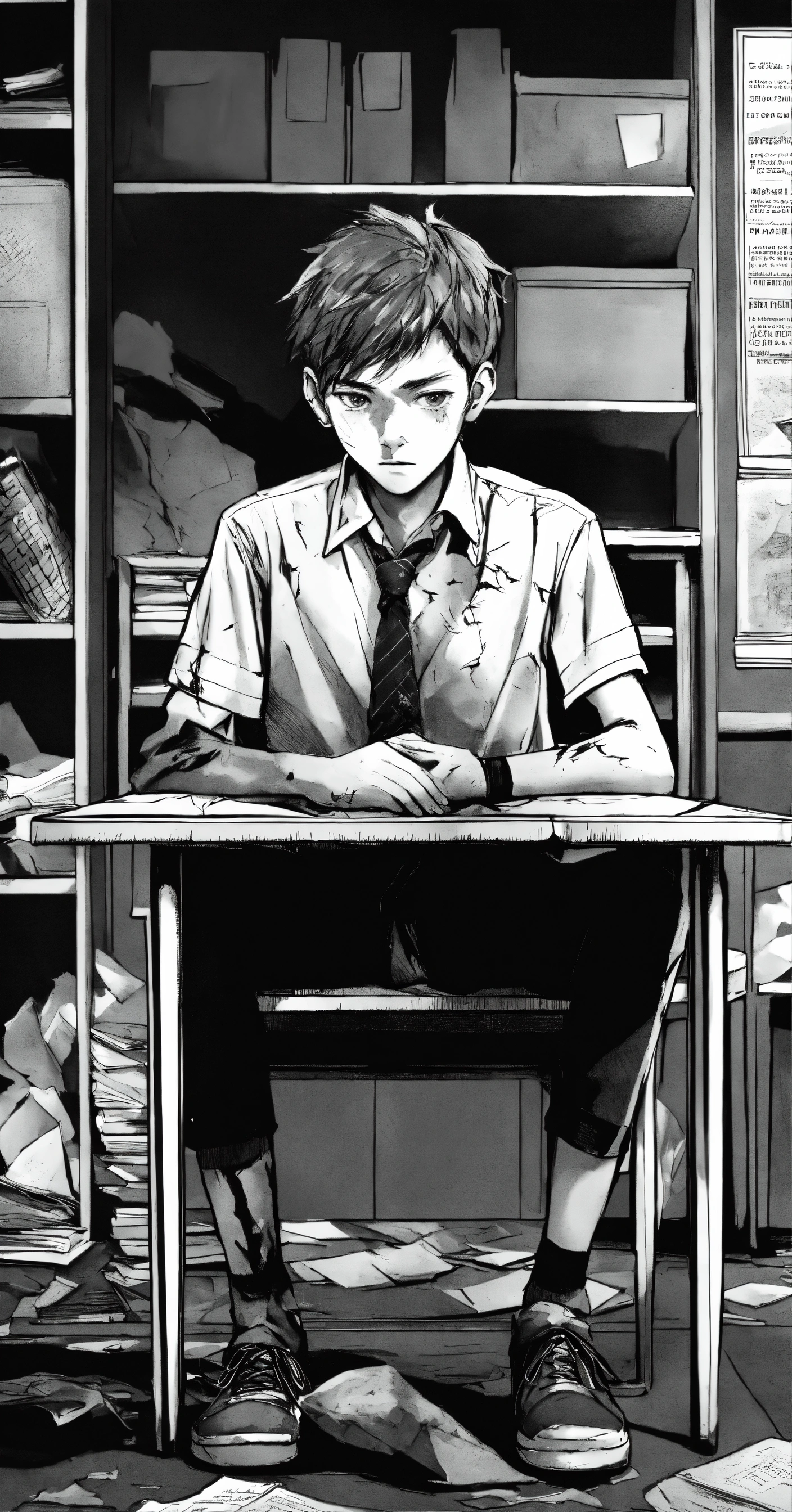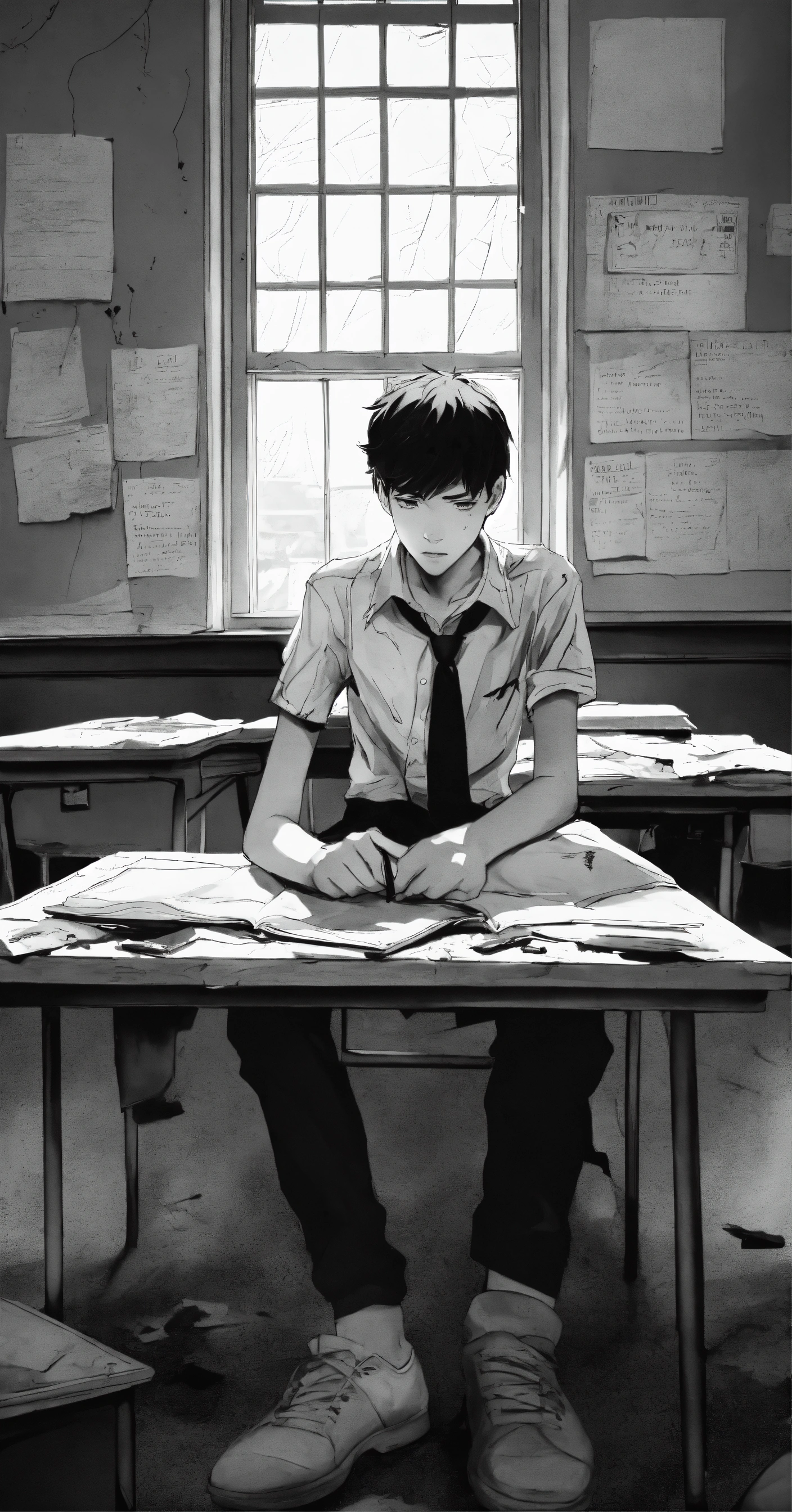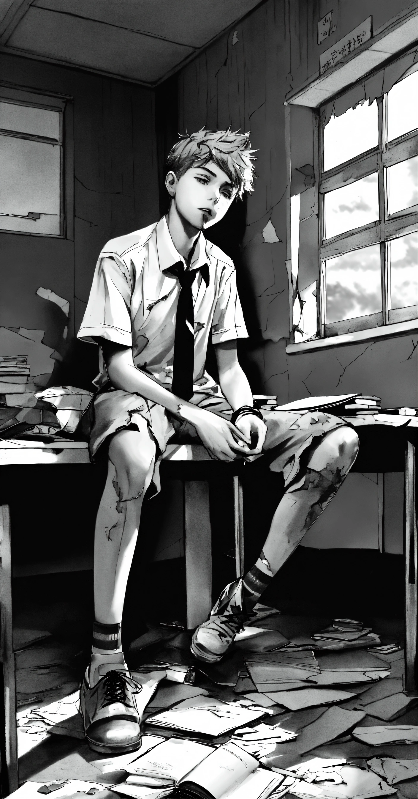 Black and white illustration, wide angle environmental full body shot of 15 year old, sitting in desk, at school, day dreaming, wearing school uniform, tattered torn shirt, porcelain cracked skin, (vibrant, dramatic, dark, sharp focus).