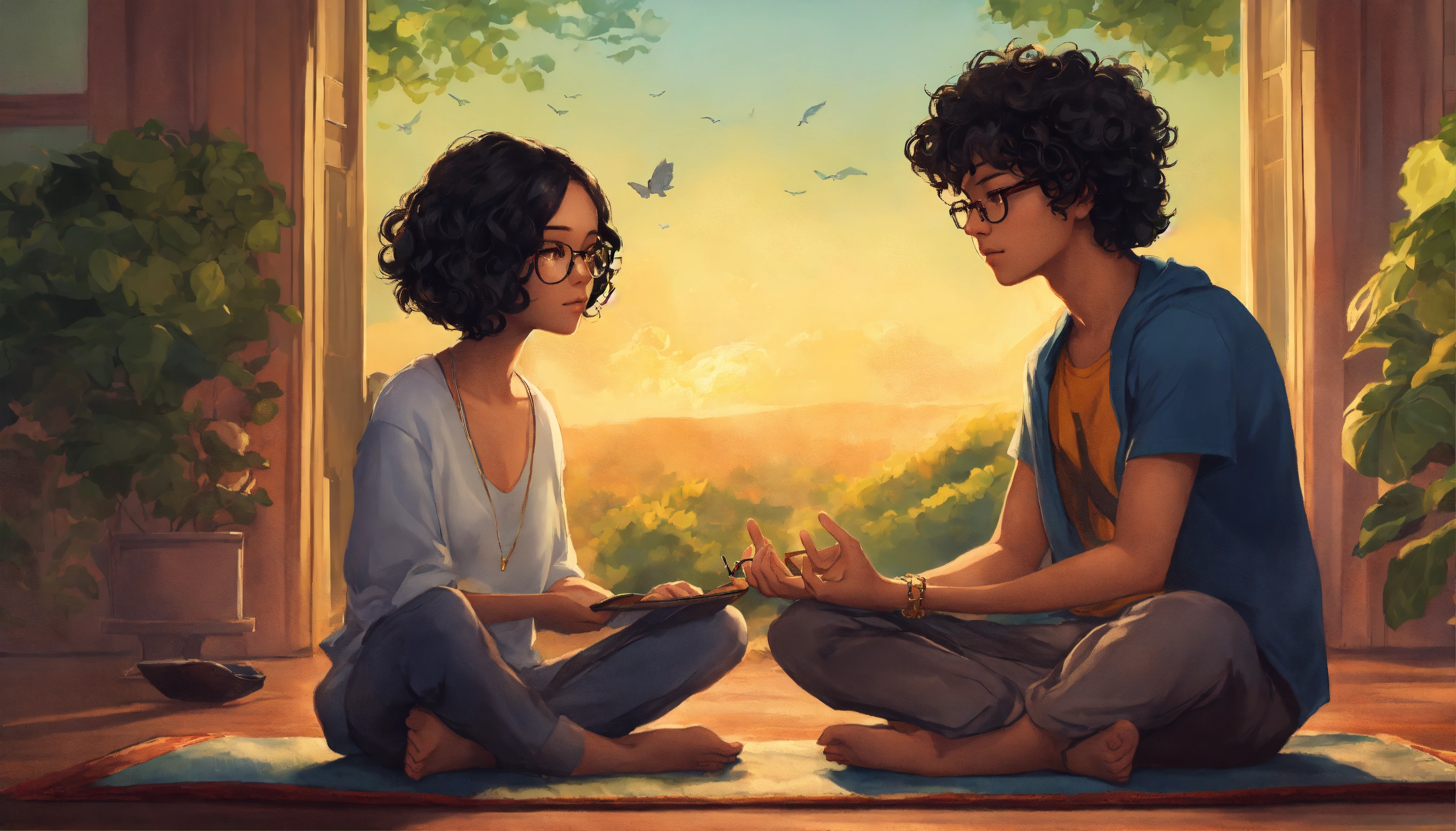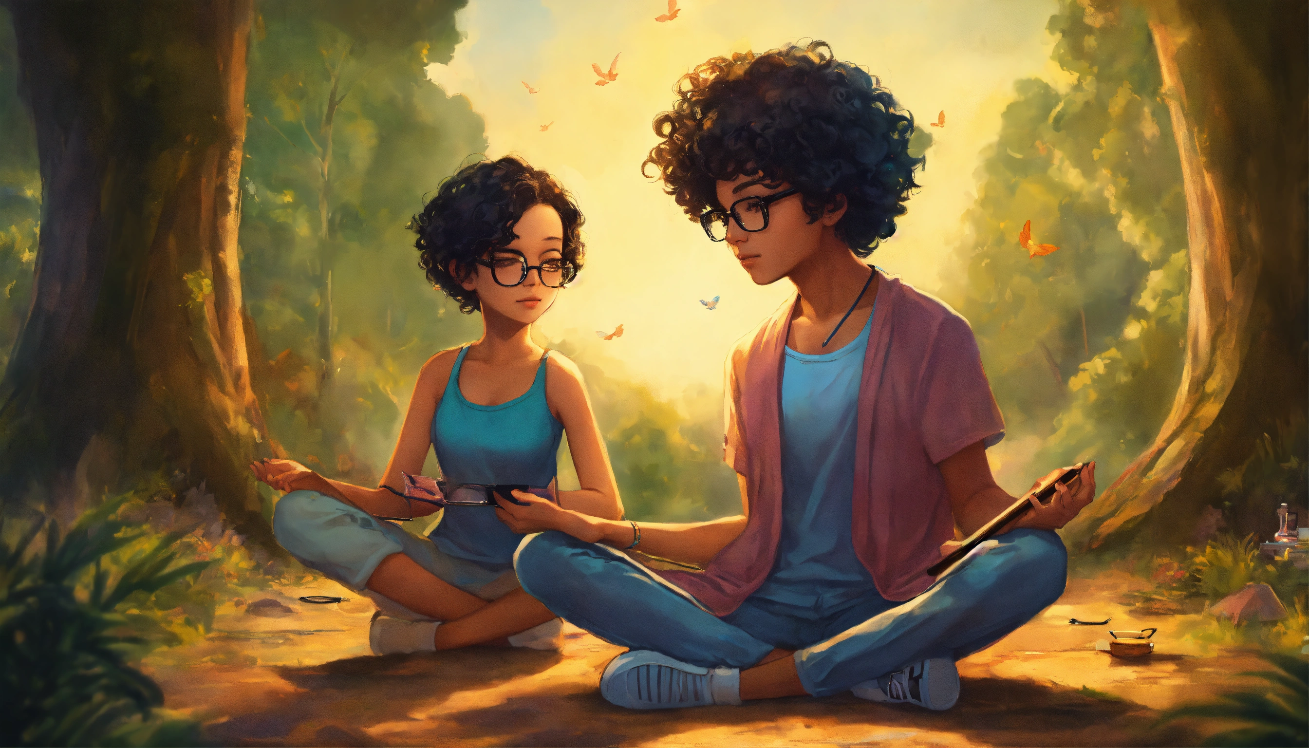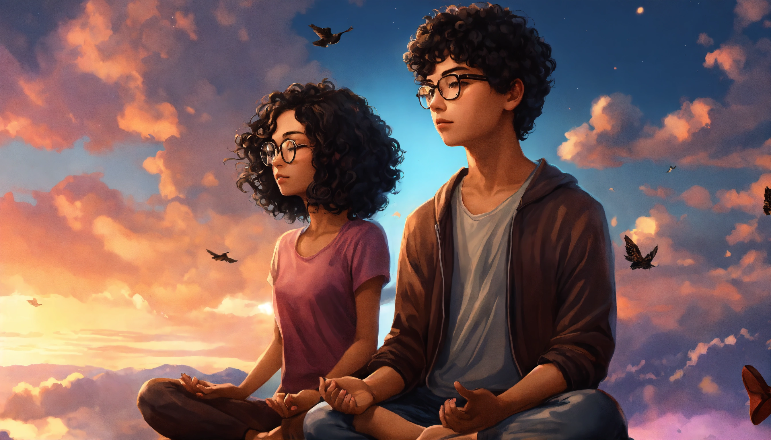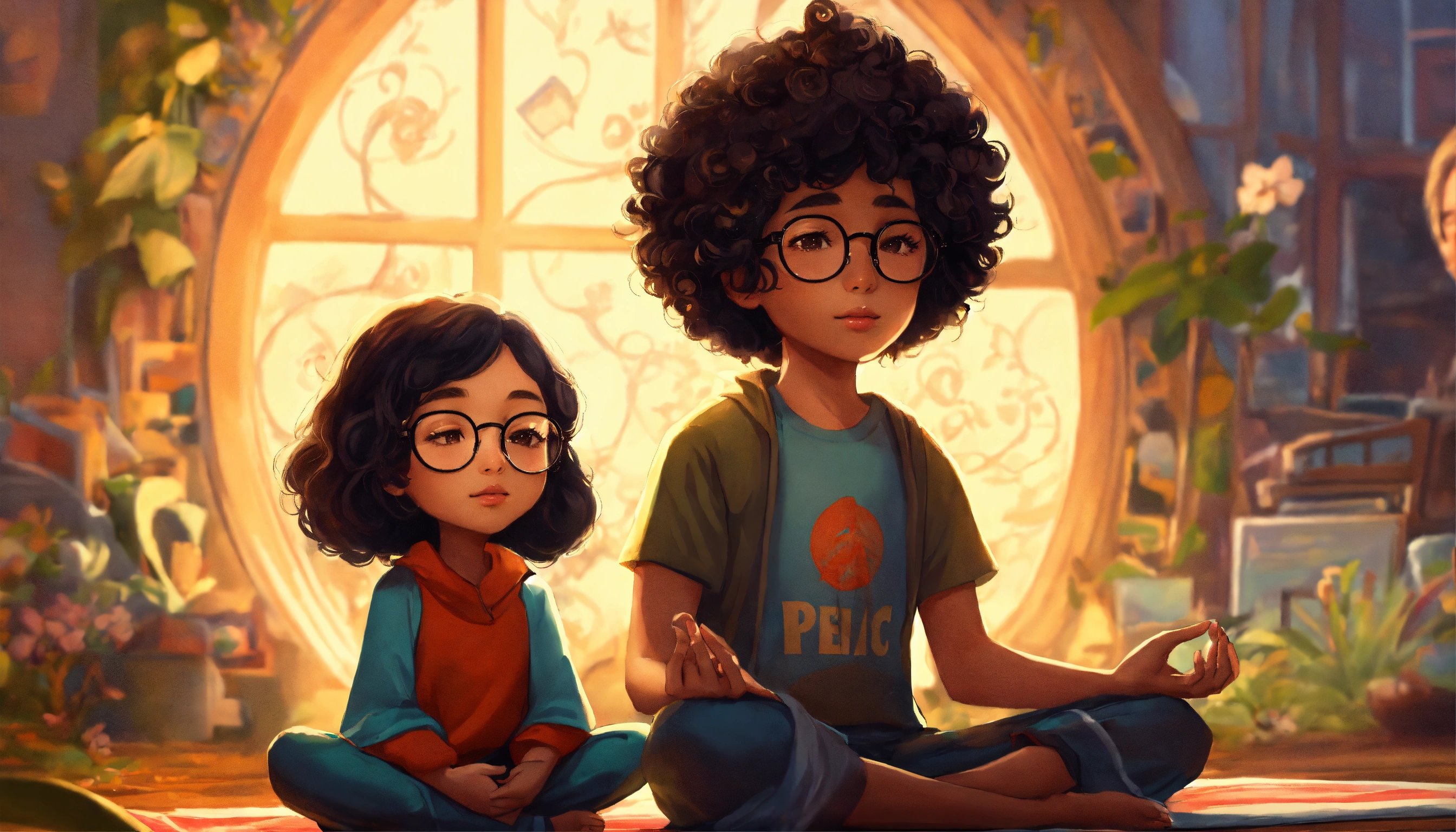 Illustrated realistic, a girl with black curly hair and a boy with glasses and short straight hair, meditating, peace, music