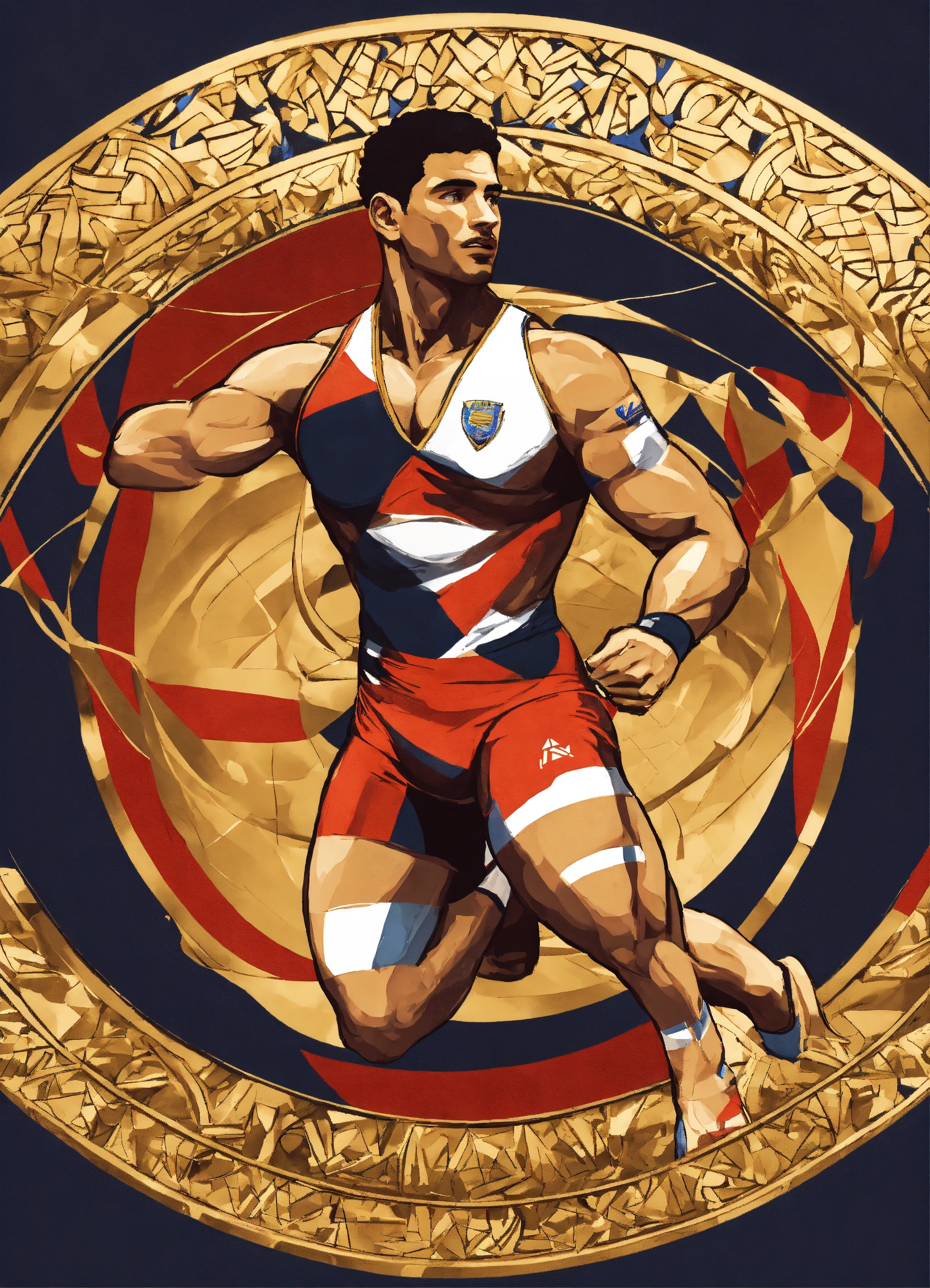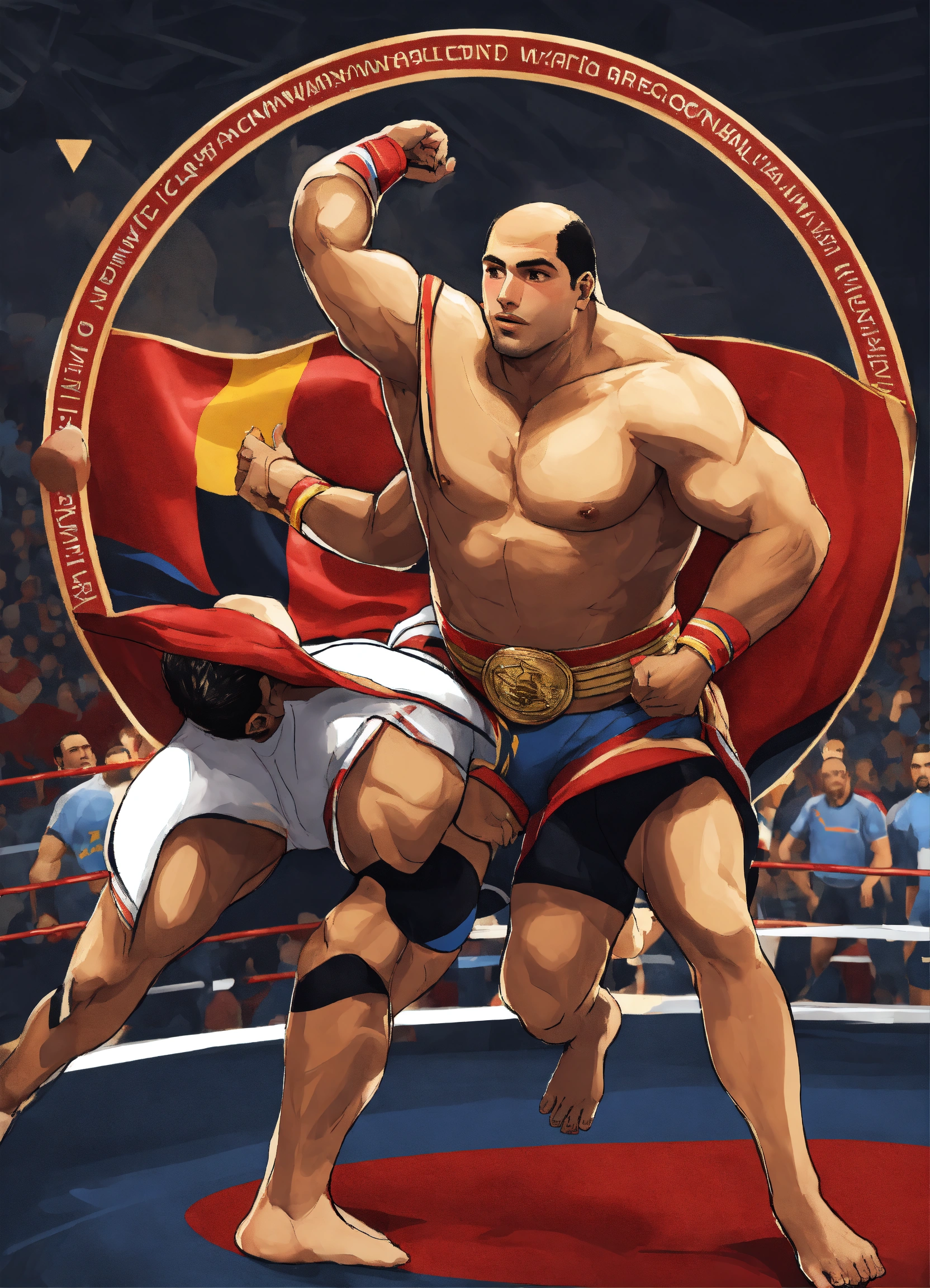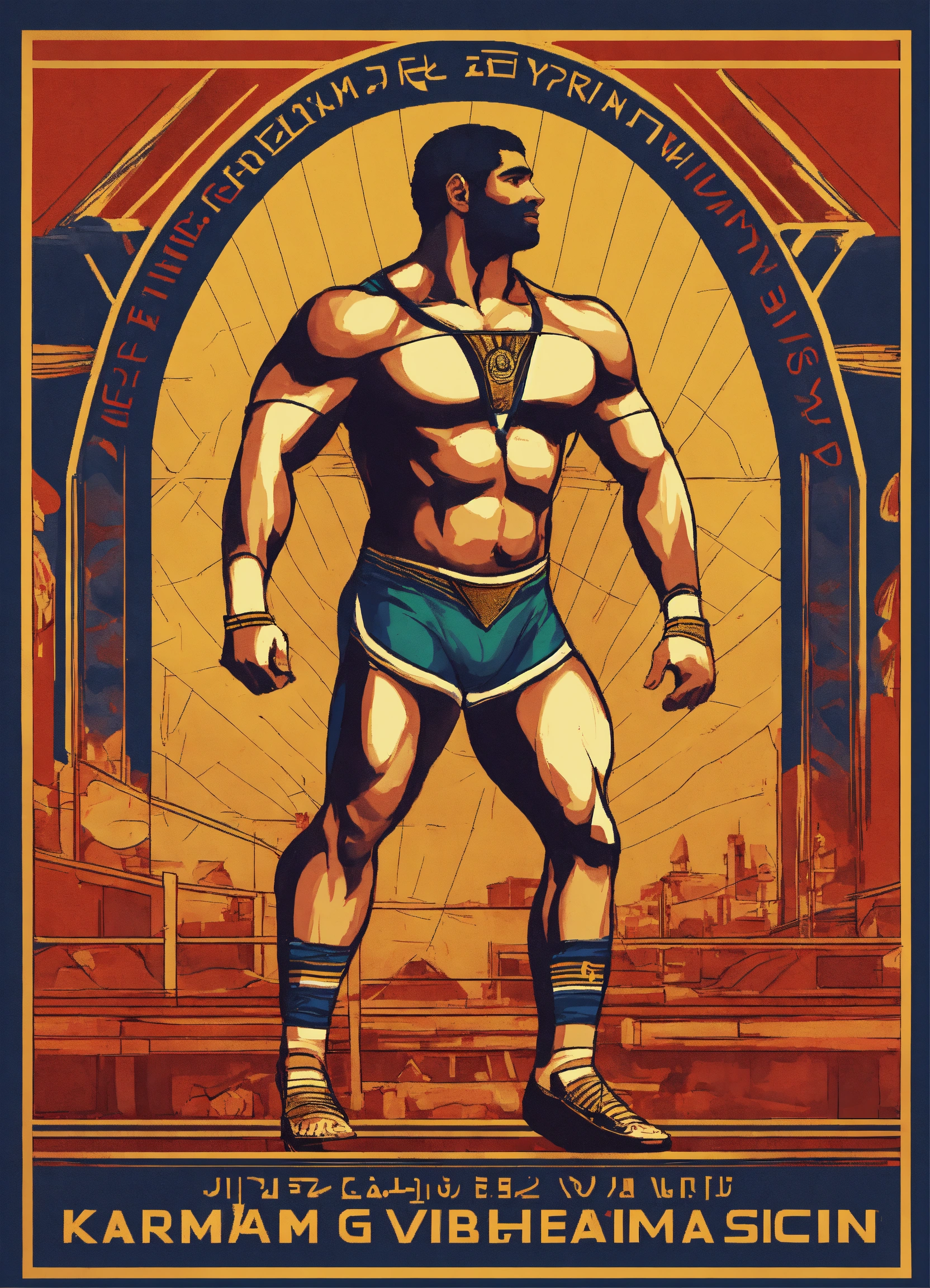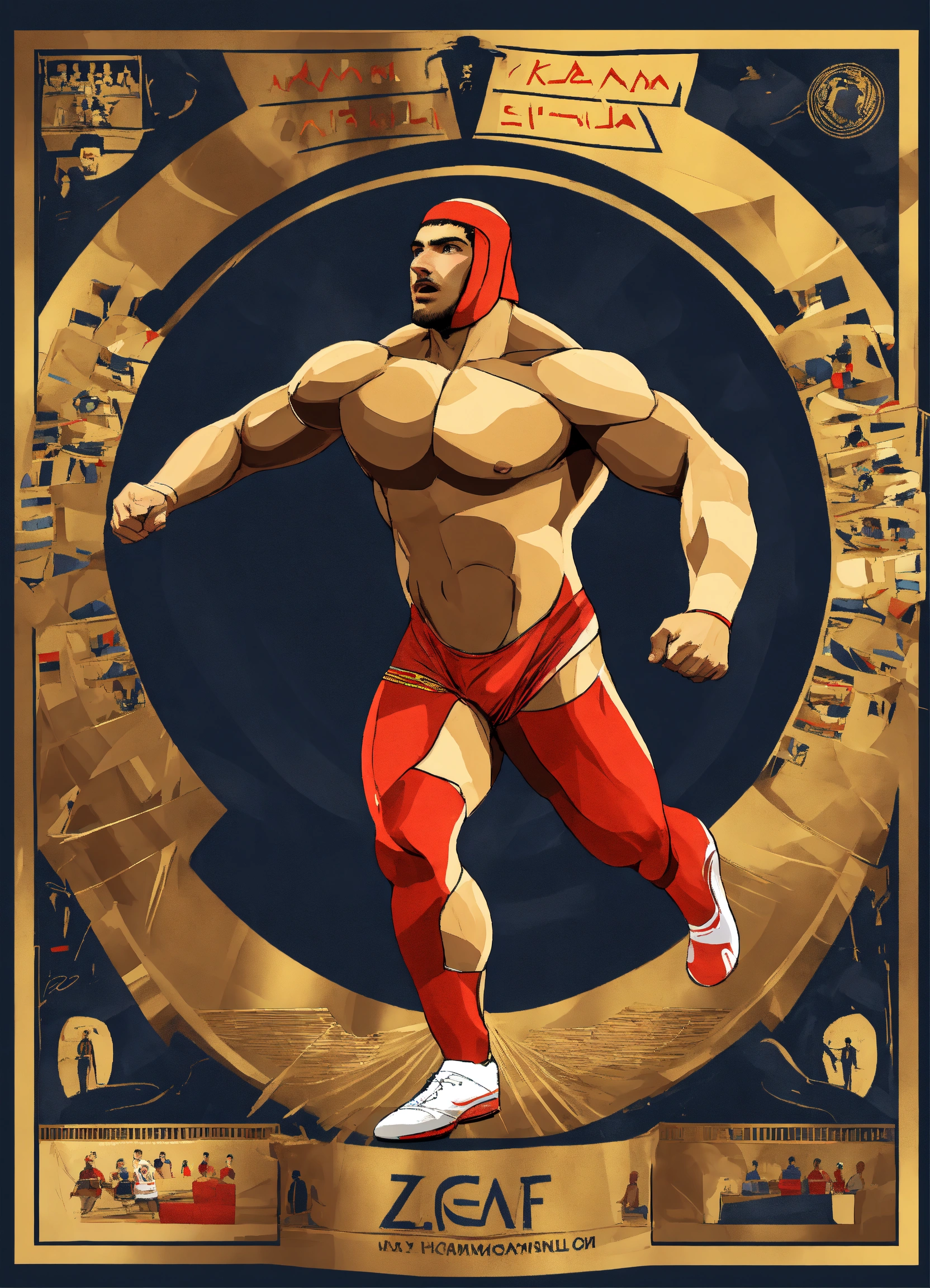 "a design that represents the renowned egyptian athlete karam gaber winning the world championship in greco-roman wrestling, "