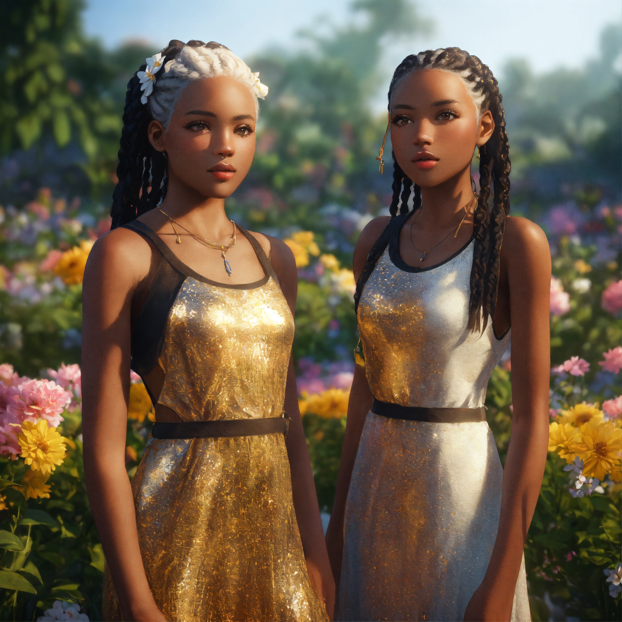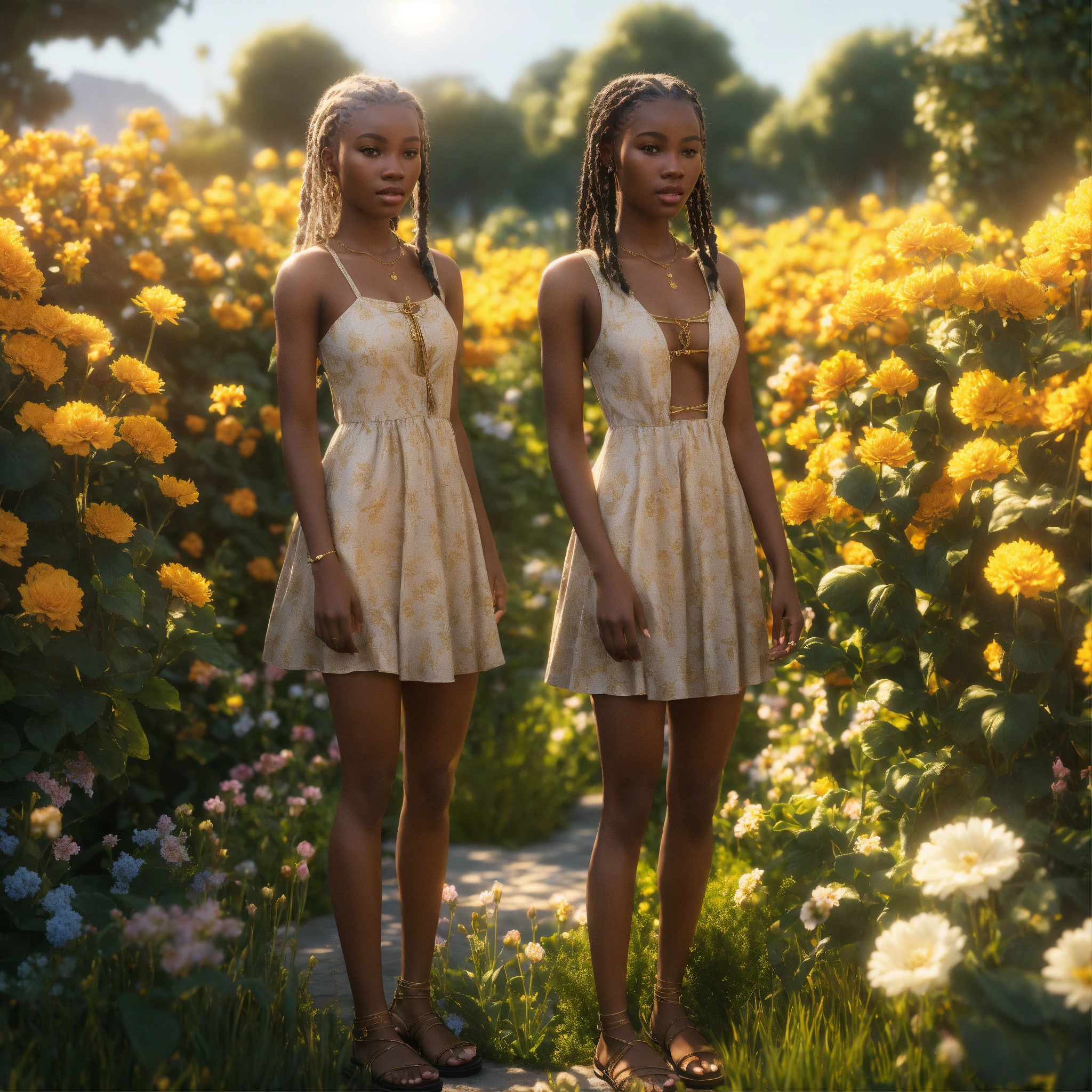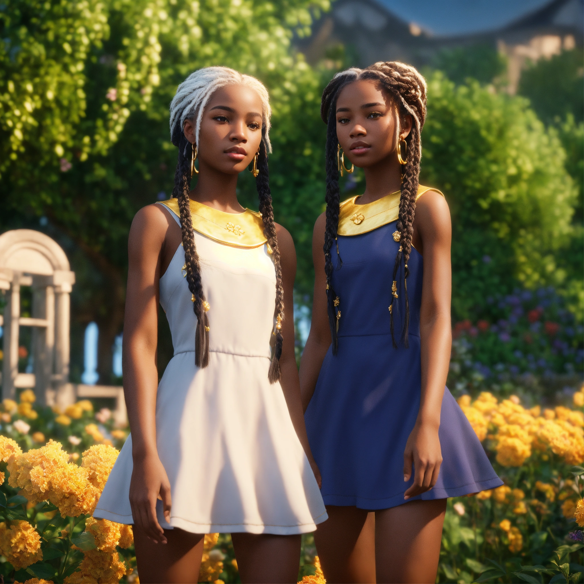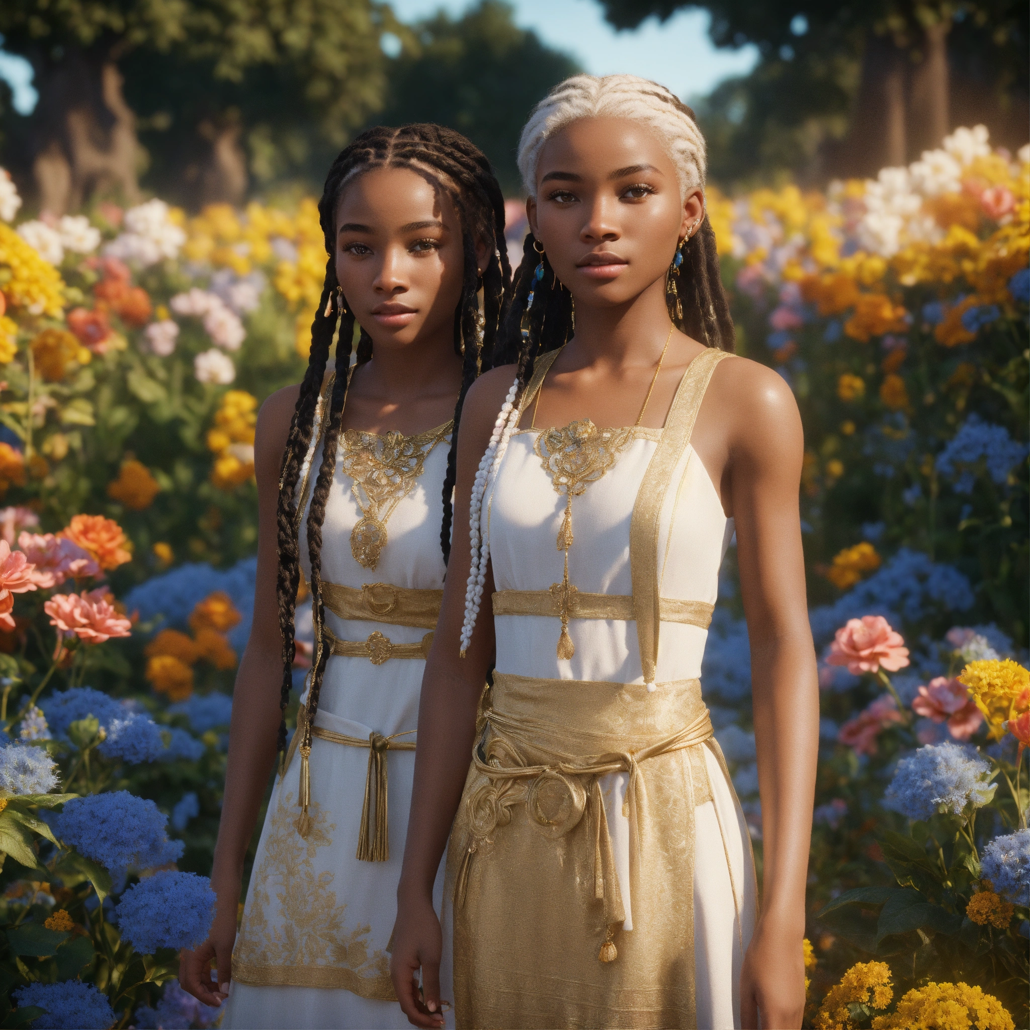 Pretty fraternal twins, twin 16-year-old, one twin white hair. african features, one twin brown-skin, black braids, in designer gold sundress, and sandals. flower garden, persona. early morning, cinematic style, high detail, realistic physics, photorealistic, unreal engine, hdr, 8k