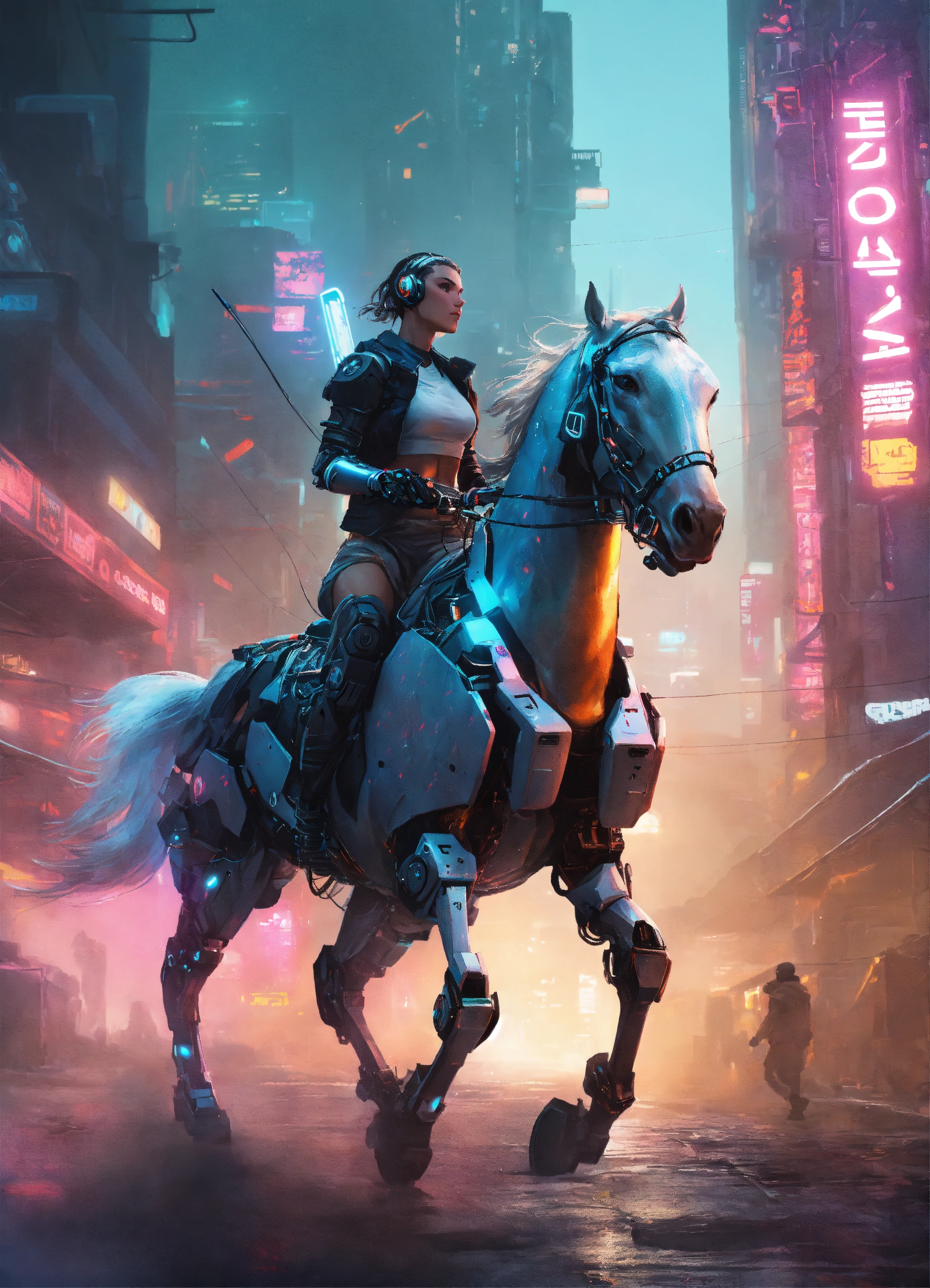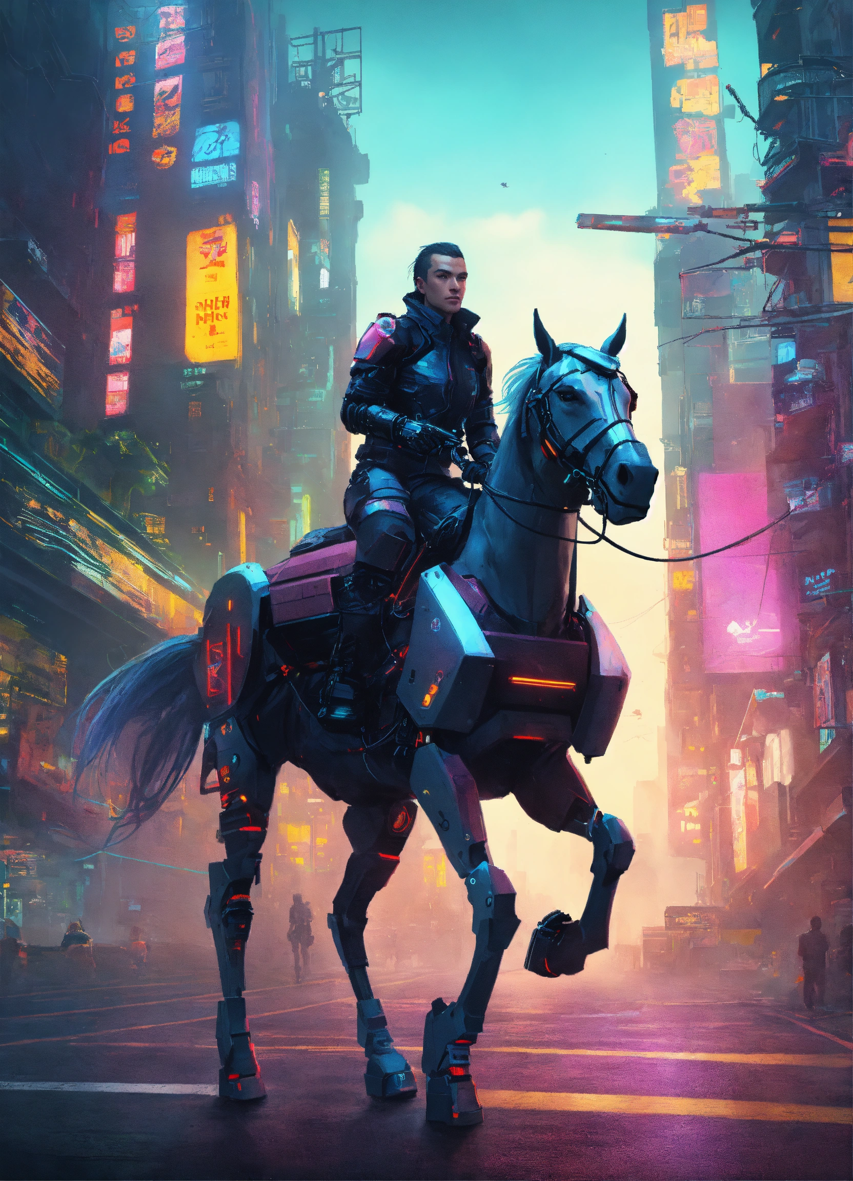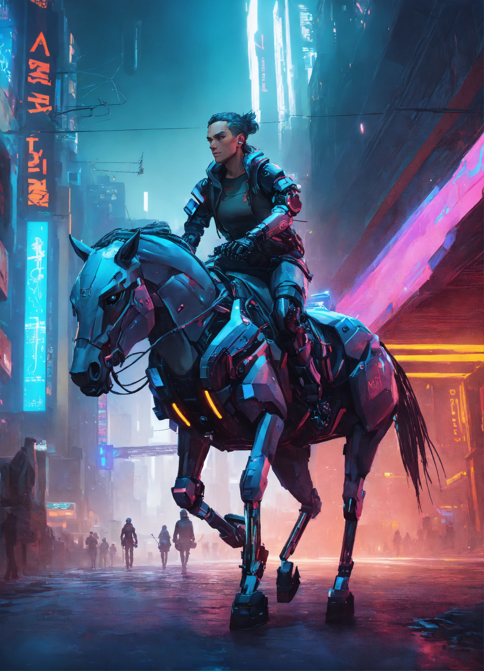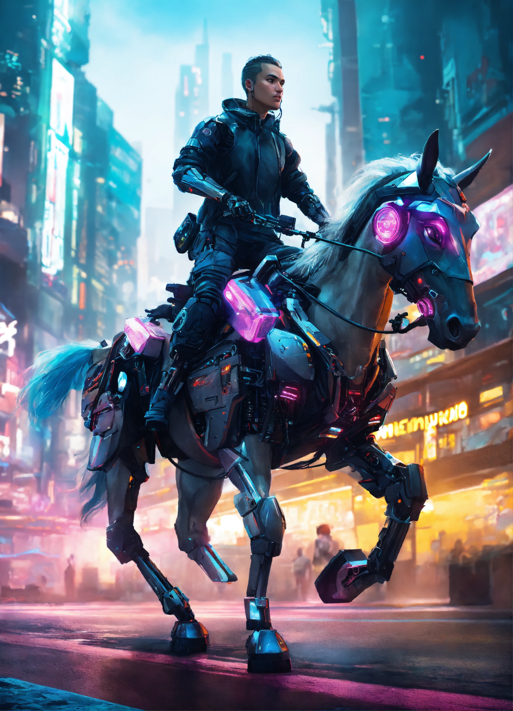 An athlete cyborg riding a bionic horse in a cyberpunk city