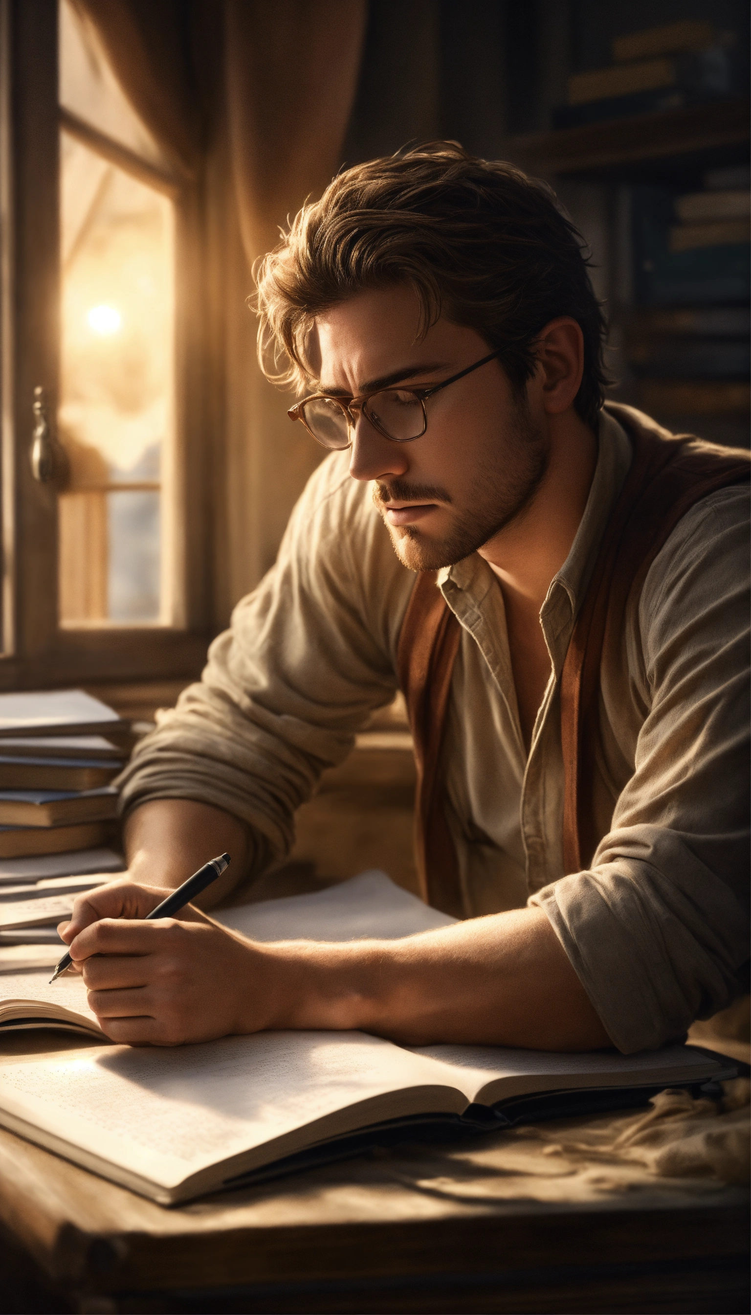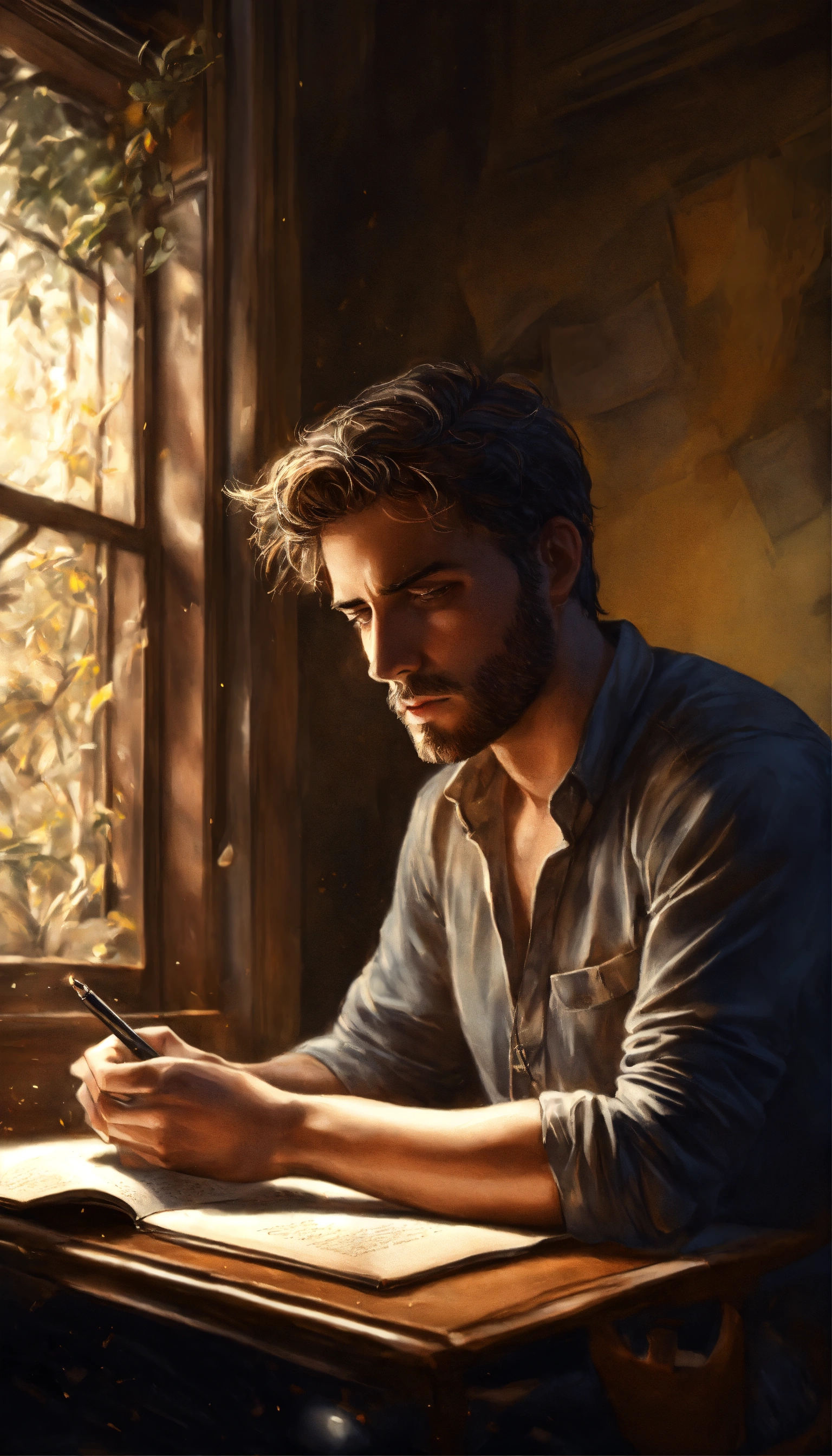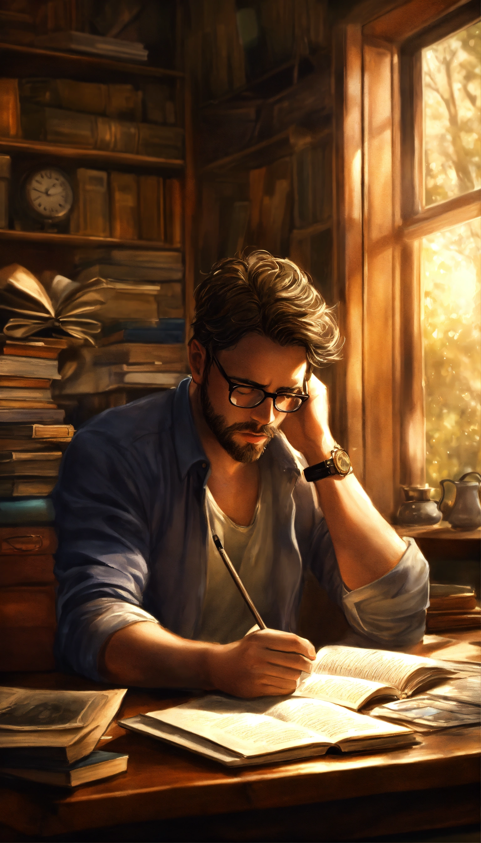 A frustrated male writer with depression, beautiful photorealistic illustration, intricate details, natural lighting