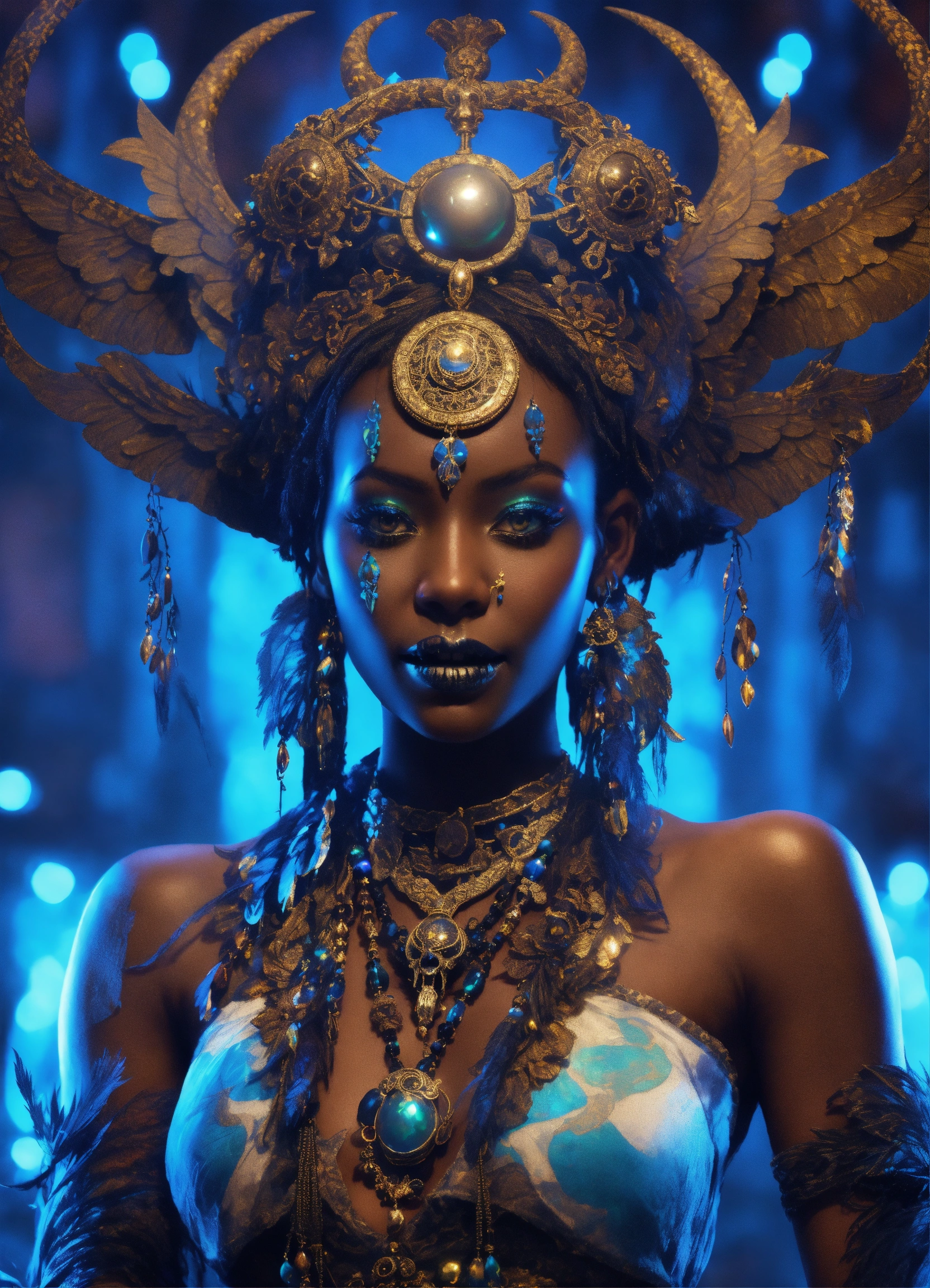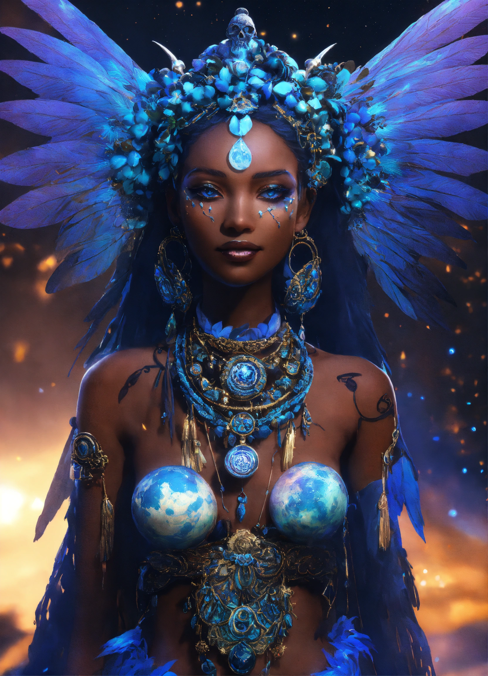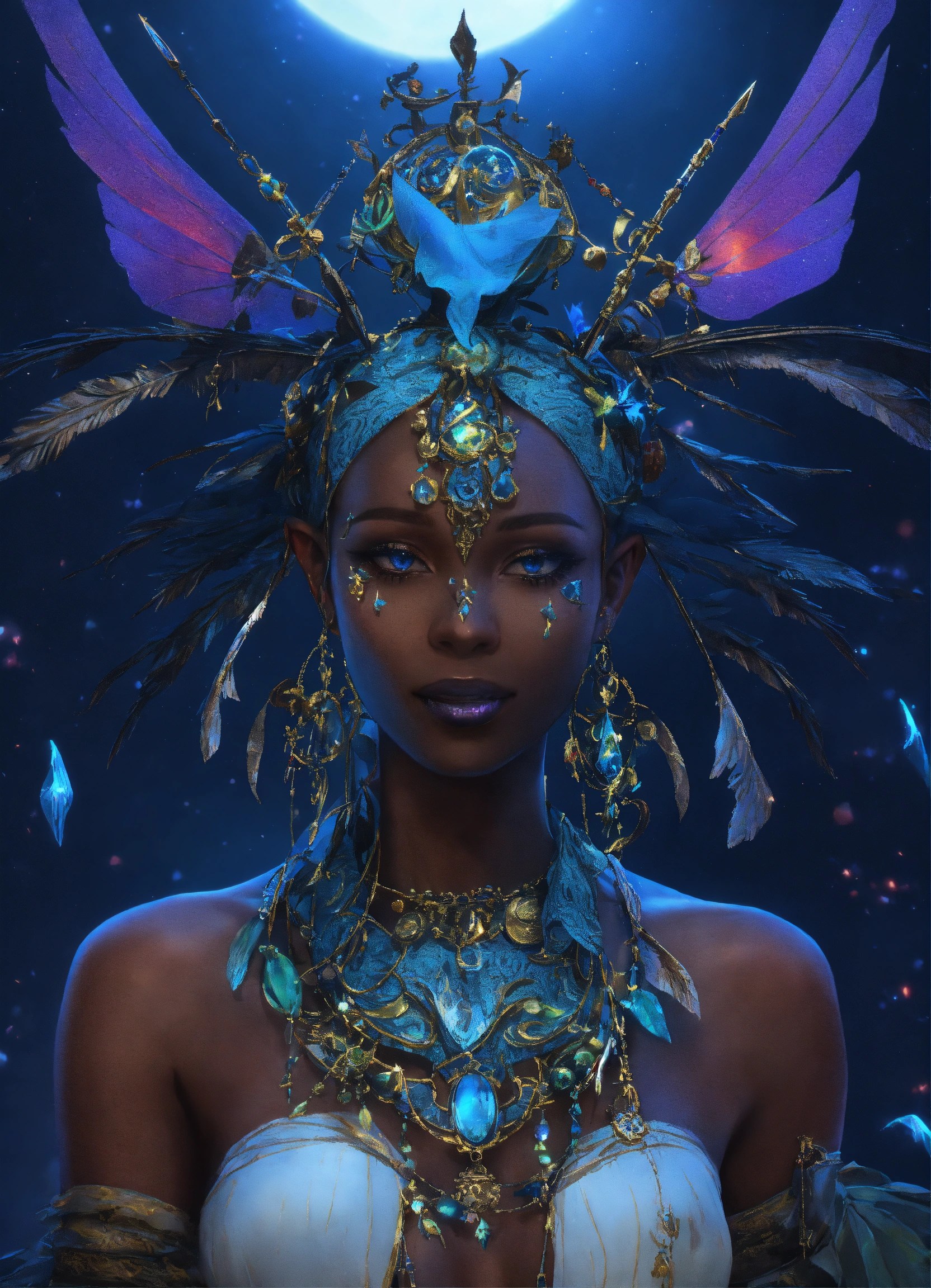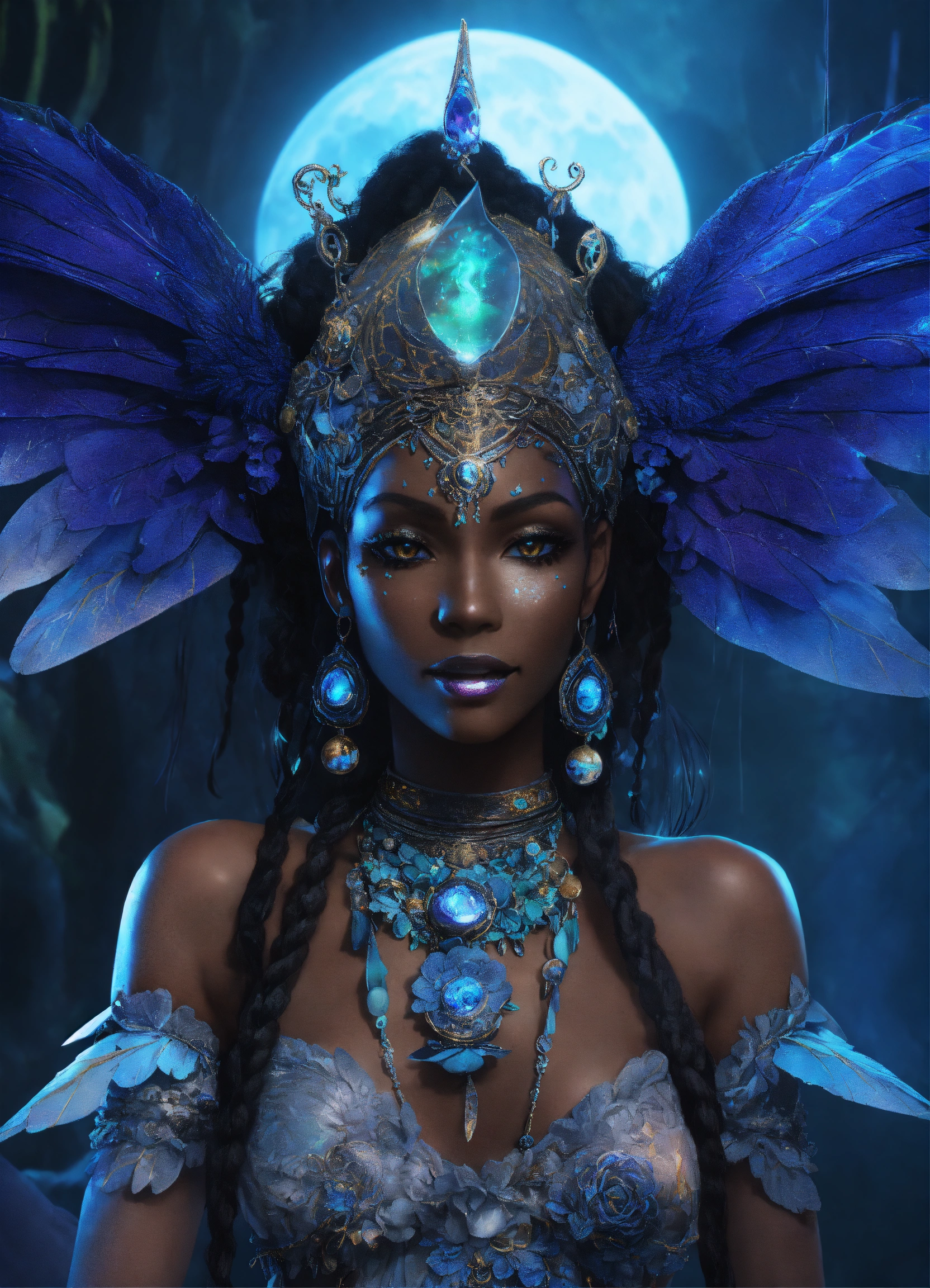 A stunning anime interpretation full body of a smiling ironically haunted possessed captivating caribean deep black-skinned dark fairy demonic queen of ancient evil voodoo, ancient skull-encrusted headpiece opalescent ornate, tribal luminescent runes painted on the face, clear facial features, wearing white soaked tattered clothes, hyperrealistic style, snakes and crows extremely detailed intricate as background, dark blue fog, irridescent blue faery wings shamanism glowing atmosphere [blue glowing moon ]fully detailed background with clouds and scary gobelins intricate, 8k, like gordon cummings, shining milky wayy fantasy, cgsociety. traditional luminescent shamanism, aesthetic reflecting colors, grading light [blue glowing moon background details], trending on artstation, magical atmosphere, 3d anime render. award-winning. like midjourney niji5 style art
