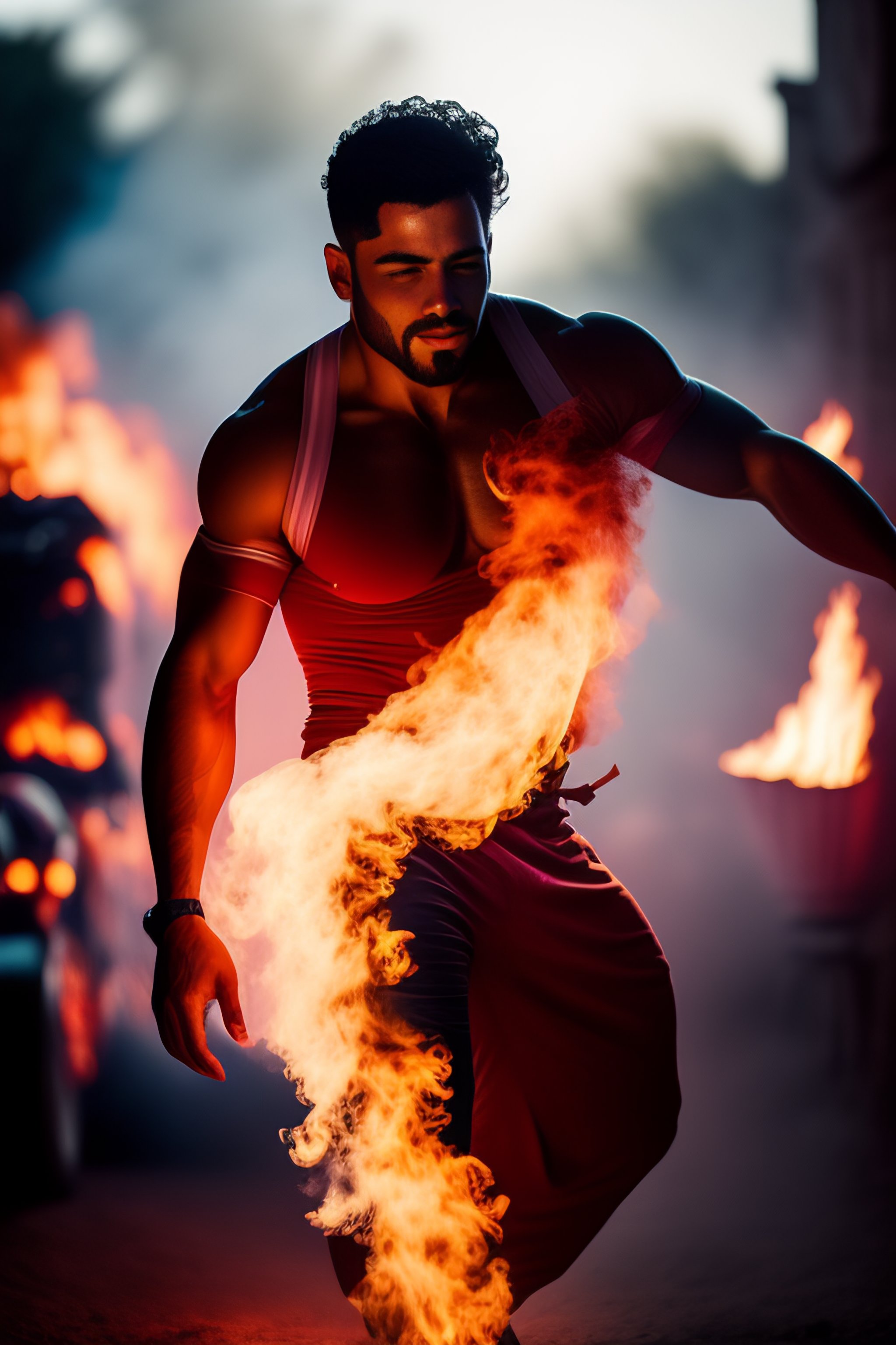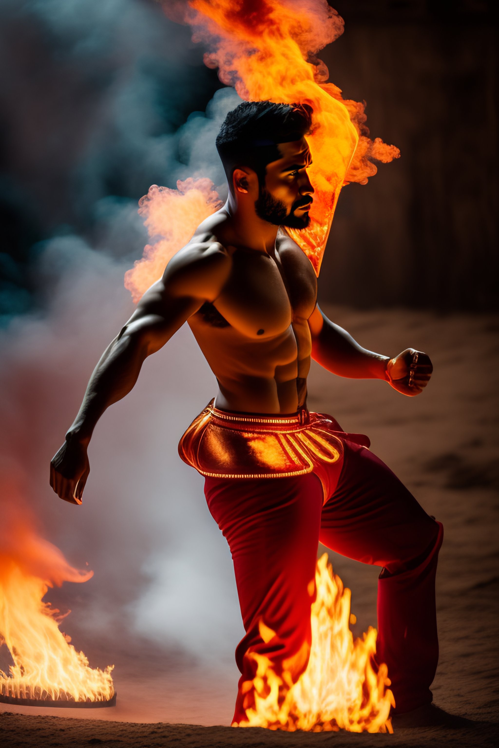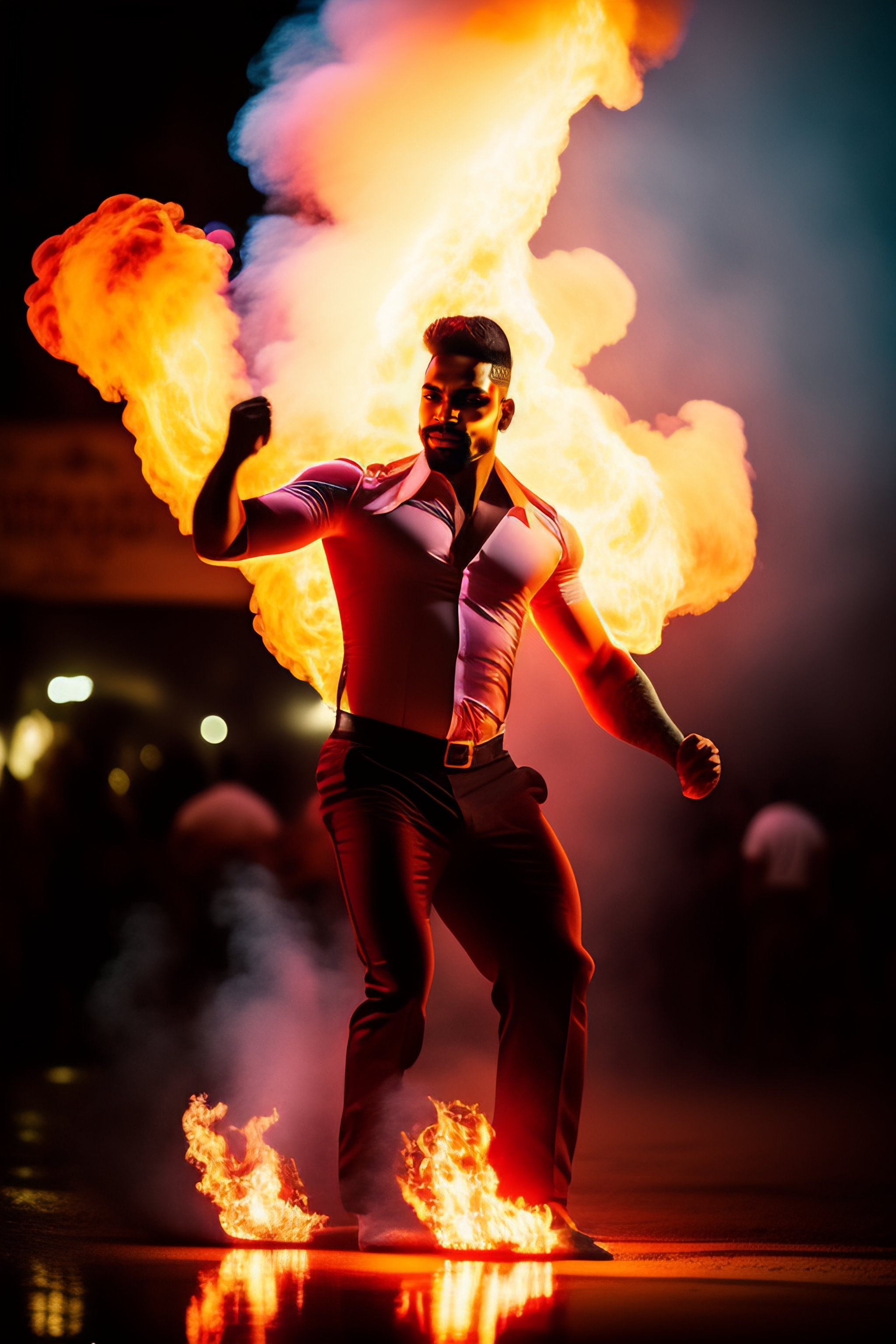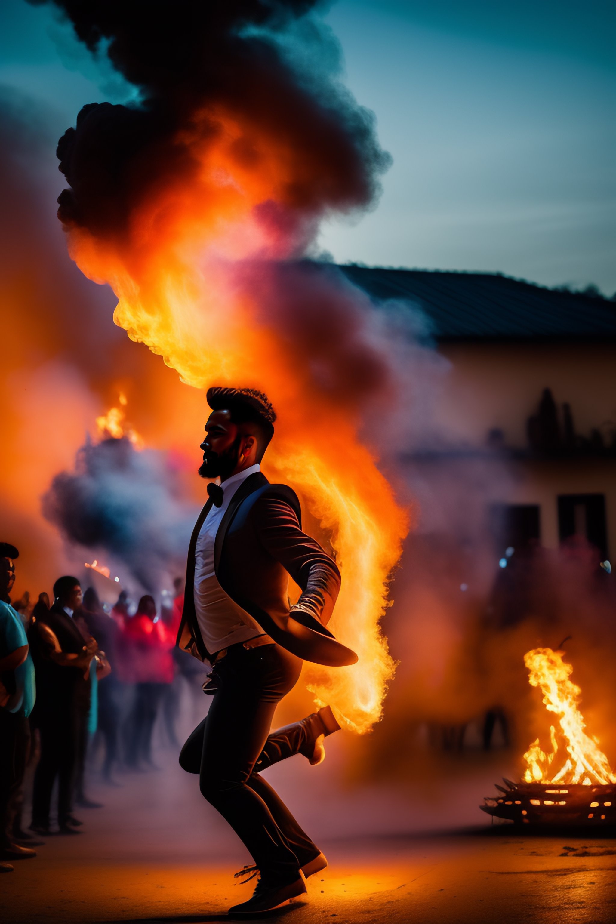 Hombre bailando en fuego con estilo barroco