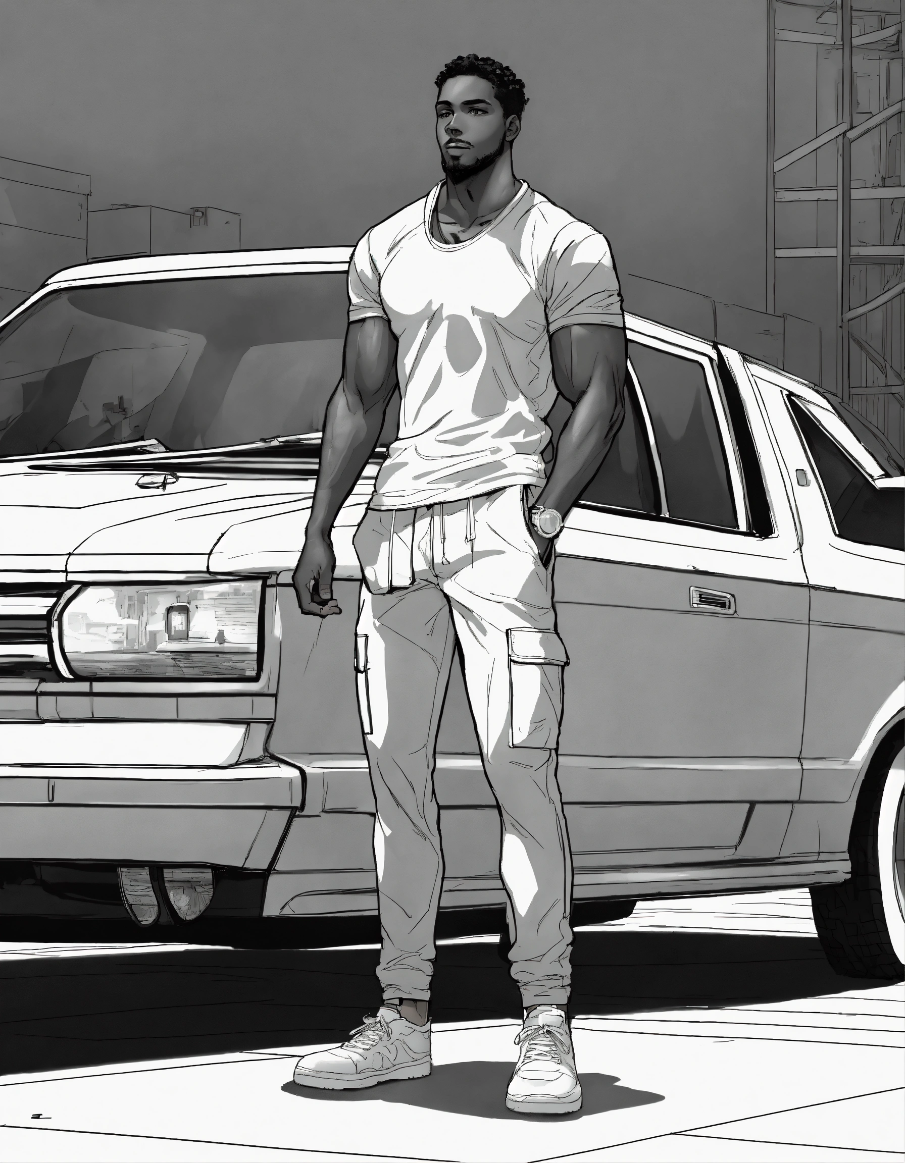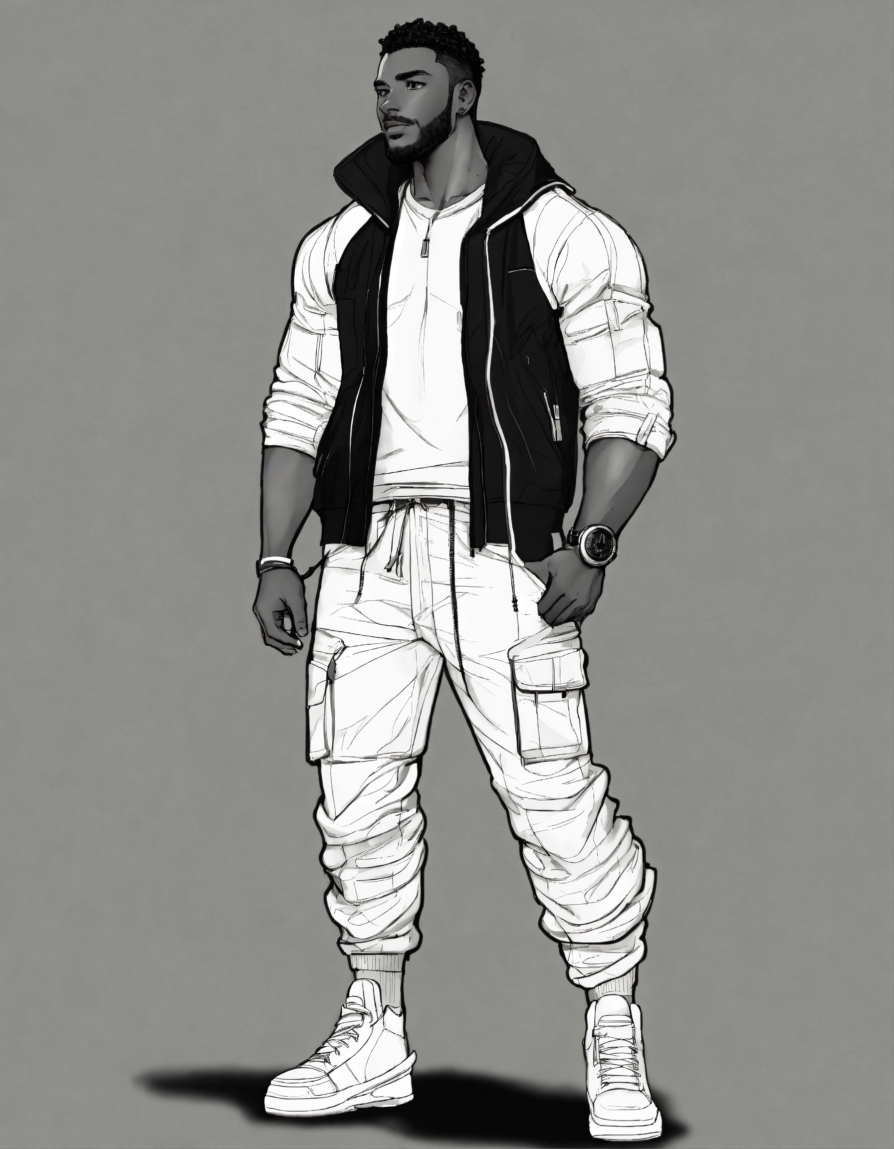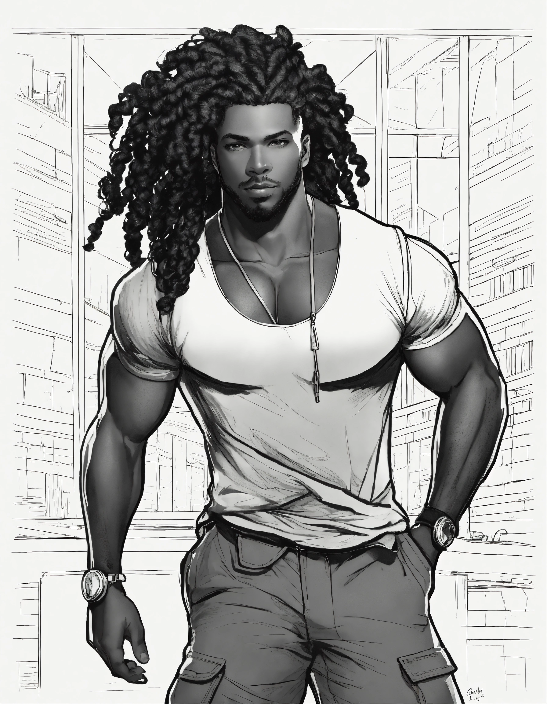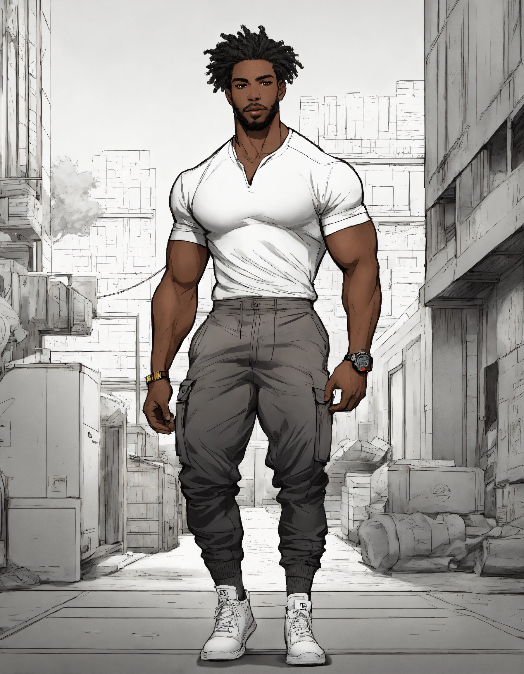 Dark dark complexion fully clothed athletic man, realistic healthy glossy well defined loc’d hair texture, full body shot, rule of thirds centered subject placement, storybook, dreamlike, cartoon, intricate detail line drawing, cargo pant, black and white, coloring book style, dynamic white
