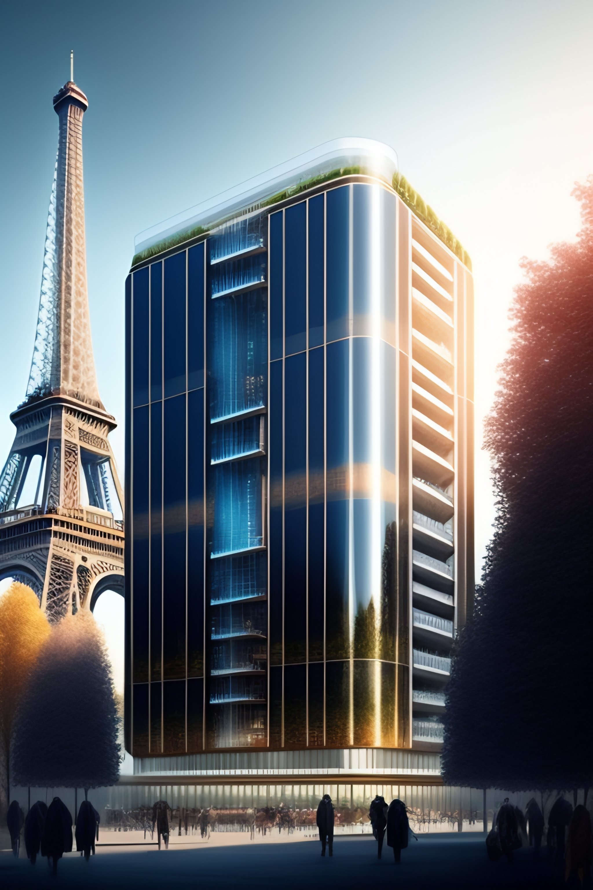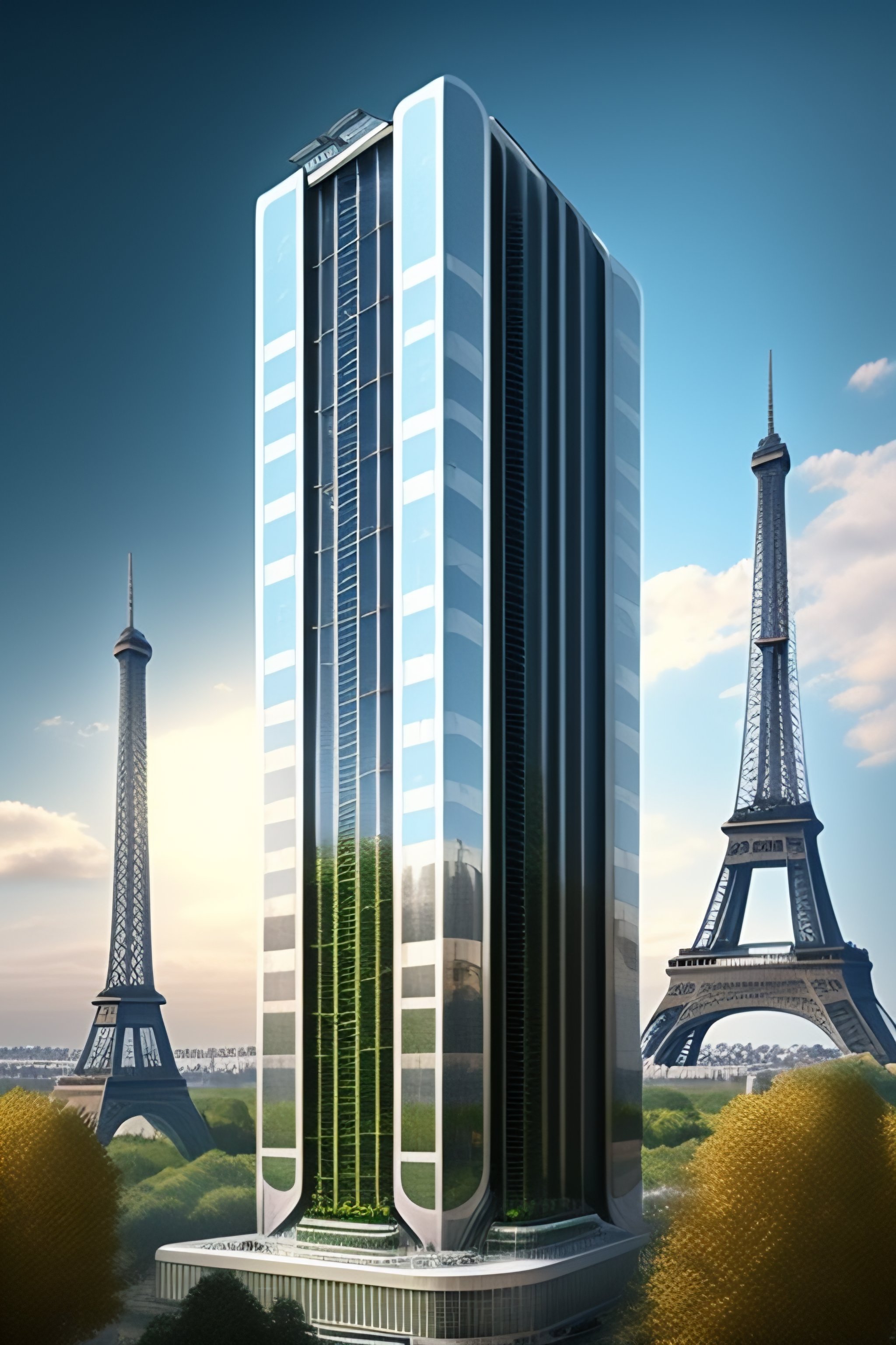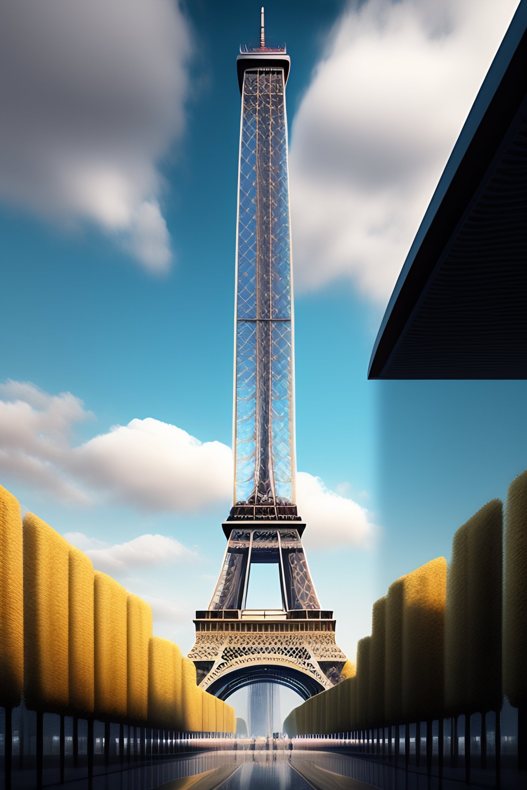 Ascenseur de chantier bi-mat et cordiste futuriste au milieu d'une ville avec la tour eiffel