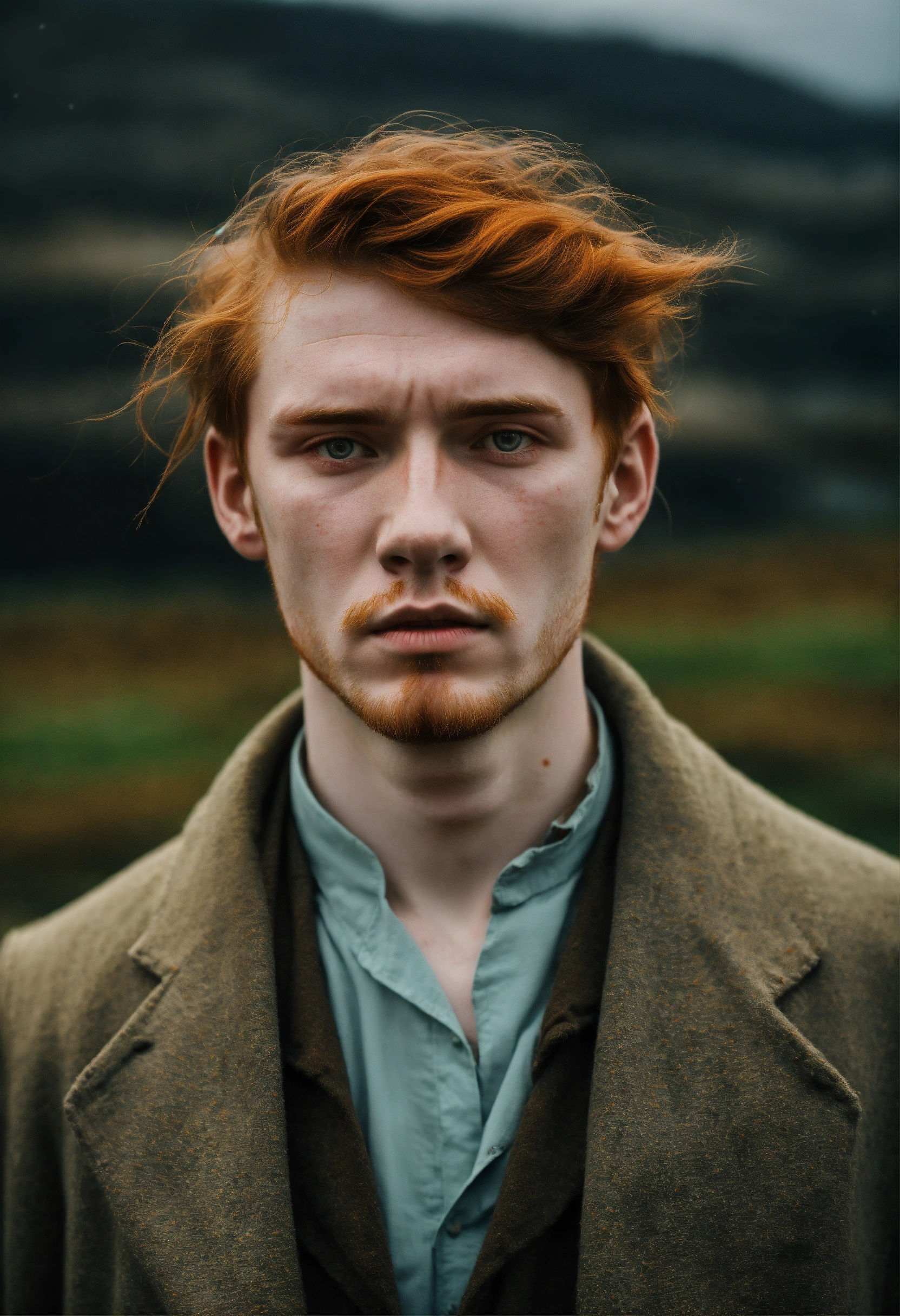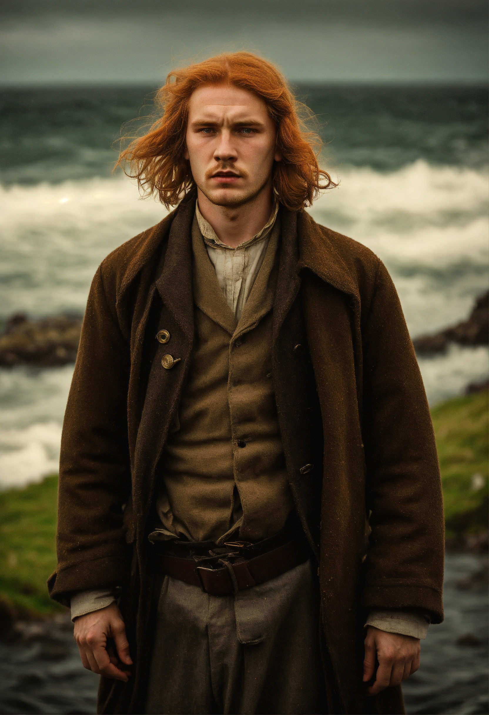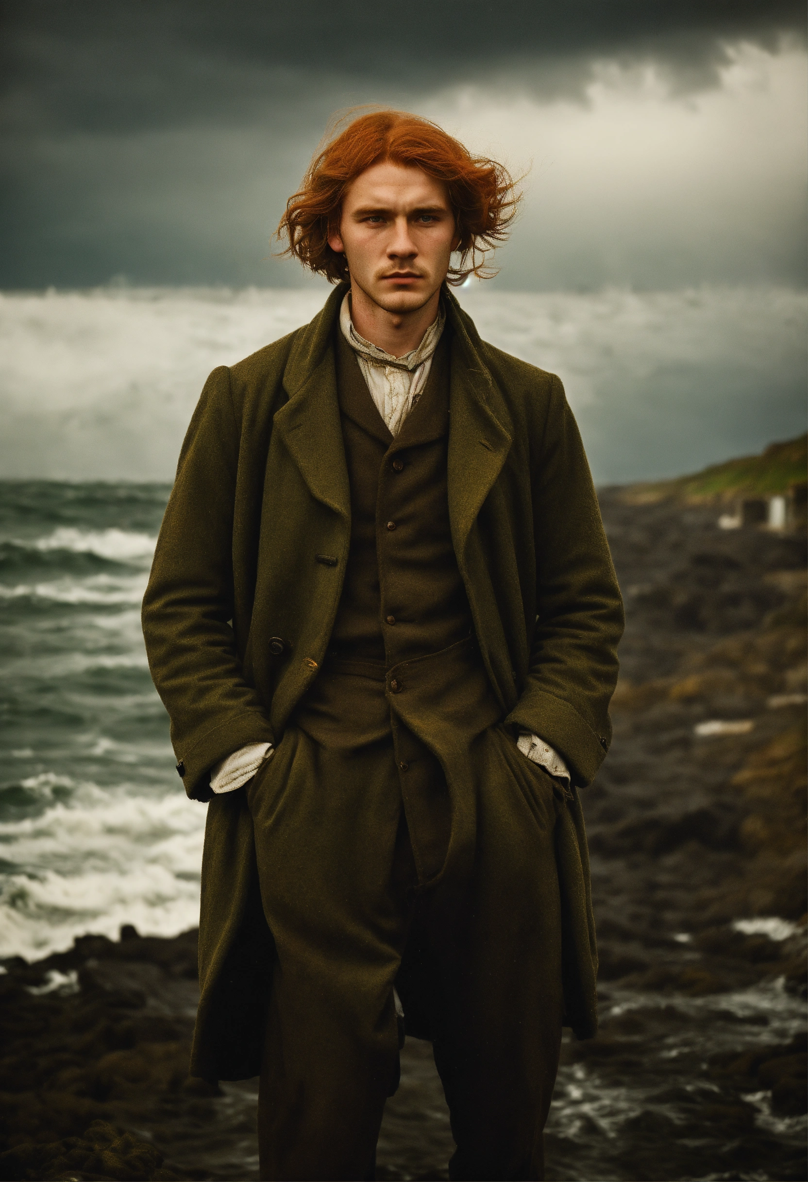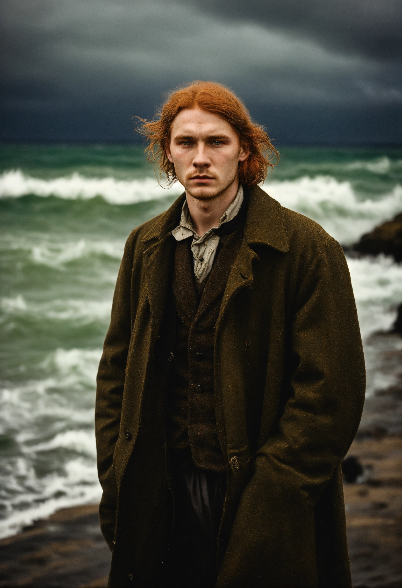 1910's 30 year old russian man, pale skin, dark eyes, stern 1910's poor boy clothes, shoulder length long ginger hair, by the dark ocean, in storm, irish town by ocean
