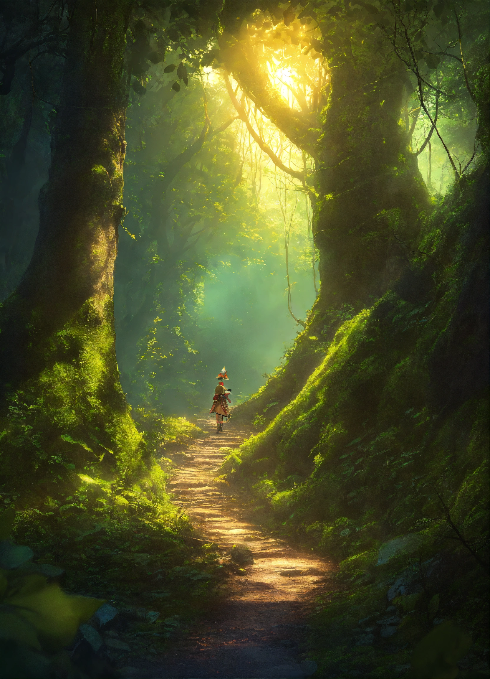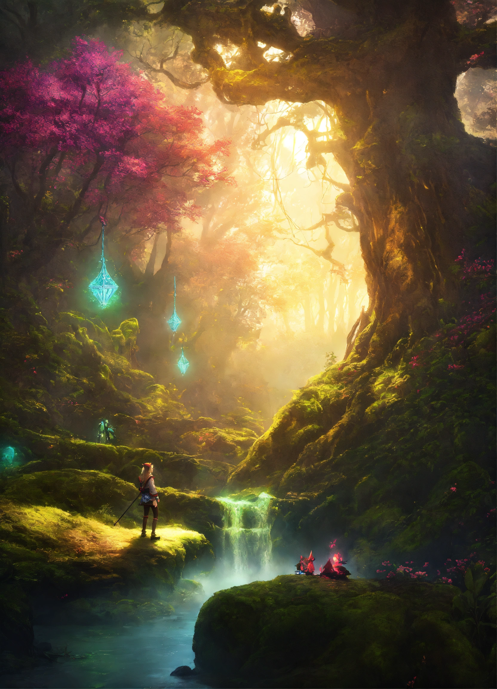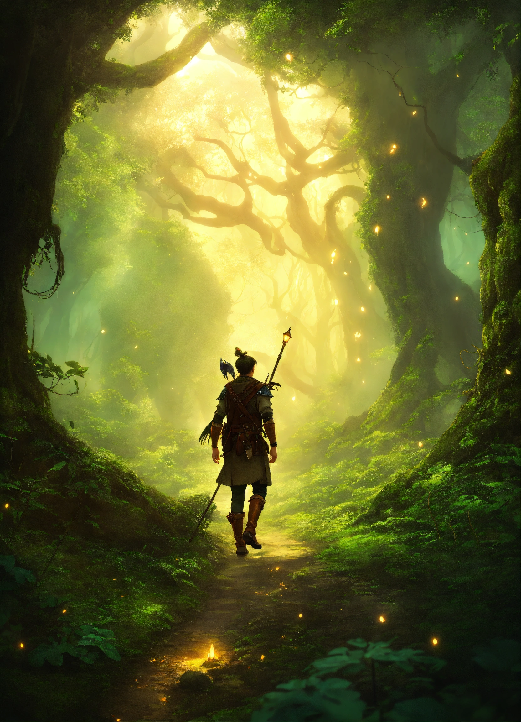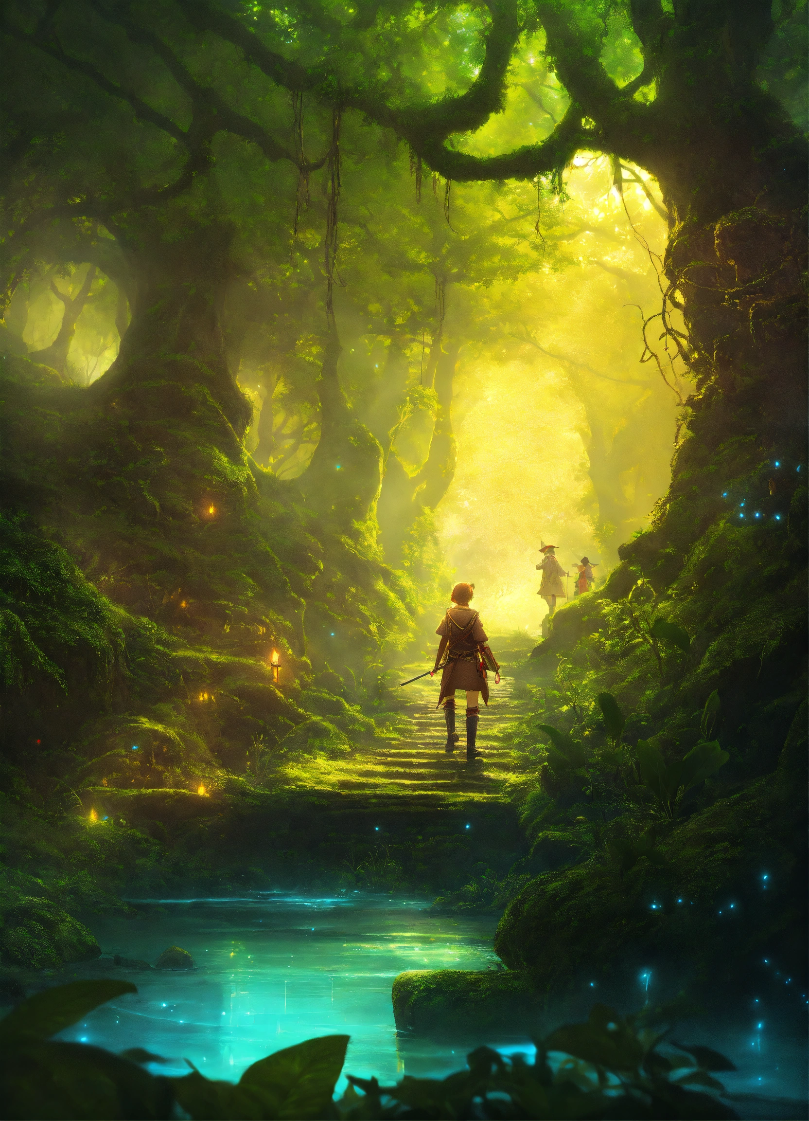 Epic quests in the magical forest to discover a lost civilization, with mysterious elves and ethereal creatures lurking in the shadows.