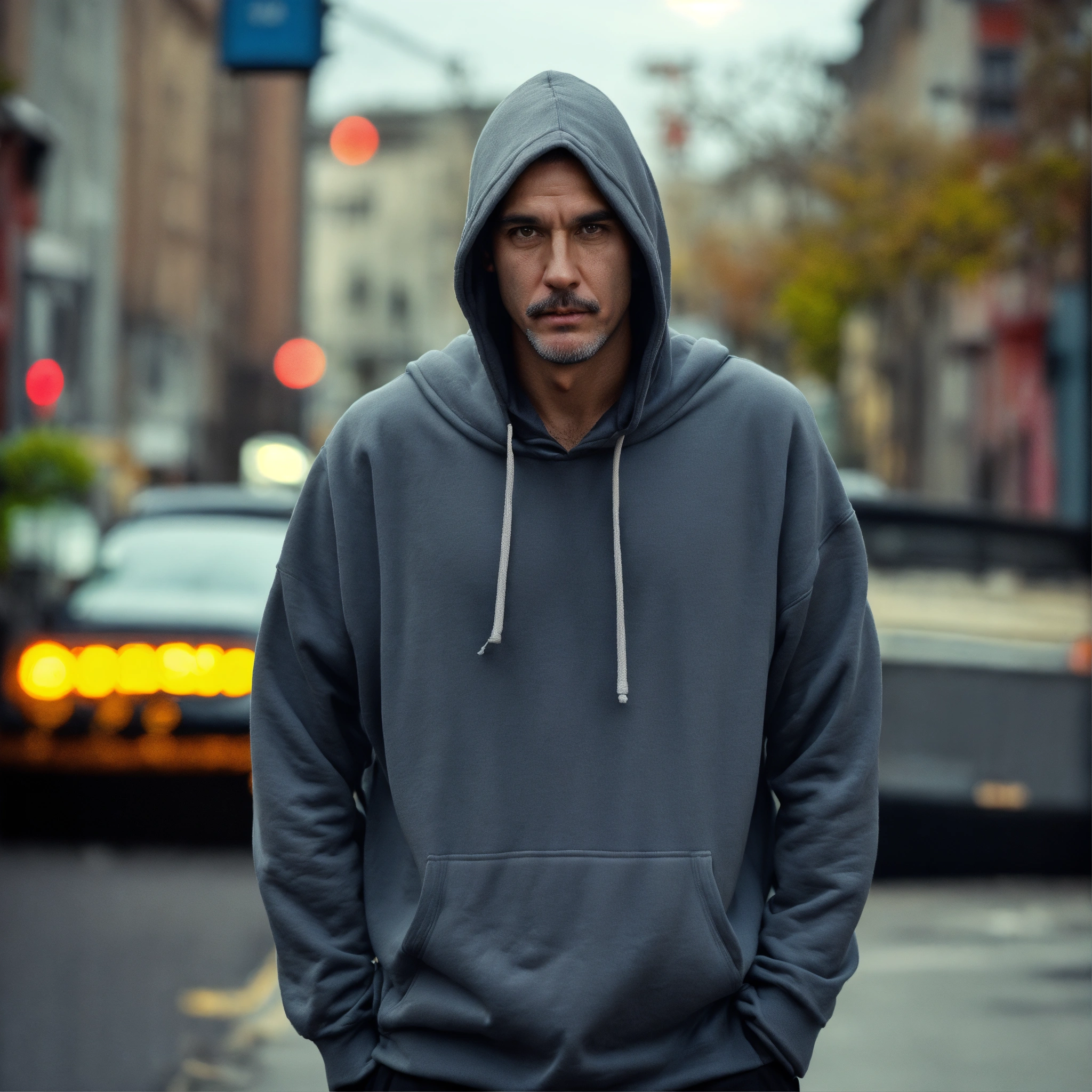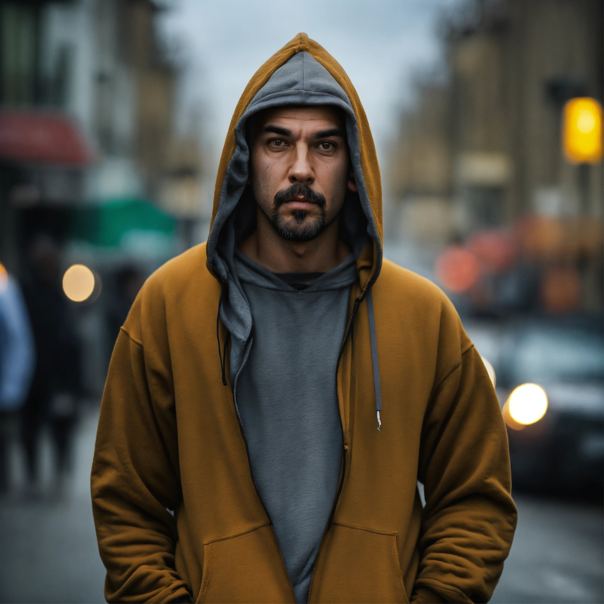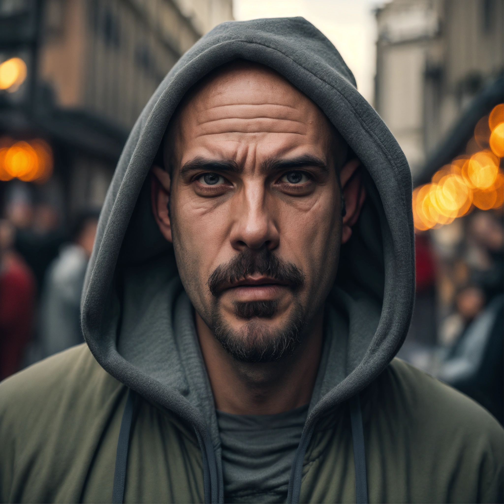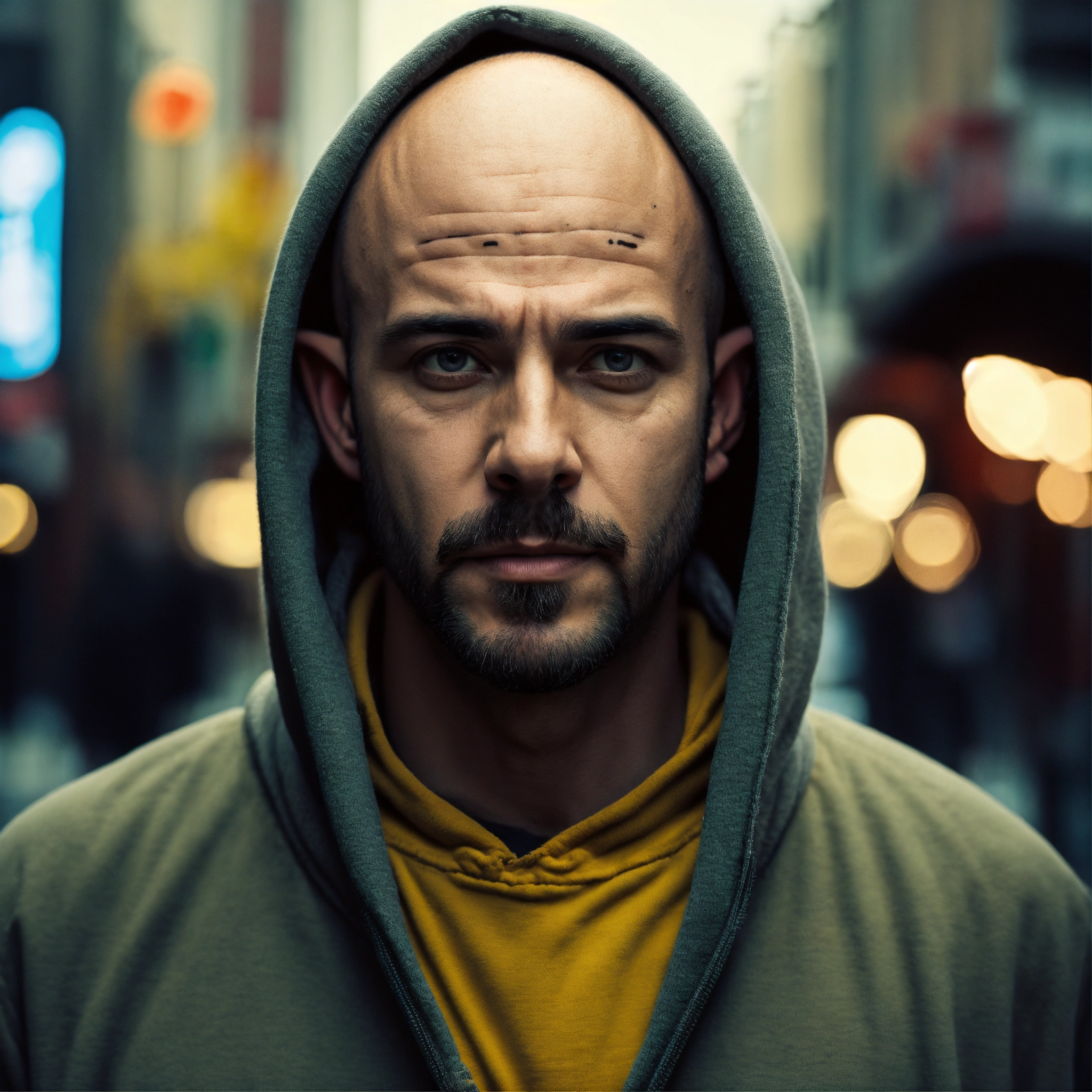 A huge bald creepy looking man with a little goatee and no mustache, extended protruding brow forehead, grey eyes, crooked mouth, large ears, wearing a hoodie up over his head, standing out in the street