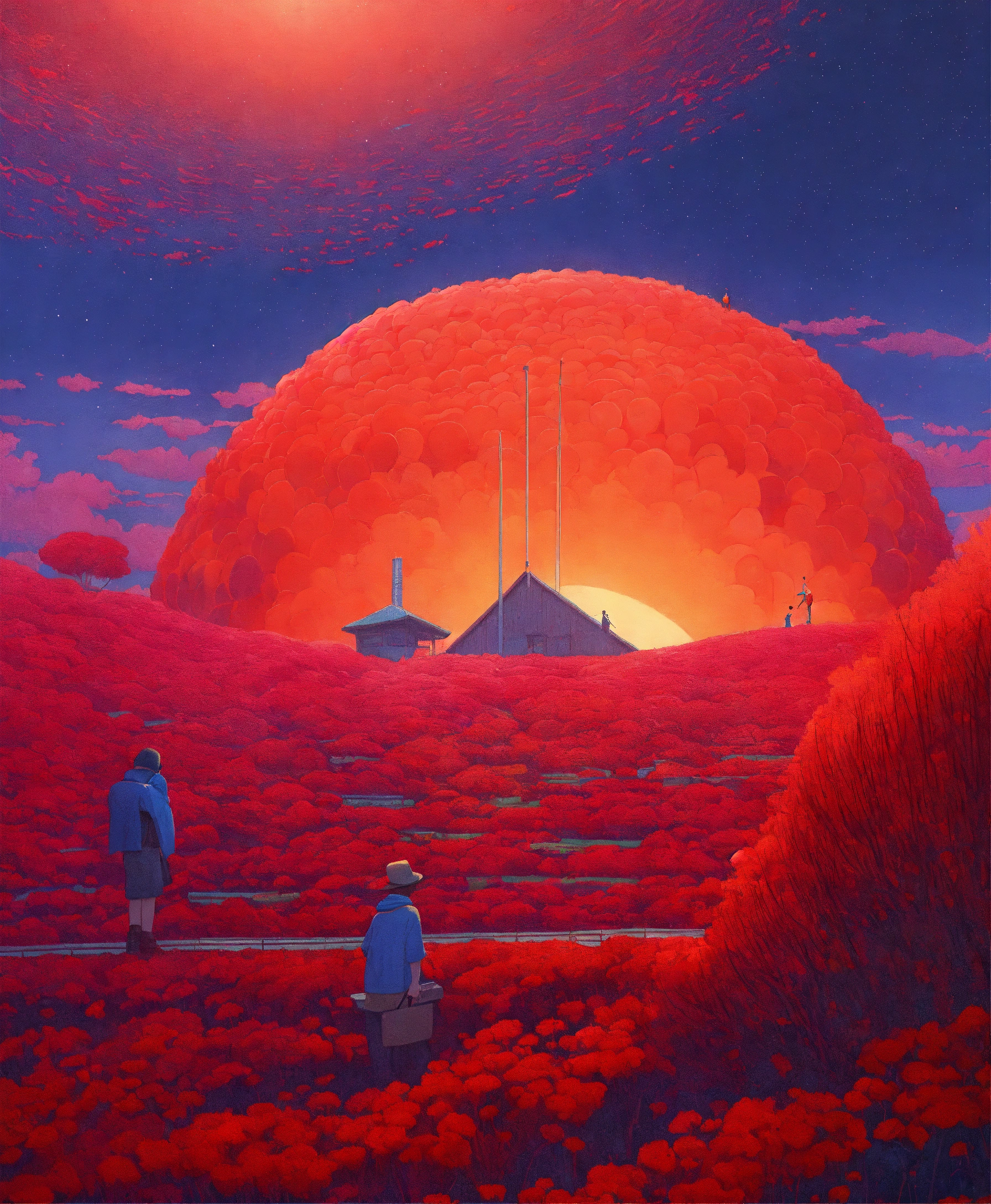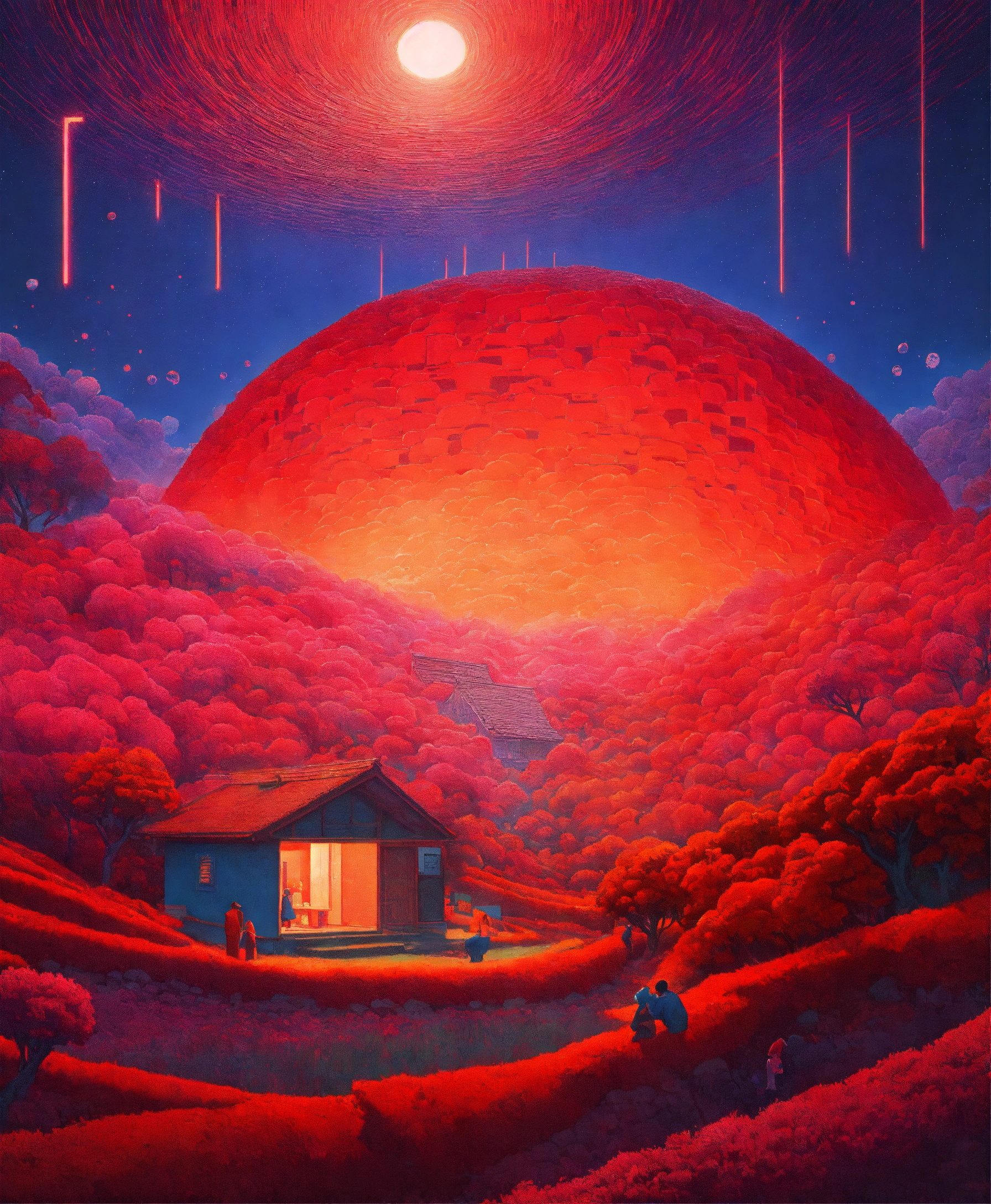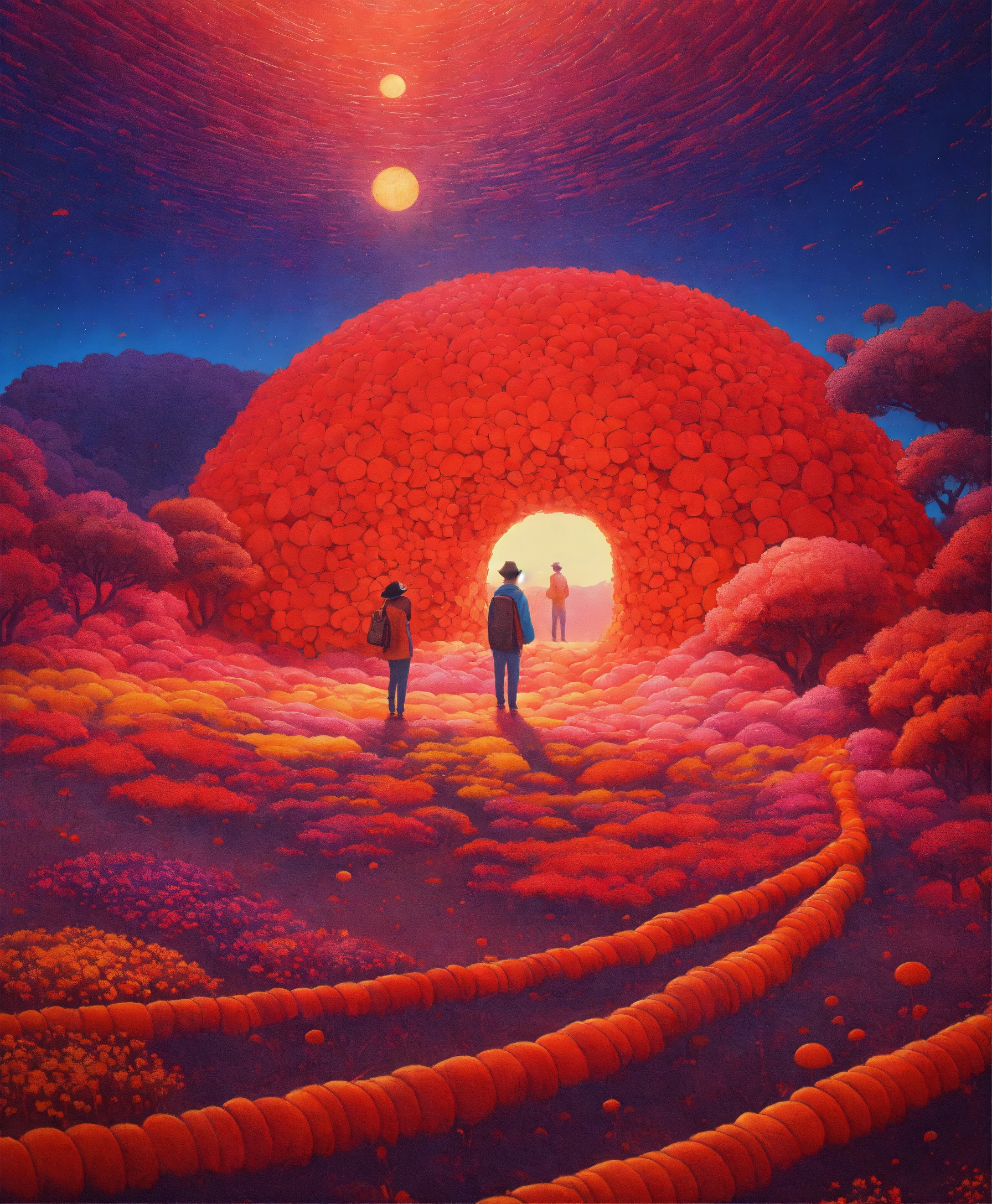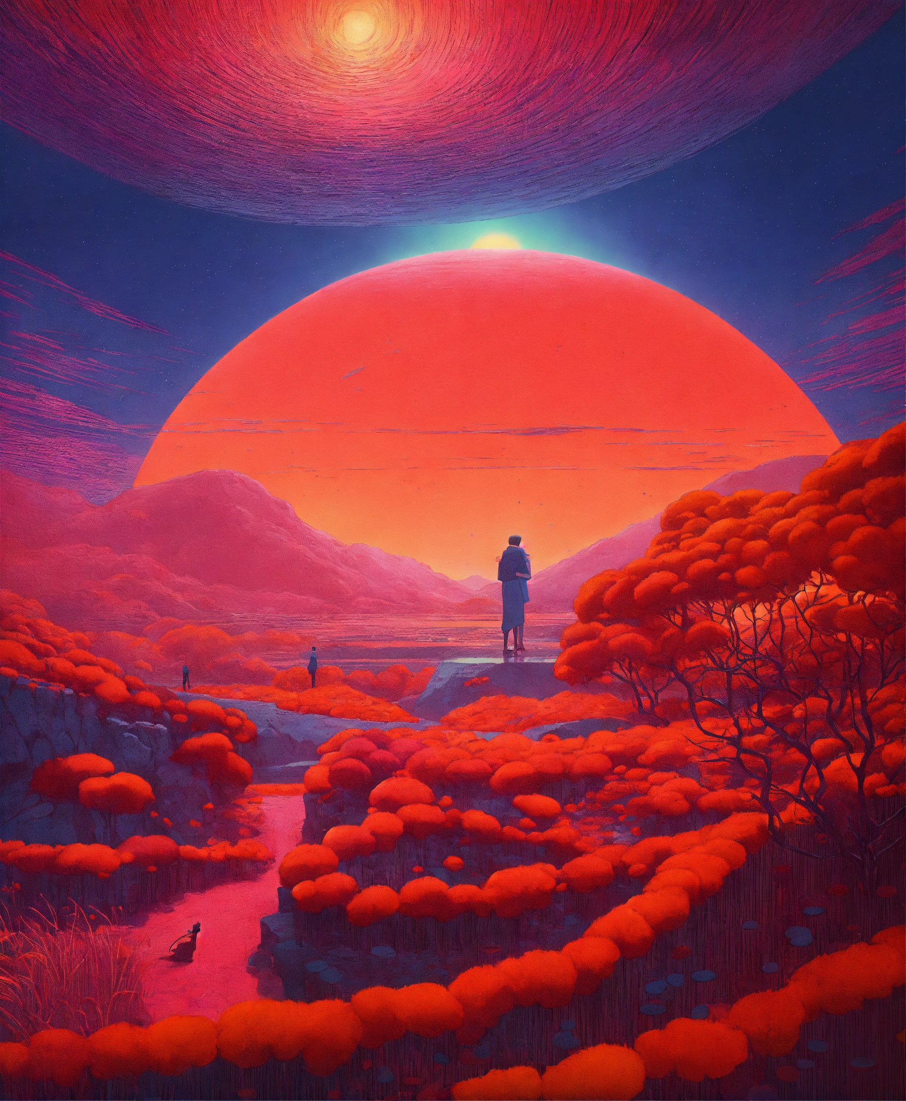 A colorful vibrant surreal landscape, red and orange are the predominant colors, a group of figurative simple sculptures showing affection and support with a hug, by kawase hasui, moebius, edward hopper and james gilleard, zdzislaw beksinski, steven outram colorful flat surreal design, hd, 8k, artstation #psychedelichallucinations