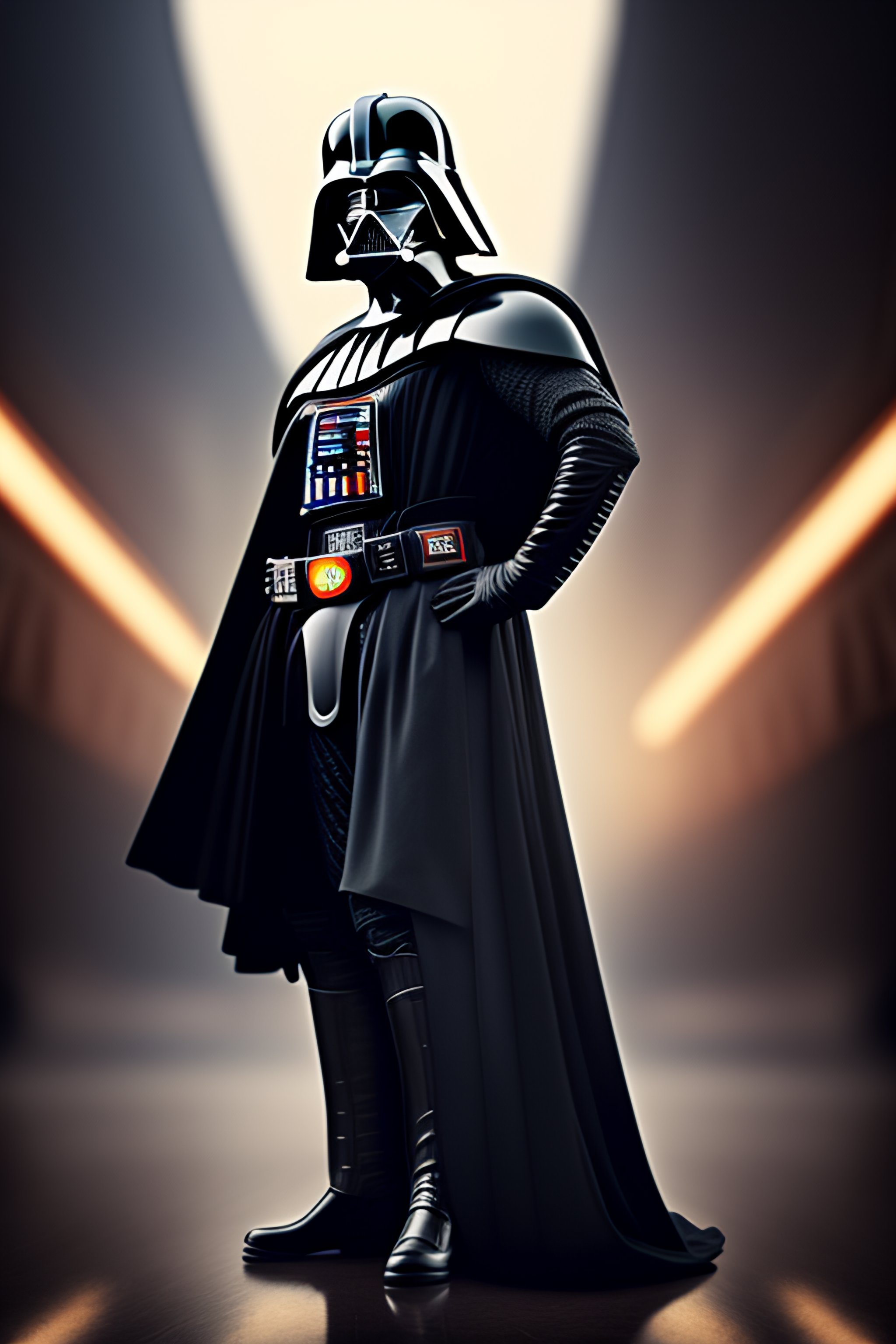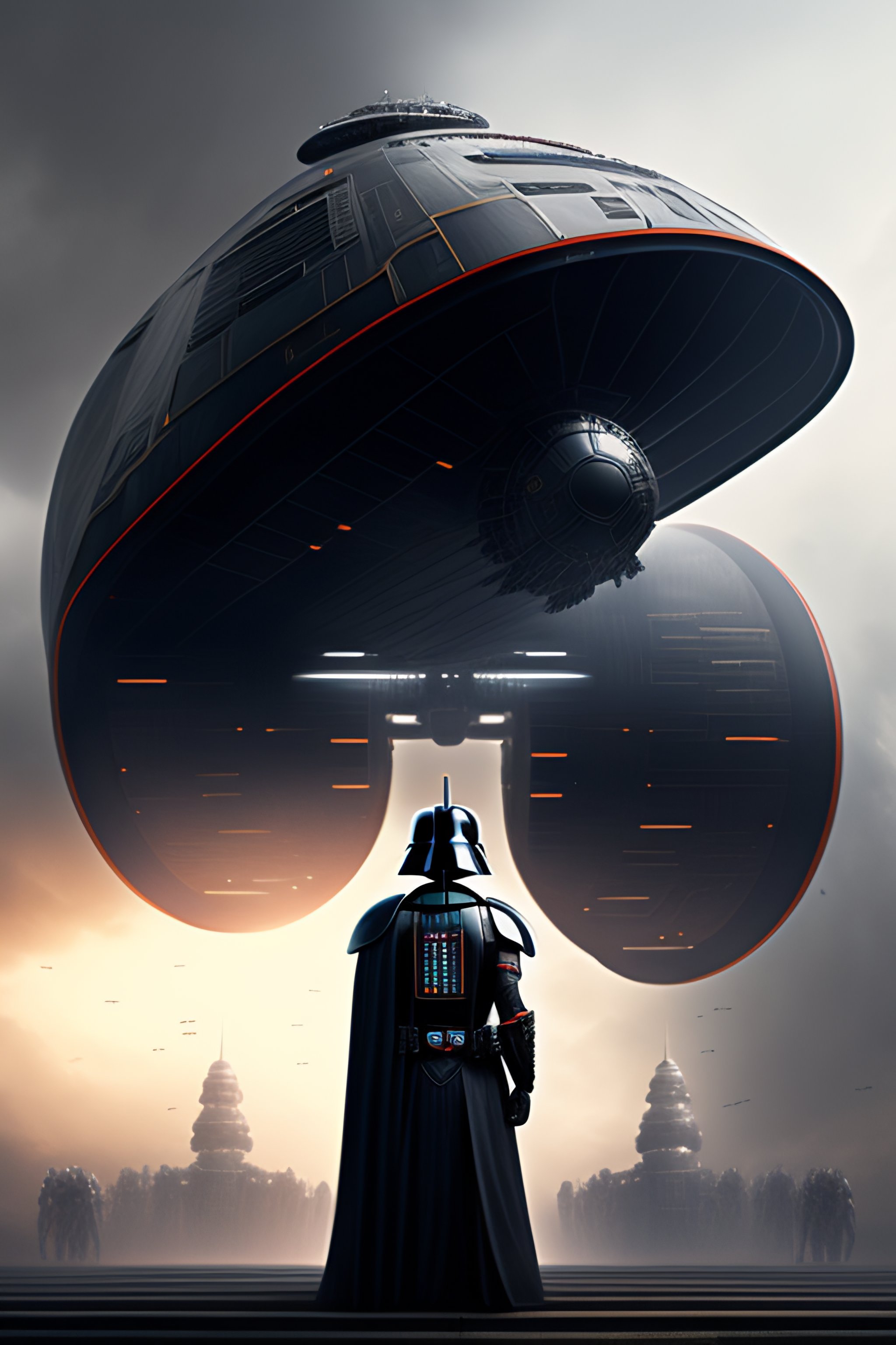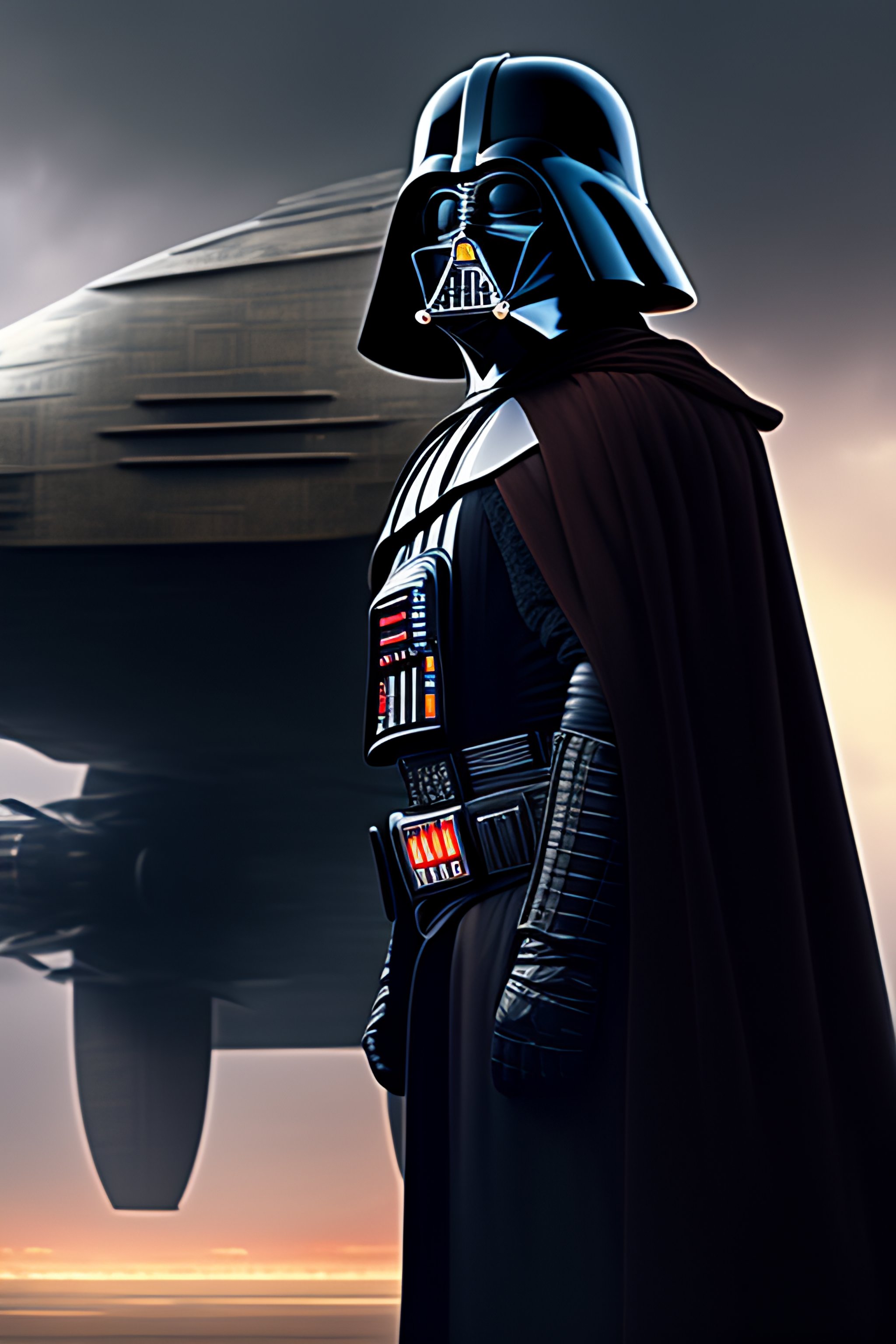 Darth vader standing heroically on top of a tie fighter, hyper realism, photo realism, high detail, highly ornate intricate details, focus, concept art, gloomy and foggy background, perfect anatomy, 4k, deep aesthetic, 70’s sci-fi