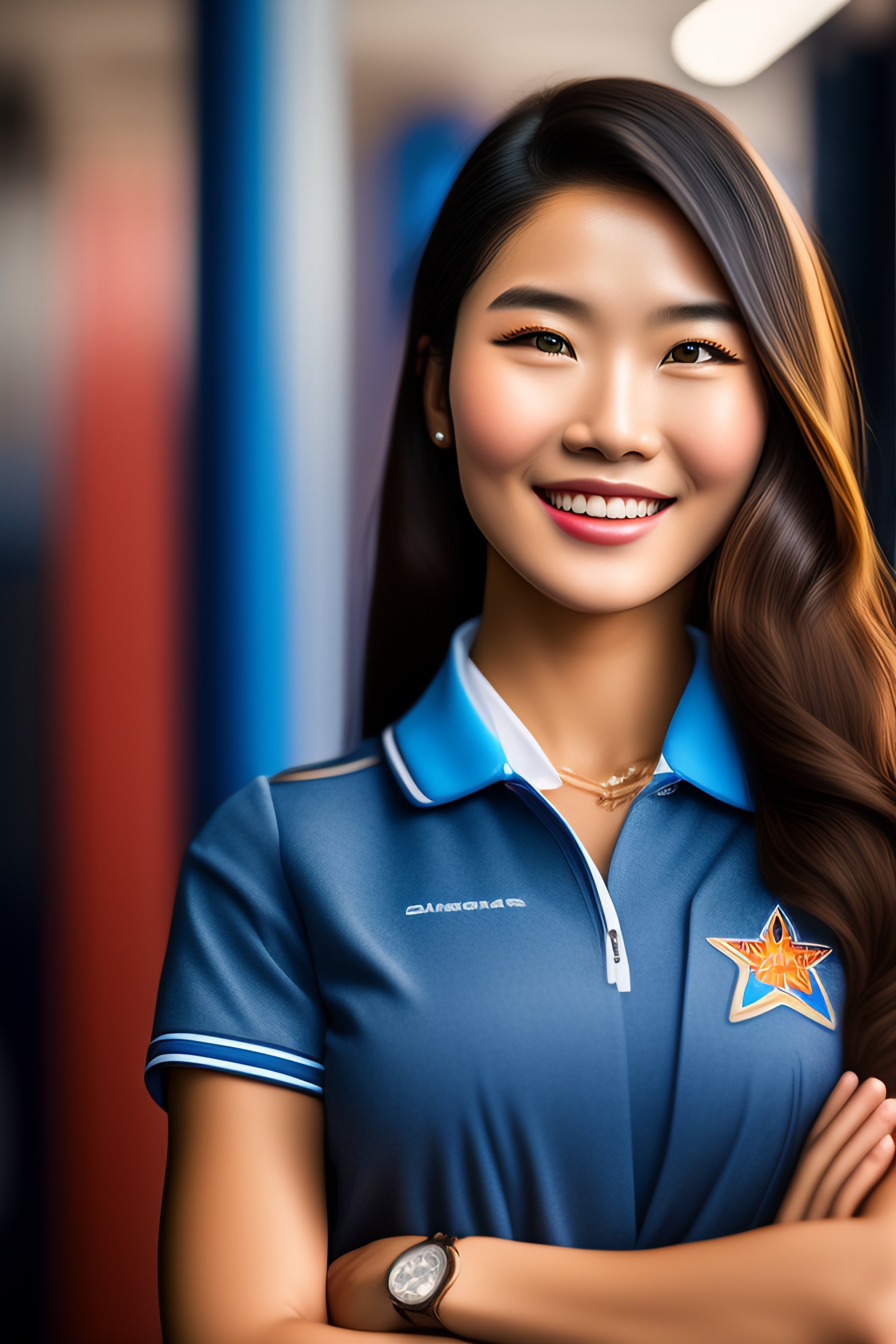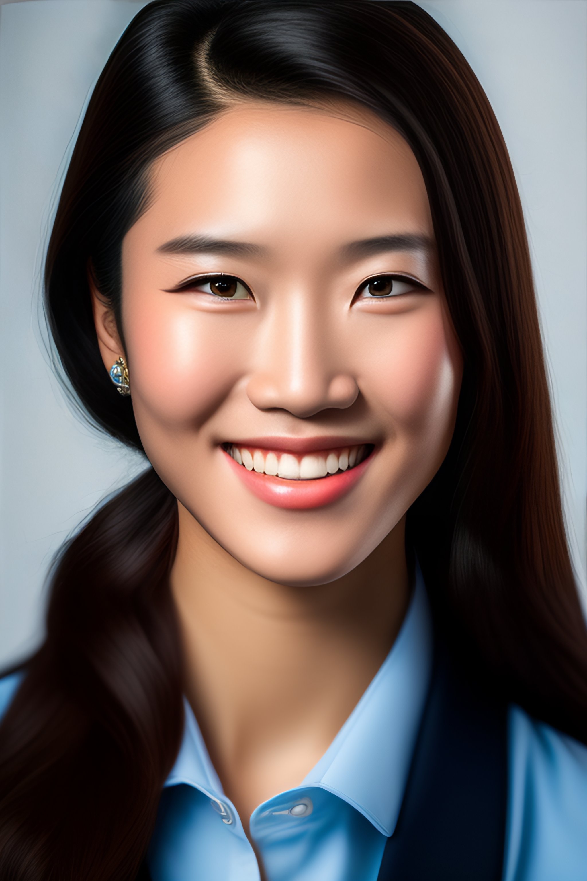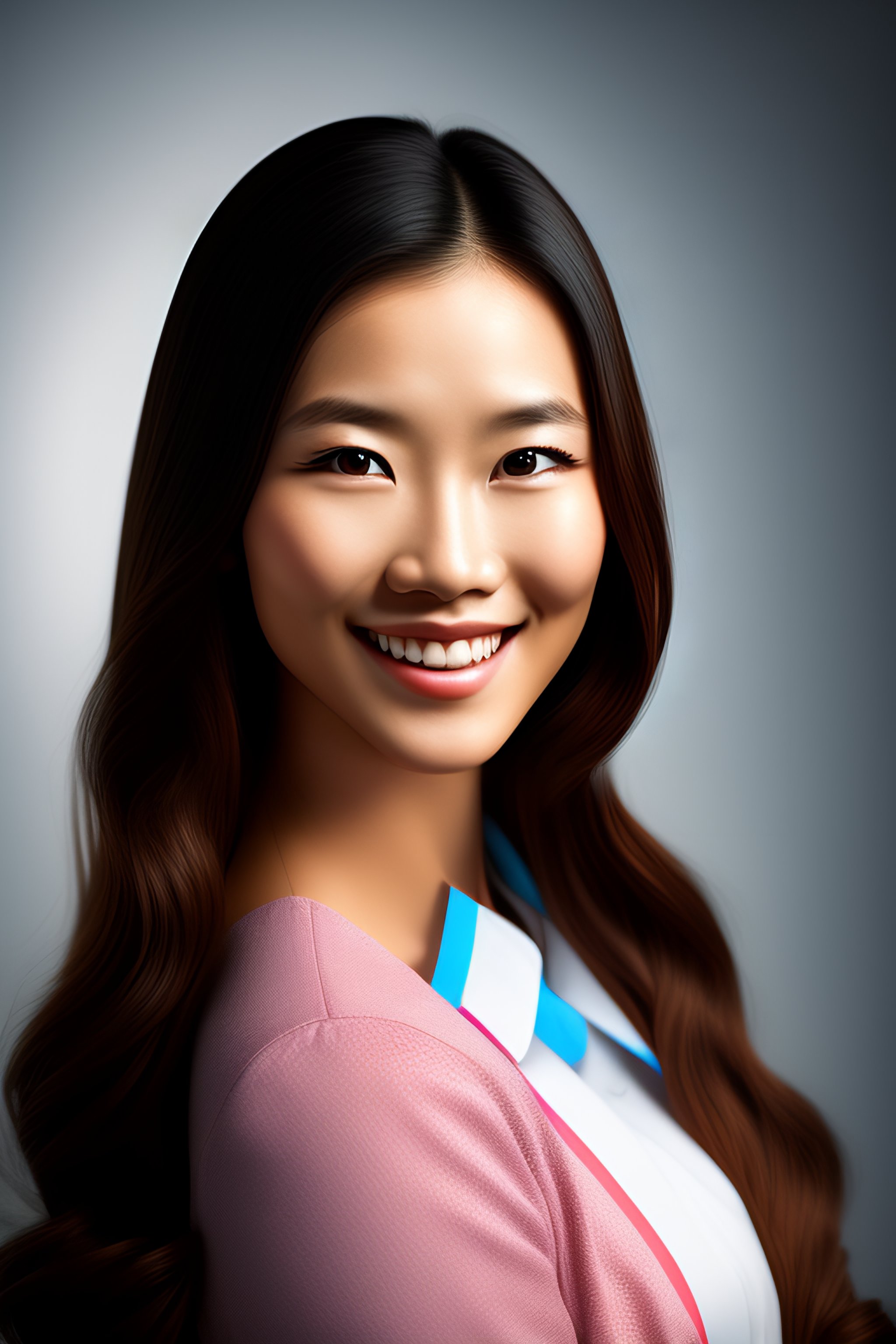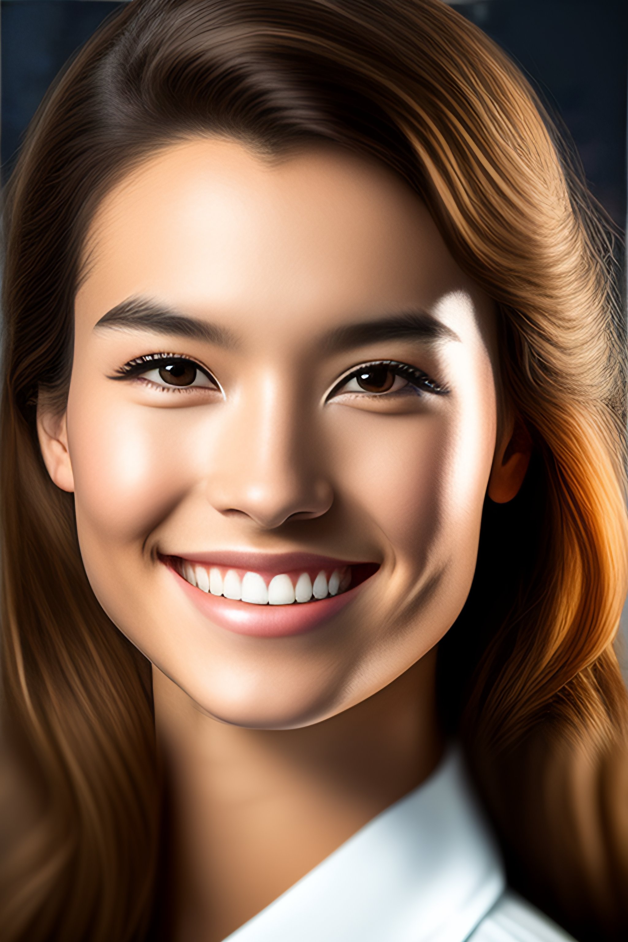 An award-winning closeup photo of a smilling high school girl dressed casually, realistic skin, 4 k, studio lighting, wide angle lens
