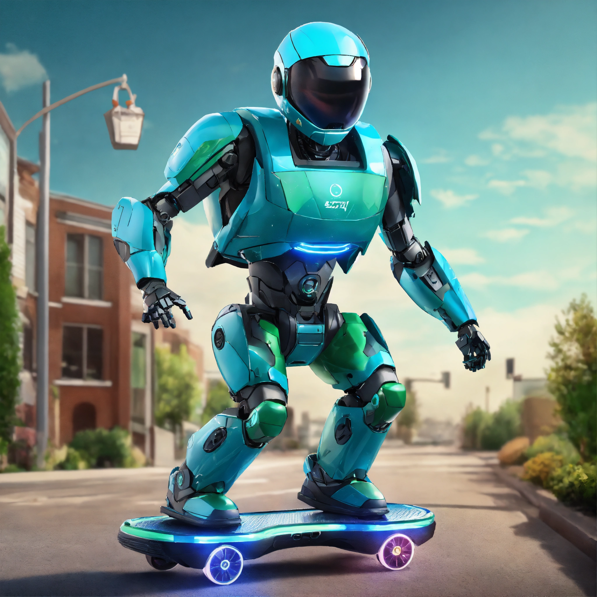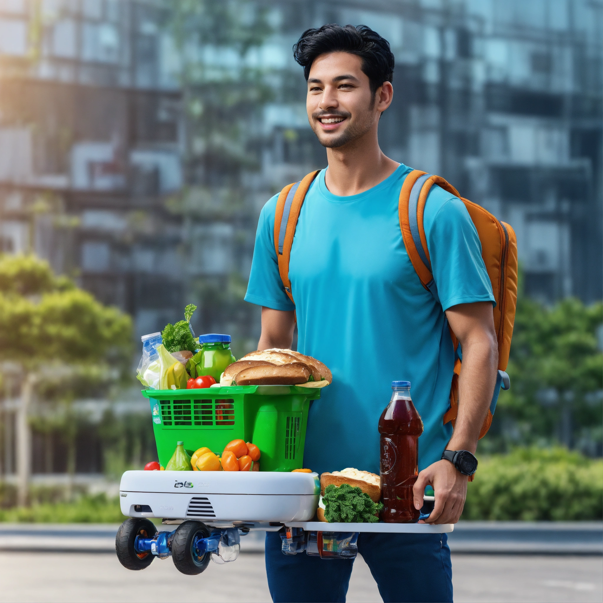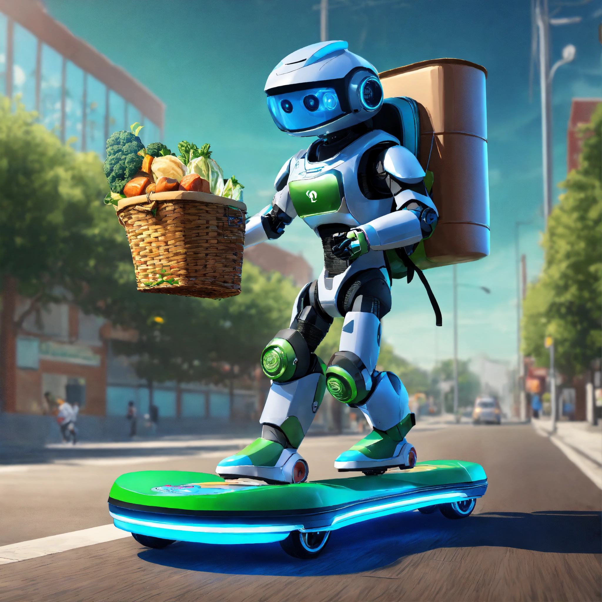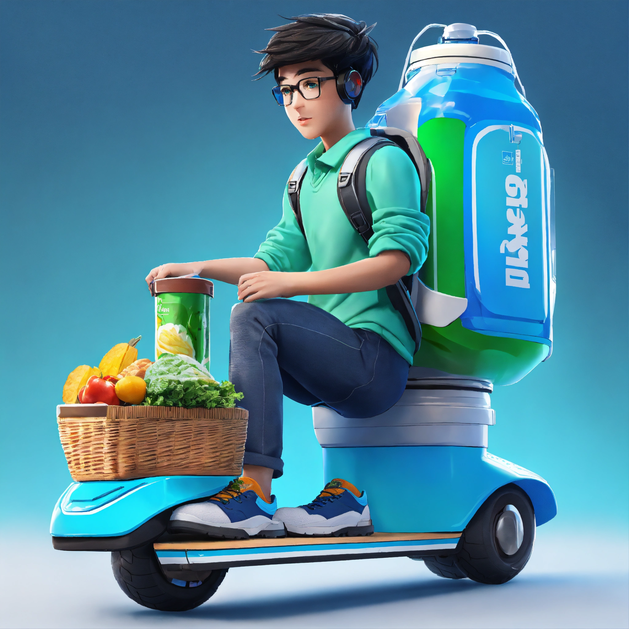 A passionate male robot rides on hoverboard, realistic man face, clear eyes, black hair, full appearance. delivering groceries, specially assorted milk bottle, bread pack, soft drink, and some assorted vegetables basket on hands. sports backpack. transparent background, the predominant design colors are gradients of blue and green. no background images, background should be gradients of blue and green