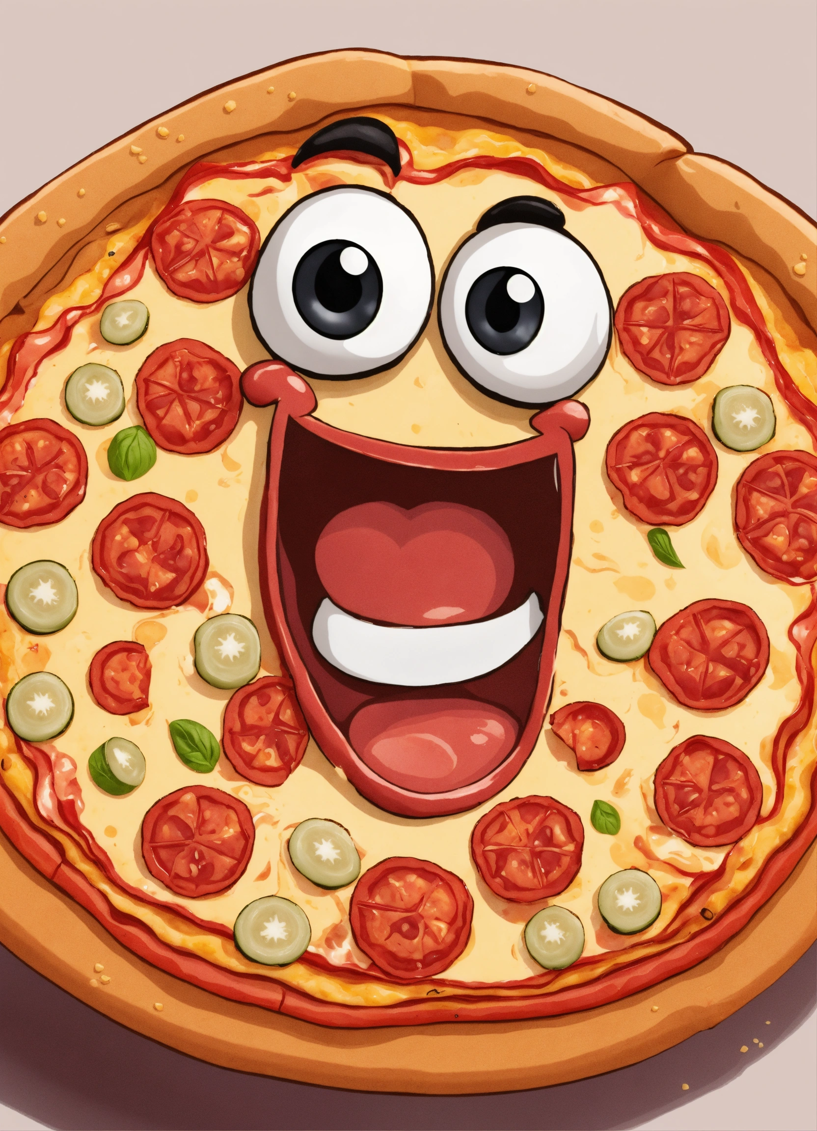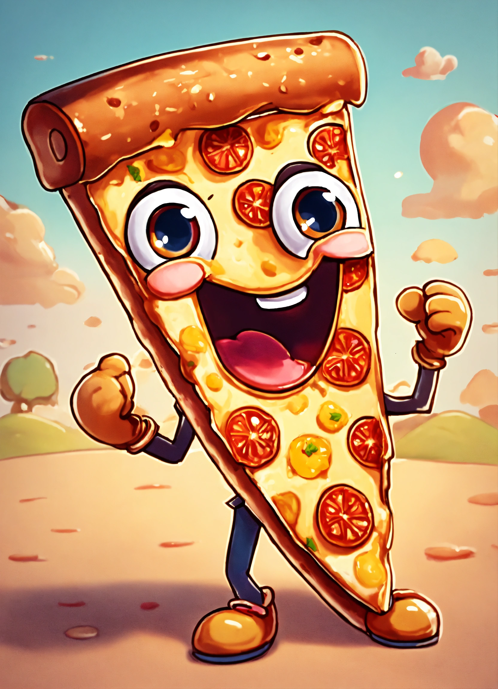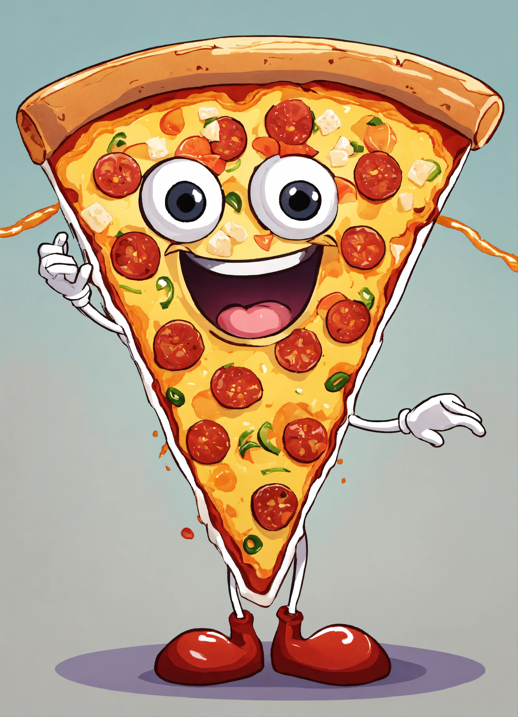 Slice of cartoon style animated pizza that looks pretty and with a nice face (not creepy, not terrify), delicious with melted cheese, that is animated type with animated face two eyes, one mouth, one nose, two legs and two hands, dancing pose, it looks like a cartoon, amazing 4k quality colors, white background, image with well-cast shadows where they have to go, let it be pepperoni pizza that is dancing, white background