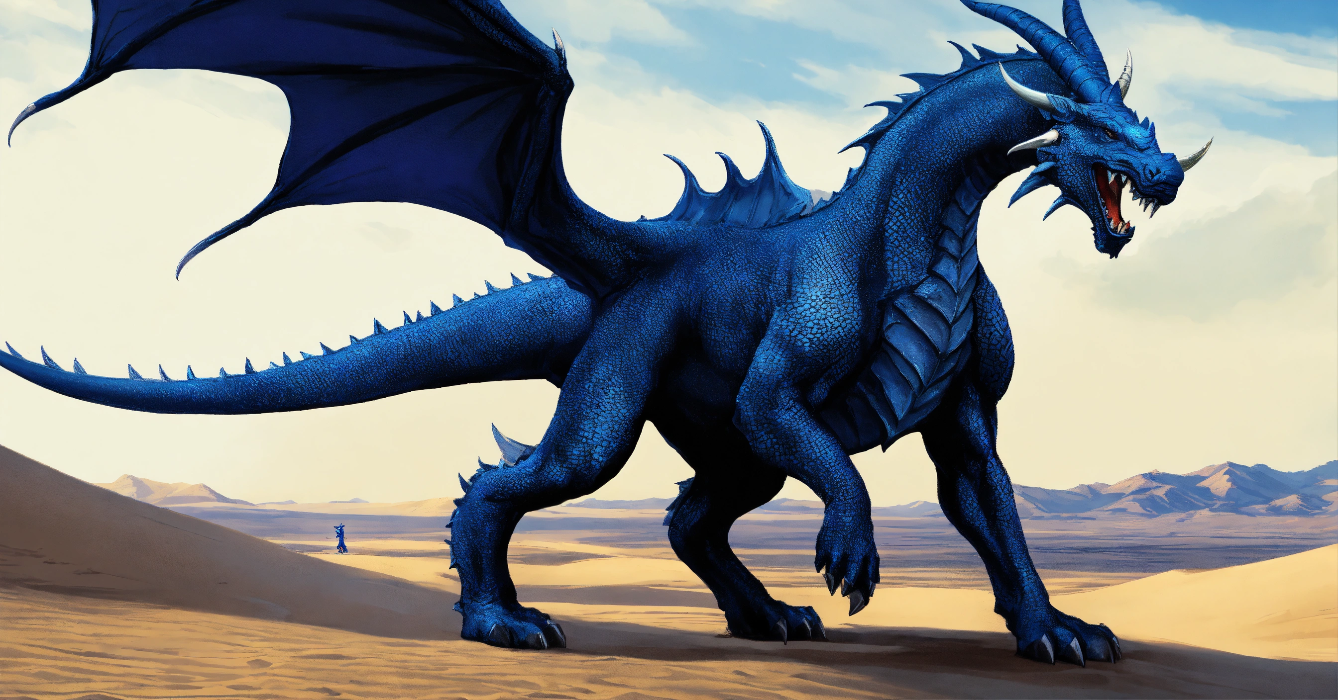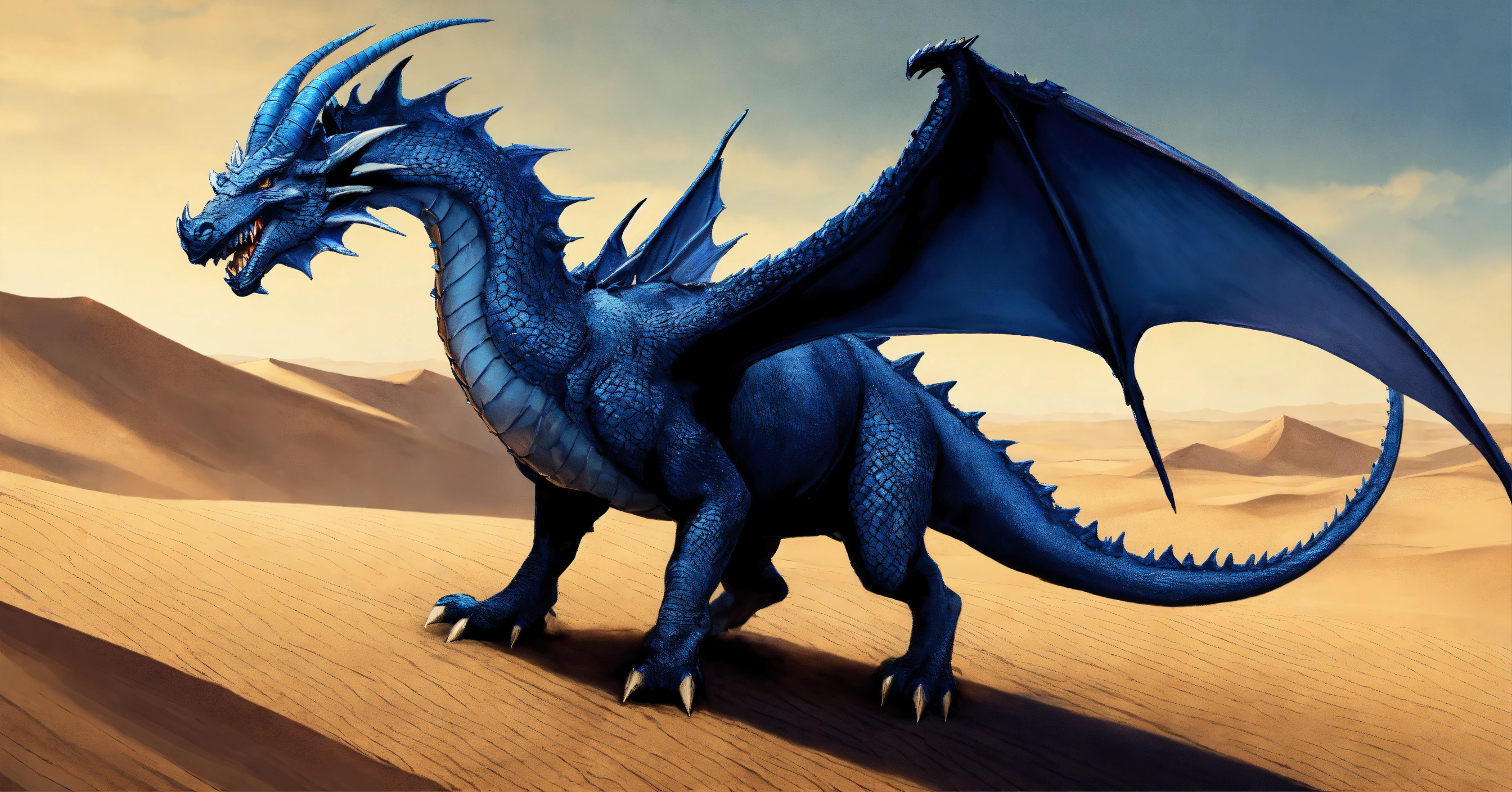 Fine art, delicate detail, noble, dungeons and dragons blue dragon with a horn like a rhino, standing over desert dunes. his skin is smooth and matte dark blue, with small horns. wings are long and elegant providing impressive strength, in the style of digital graphic novel art