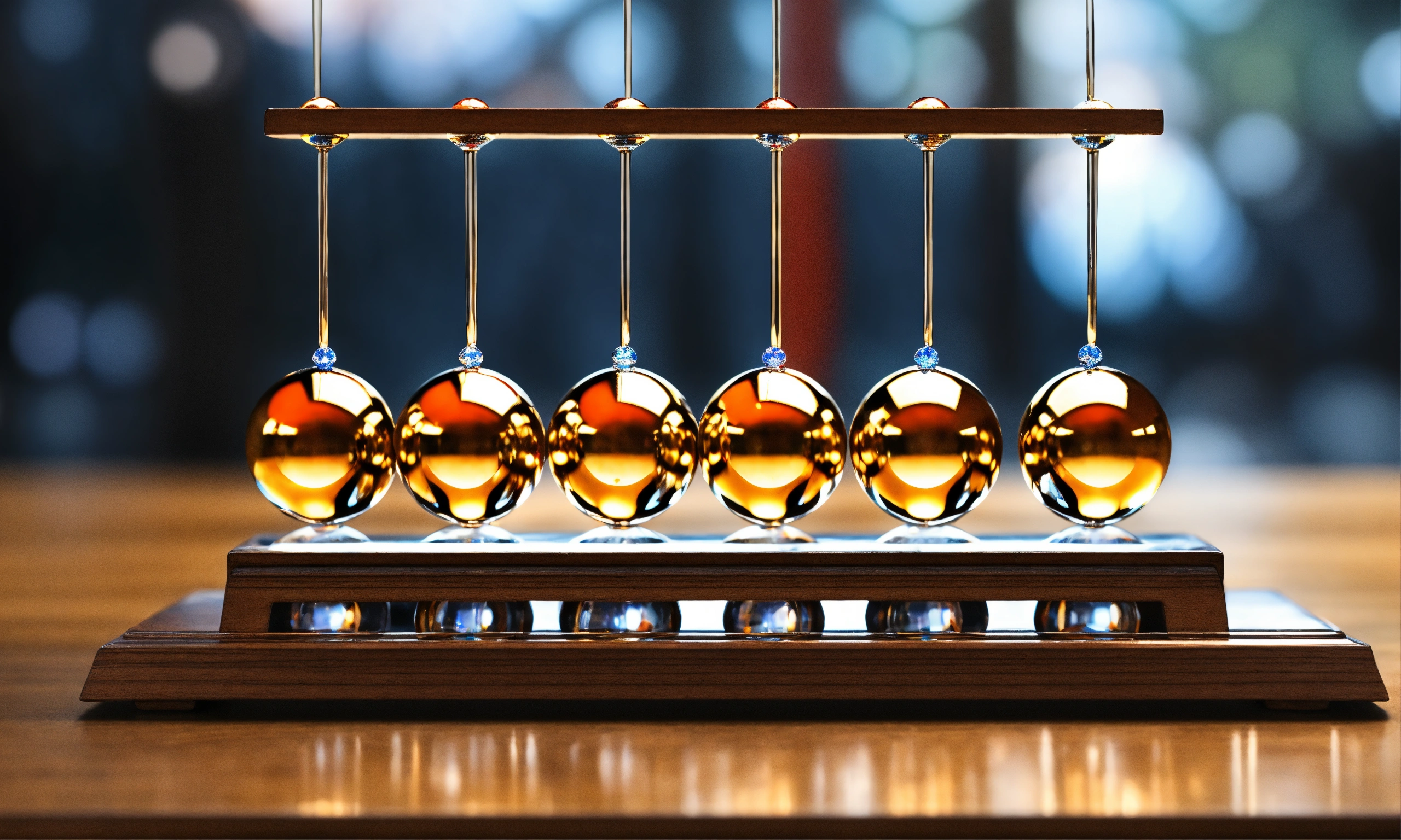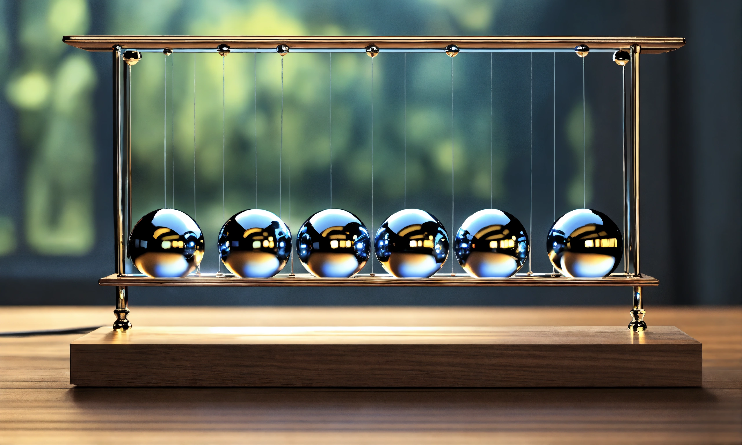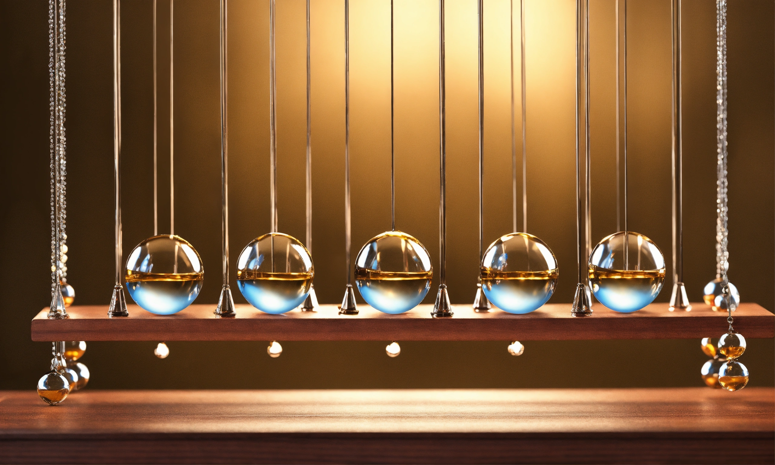 Five crystal balancing balls newtons cradle, pendulum isolated, human faces reflections on balls, photo-realistic, 8k, high definition