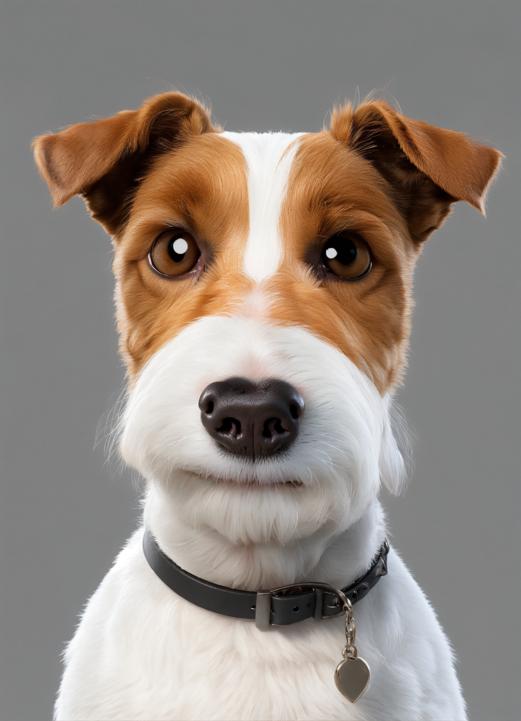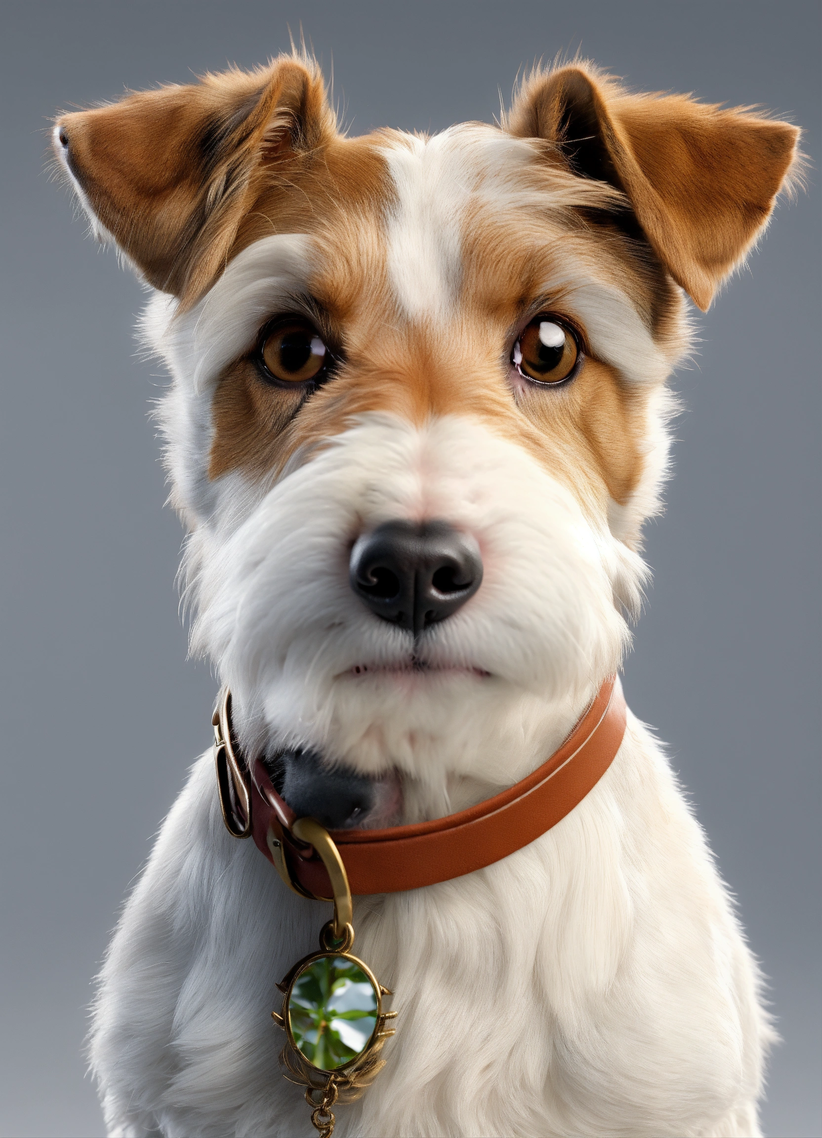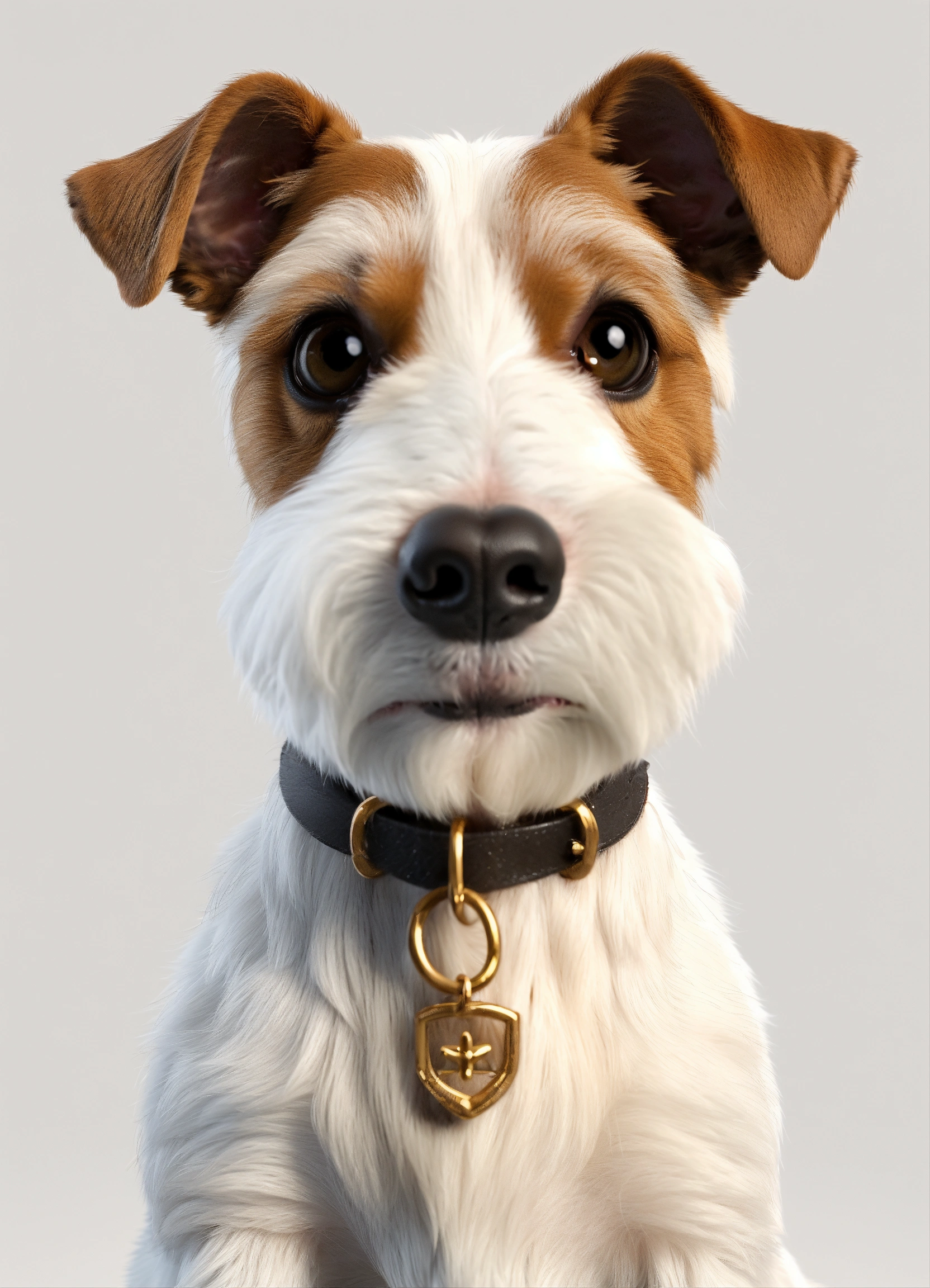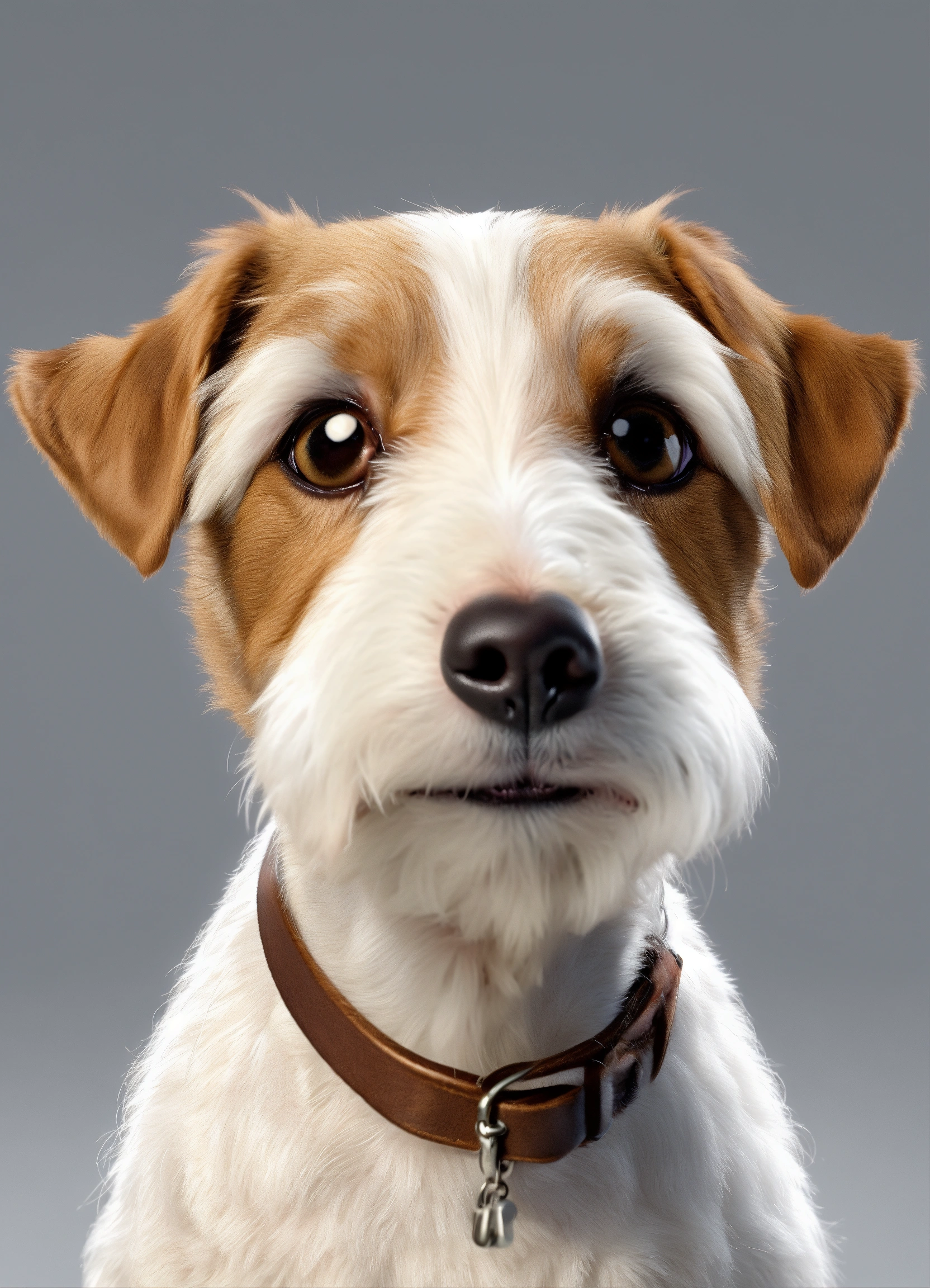 A cute happy surrealistic 3d animation, of a parson russell terrier, brown ears, and white bushy eyebrows. white clear background.