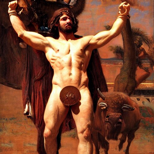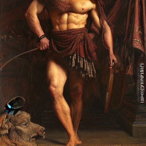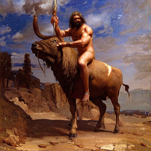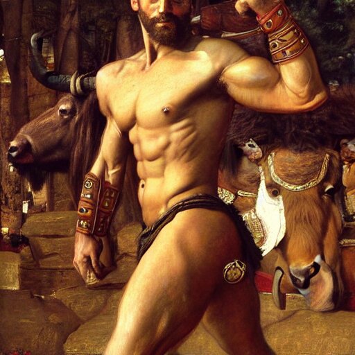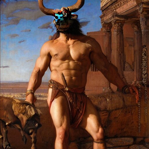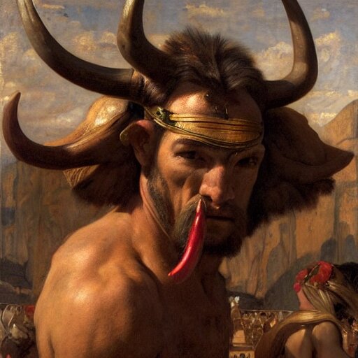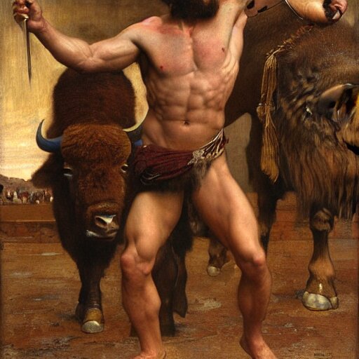 Minotaur. muscular warrior with the head of a bison (buffalo). orientalist portrait by john william waterhouse and edwin longsden long and theodore ralli and nasreddine dinet, oil on canvas. cinematic, hyper realism, dramatic lighting, high detail 4k