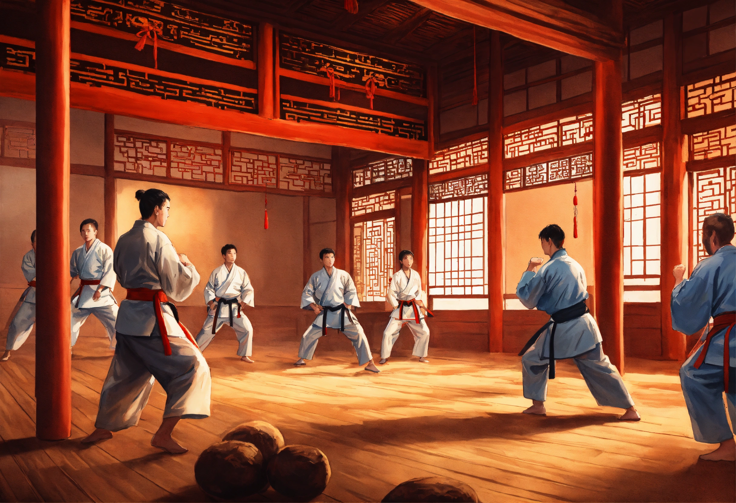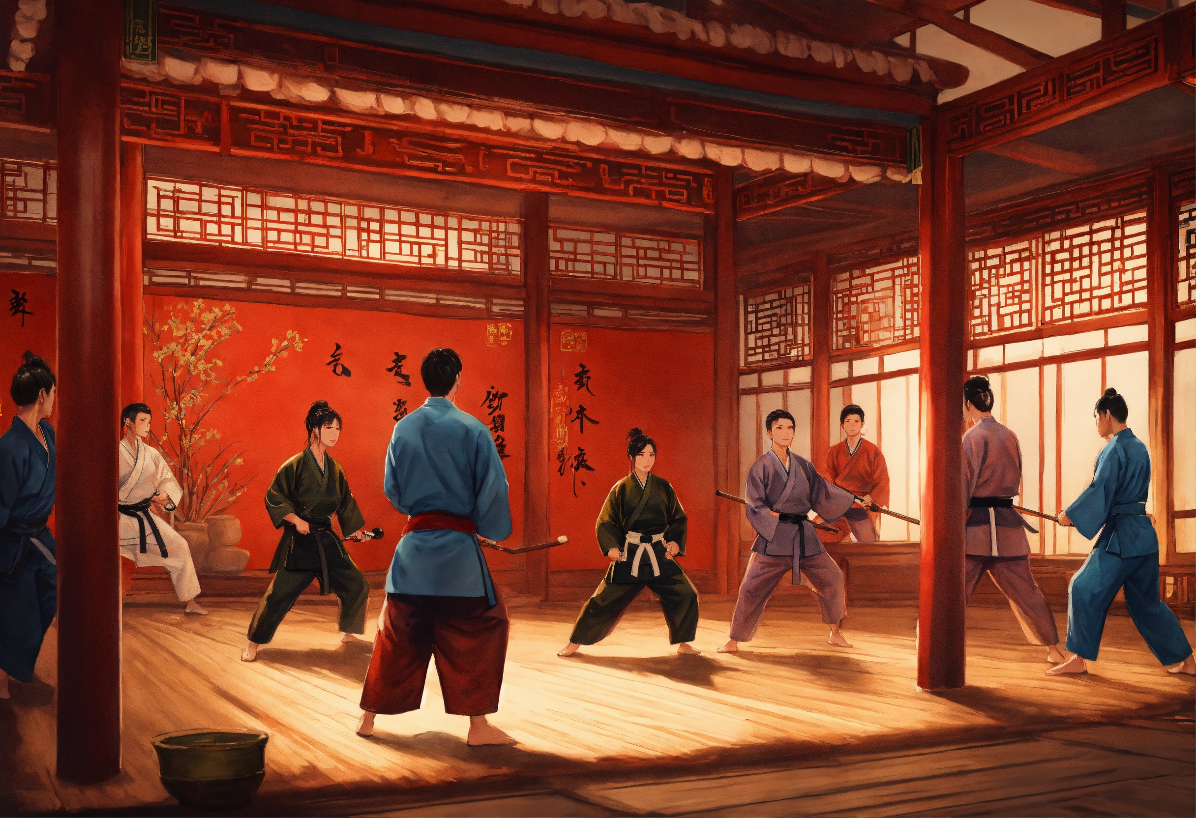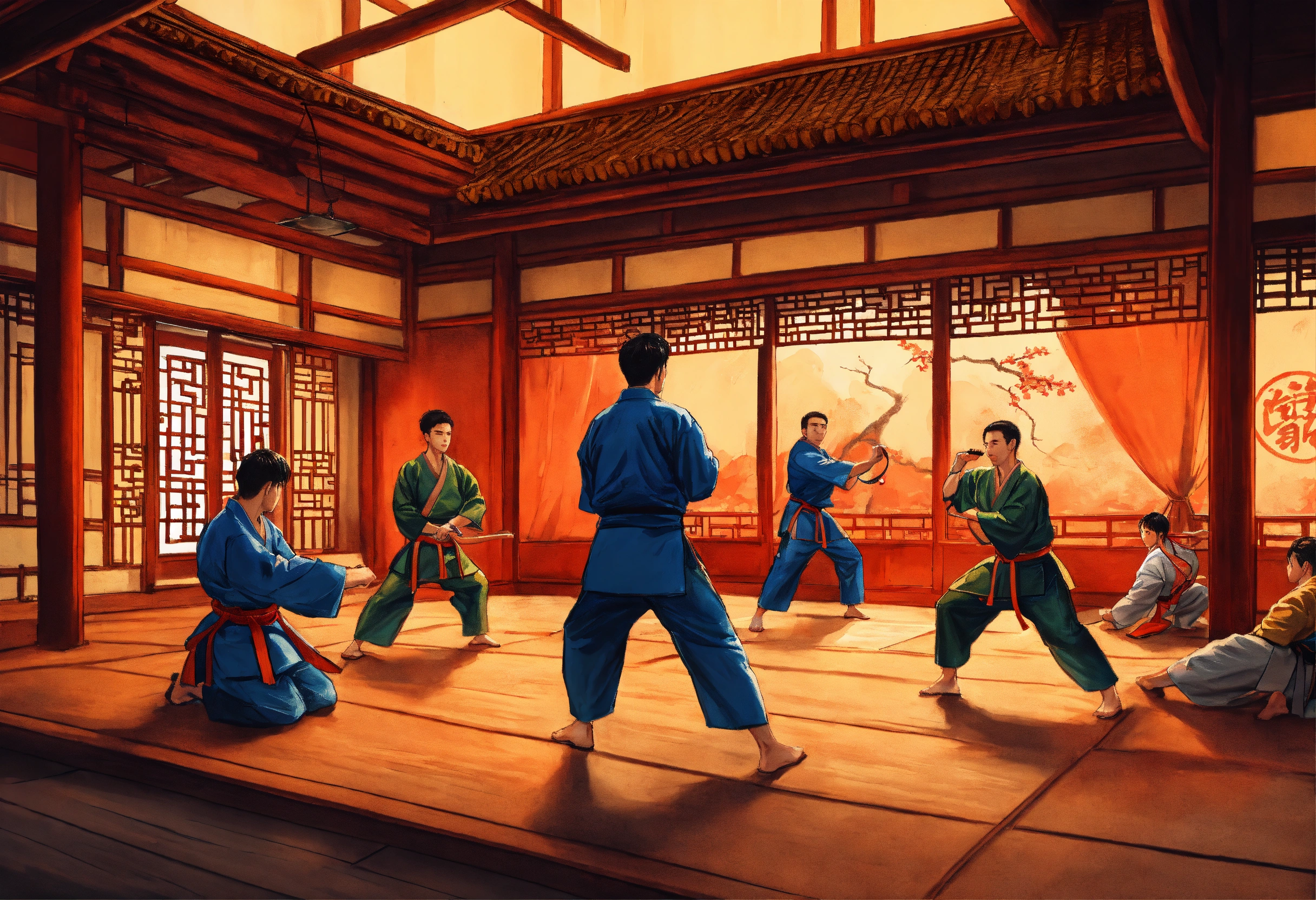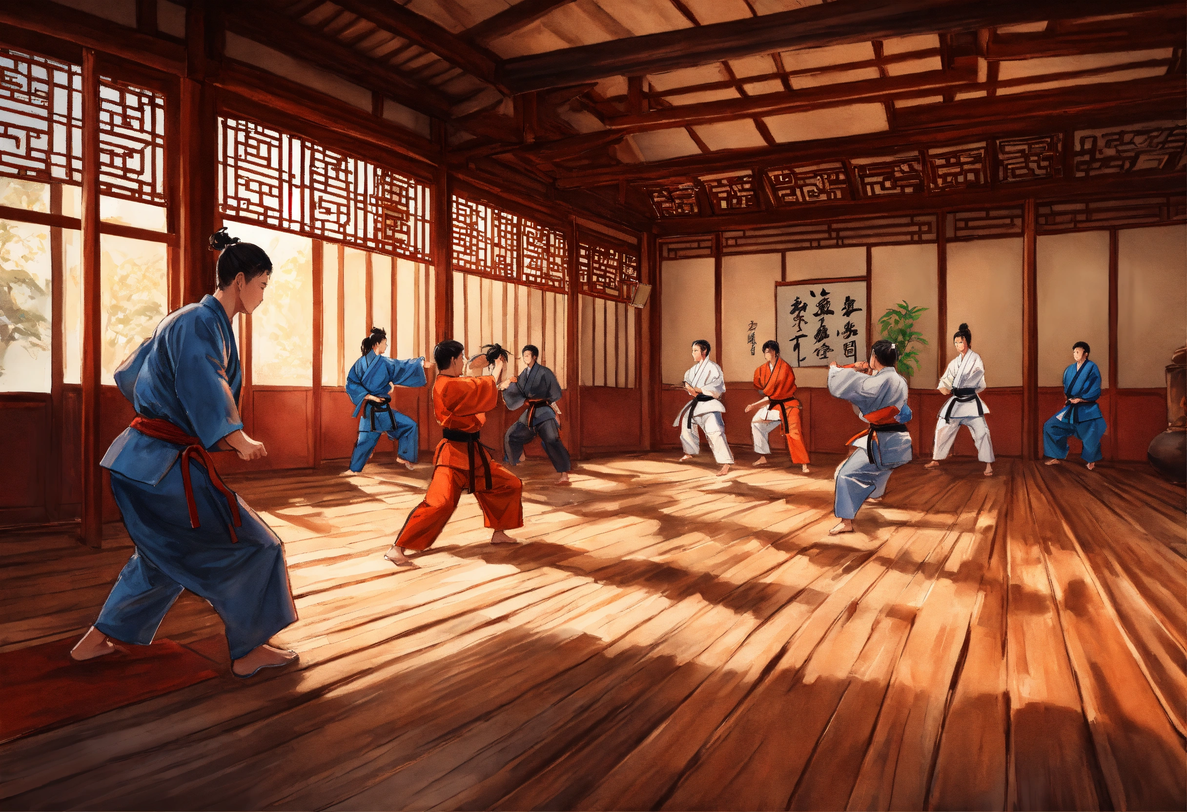 A hand drawn painting of a few people practicing martial arts in an old chinese dojo. highly detailed crisp photo in 4k, wide-angle, sharp, vibrant, vivid.