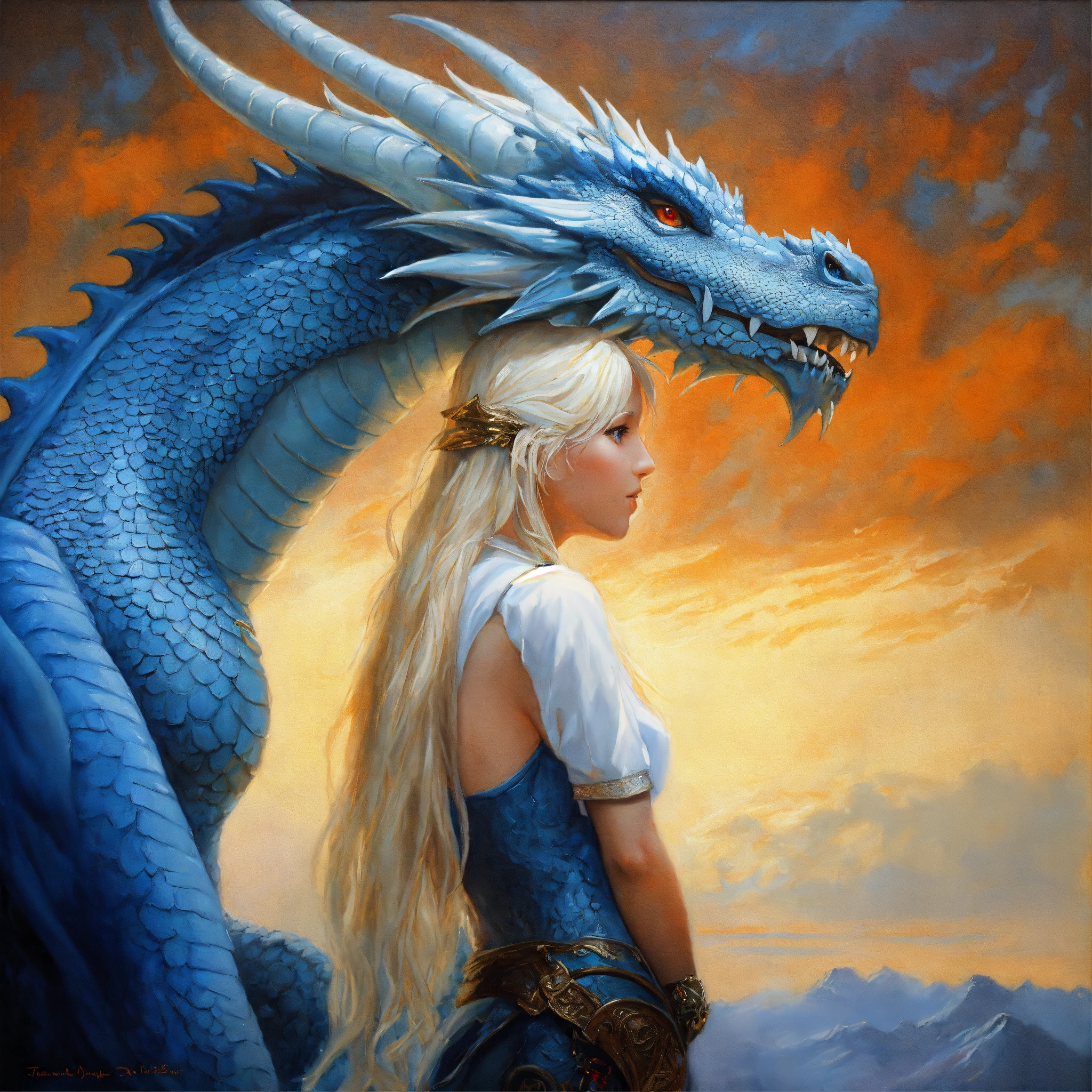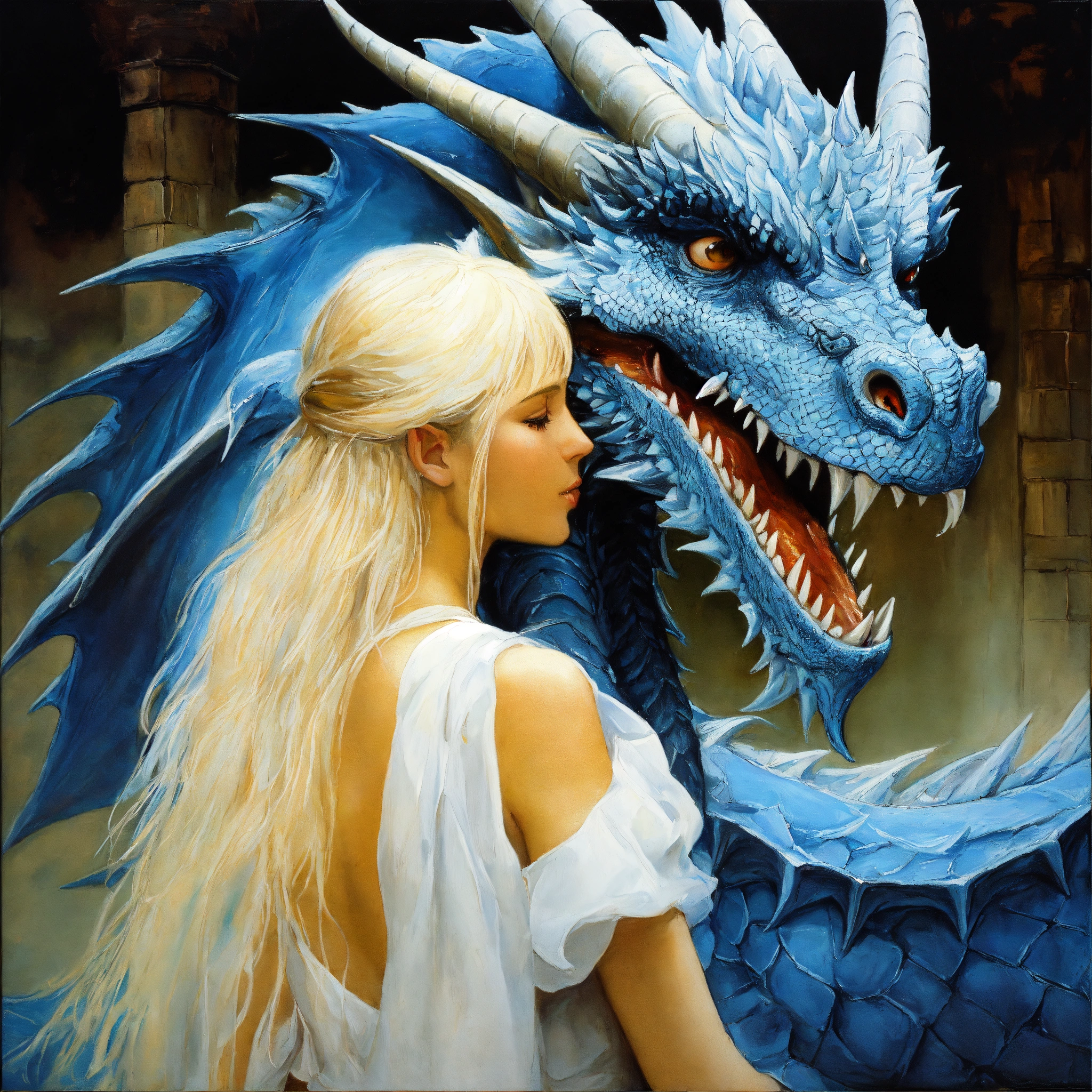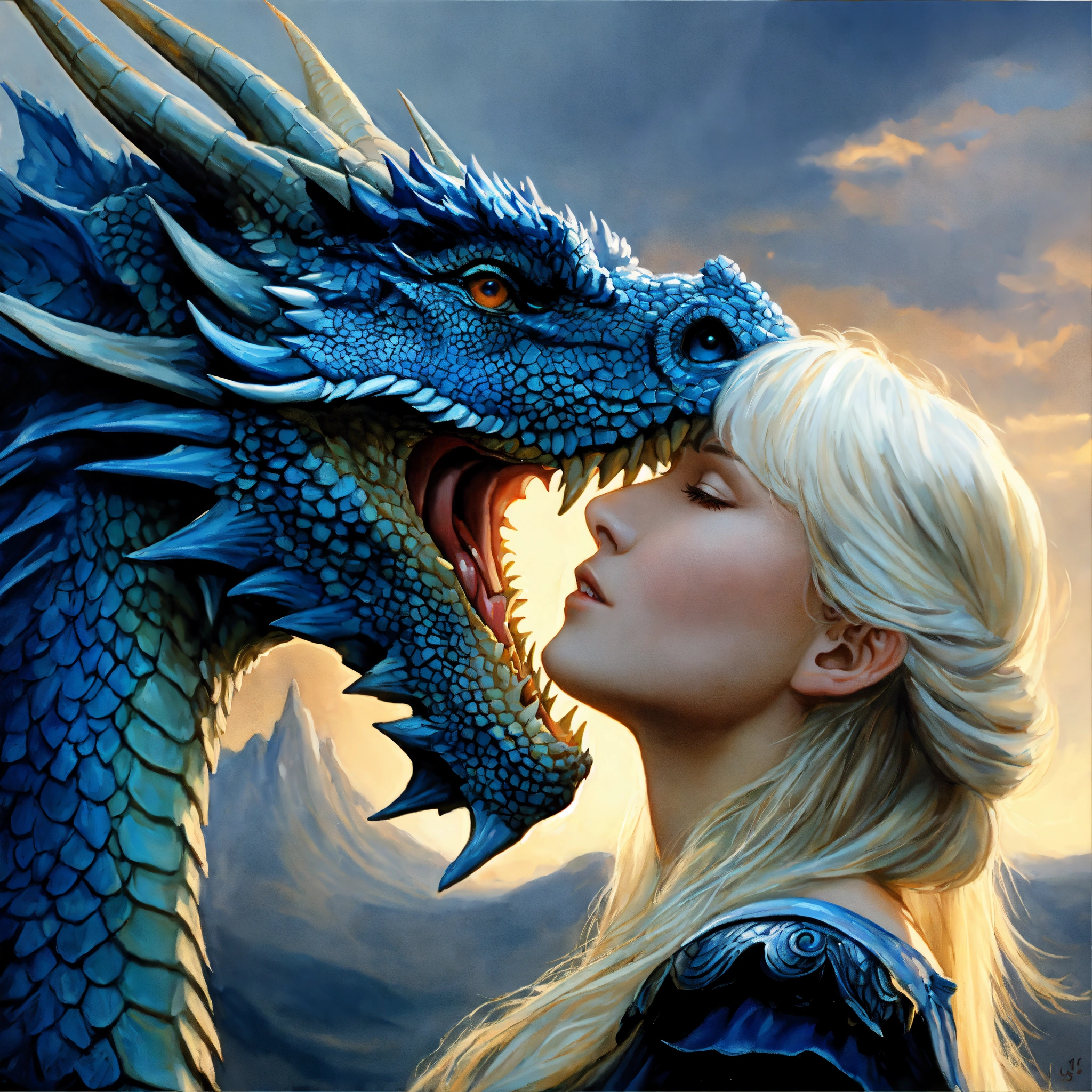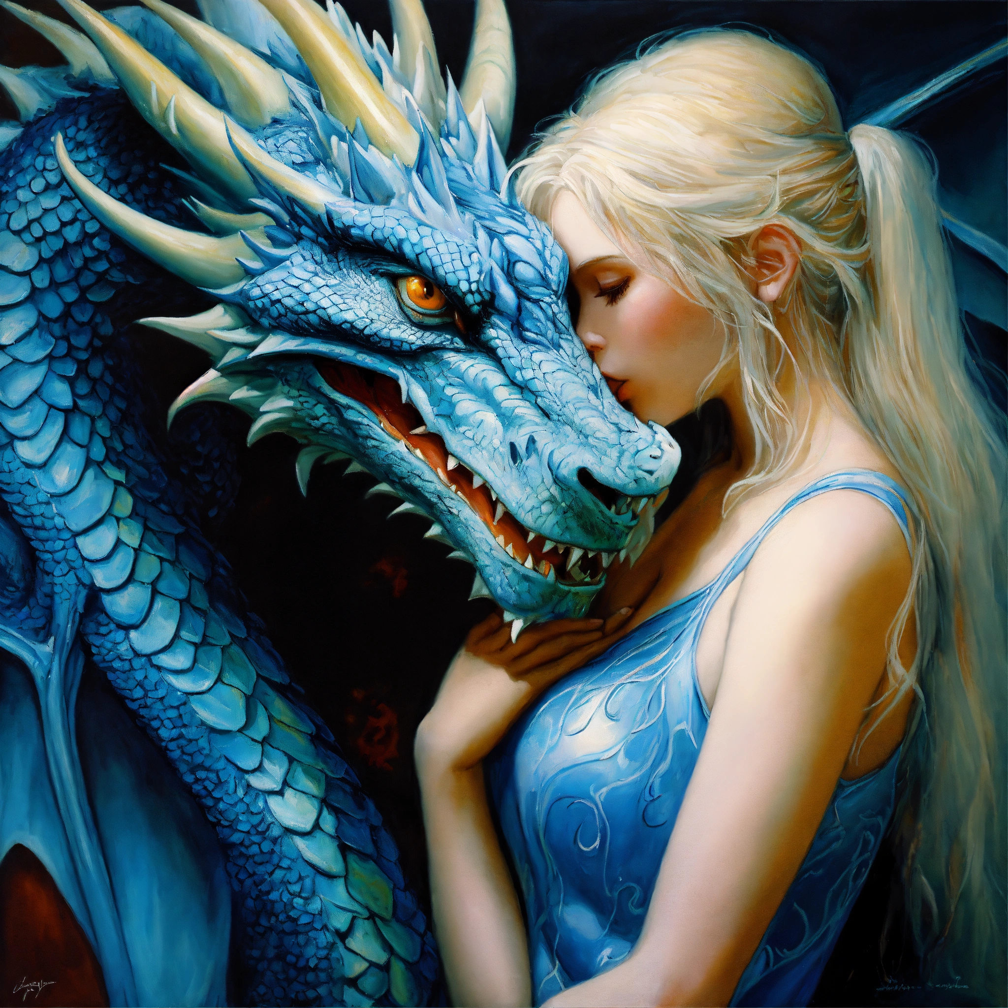 Oil painting of a huge, magnificent two meter big blue dragon's head with a 15 year old white blonde elf girl lovingly hugging and kissing the dragon's head, the dragon's head is as big as the entire girl, ultra detailled, ultra realistic, in the style of luis royo