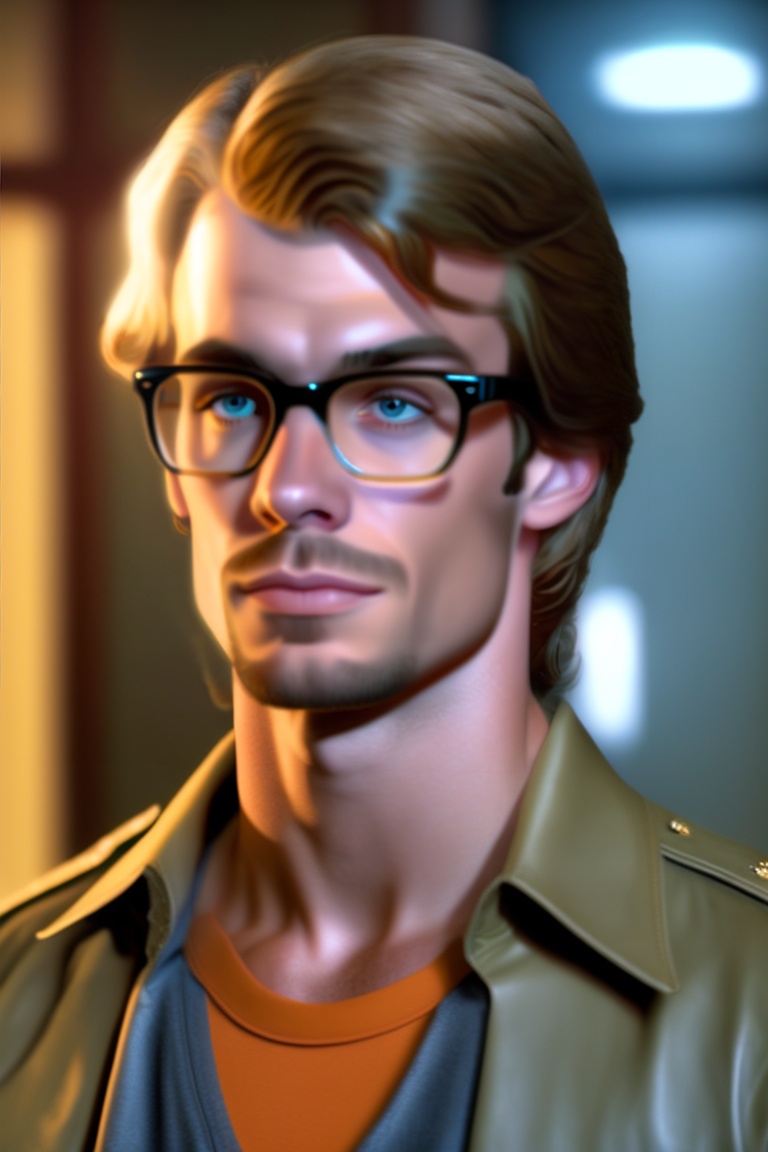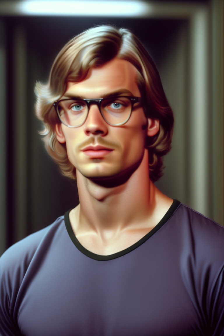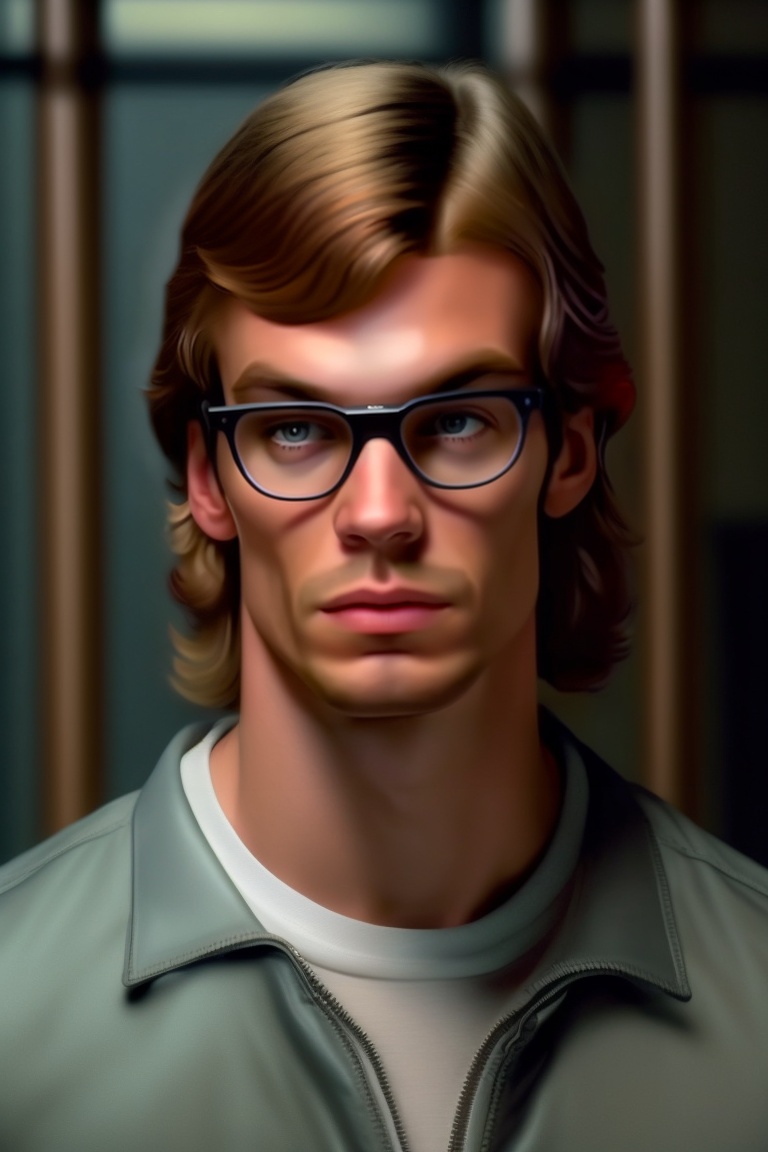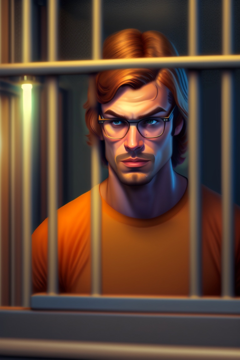 Jeffrey dahmer looking at the camera with a dark prison setting