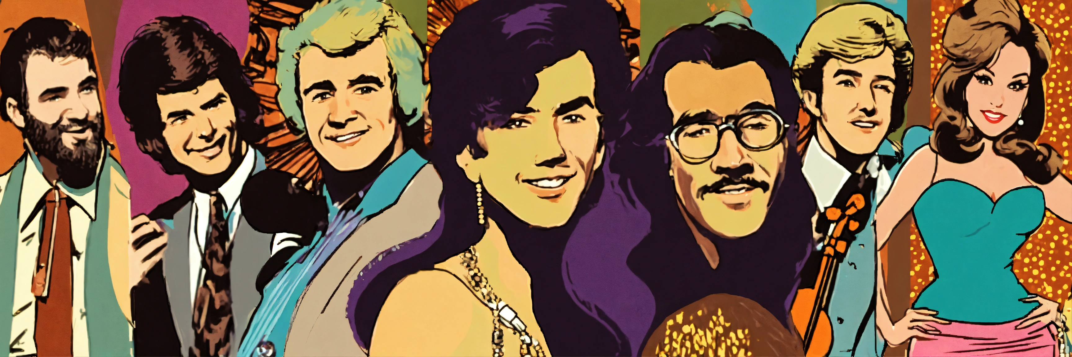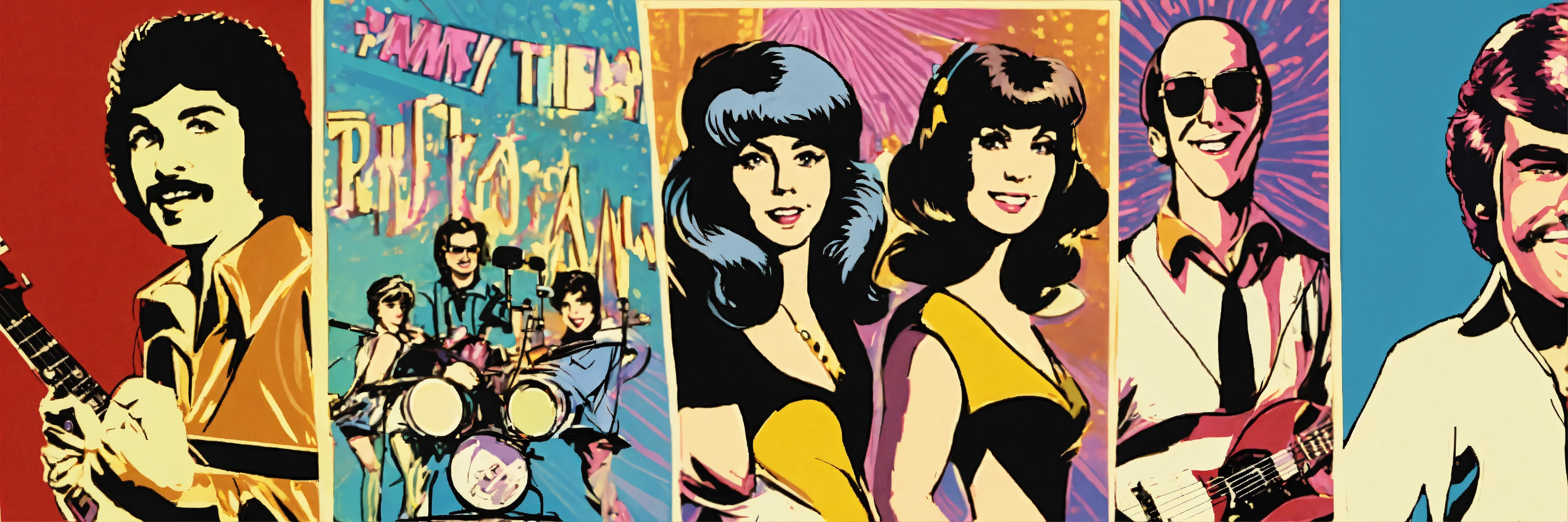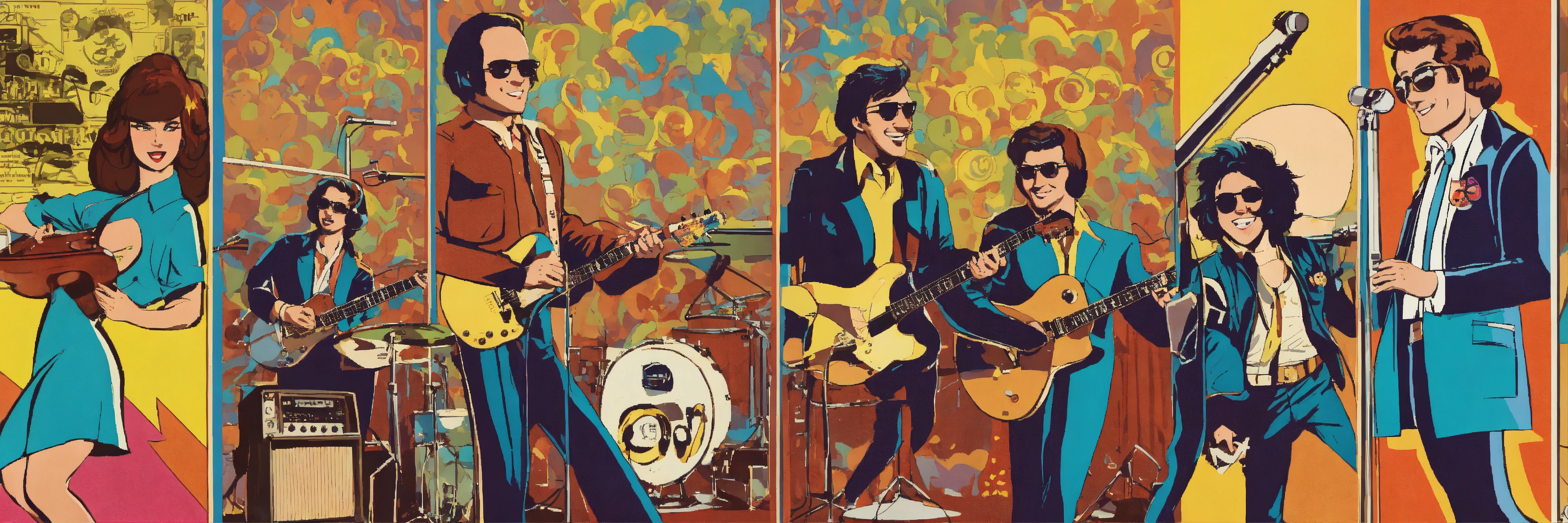 A montage of retro music stars from the 60’s and 70’s in cartoon style