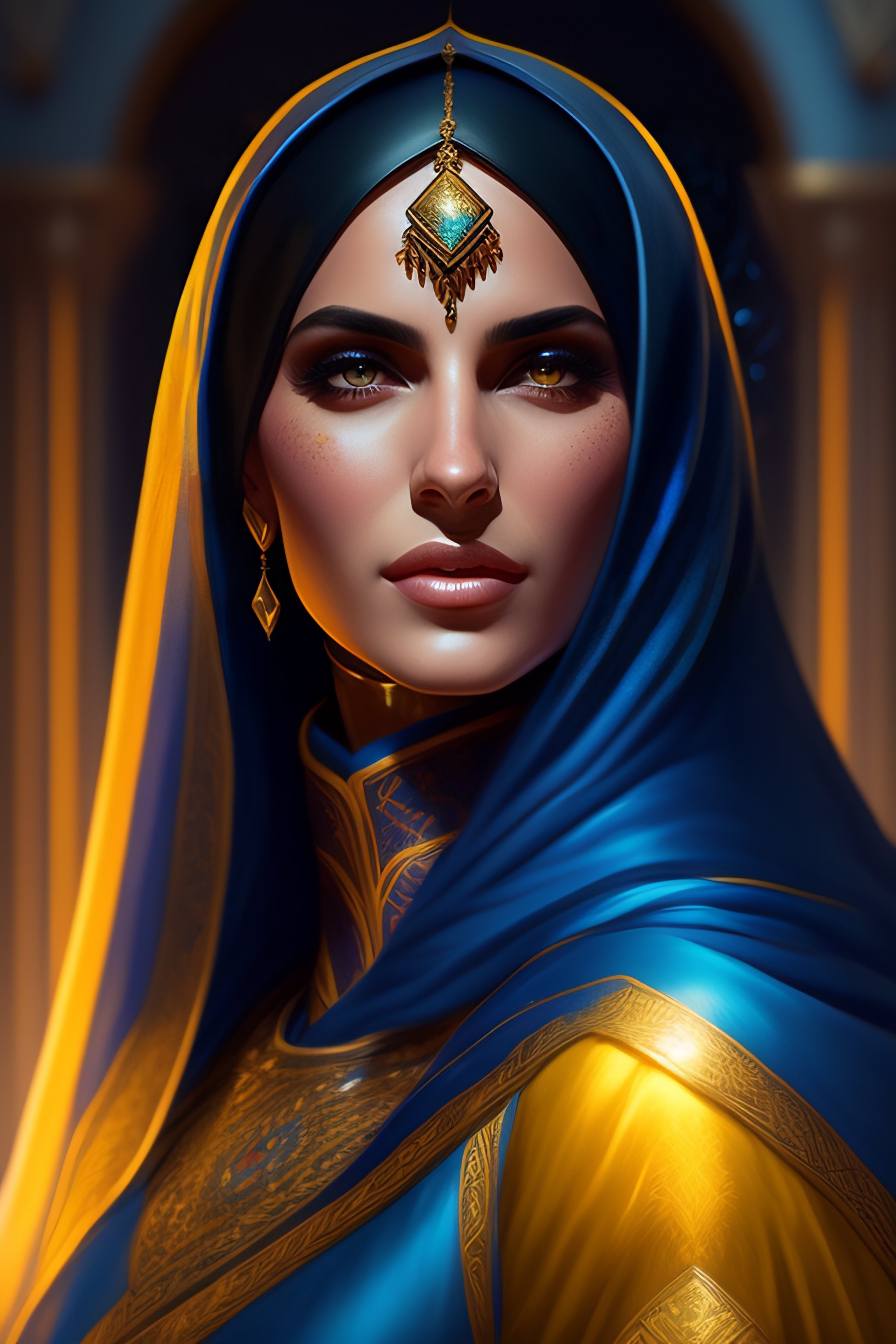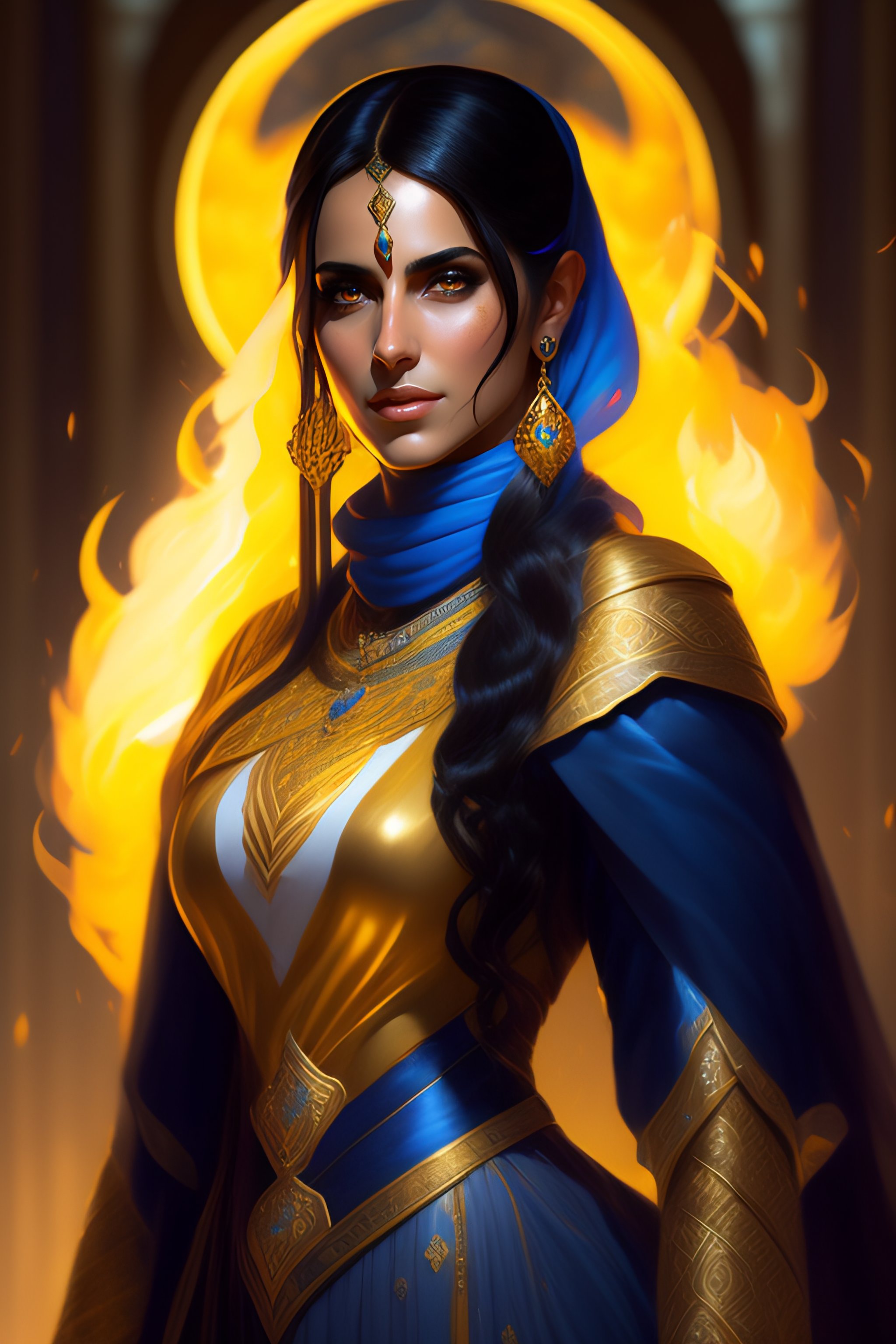 Portrait of a middle - eastern female cleric with straight black hair wearing blue and yellow vestments casting fireball, fantasy, highly detailed, digital painting, artstation, concept art, character art, art by greg rutkowski and tyler jacobson and alphonse mucha