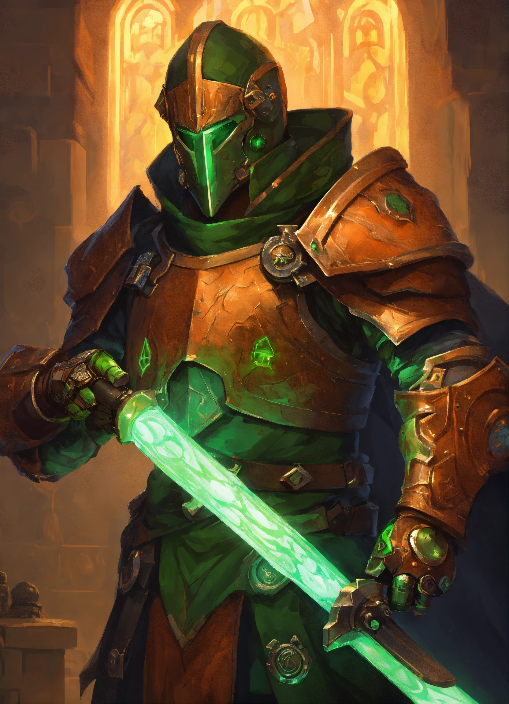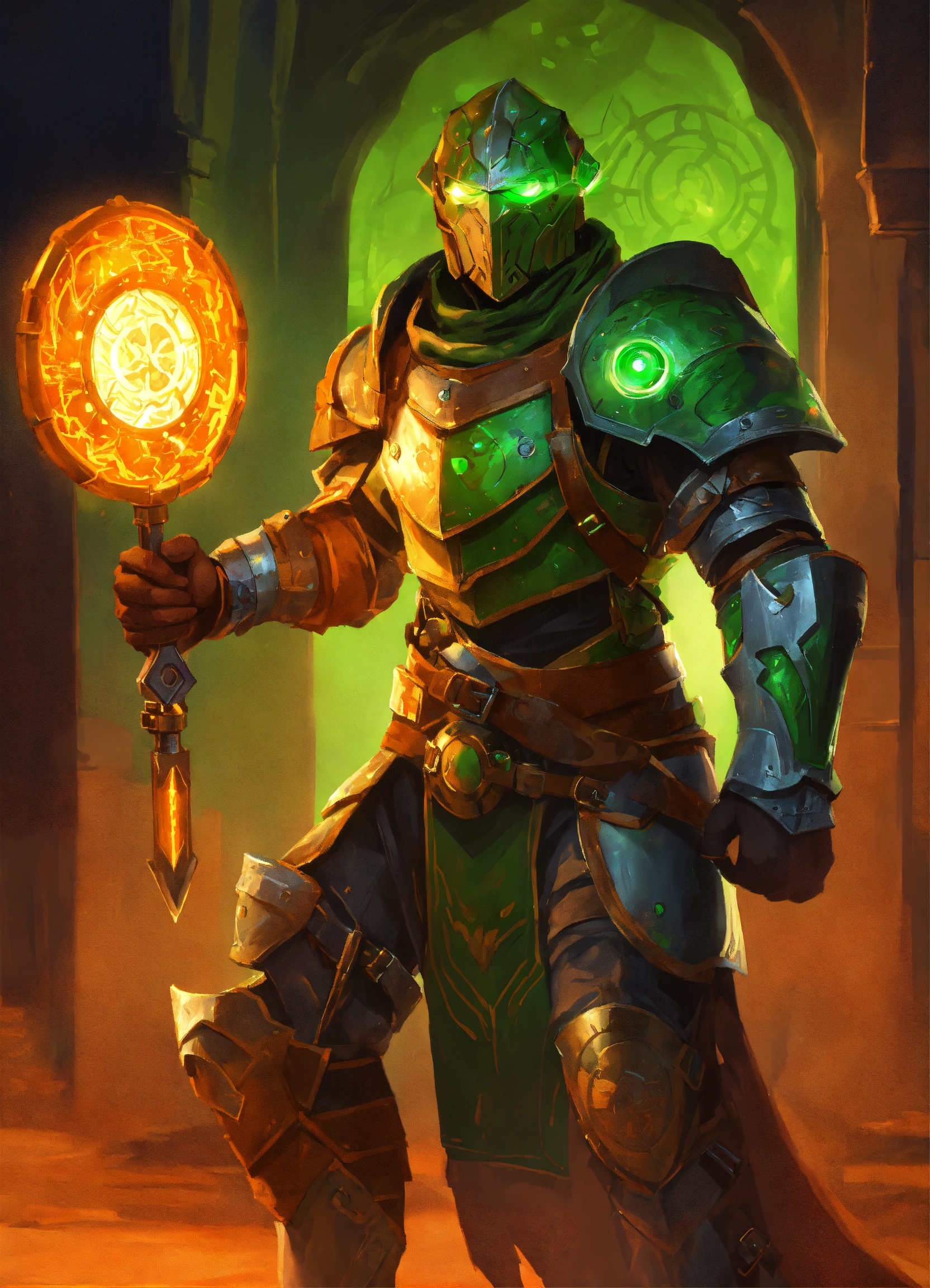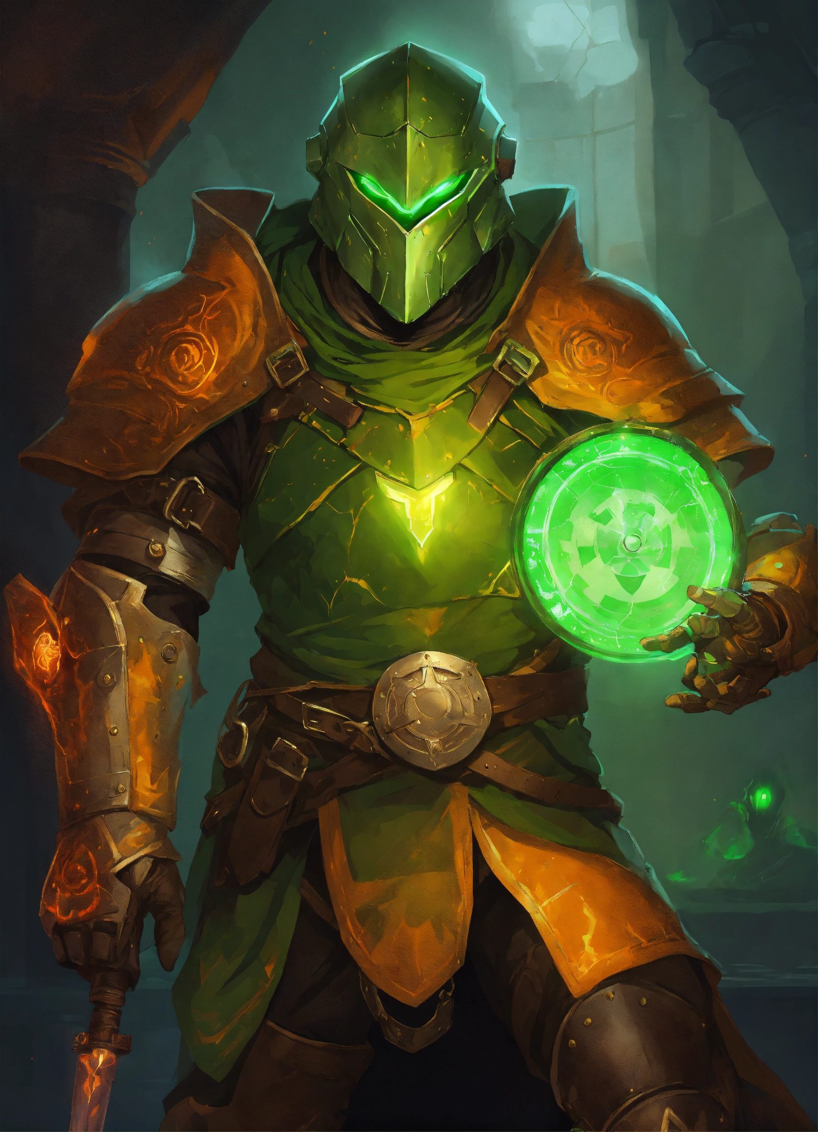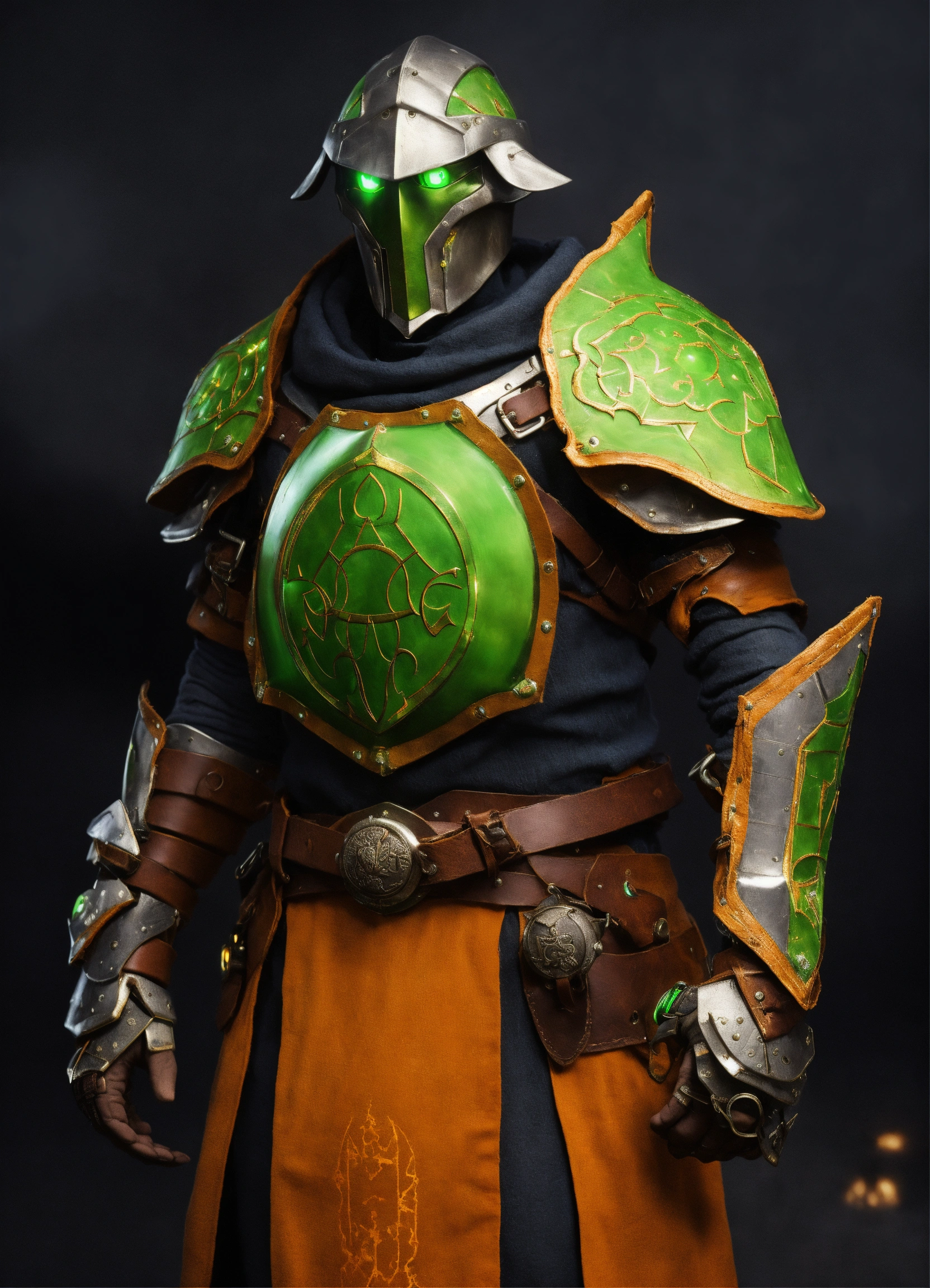 A d&d warforged with leather like skin and an armblade, he has glowing green eyes, one hand has his armblade extended while crackling with electricity and the other is holding a shield, the cloth parts of the clothing are orange