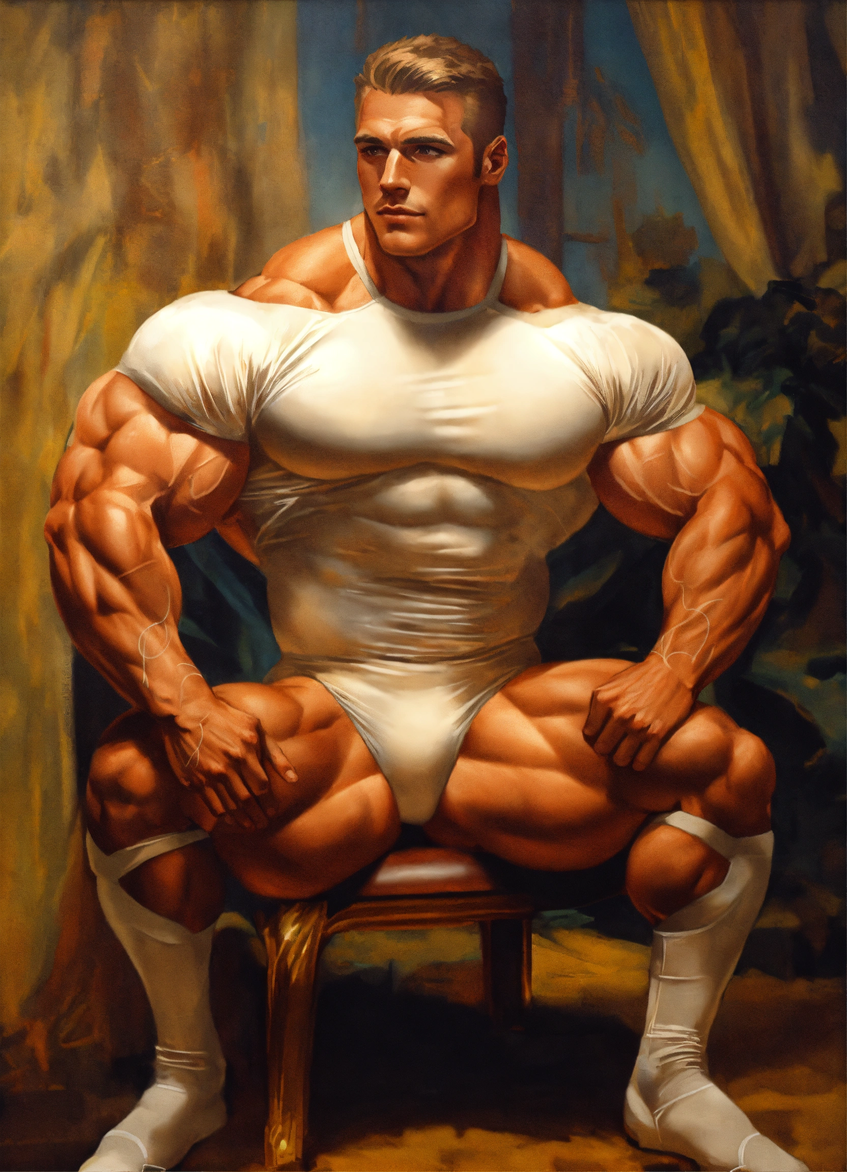 A full picture of a muscular white bodybuilder wearing a sheer leotard and stockings on legs, detailed.