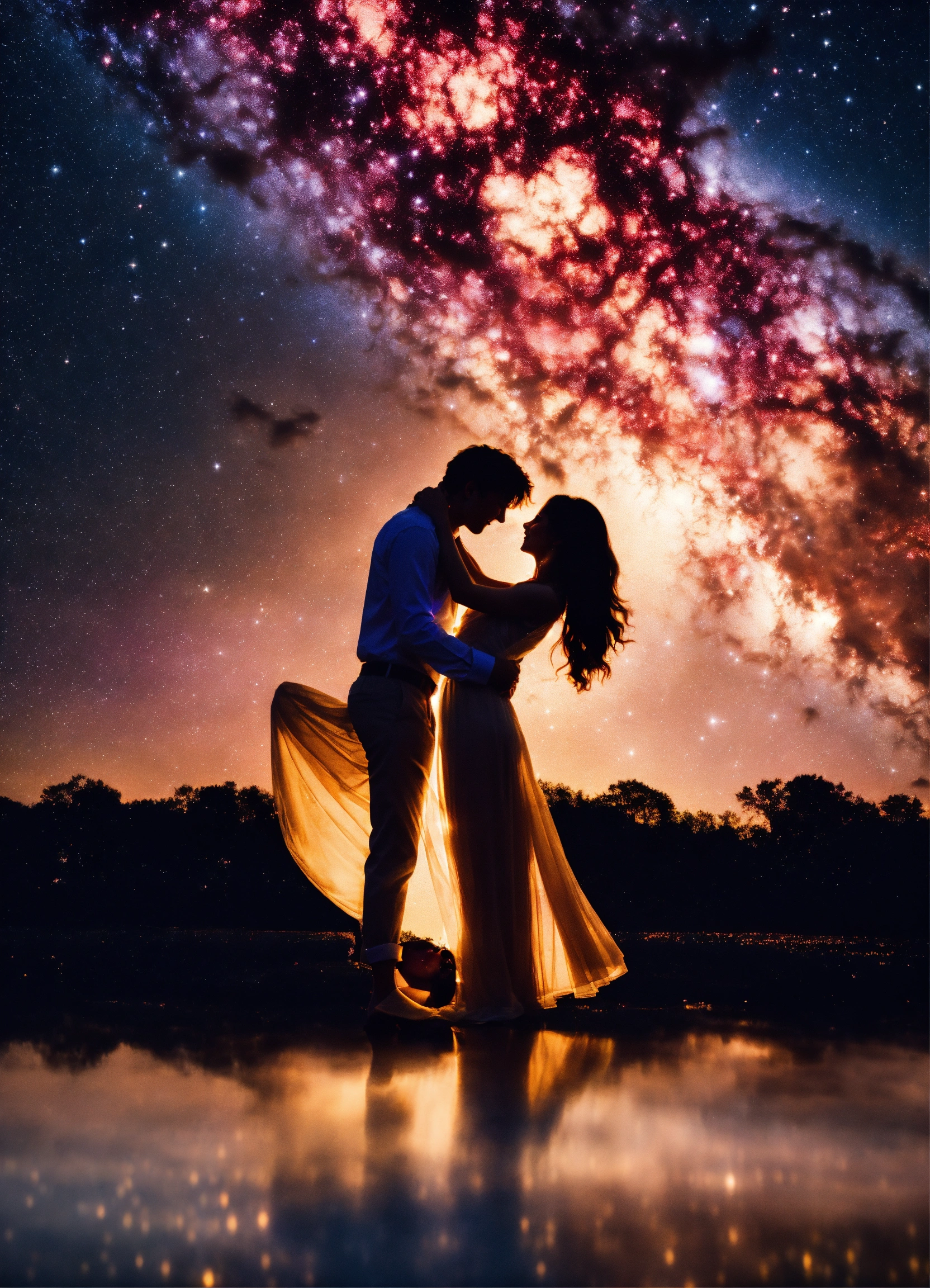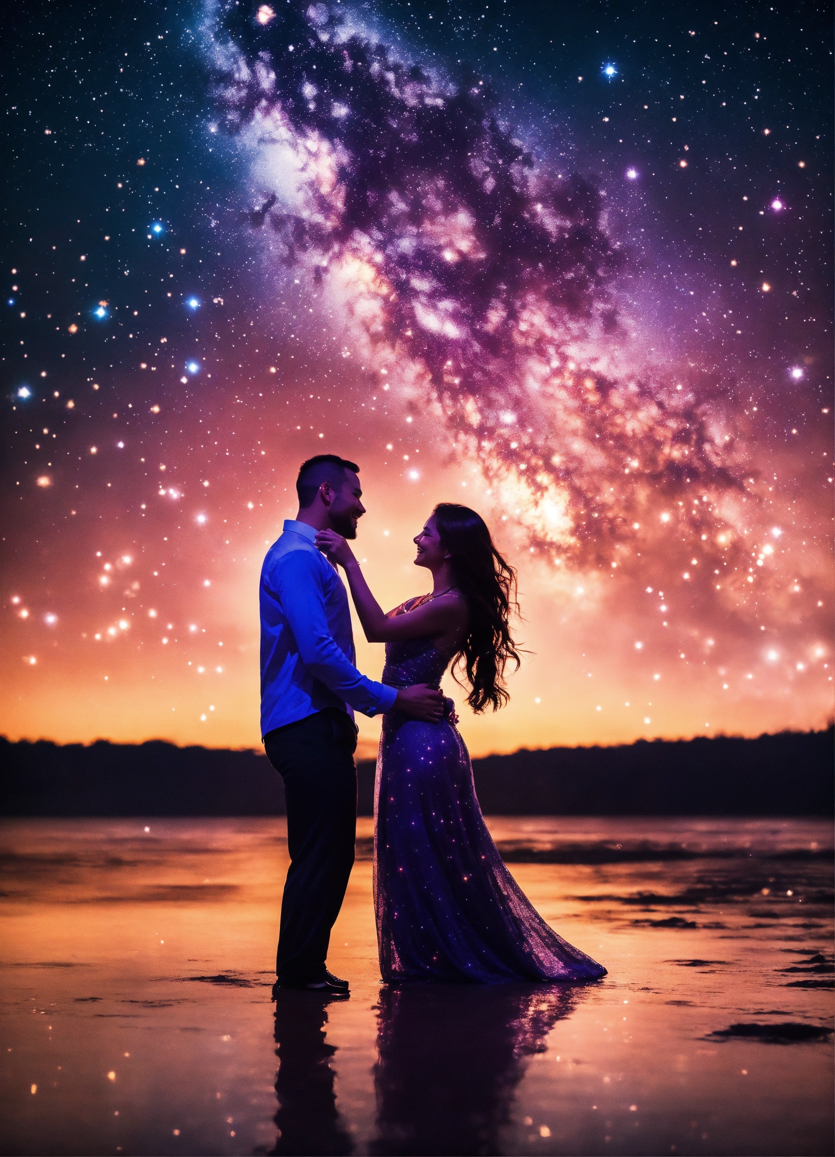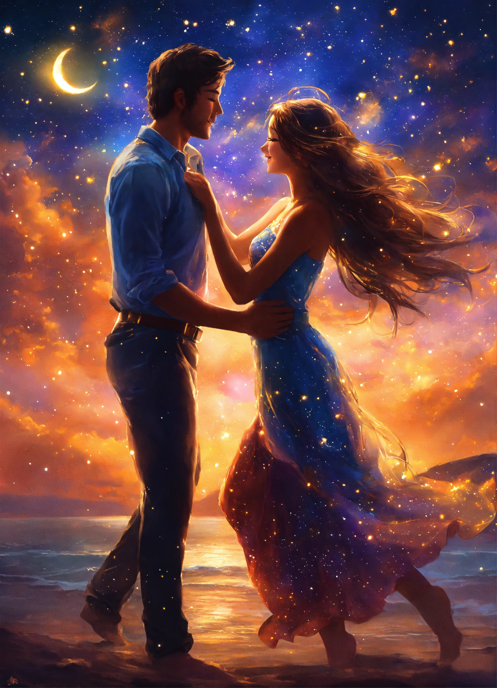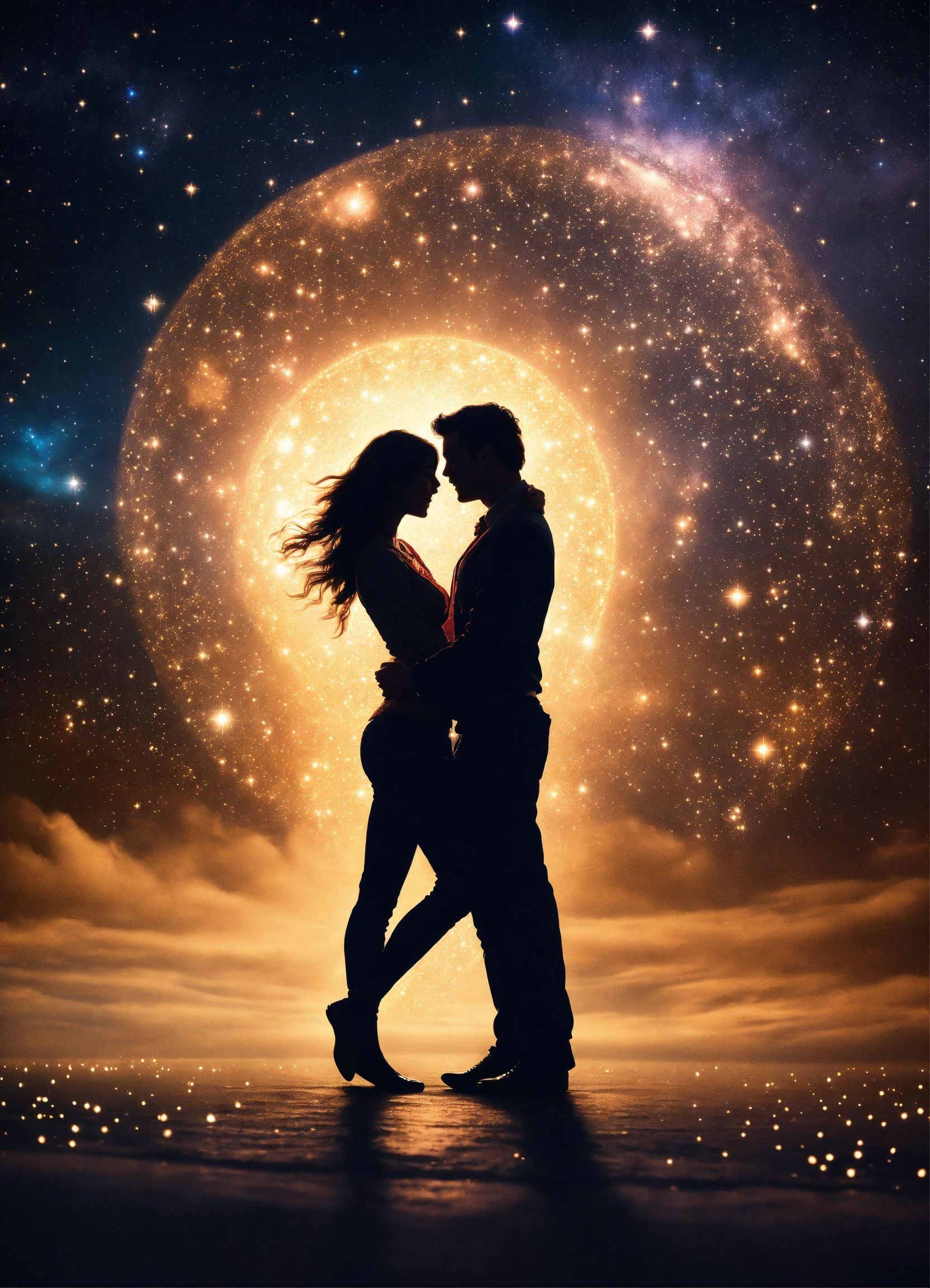 "create an image that depicts two souls dancing under a starry sky, their glowing with the melody of love. let their embrace symbolize the strength and eternal bond they share. capture the beauty and joy of their journey together, as they create a love story that transcends time."