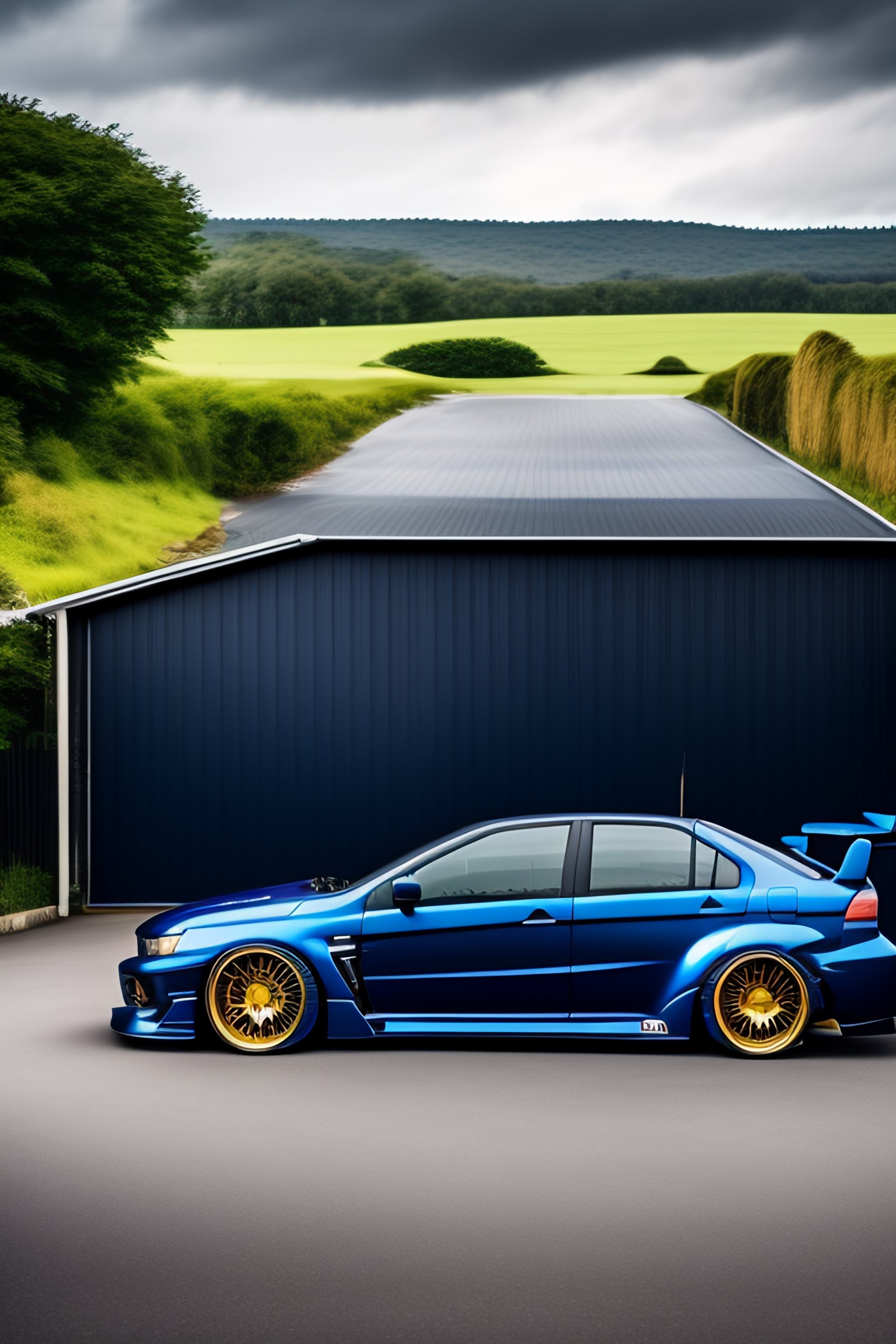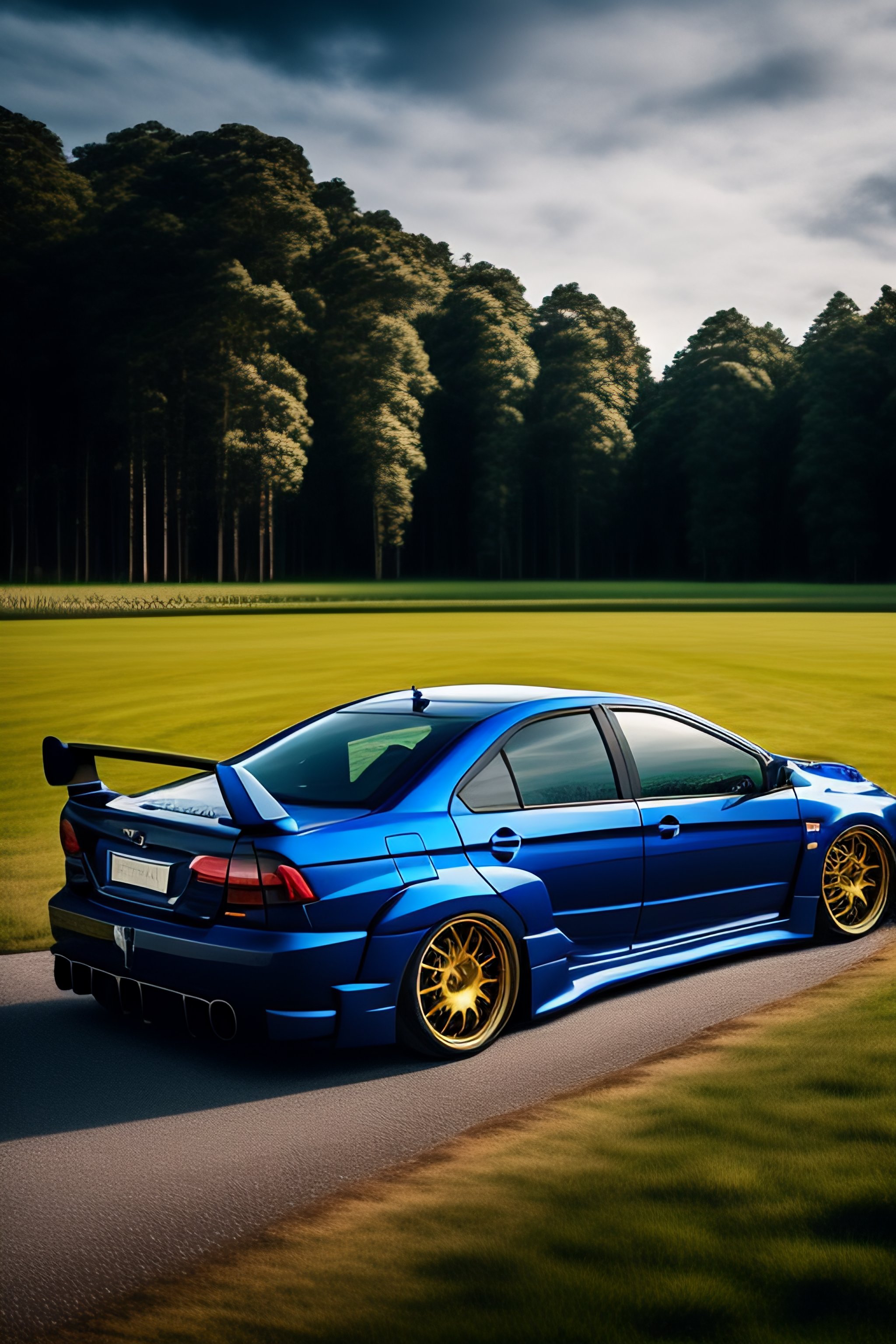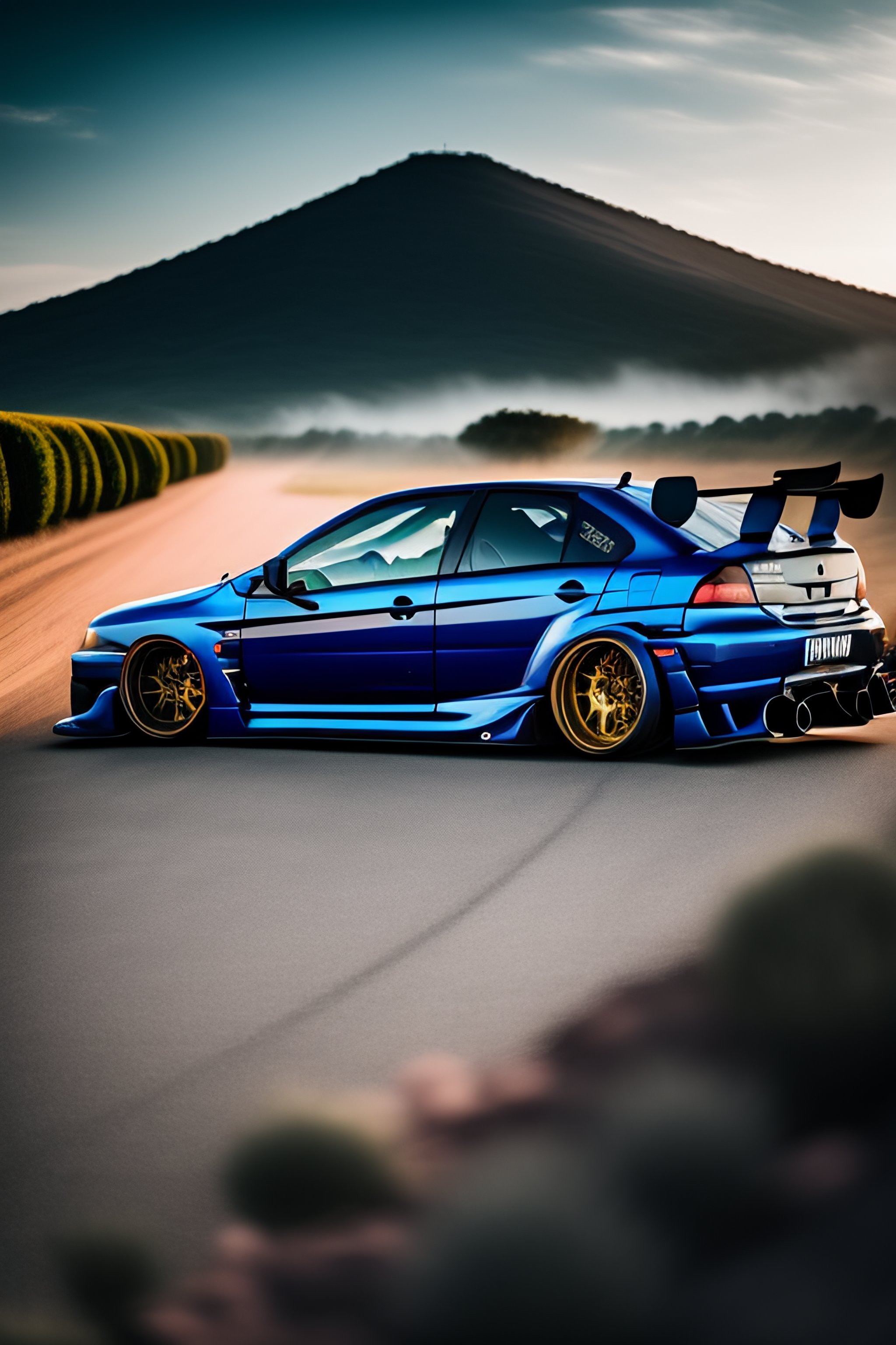 Wide angle photo of mitsubishi lancer evolution 10 dark blue color in detail, plate number wvj 5335, surreal