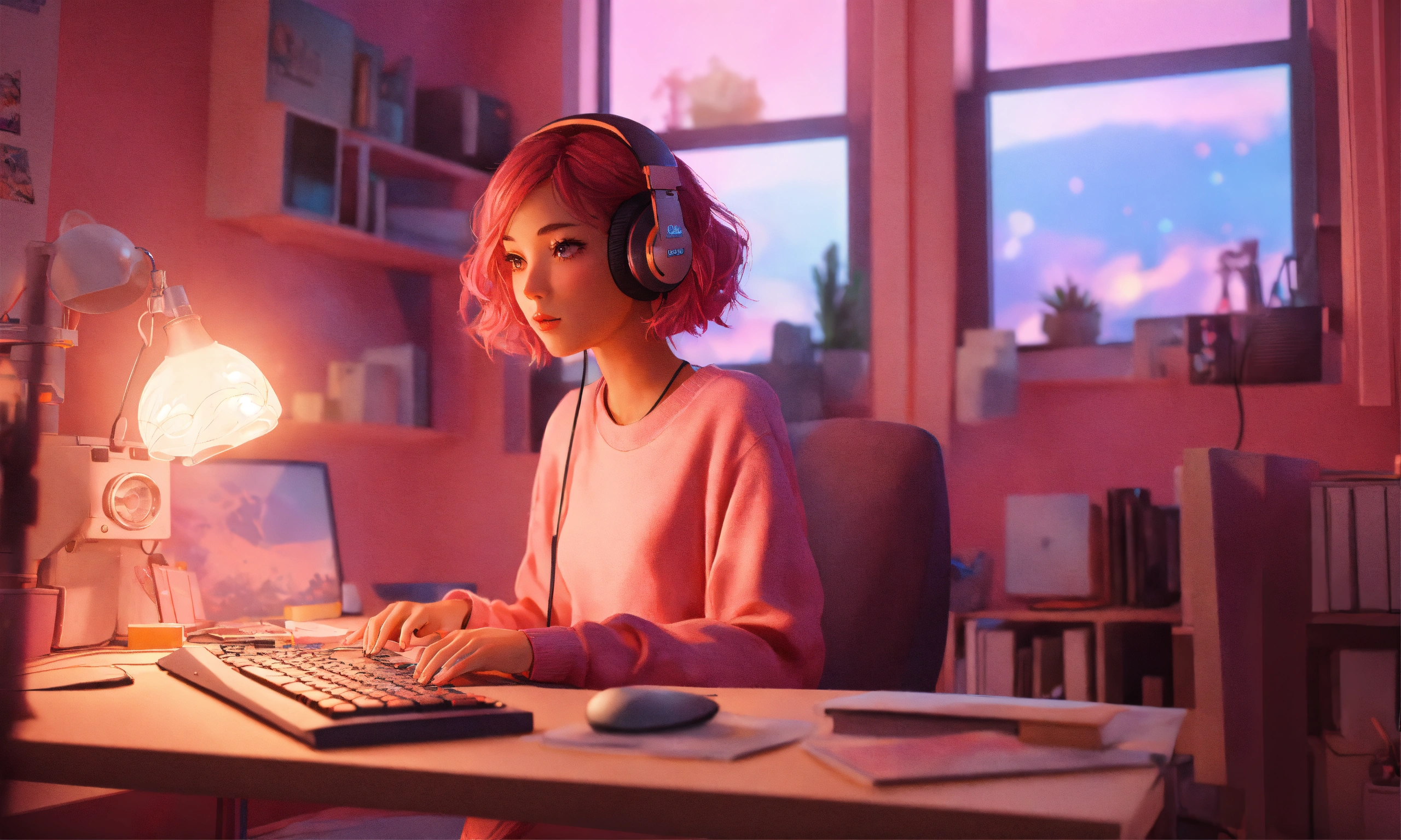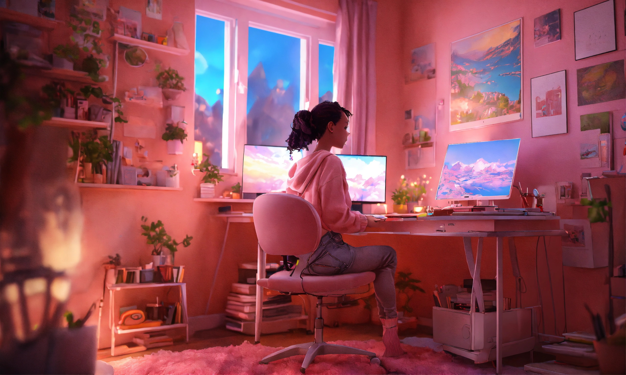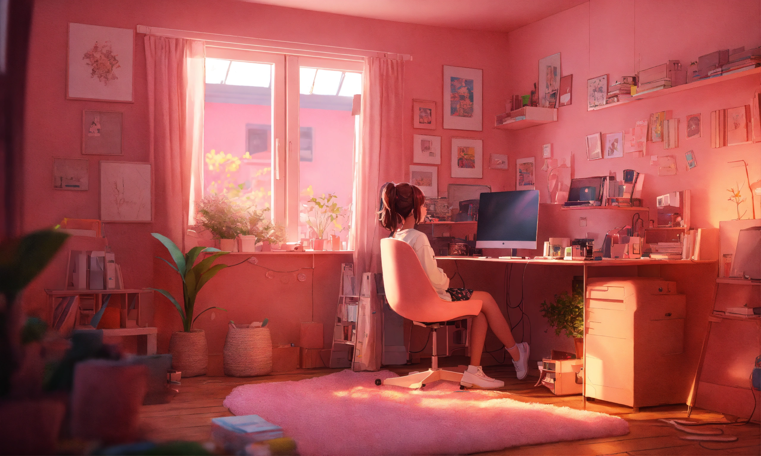 Very cute lofi girl in front of her computer in her cozy and messy room, unreal engine 5 render, gorgeous lighting, pastel pink hues, 8k render, award-winning art