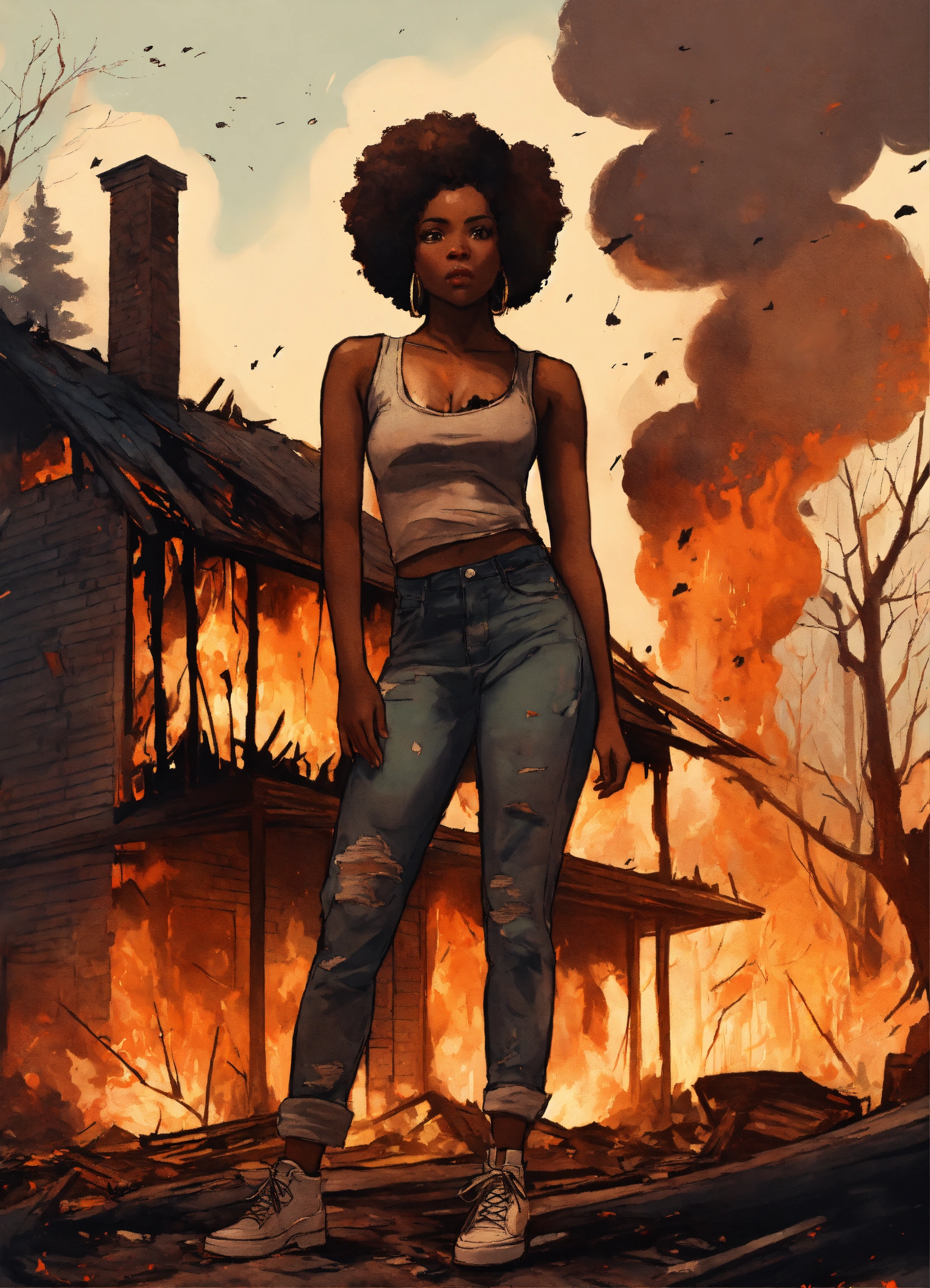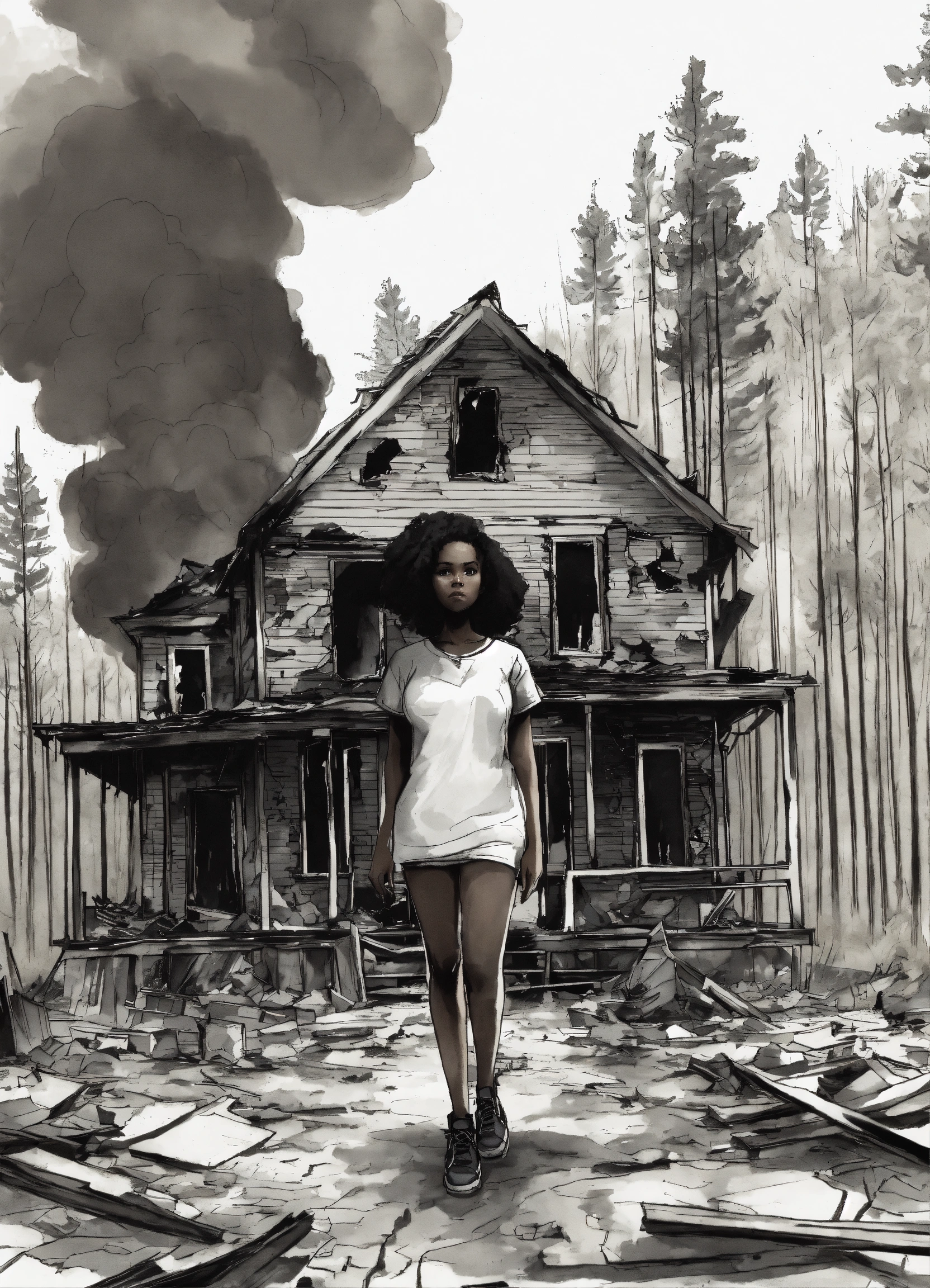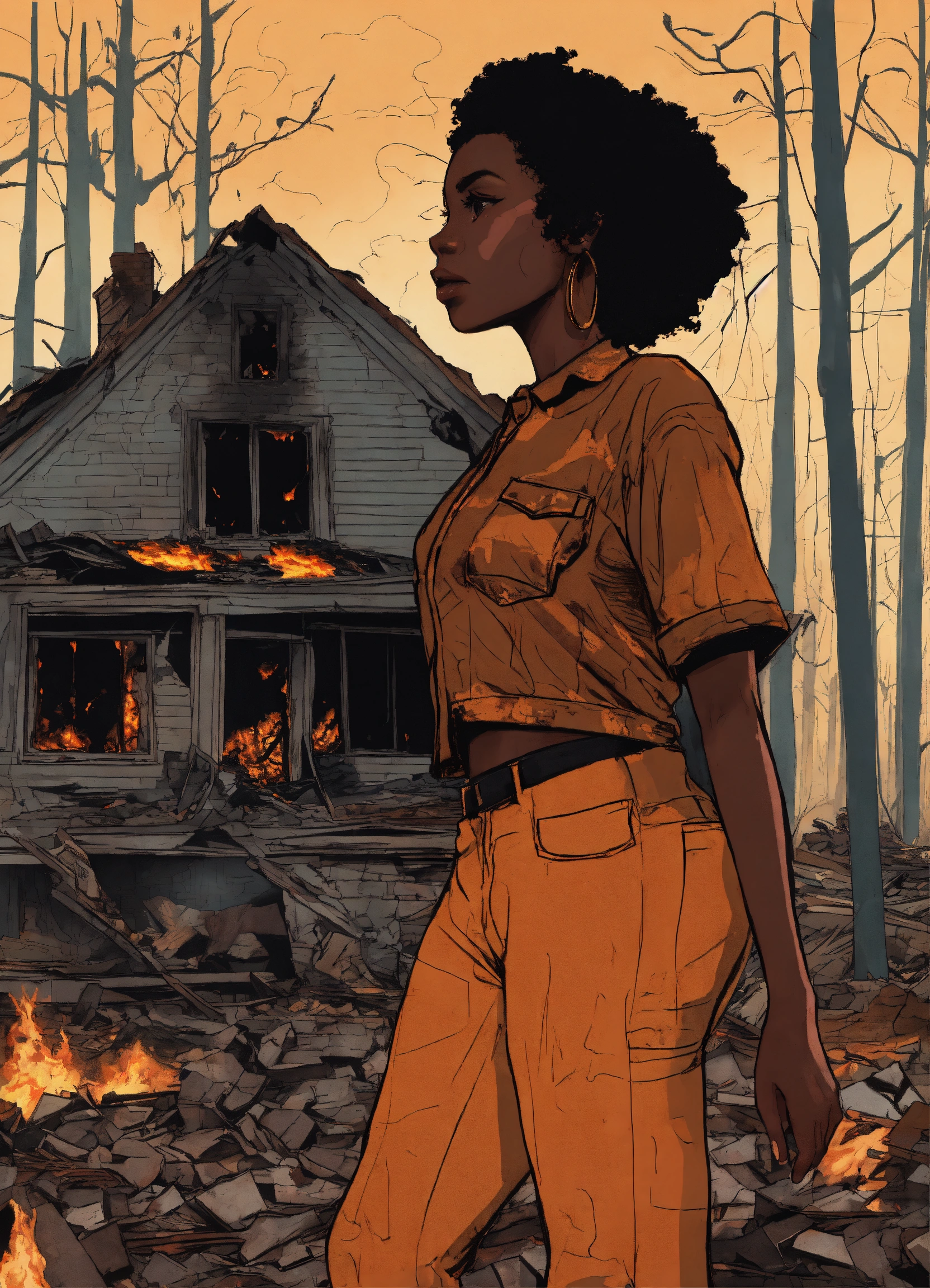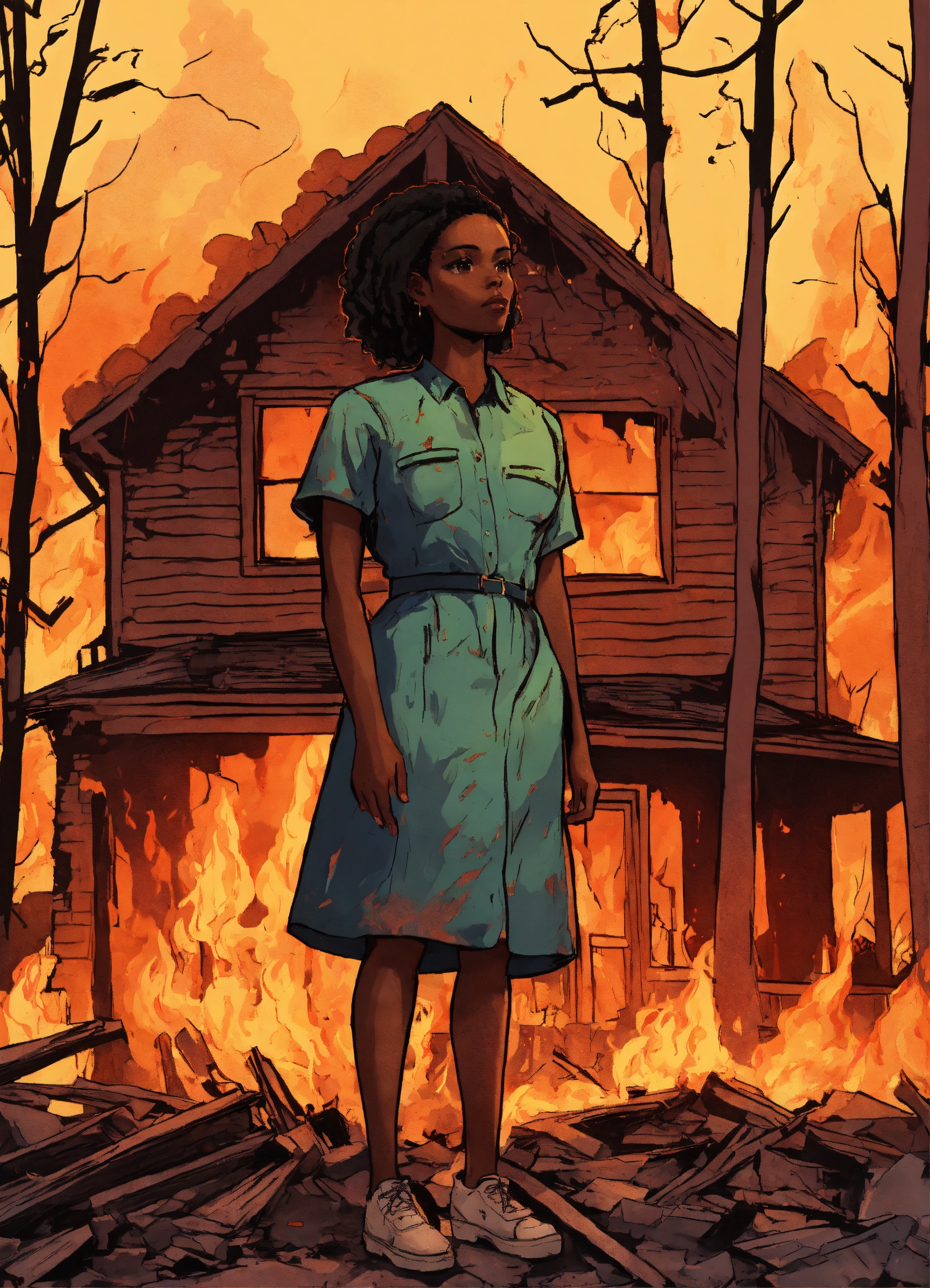 A mad african american woman standing in front of a burnt down home on fire in a forest, stunning details, doodle