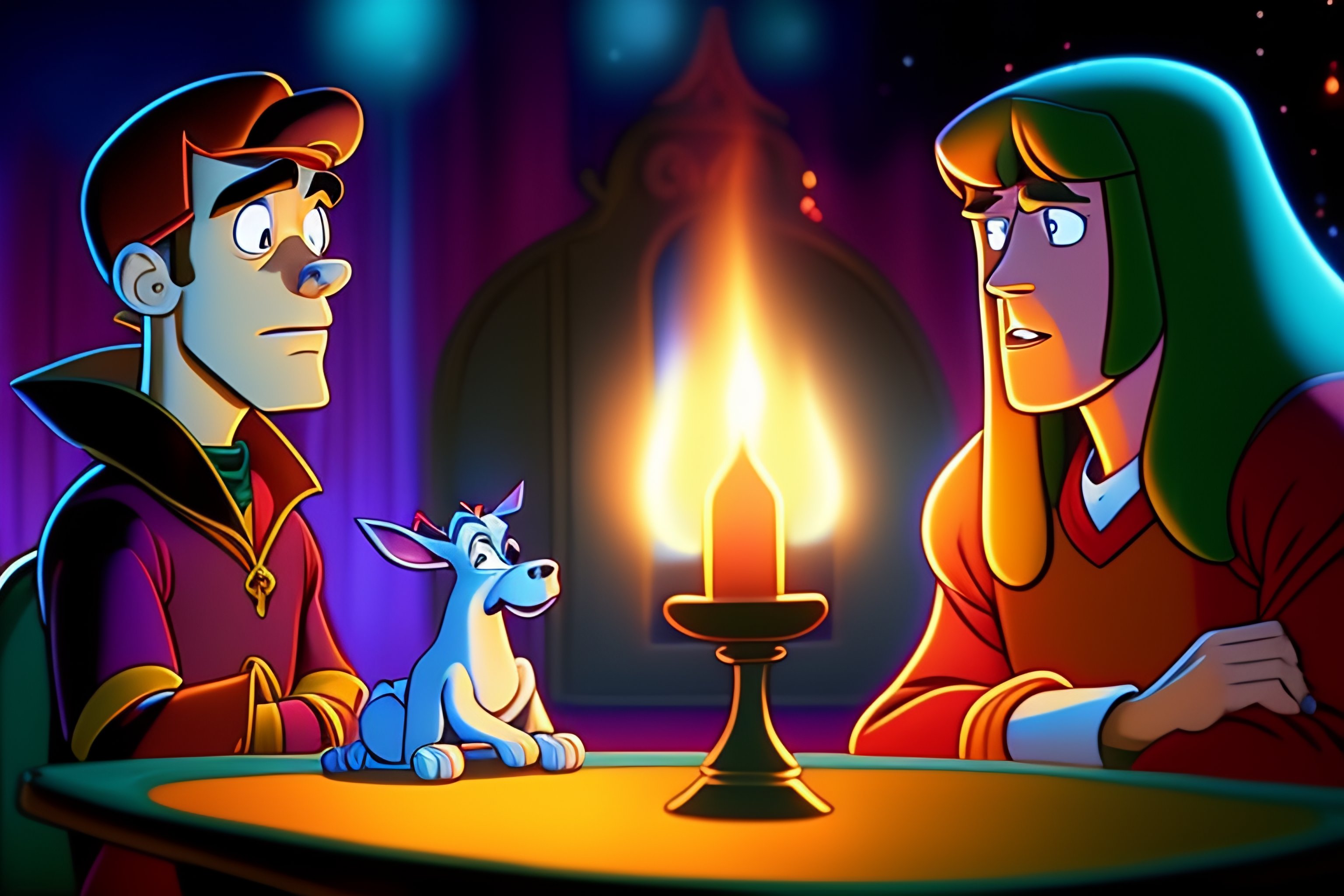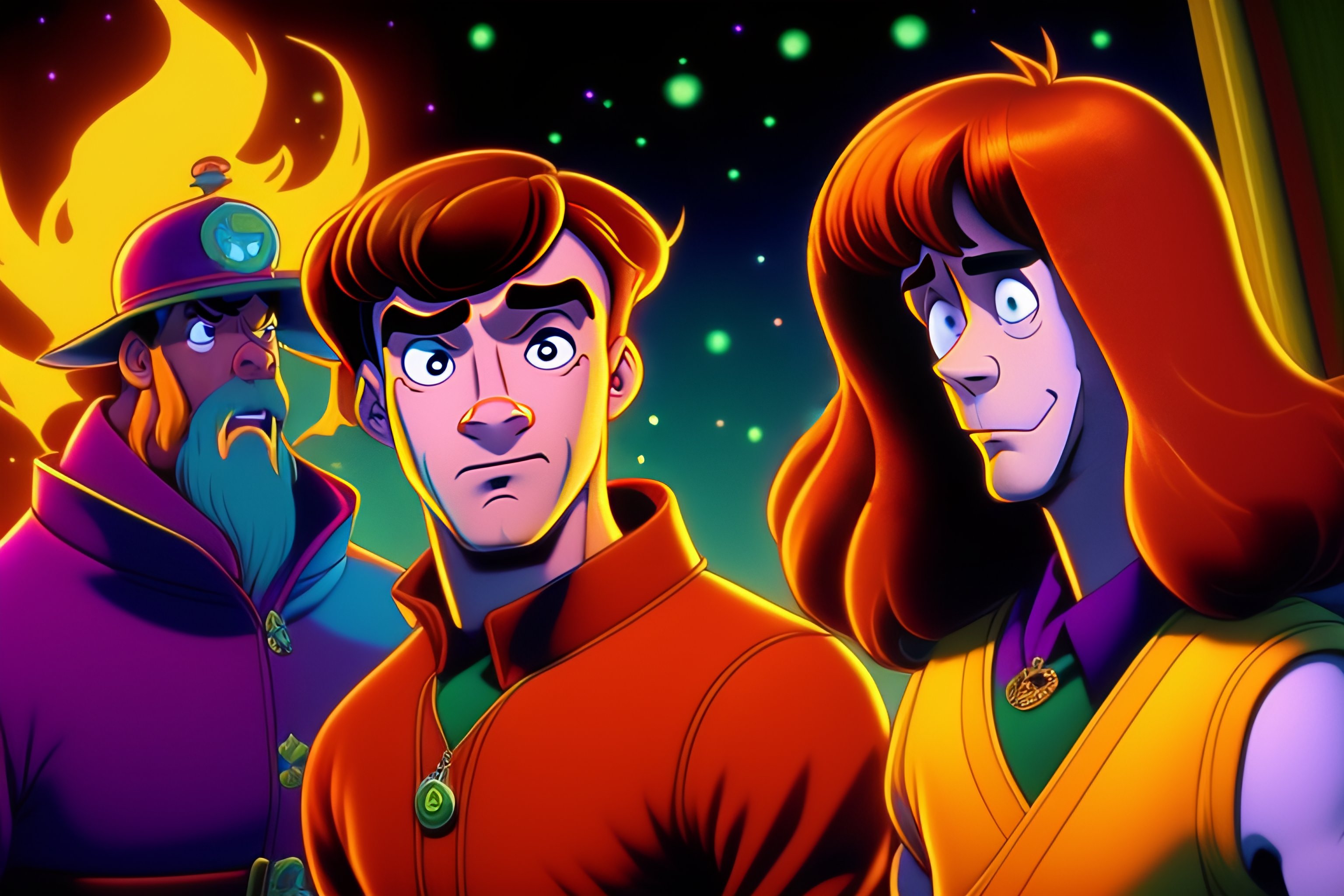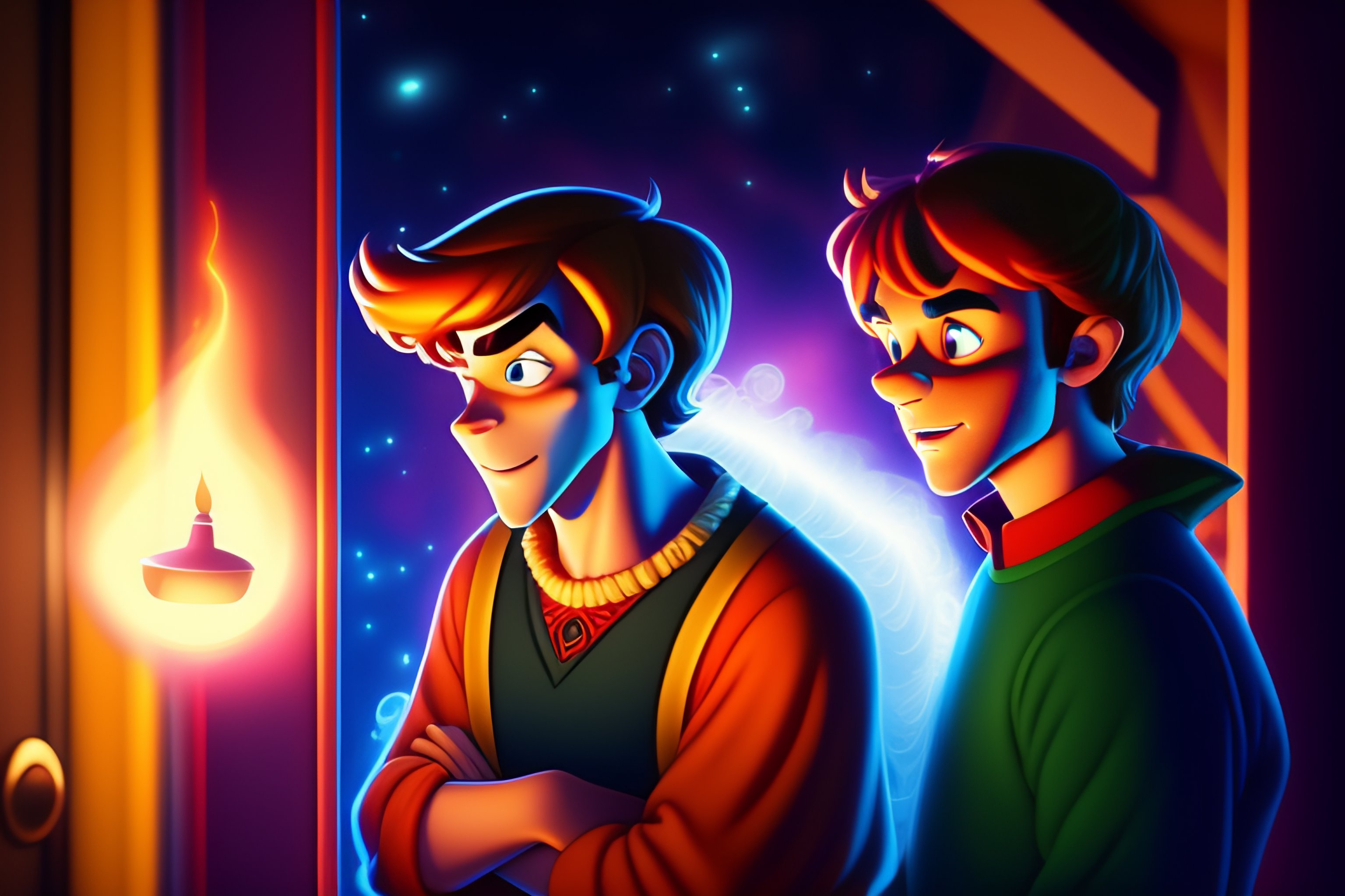 A beautiful photo of scooby-doo and shaggy being scared by a ghost