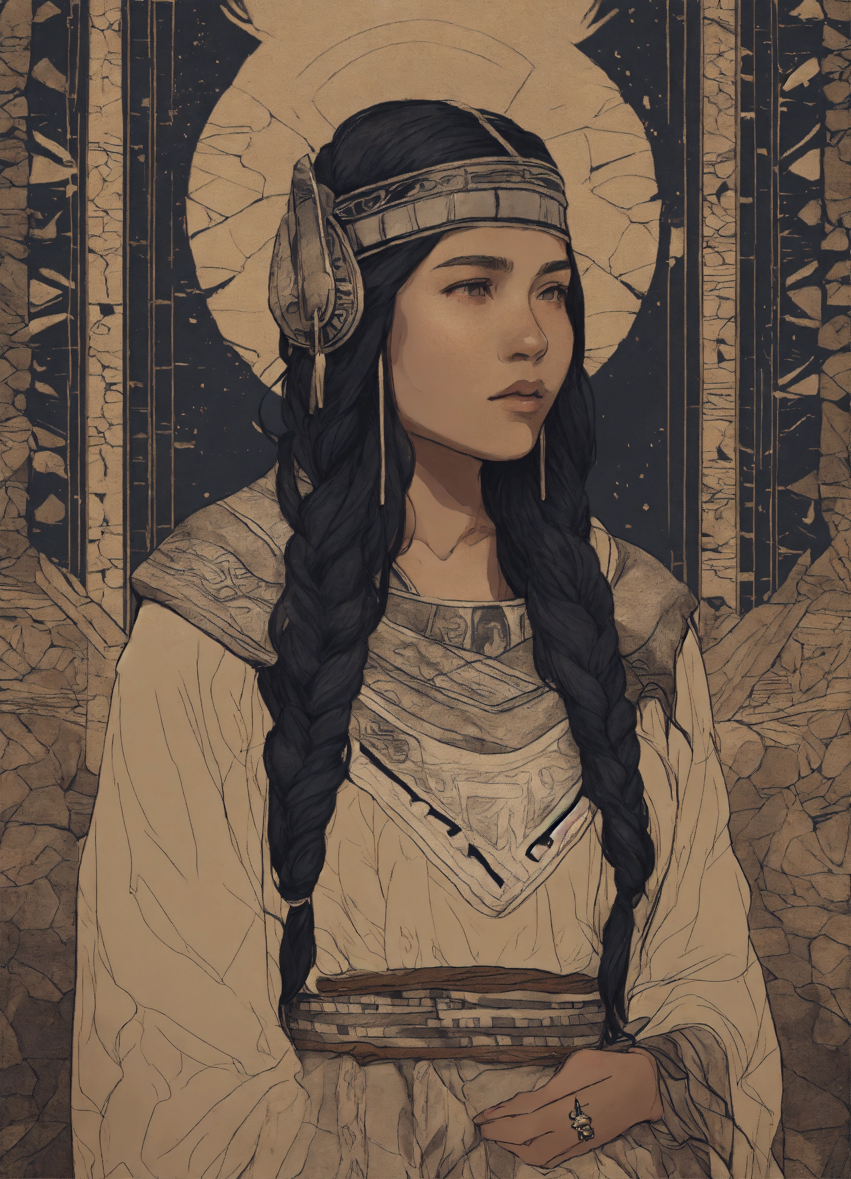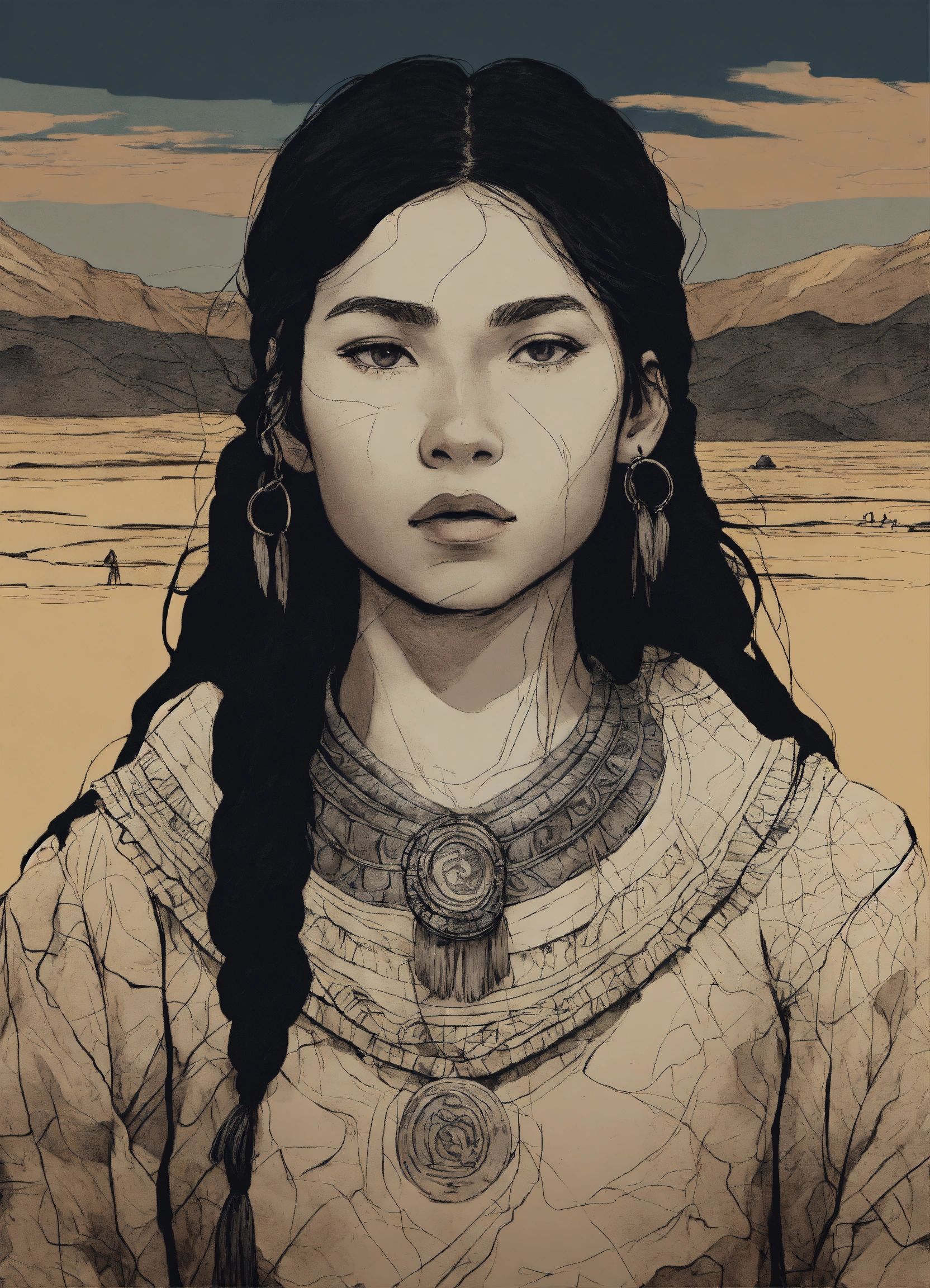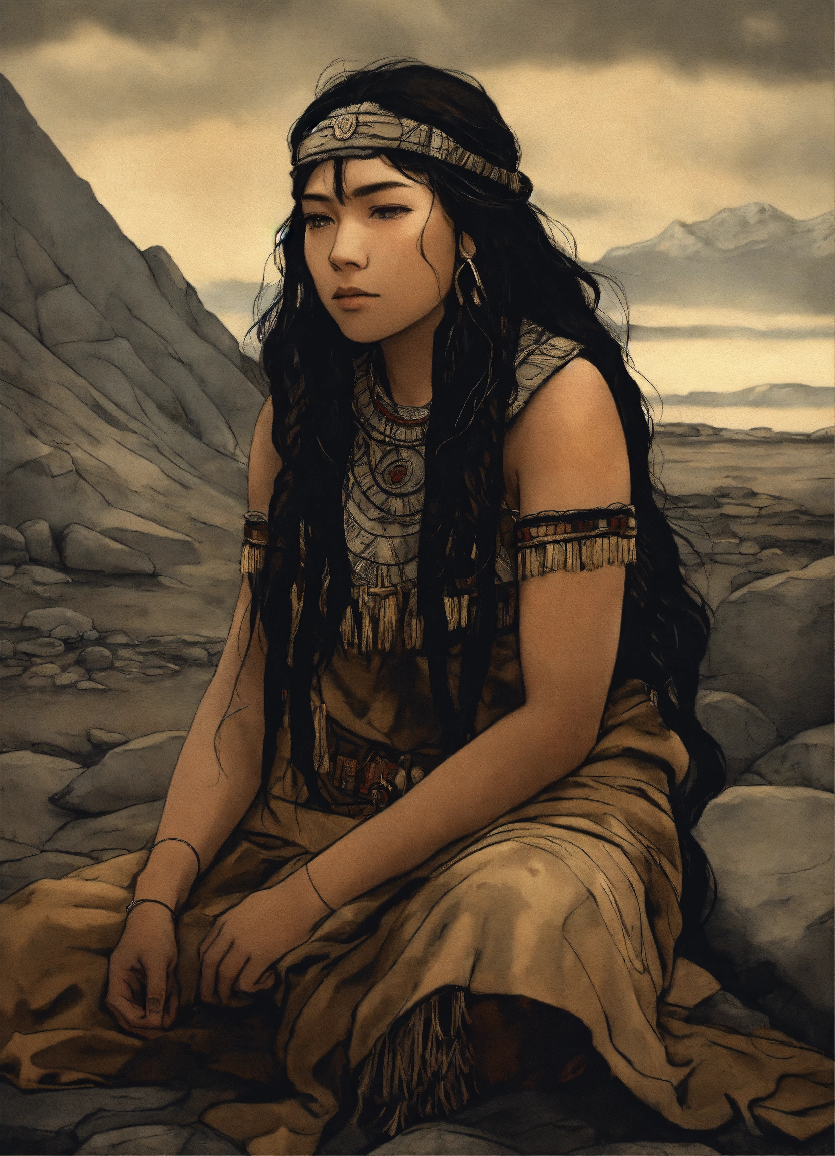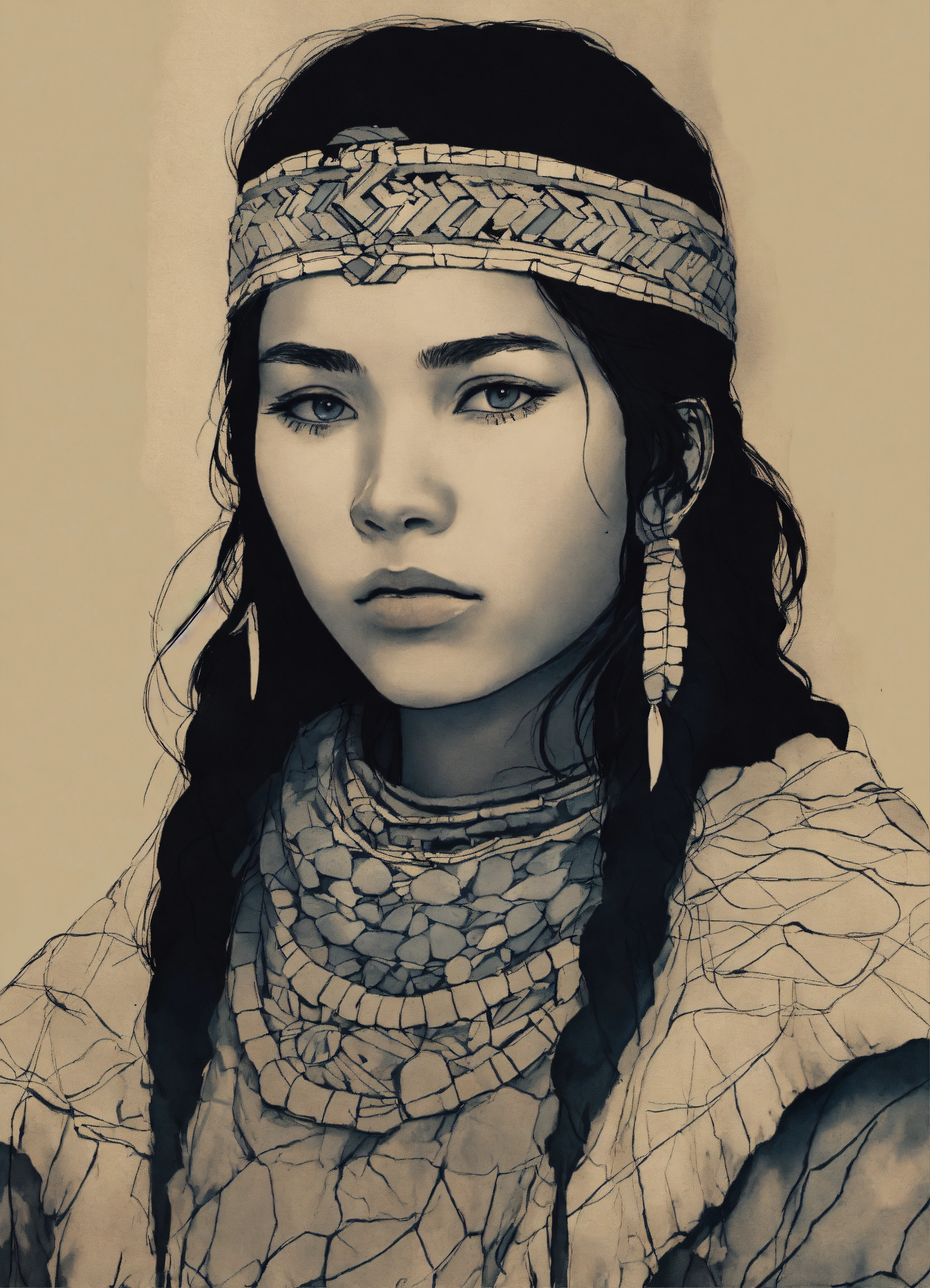 Drawing of a young inuit woman, siberian cothing, paleolithic clothing, stone age, black hair, 18 years old, dark fantasy, 8k, trichromatic printing, outlined silhouettes, gloomy and depressing ambient, in the style of tom björklund, inspired by senua's sacrifice
