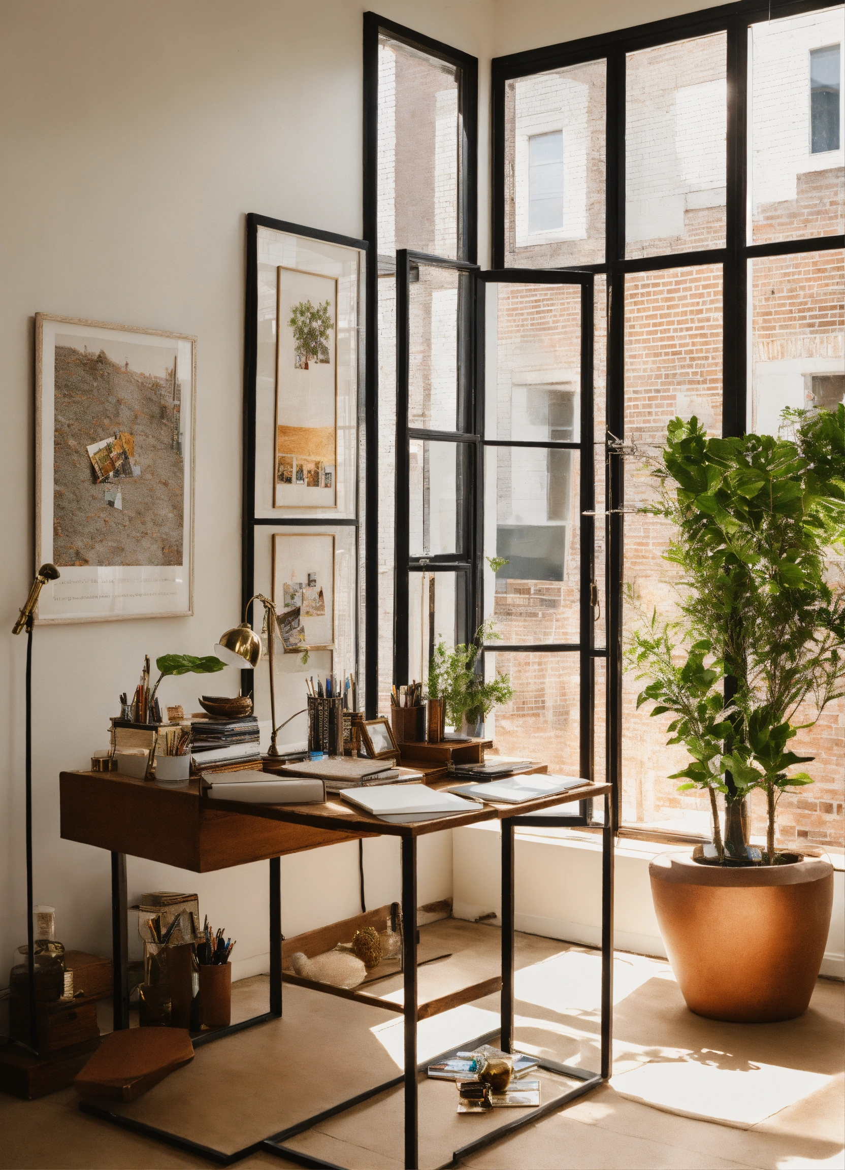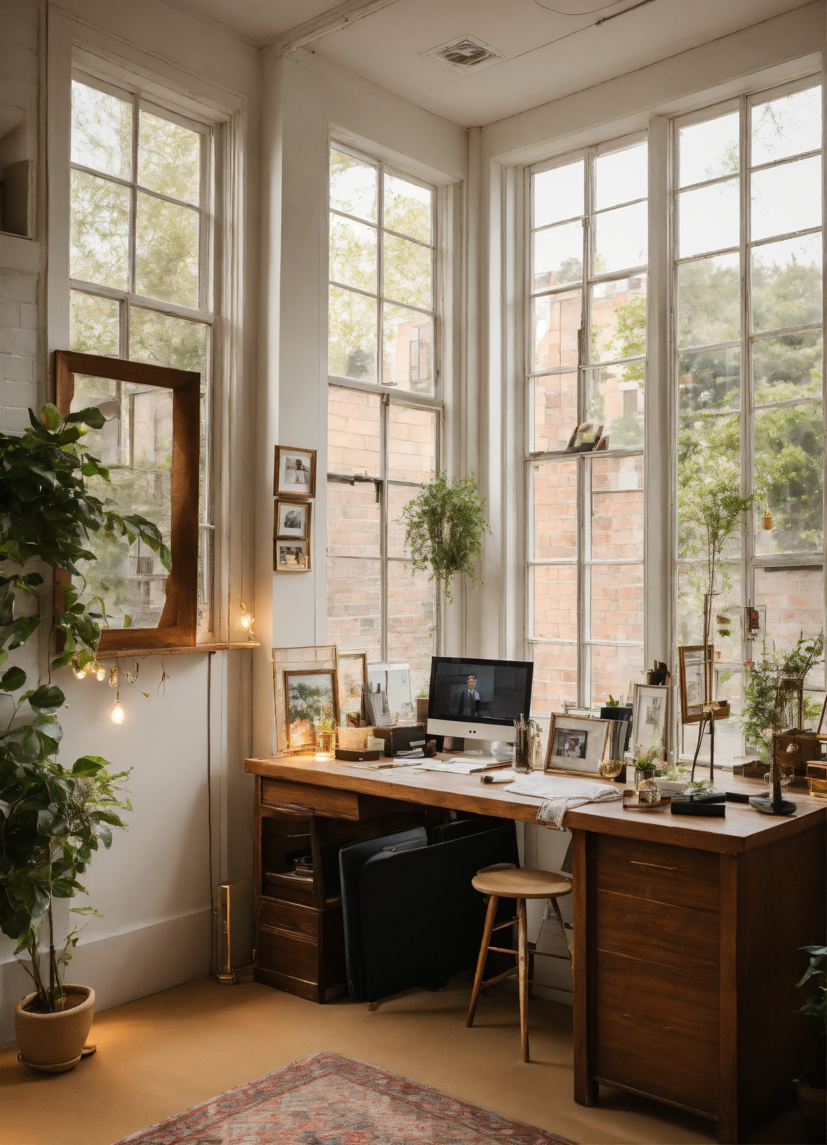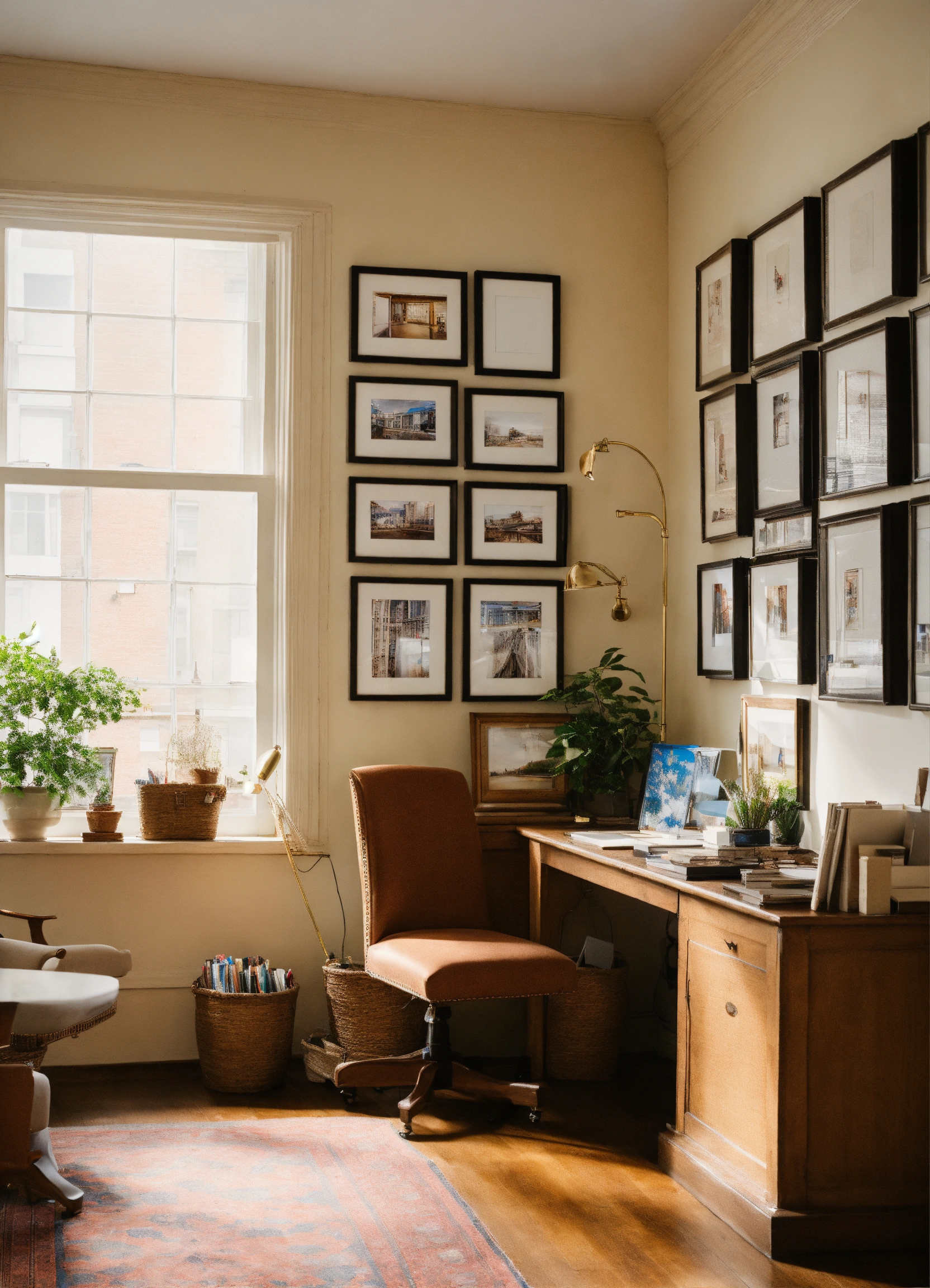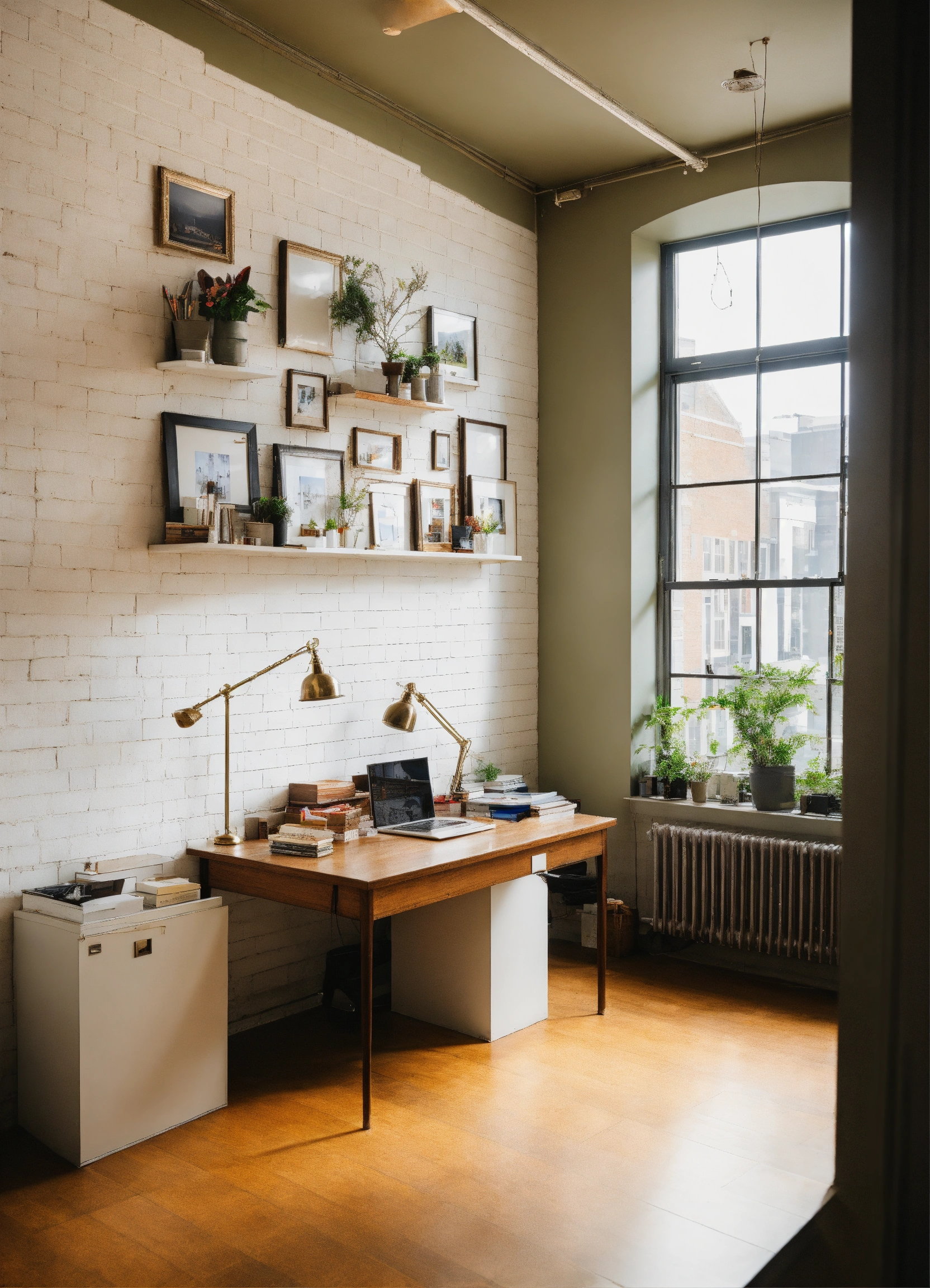 A picture of a simple white brick-walled office with a four panel window with picture frames and trinkets