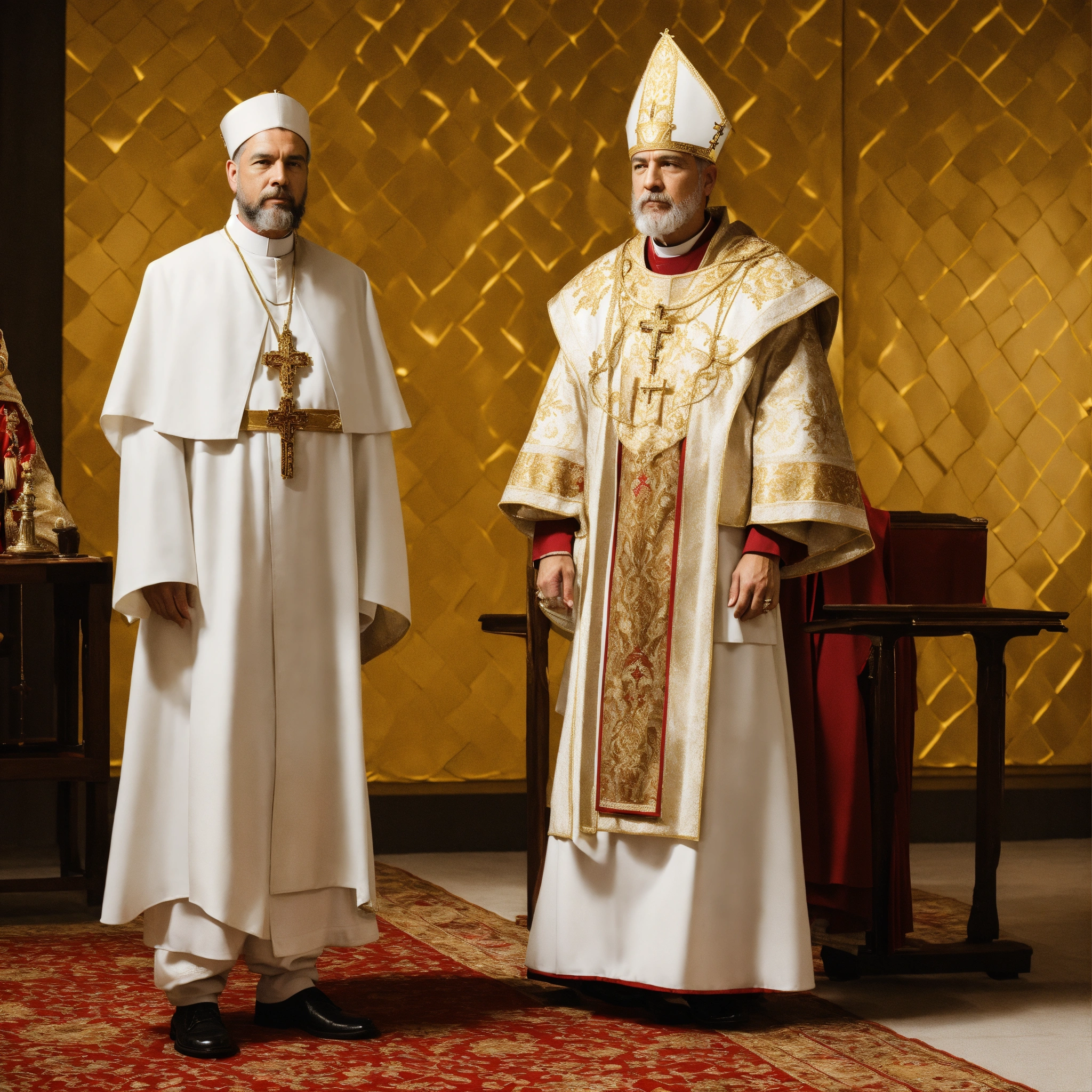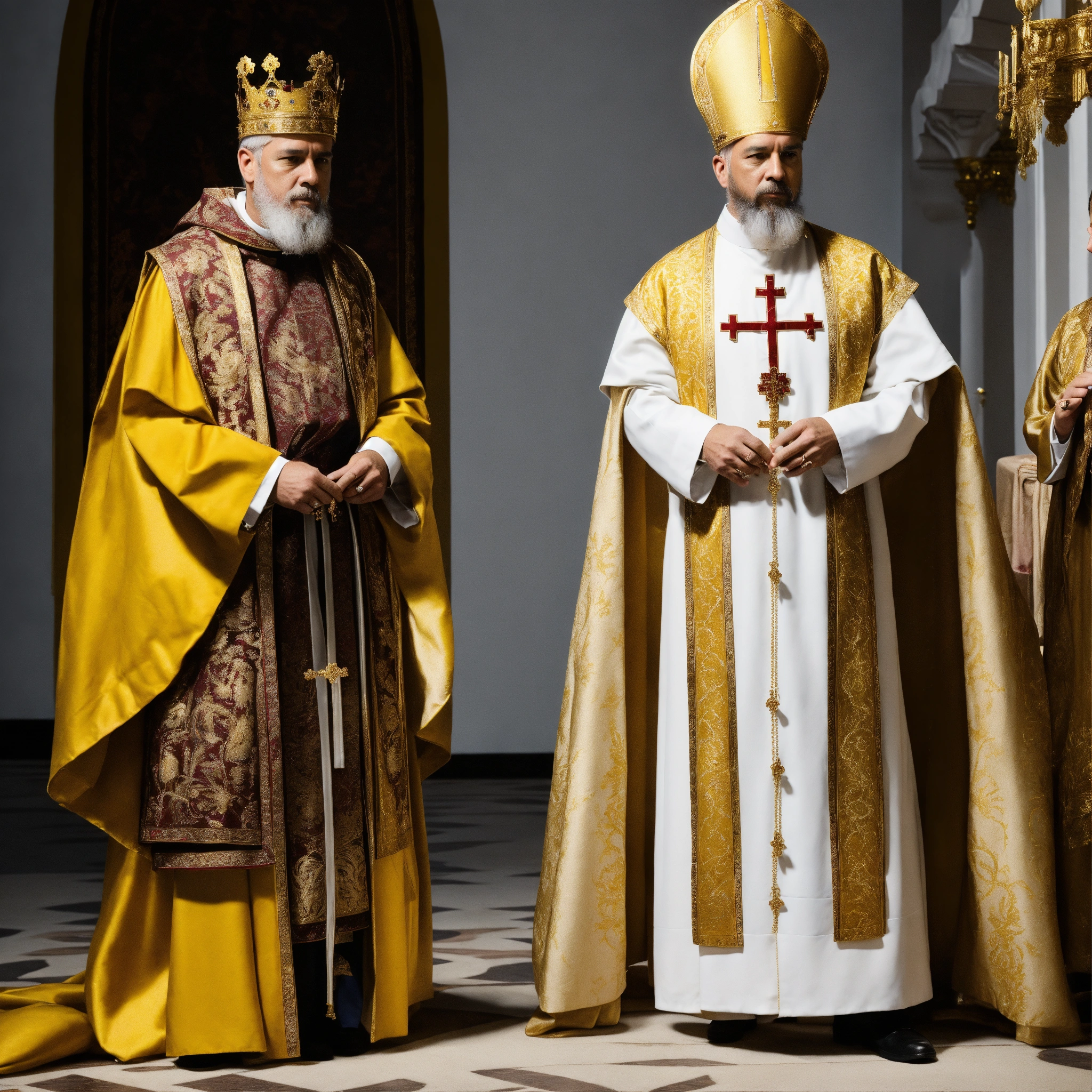 A king clothed in white and gold, standing next to a priest, clothed in long garments, white background