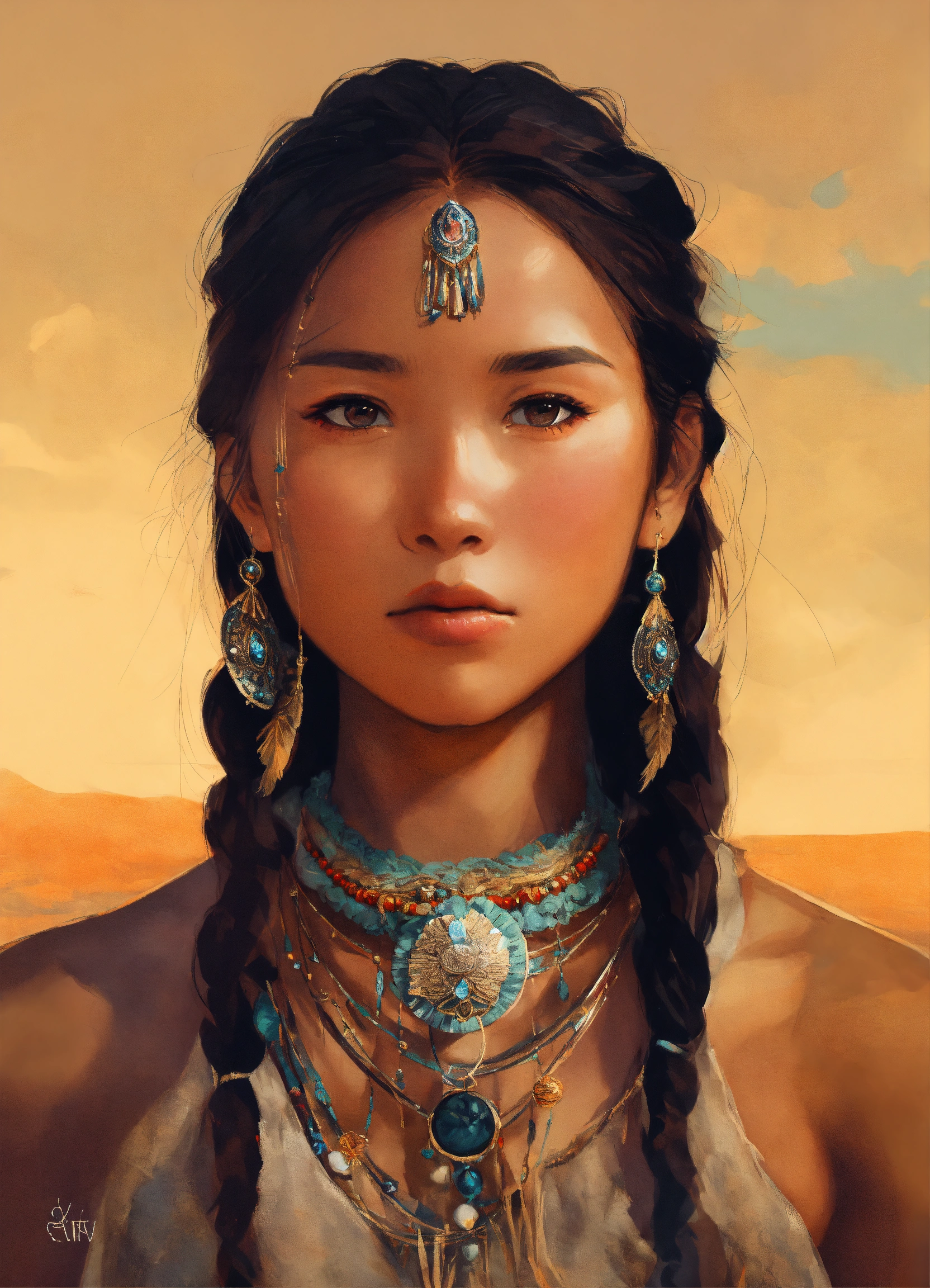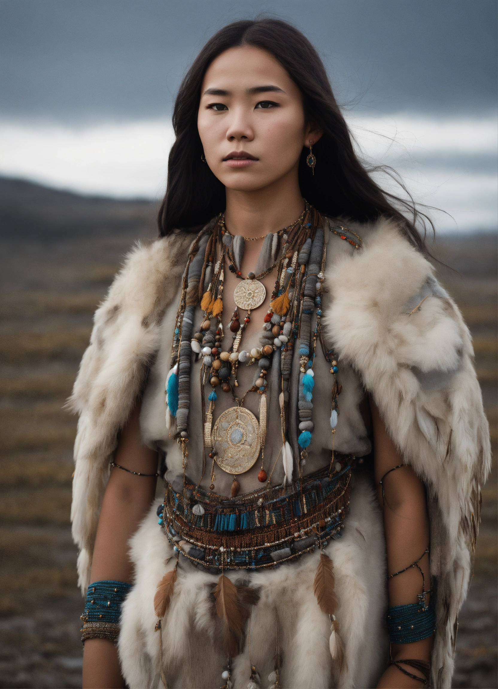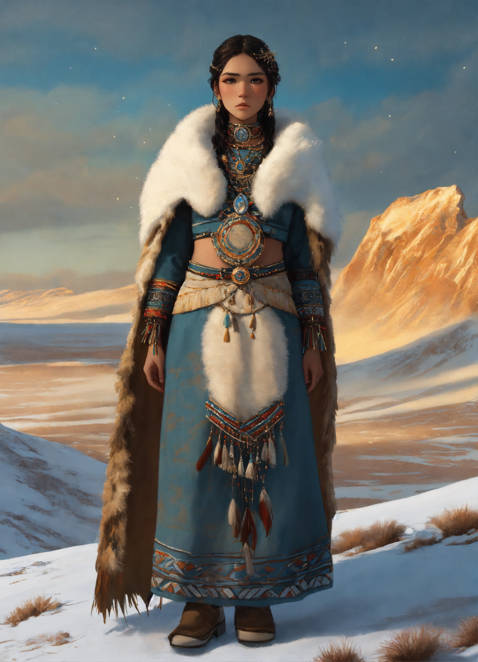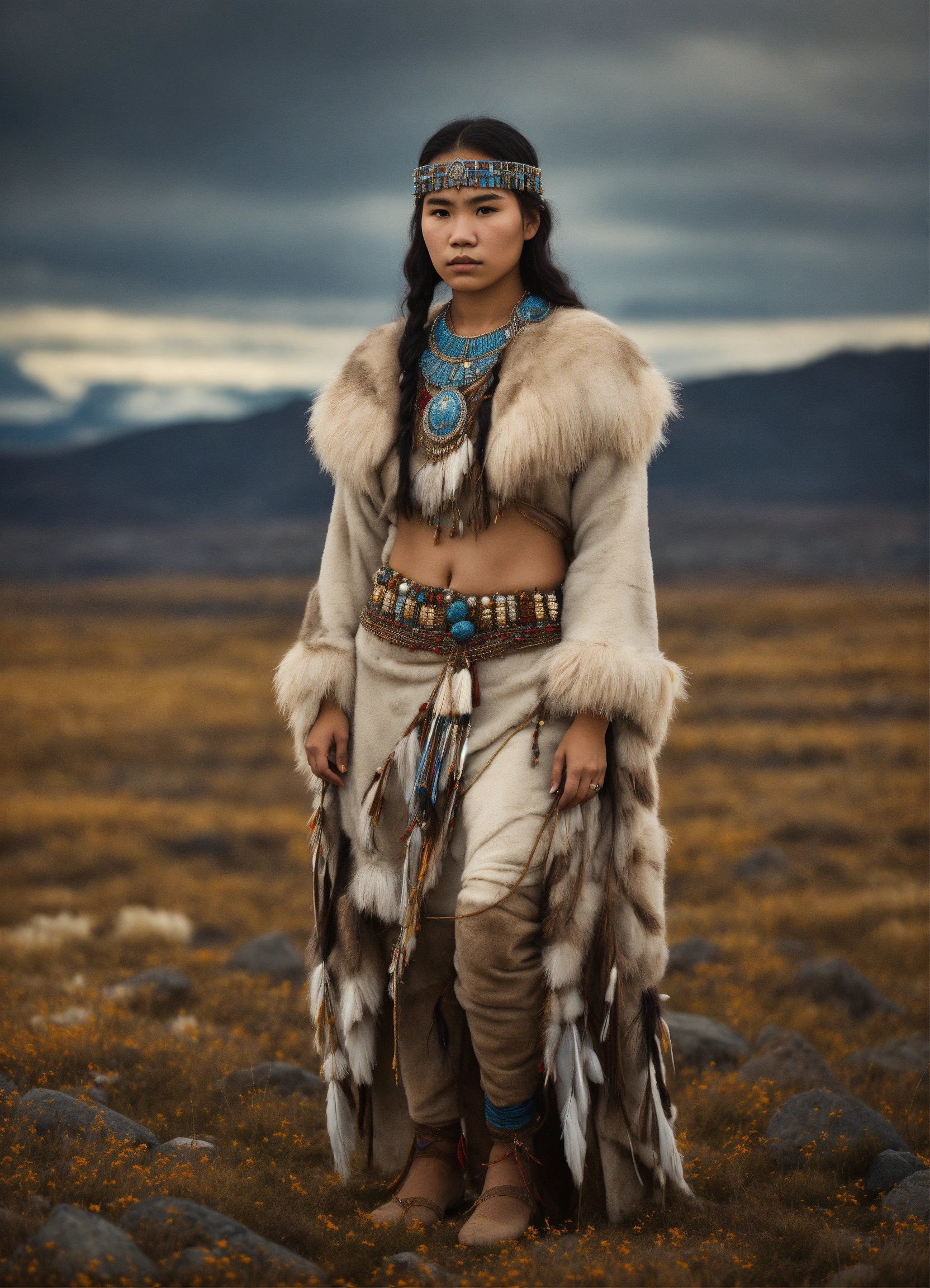 Generate a captivating full-body illustration of a stunning 18-year-old inuit woman dressed in exquisite stone age clothing, embellished with intricate feathers, vibrant beads, and delicate shells. she stands gracefully on the stark tundra steppe, radiating beauty and strength, while beside her, her younger brother, with a somber expression, evokes a poignant and melancholic atmosphere. bring this vision to life with the artistry of tom björklund.