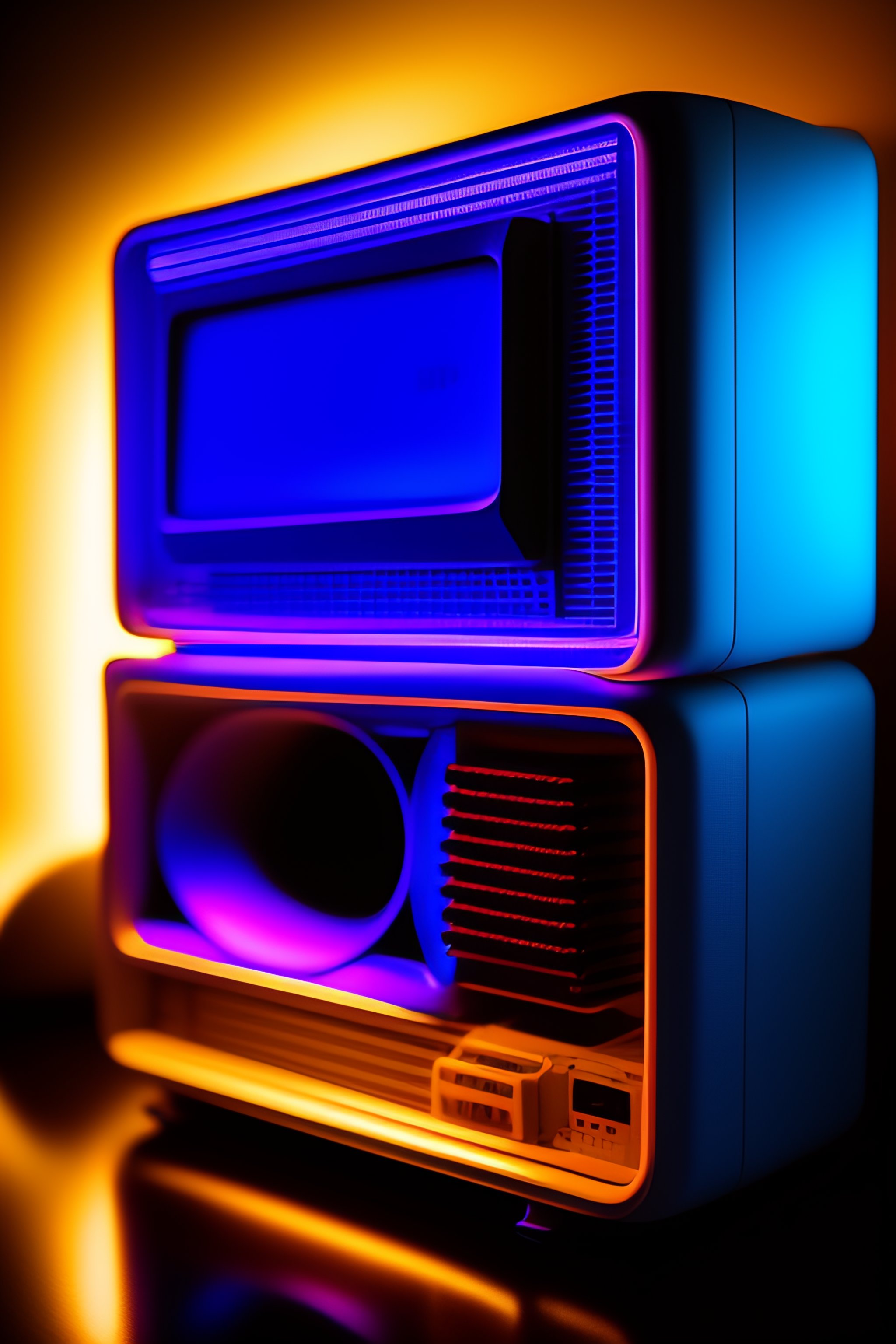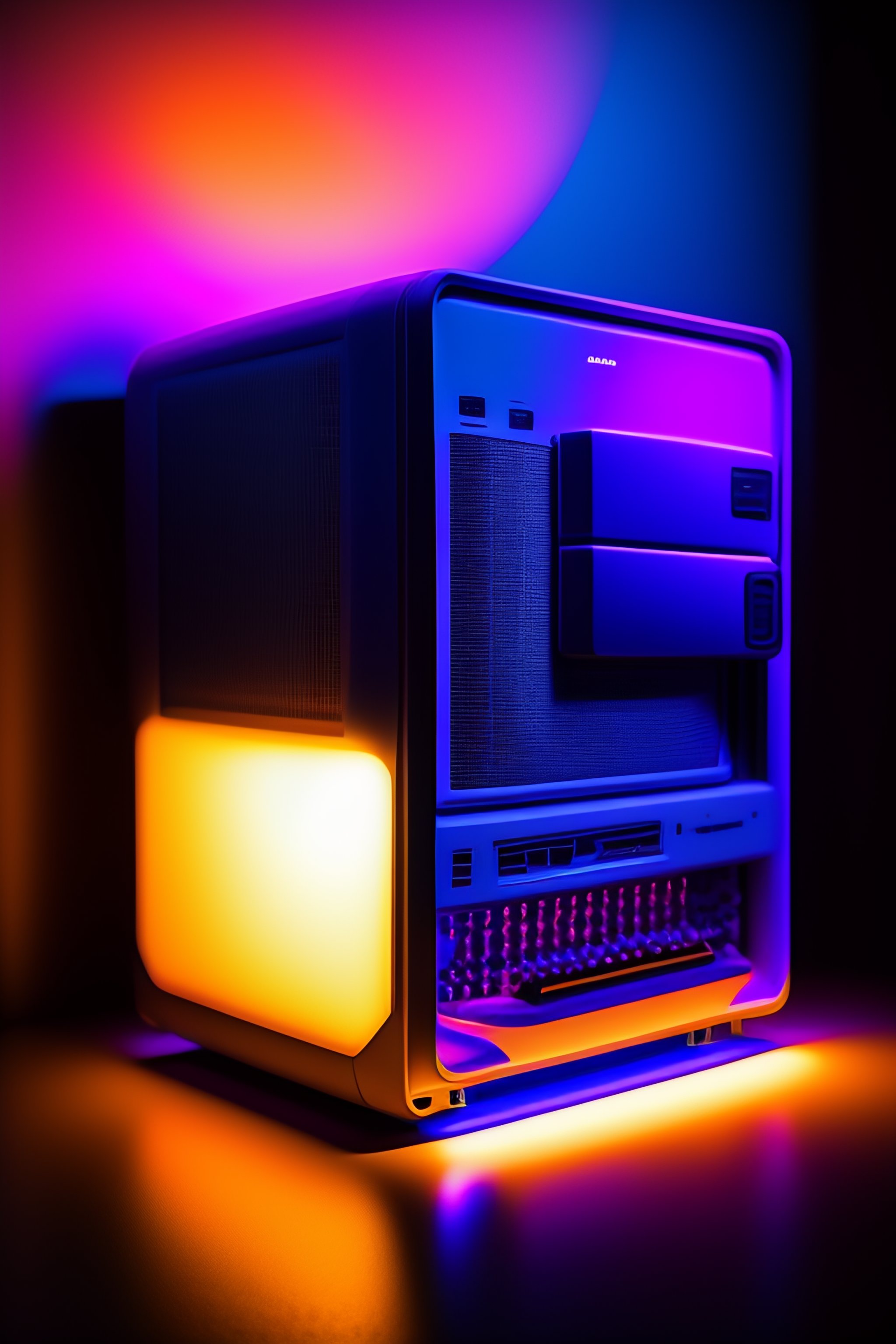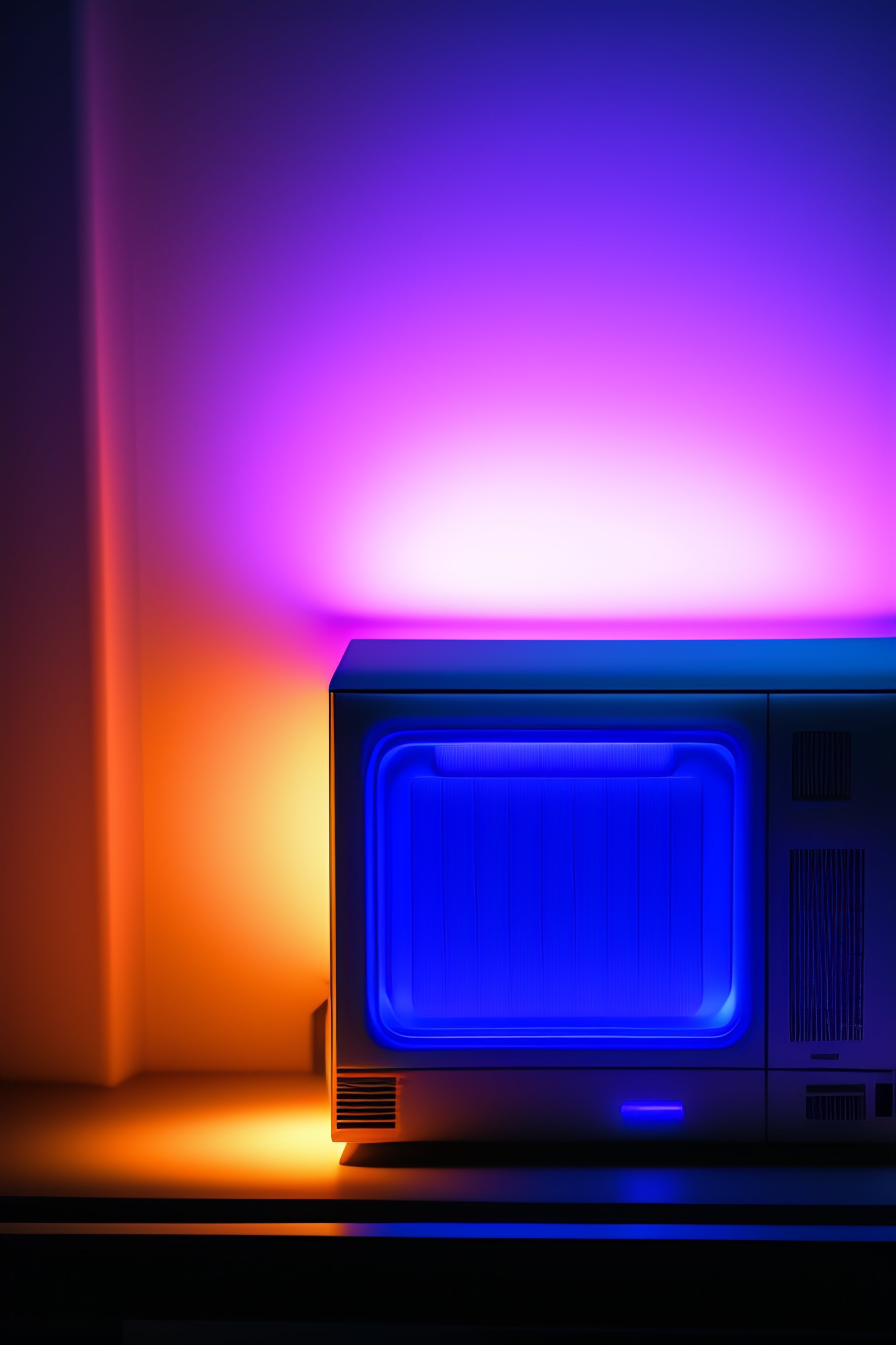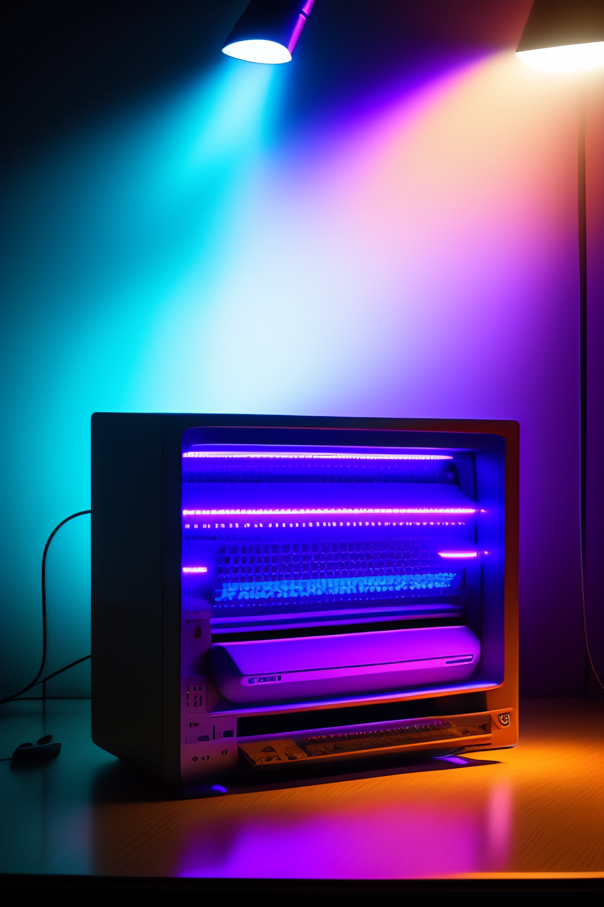 A 1980’s computer in a dark room under a spotlight, with blue and purple fluorescent background lights